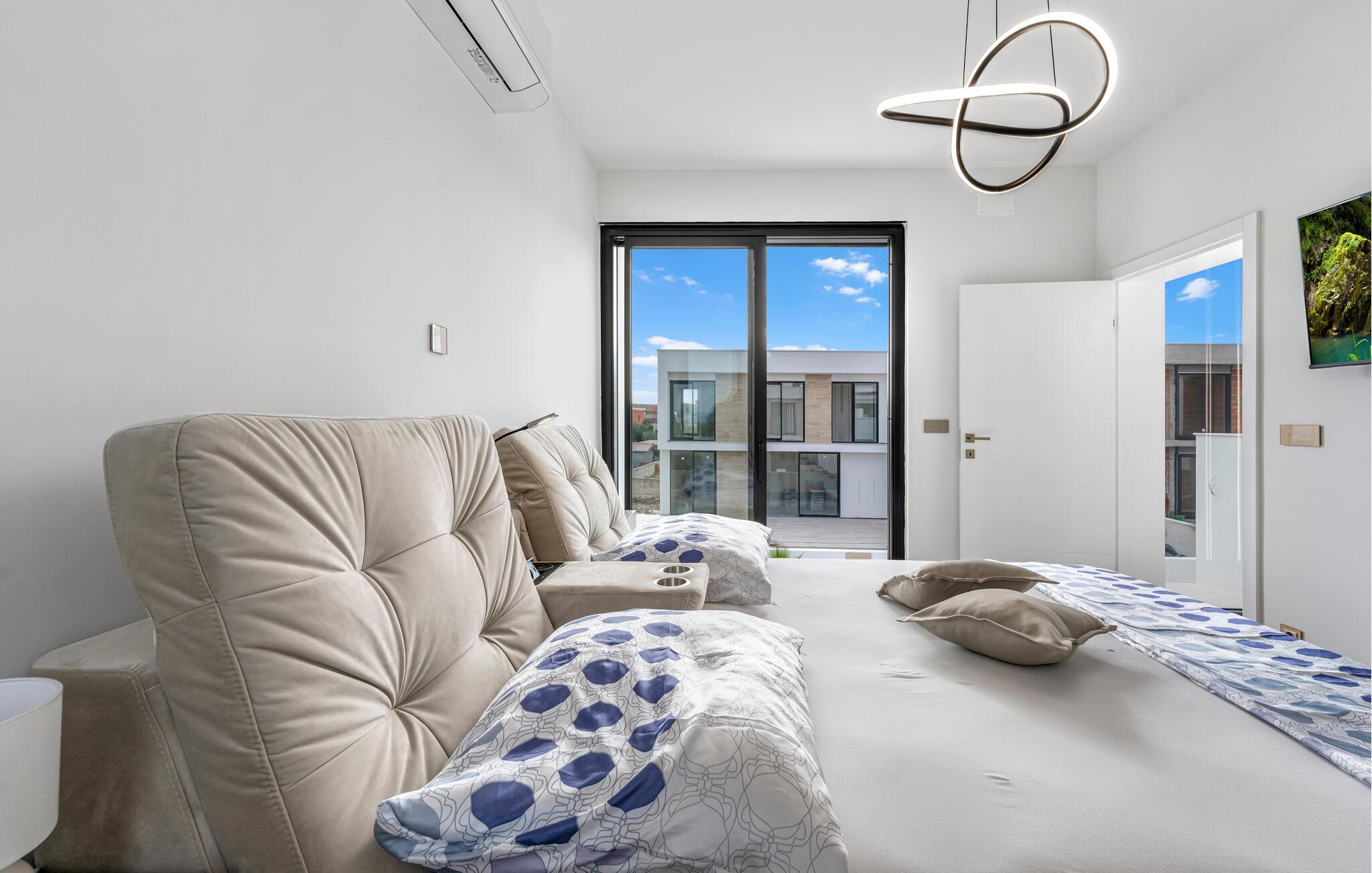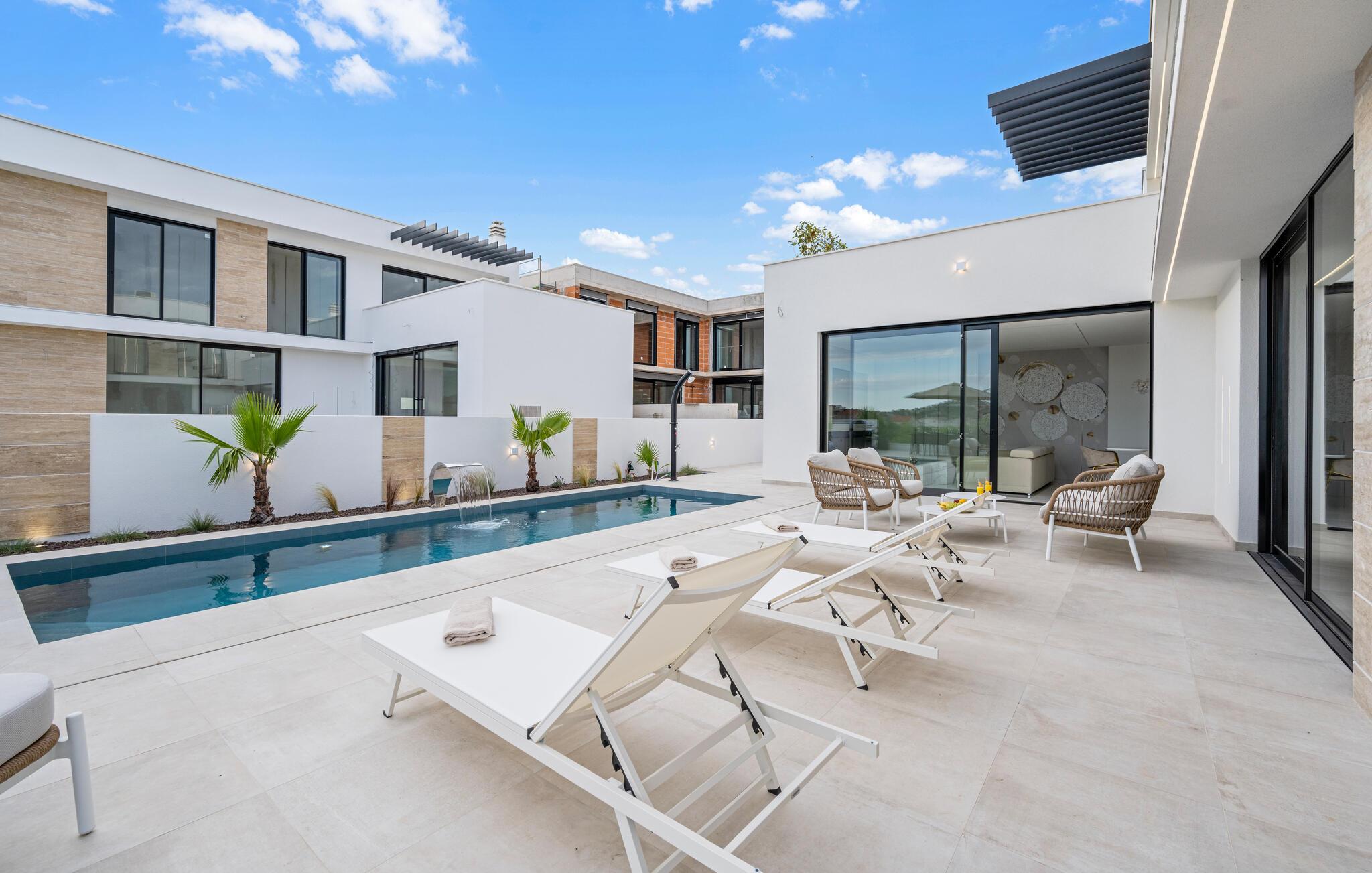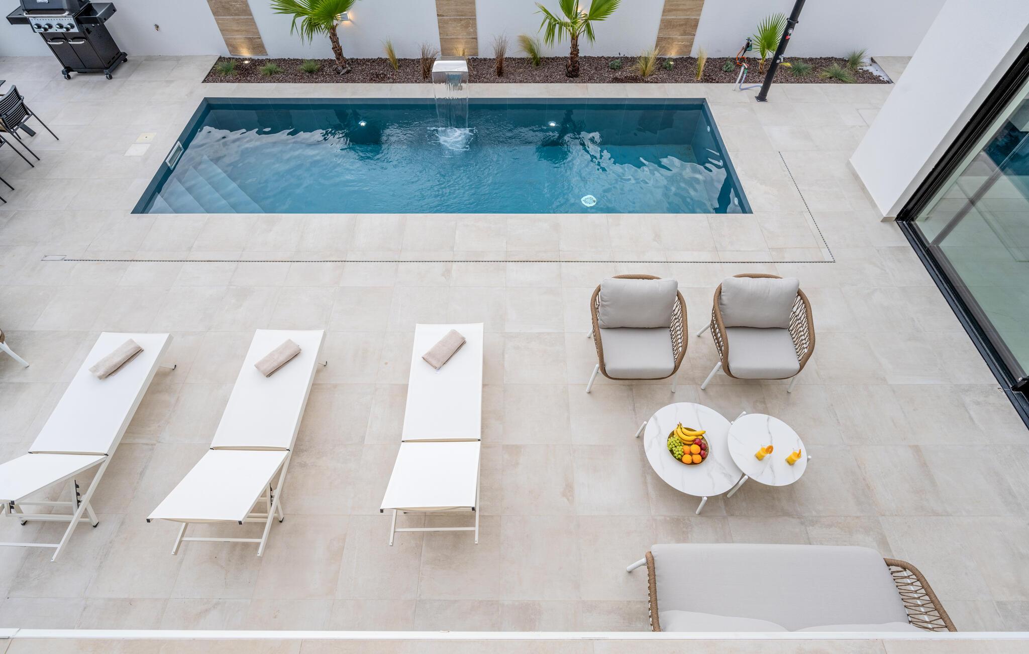 Tilbring ferien i dette moderne feriehuset med basseng. De stilfulle møblene og den gjennomtenkte designen skaper en innbydende atmosfære. Hvert av de komfortable soverommene har eget bad for ekstra komfort. De lyse oppholdsrommene innbyr til avslapping, og det flotte kjøkkenet lar ikke noe tilbake å ønske.