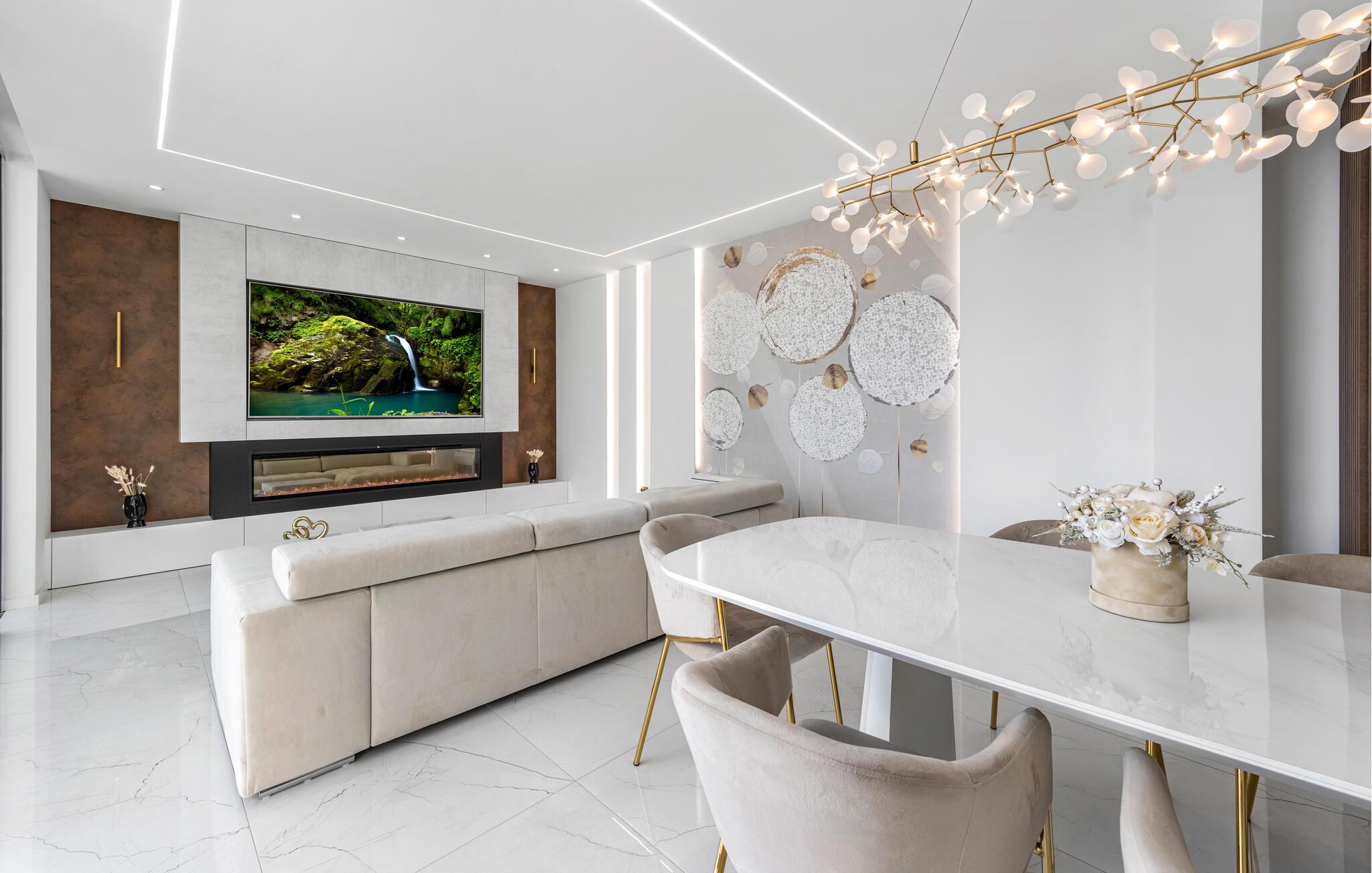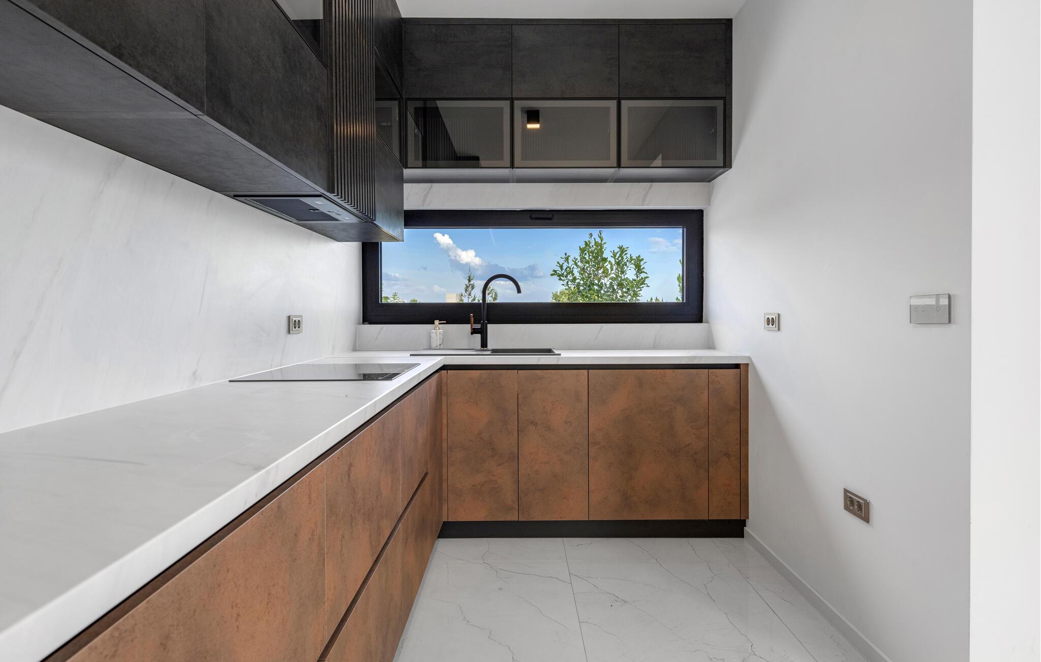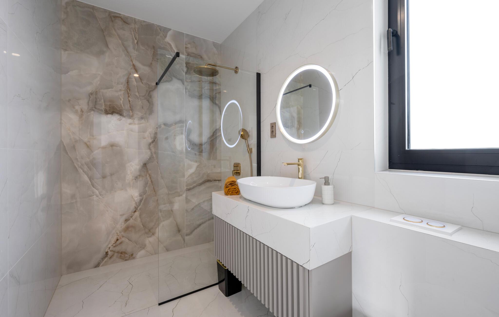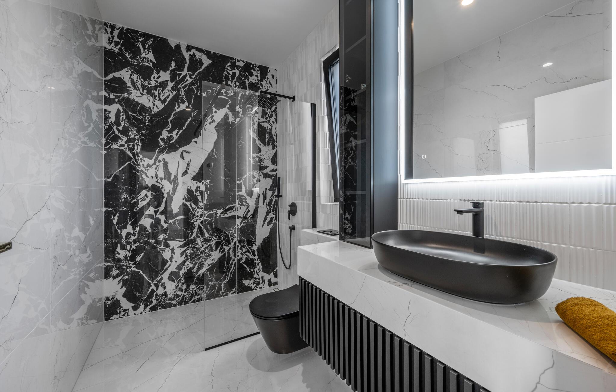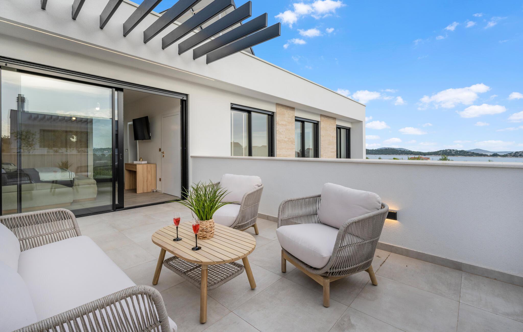 Utenfor finner du en vakker hage med et romslig svømmebasseng, ideelt for forfriskende dukkerter på varme sommerdager. Du kan nyte solen og tilbringe avslappende kvelder på terrassen. Takterrassen er også det ideelle stedet å slappe av og har havutsikt.