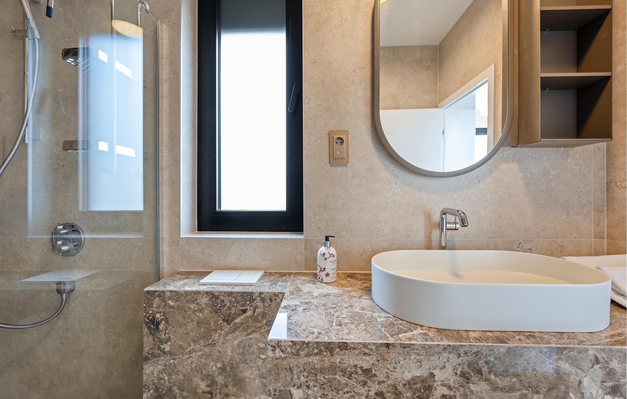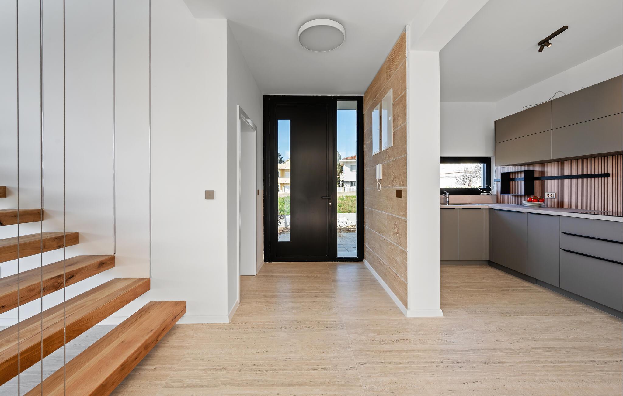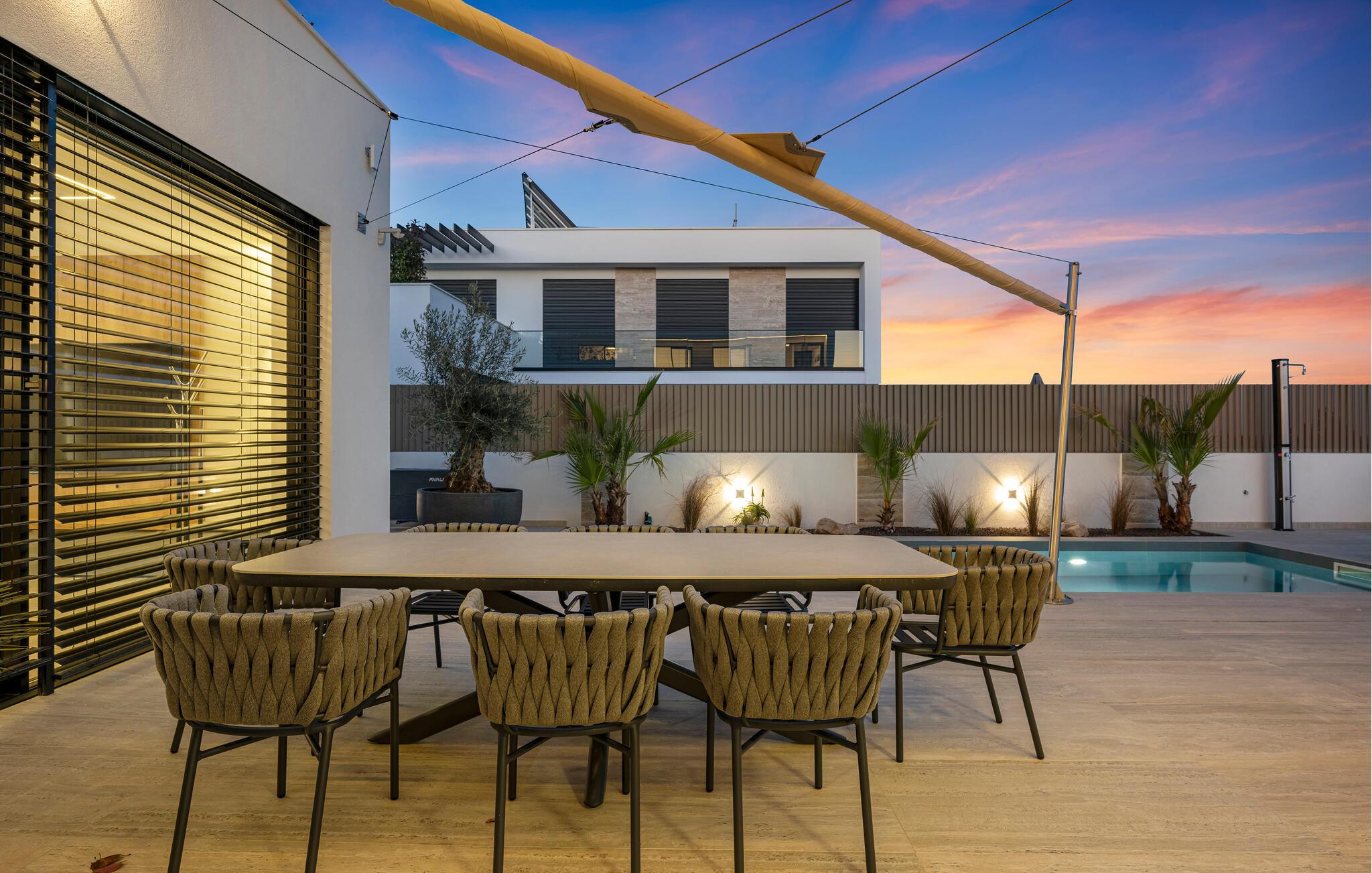 Denne moderne villaen vil glede deg med sin elegante, minimalistiske design. Varme treelementer, myke naturfarger og utvalgte, komfortable møbler skaper en ekte feel-good-atmosfære. Gled deg til koselige matlagingskvelder på det moderne kjøkkenet og stilfulle middager ved det store spisebordet. Sett deg godt til rette i sofaen, se en film på den store Smart-TV-en eller avrund kvelden med et glass vin.