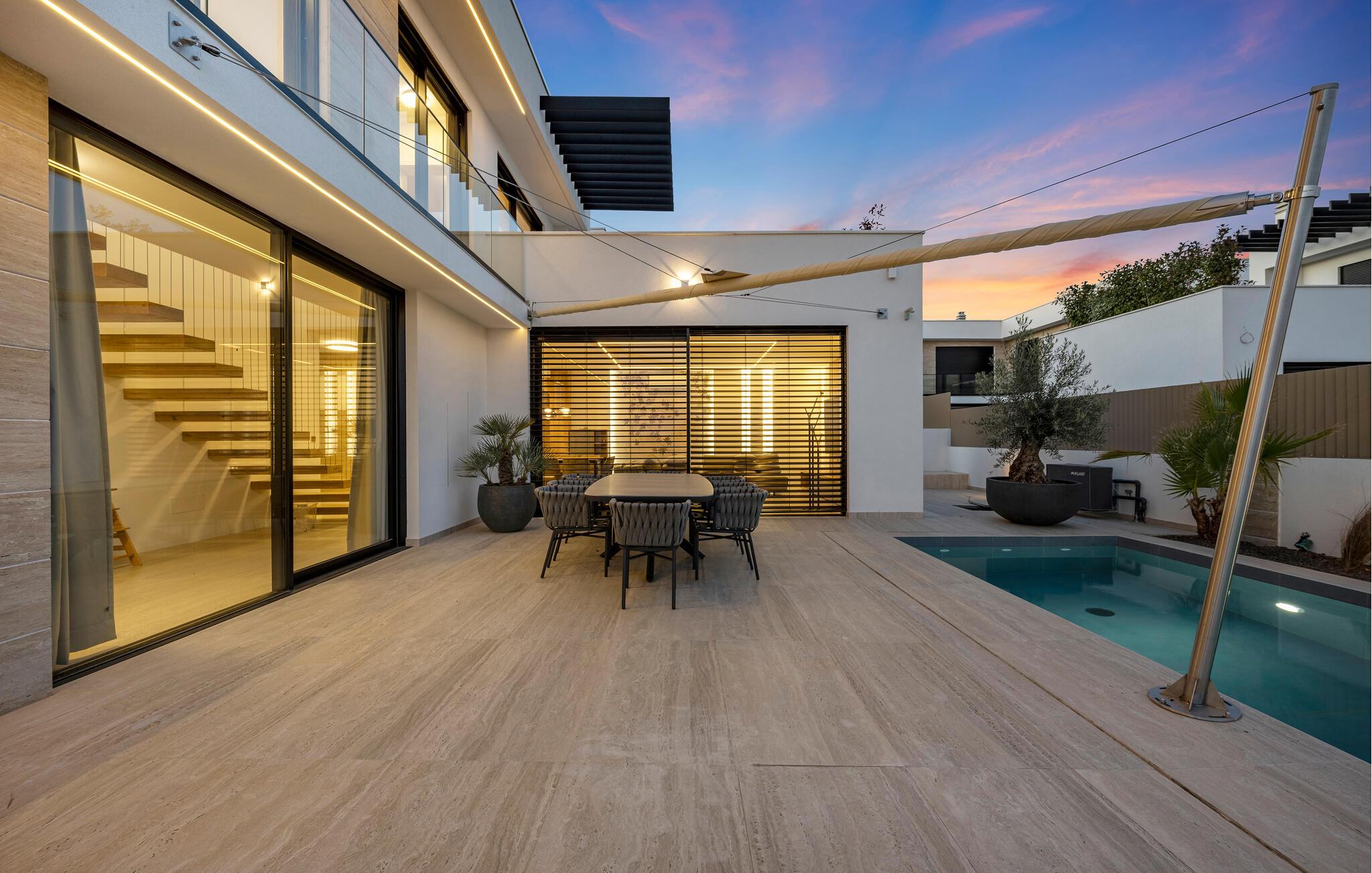 Uteområdet er en oase av avslapning hvor du kan nyte lange soltimer og koselige kvelder med venner. Ta en dukkert i bassenget, lad batteriene på takterrassen og unn deg en avslappende stund under stjernehimmelen.