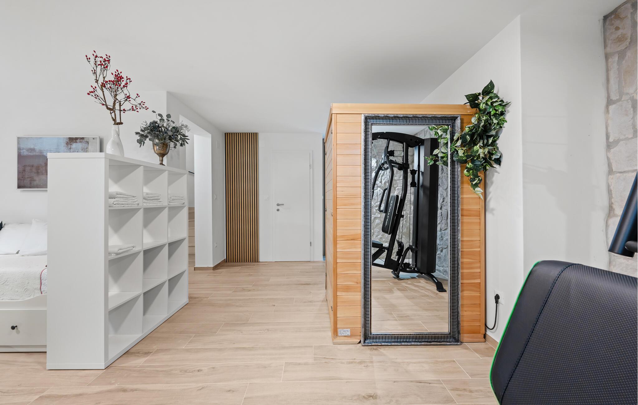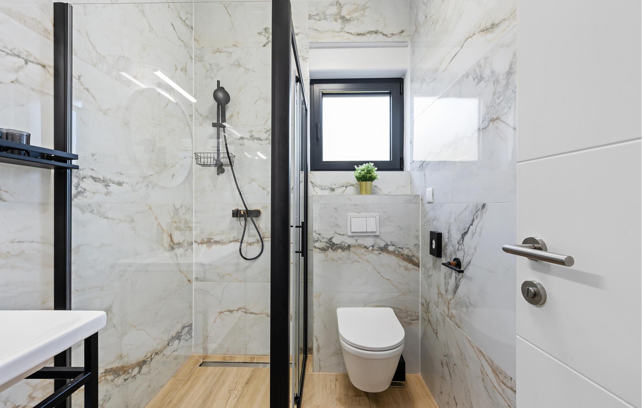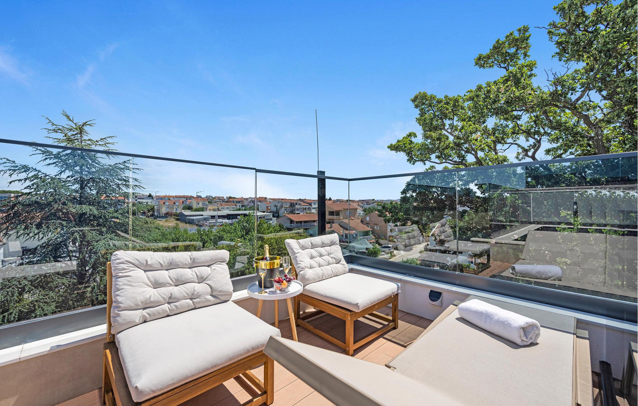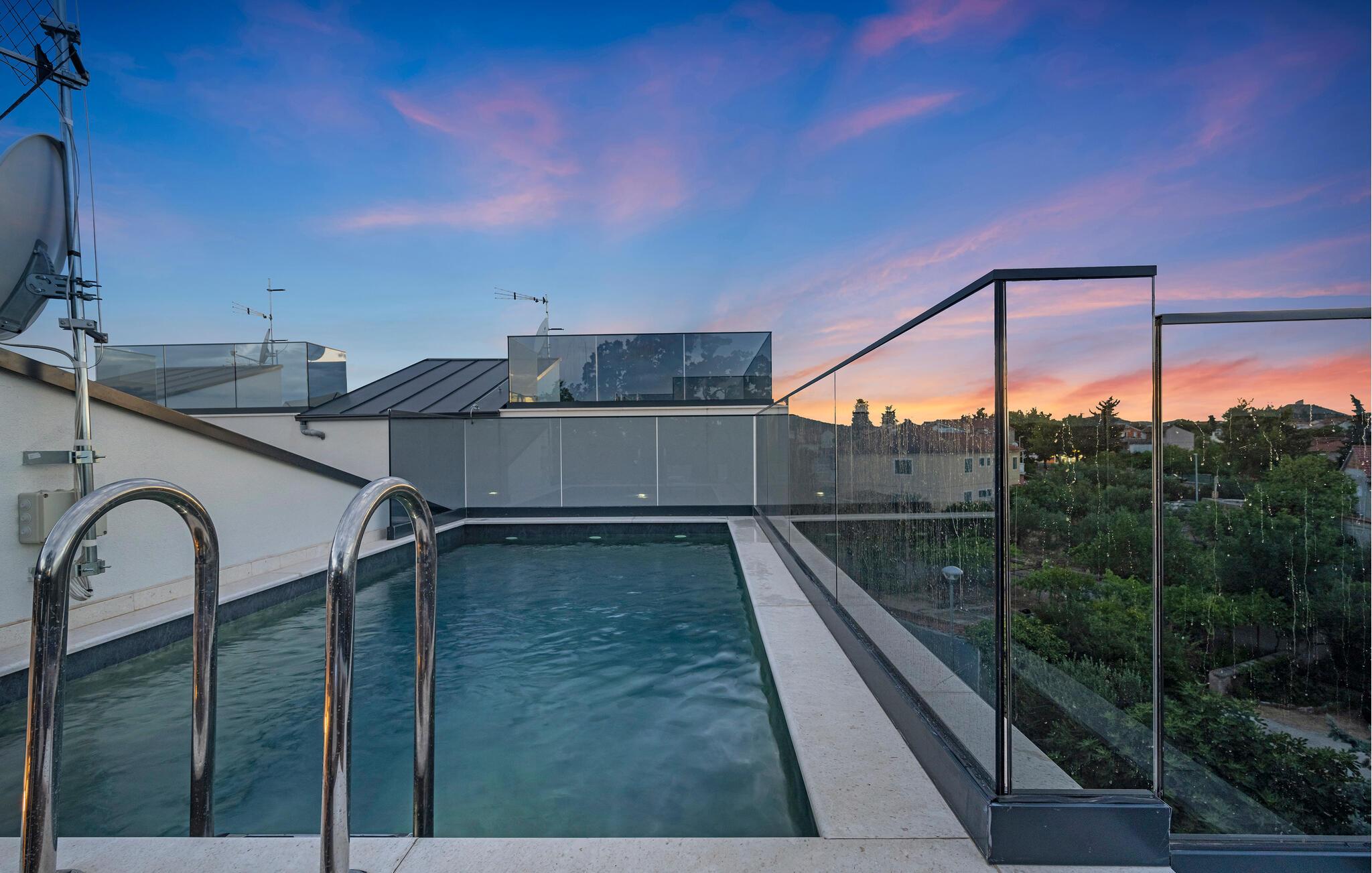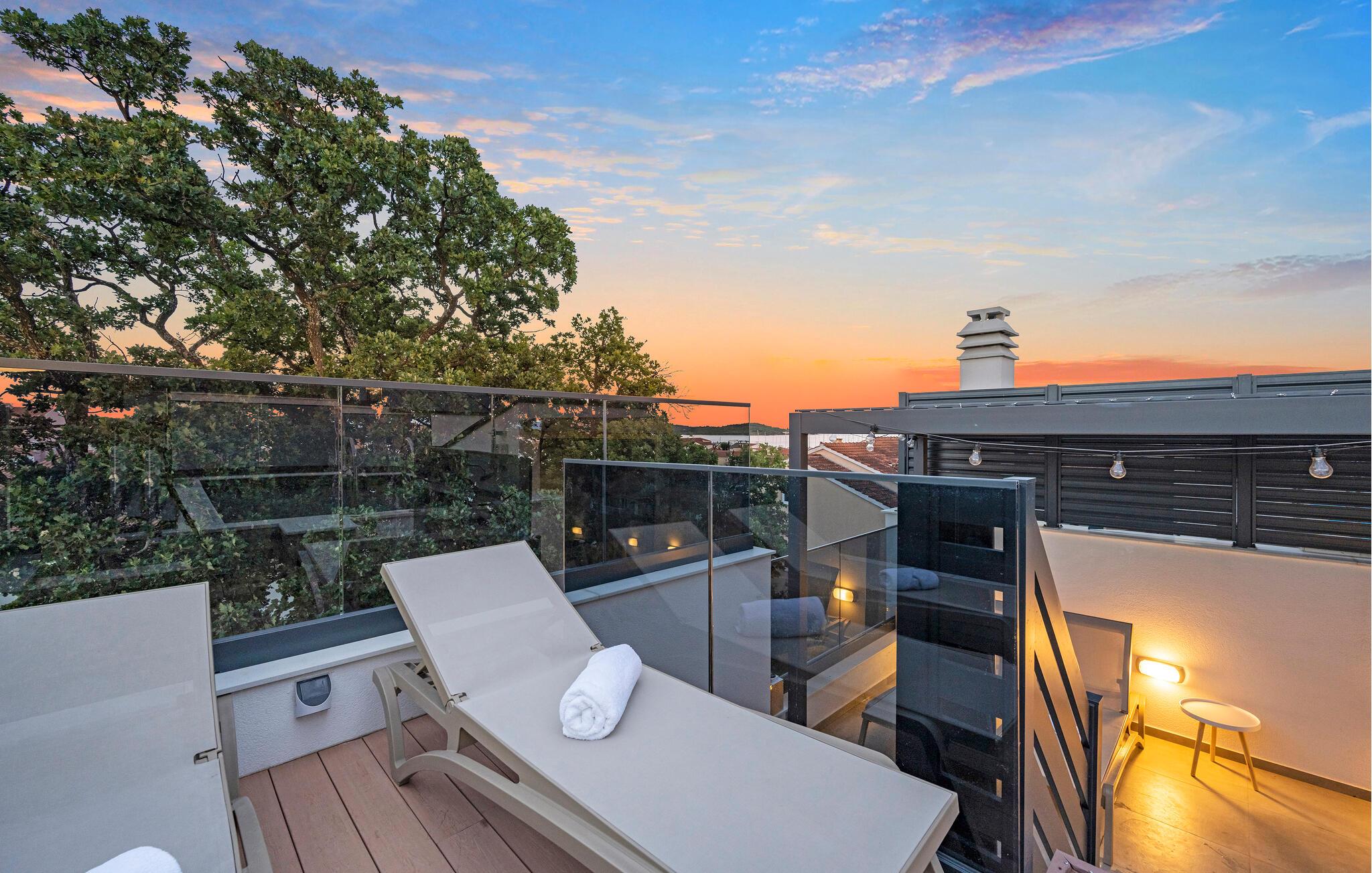 Utenfor venter en romslig terrasse med en overbygd spiseplass. Her kan du nyte deilige måltider i det fri. Tenn opp grillen og nyt den fredelige atmosfæren. Takterrassen lokker med en vakker utsikt helt til havet. Ta en forfriskende dukkert i bassenget, og unn deg en drink i solnedgangen.