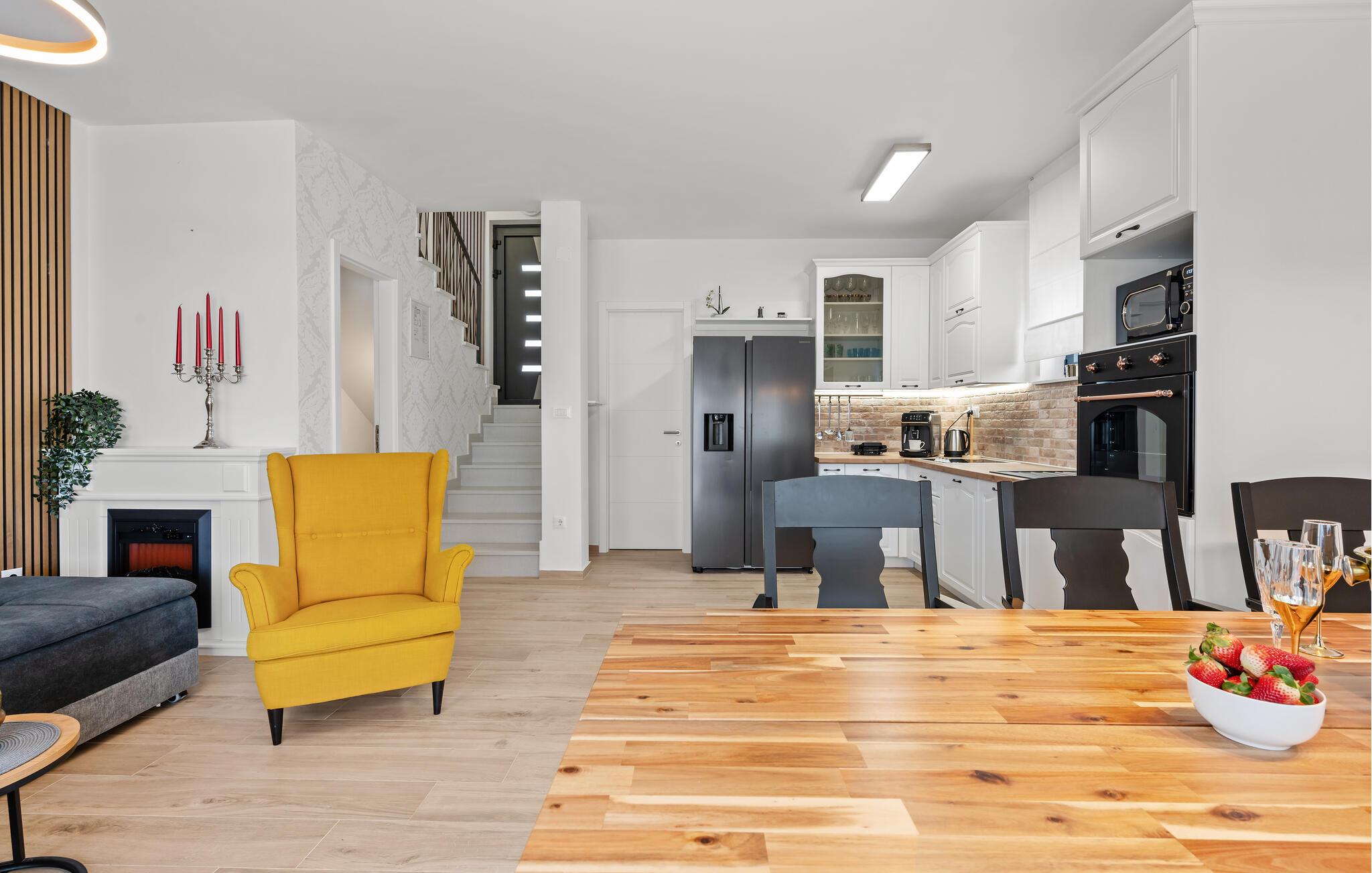 Dette moderne huset kombinerer elegant design med koselig komfort og skjemmer deg bort med mange ekstrafunksjoner. Tilbered deilige måltider på det moderne kjøkkenet, og slå deg ned ved det stilfulle spisebordet. Sett deg godt til rette i den innbydende sofaen for en koselig filmkveld eller spill en runde på PlayStation 5.