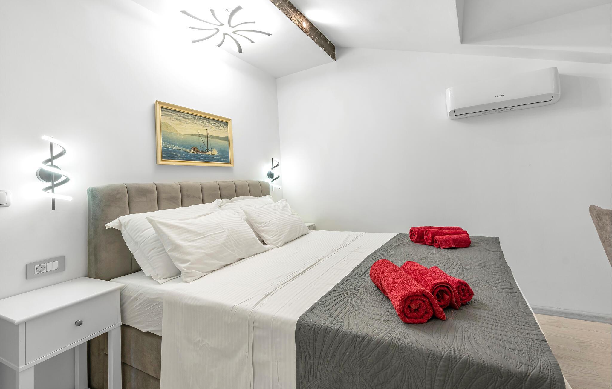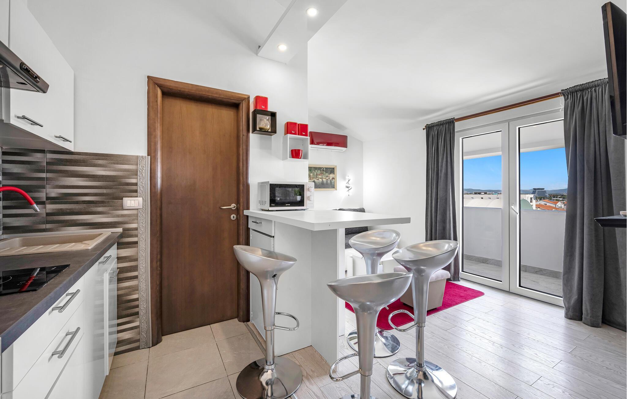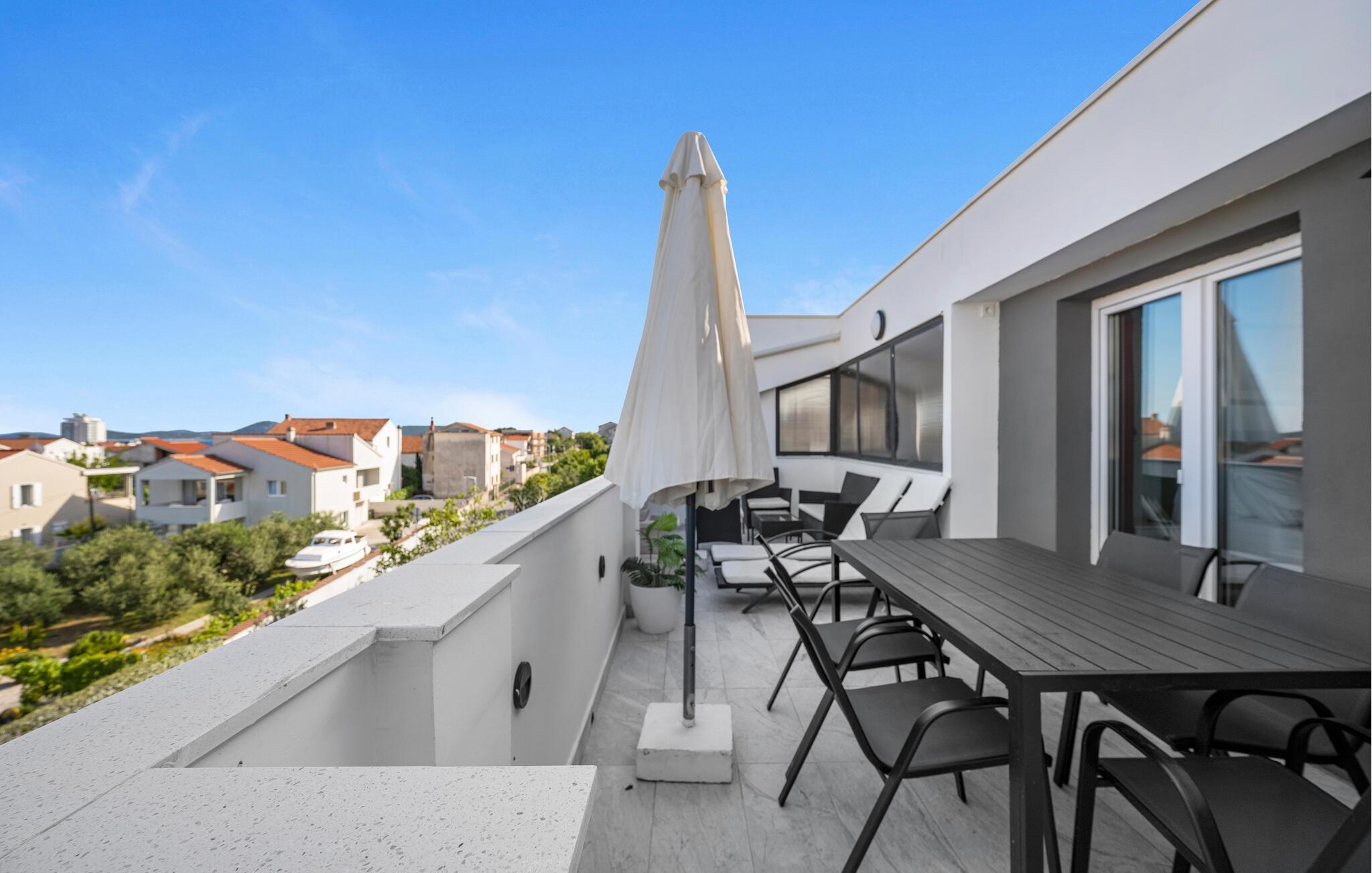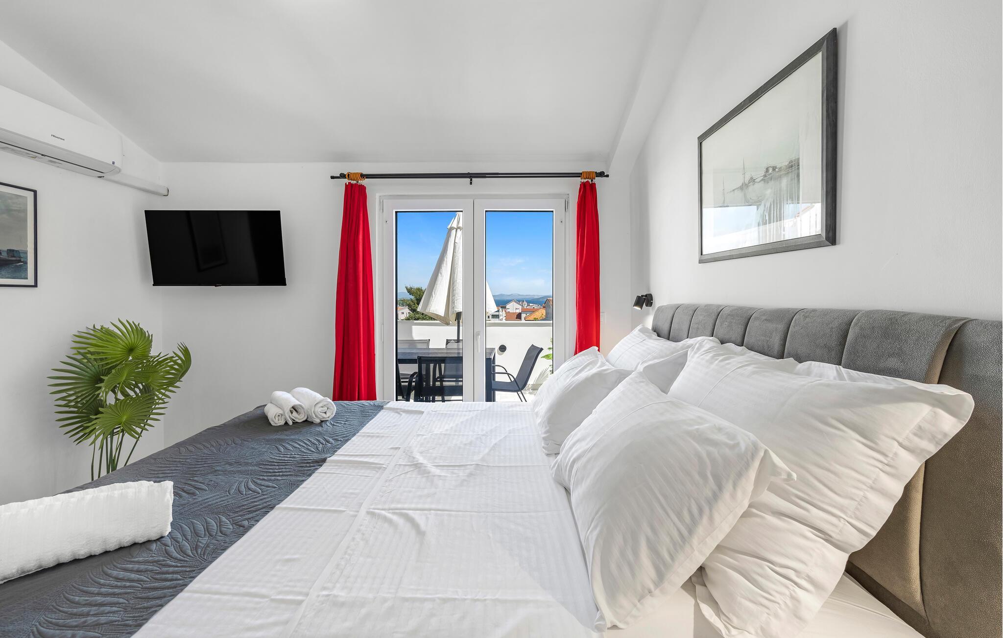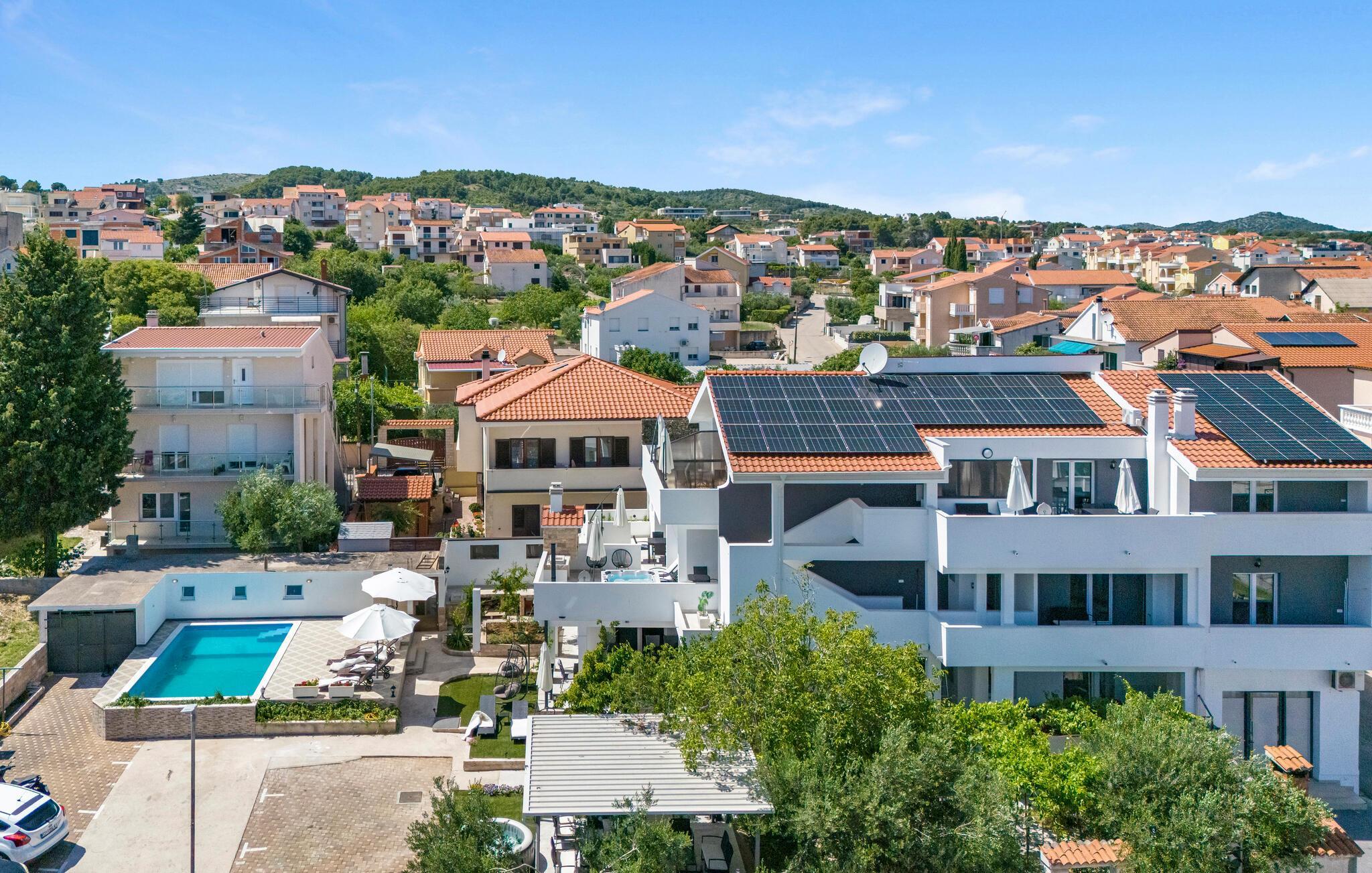 Den livlige kystbyen Vodice er kjent for sine vakre strender og sitt klare vann. Det er bare noen minutters gange fra leiligheten til Plave-plassen og Hangar-stranden. Sentrum innbyr til spaserturer med kafeer, restauranter og små butikker, og den nærliggende marinaen er perfekt for spaserturer ved vannet. Utflukter til Krka nasjonalpark eller Kornati-øyene byr på uforglemmelige naturopplevelser og er lett tilgjengelige herfra.