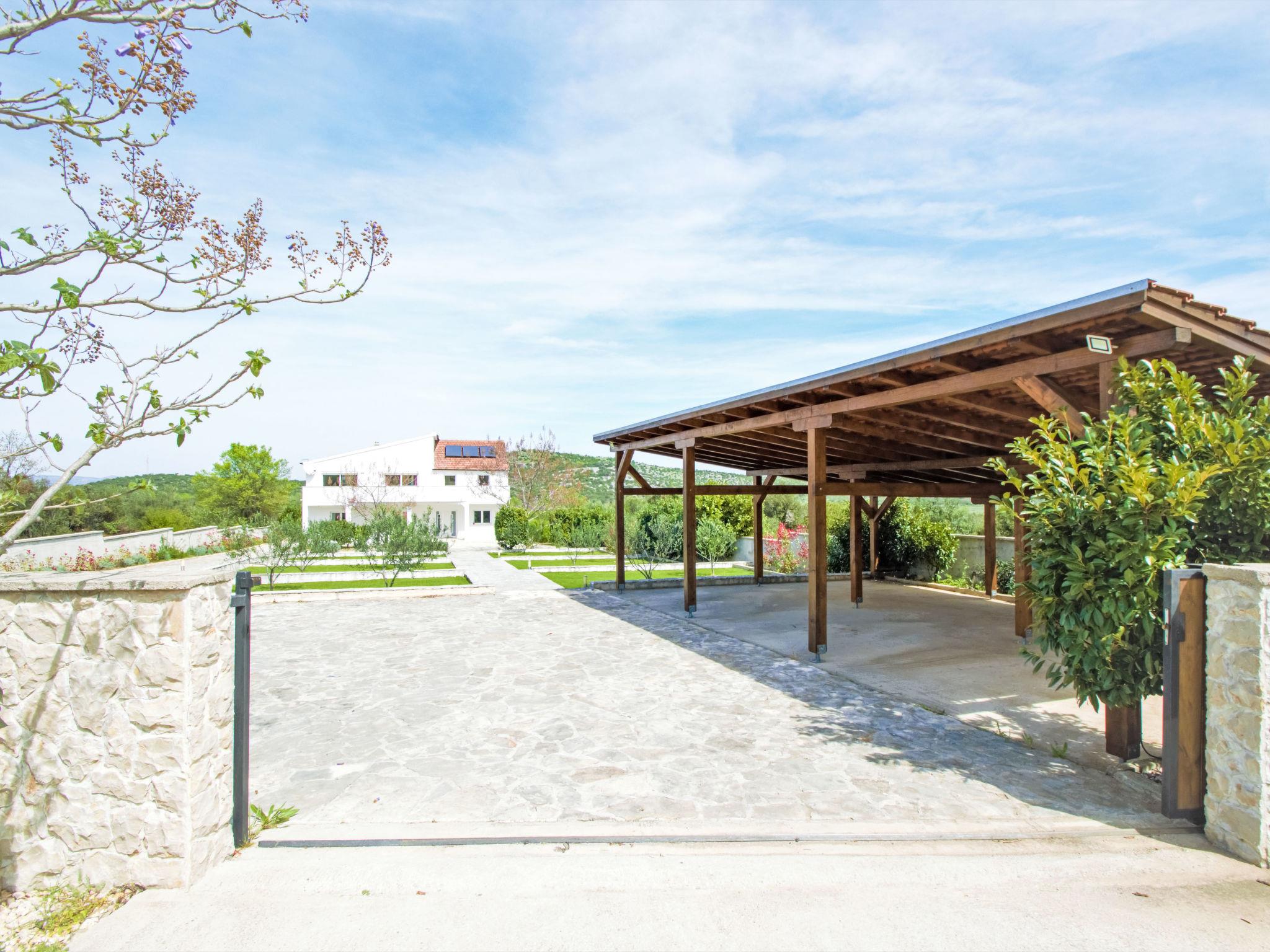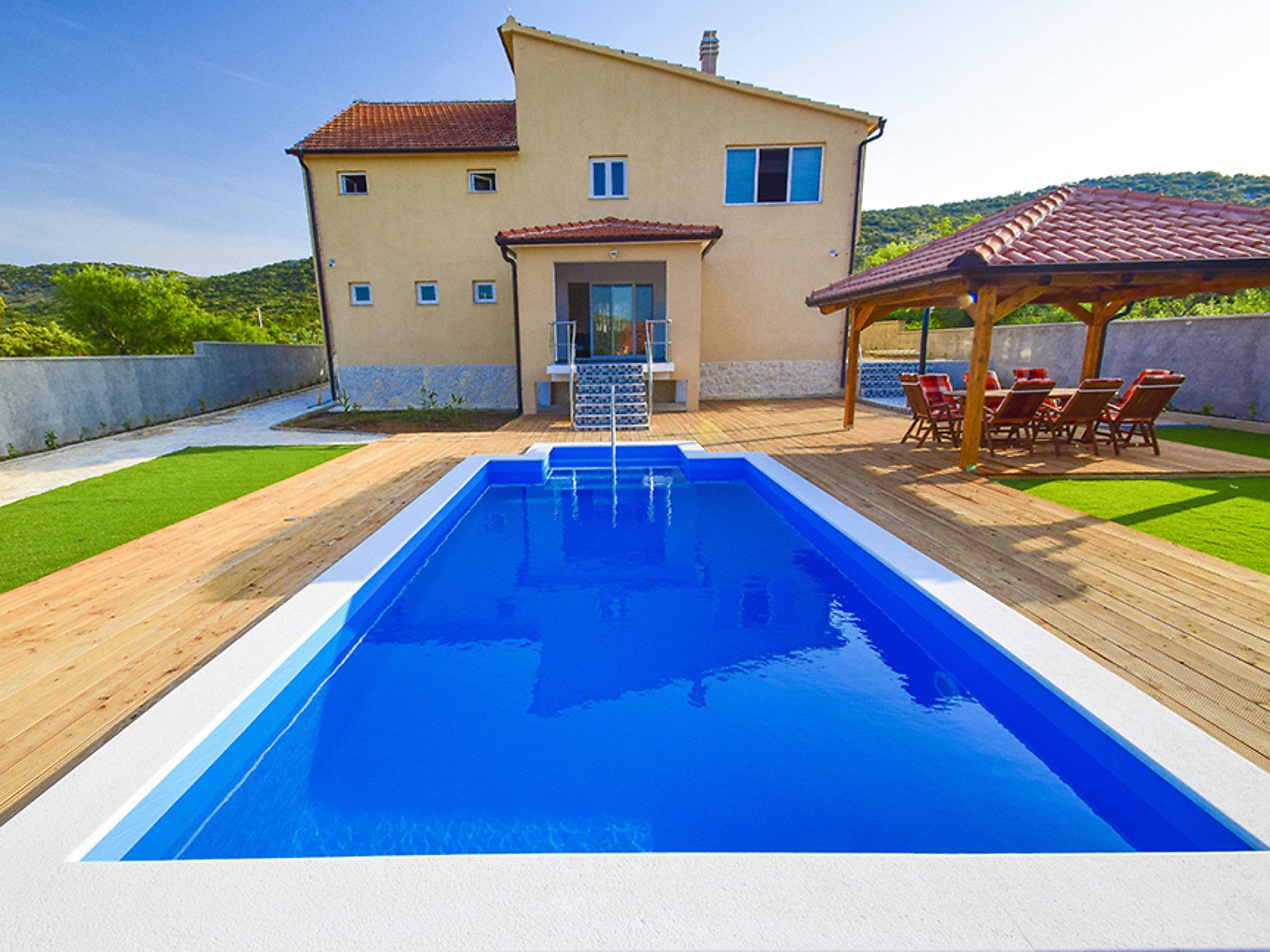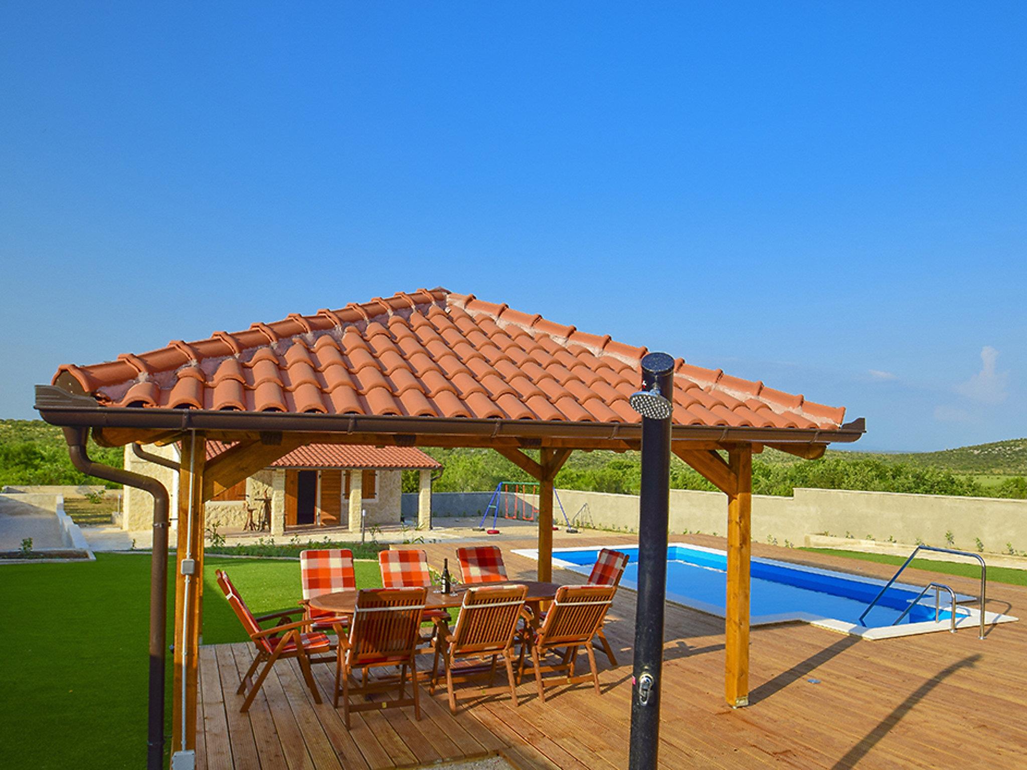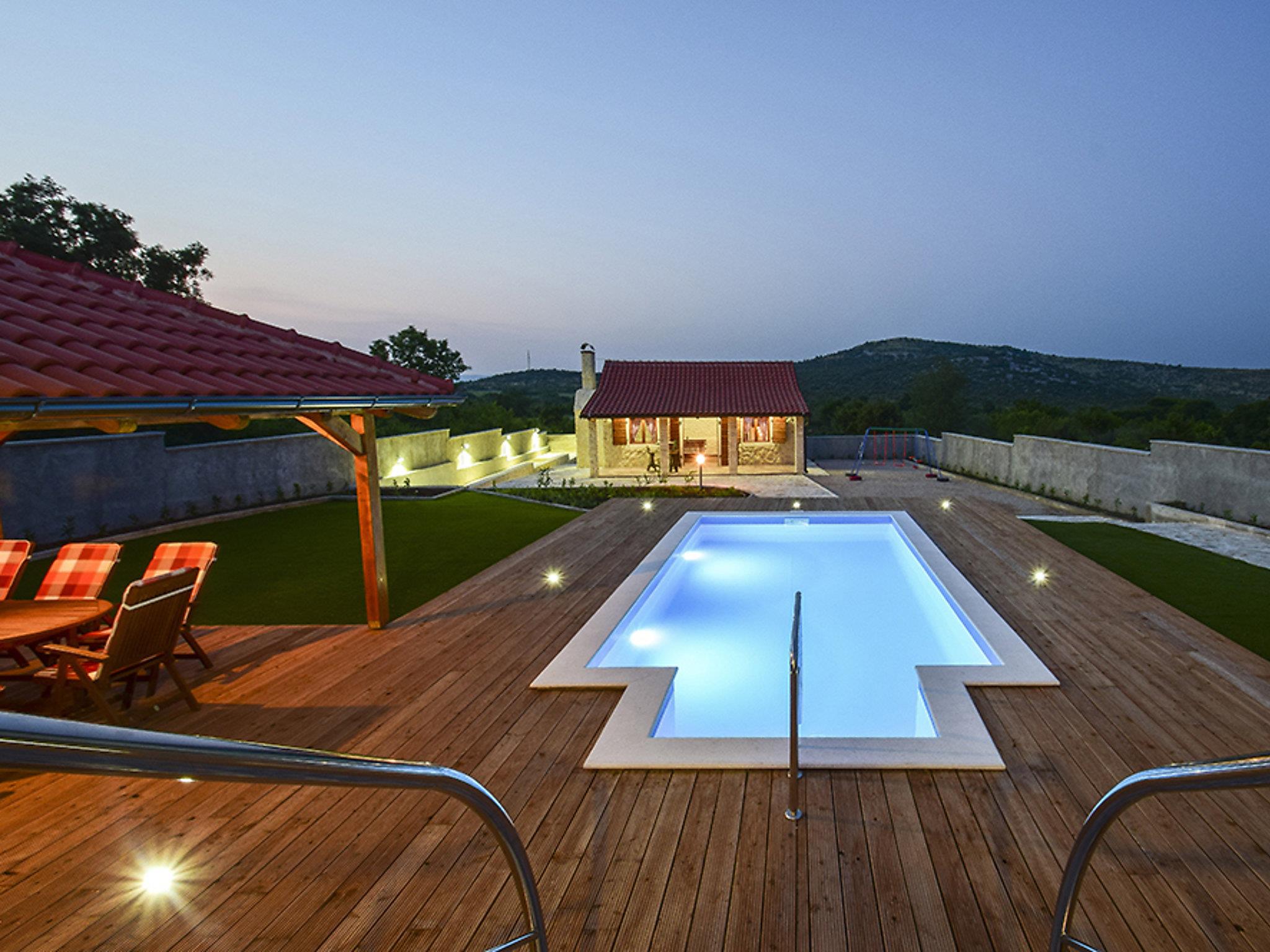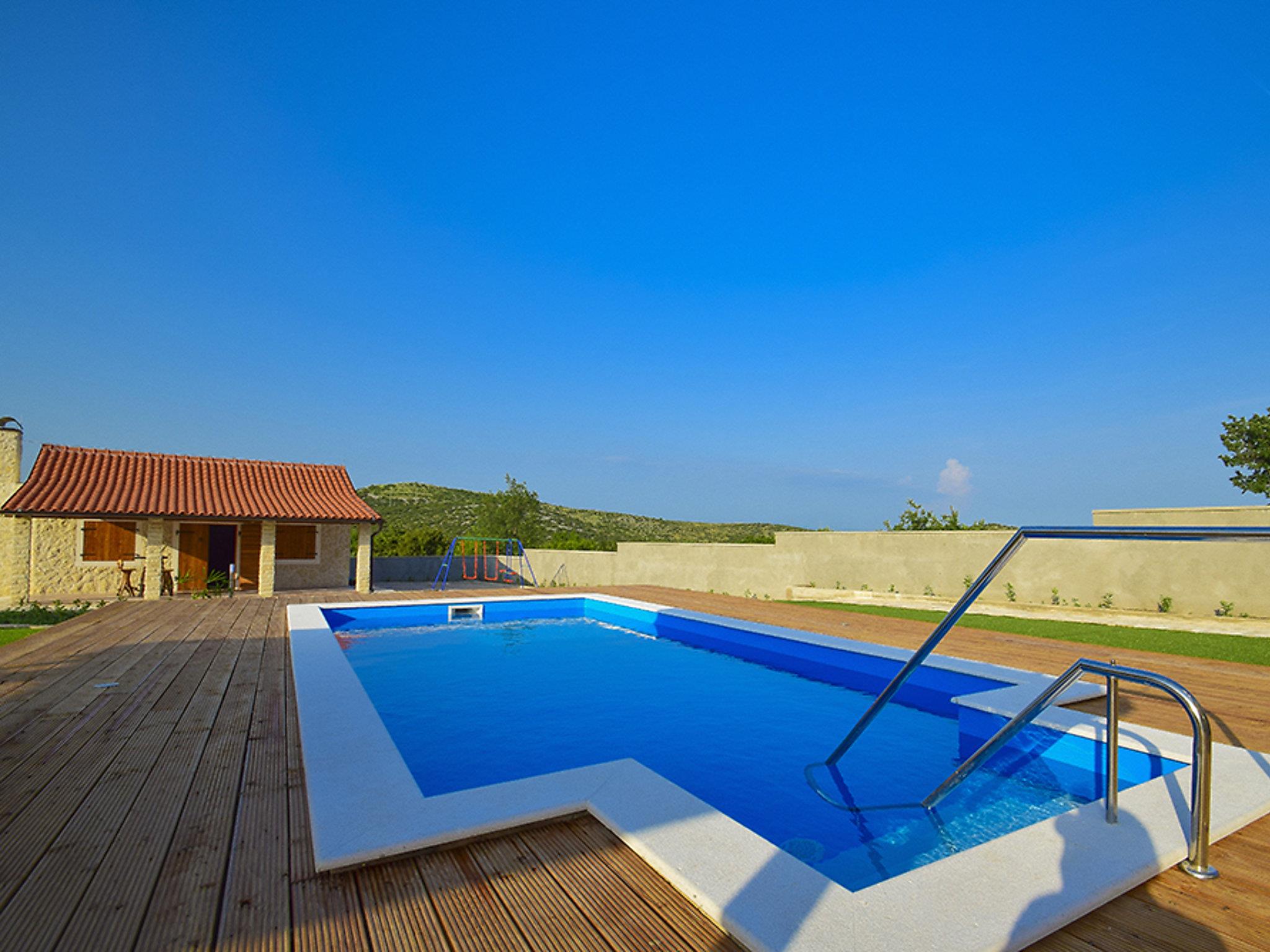 Single-family house "Julija", 2 storeys. In the hamlet Grabovci 11 km from the centre of Vodice, in a sunny position, 8 km from the sea, located by a road. Private: property 3'500 m2 (fenced) with lawn 100 m2, swimming pool angular (25 m2, depth 140 cm, seasonal availability: 01.May. - 15.Oct.). Outdoor shower, pool house with fridge, WC and cooking stove, table tennis, boules, arbour (20 m2), terrace (80 m2), garden furniture, barbecue, children's playground (slide, swing). In the house: internet access, sauna, hot tub, table football, central heating system, washing machine. Available: boat (extra). Room cleaning on request (extra). Airport transfer (extra). Roofed, parking (for 3 cars) at the house on the premises. Shop 10 km, restaurant 8 km, bus stop 9 km, pebble beach 12 km, public bathing area 12 km. Cycle lane 6 km. Nearby attractions: NP Krka 30 km. Well-known lakes can easily be reached: Vransko jezero 20 km. On request: airport transfer to the holiday accommodation.