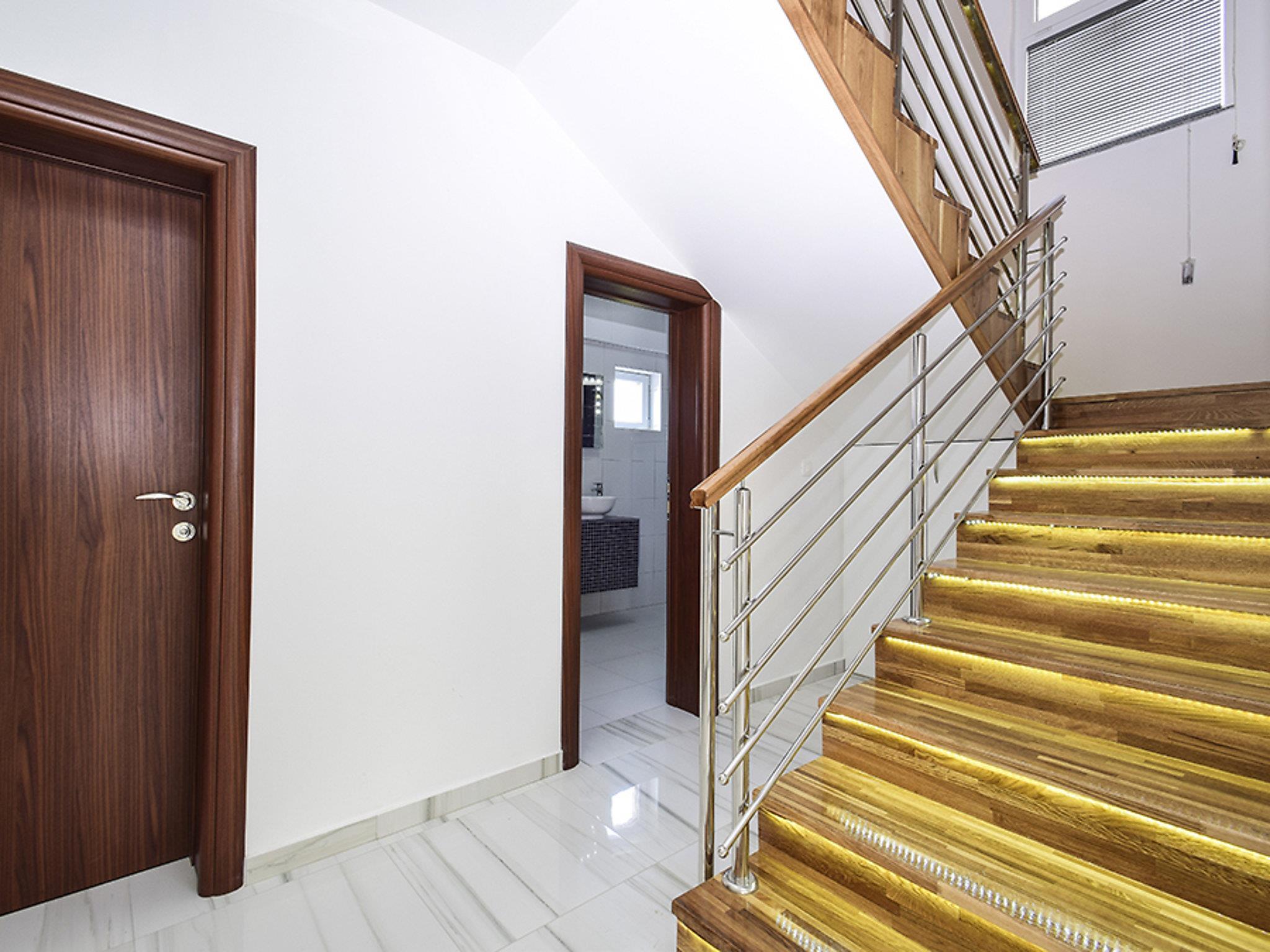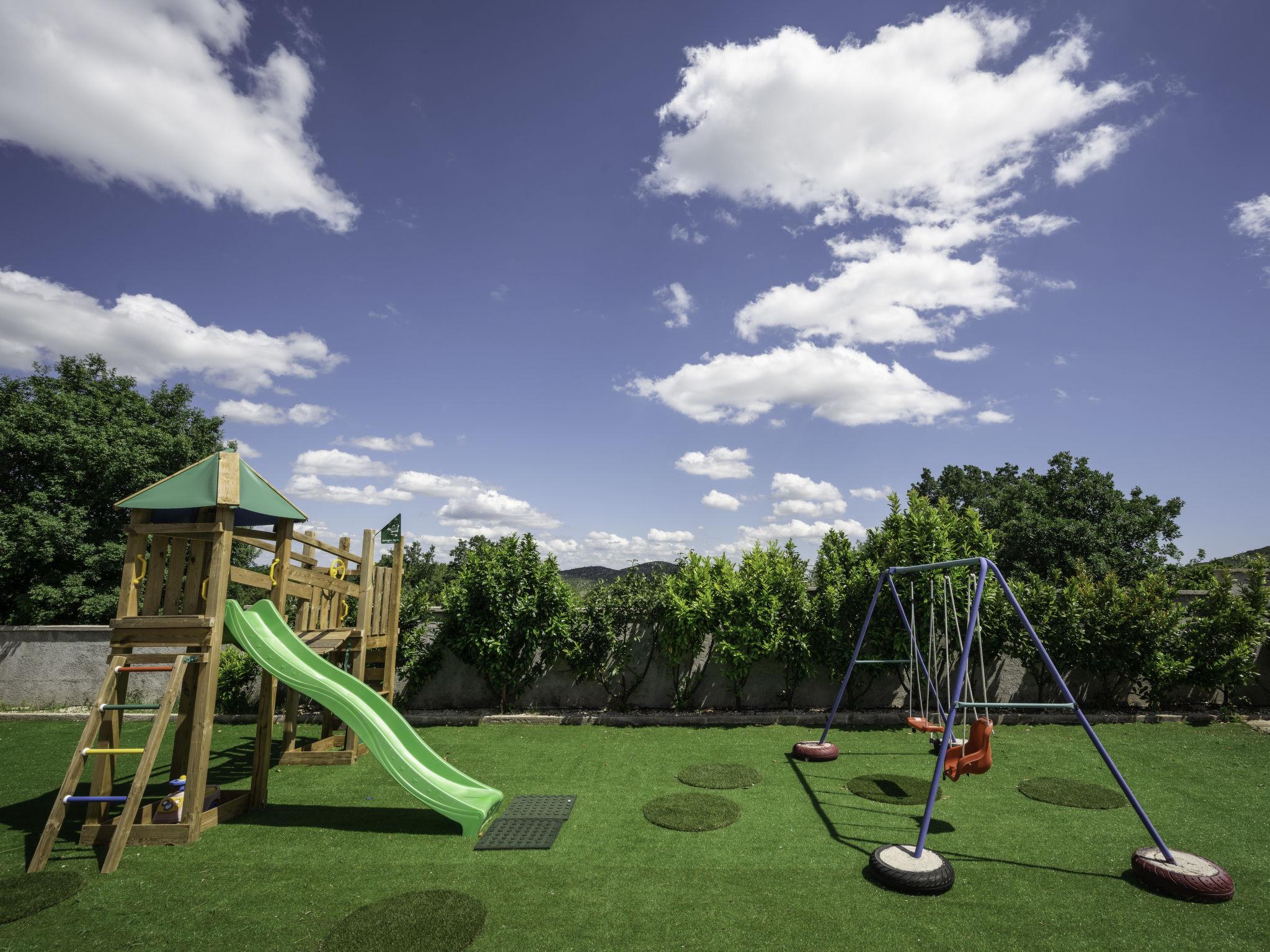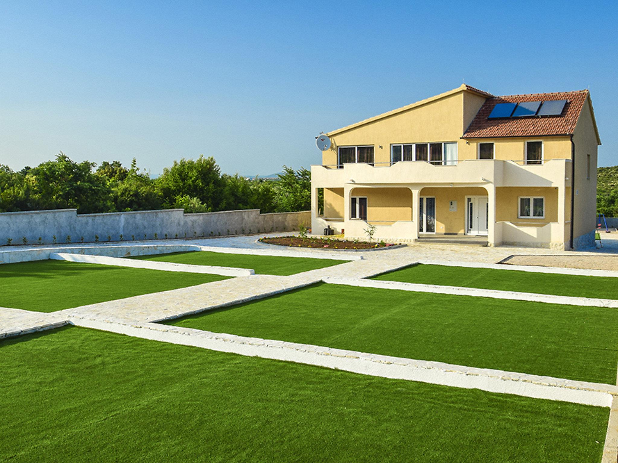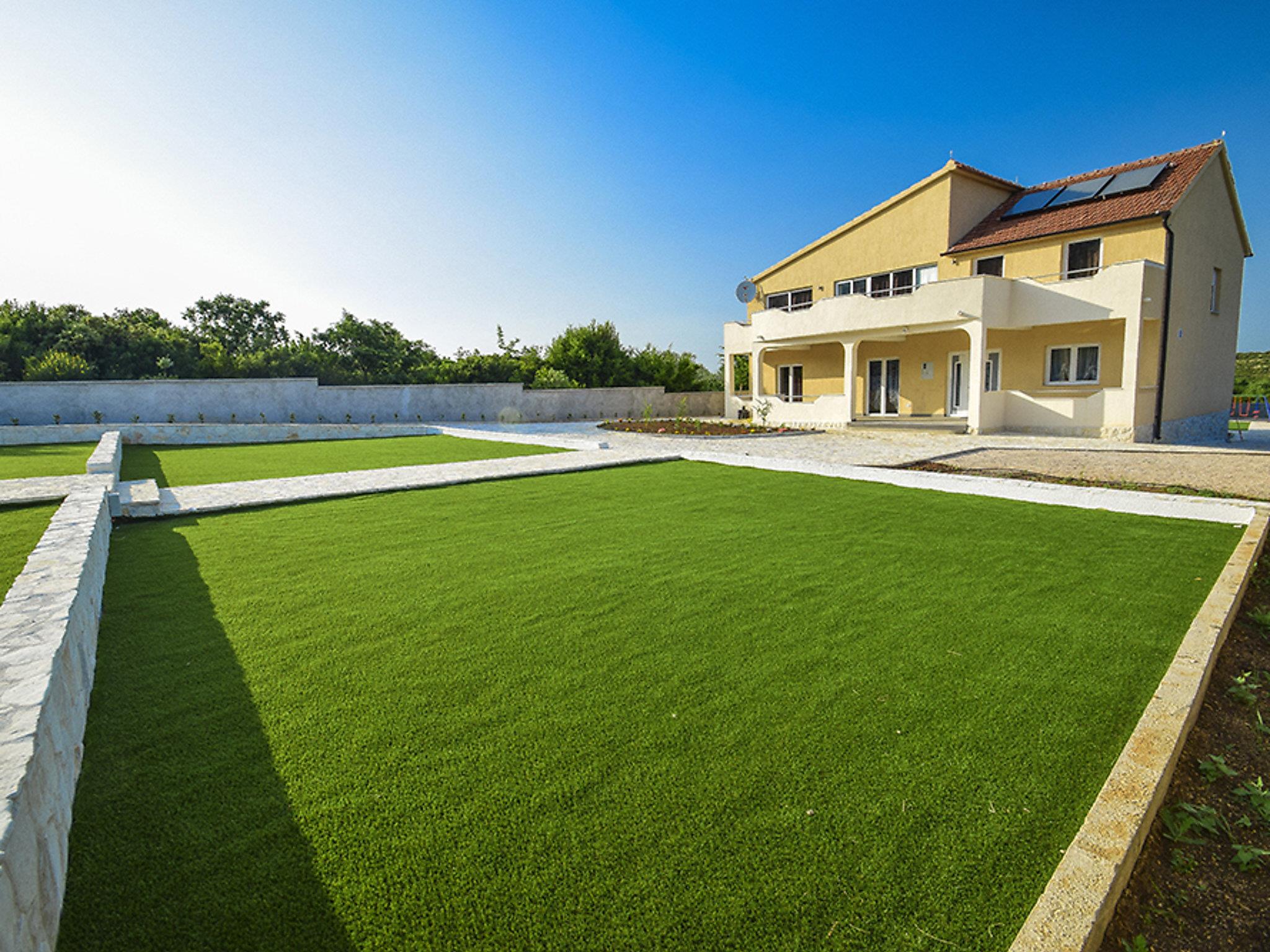 Single-family house "Julija", 2 storeys. In the hamlet Grabovci 11 km from the centre of Vodice, in a sunny position, 8 km from the sea, located by a road. Private: property 3'500 m2 (fenced) with lawn 100 m2, swimming pool angular (25 m2, depth 140 cm, seasonal availability: 01.May. - 15.Oct.). Outdoor shower, pool house with fridge, WC and cooking stove, table tennis, boules, arbour (20 m2), terrace (80 m2), garden furniture, barbecue, children's playground (slide, swing). In the house: internet access, sauna, hot tub, table football, central heating system, washing machine. Available: boat (extra). Room cleaning on request (extra). Airport transfer (extra). Roofed, parking (for 3 cars) at the house on the premises. Shop 10 km, restaurant 8 km, bus stop 9 km, pebble beach 12 km, public bathing area 12 km. Cycle lane 6 km. Nearby attractions: NP Krka 30 km. Well-known lakes can easily be reached: Vransko jezero 20 km. On request: airport transfer to the holiday accommodation.