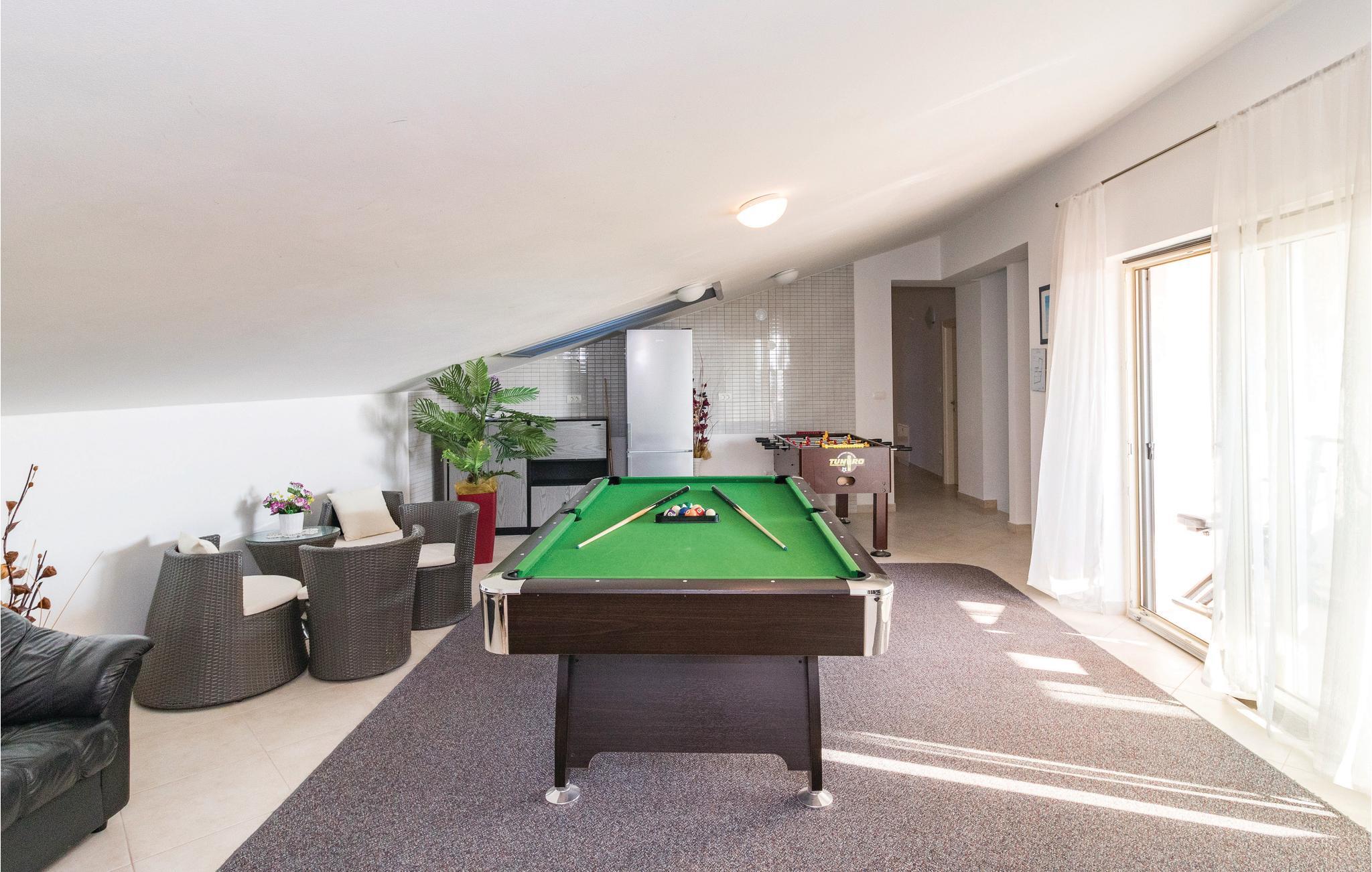 Dette feriehuset, som er utstyrt med en rekke ekstrafunksjoner, ønsker deg velkommen til middelalderbyen Vodnjan, og er det ideelle bostedet for store familier eller vennefamilier som ønsker å kombinere avslapning med sjarmerende severdigheter. Det lyse, vennlige interiøret gir god plass til hyggelige måltider og spillkvelder, men også til koselige tilfluktssteder for dem som søker fred og ro. Lag mat sammen eller hver for seg, mens andre trener i treningsrommet eller hygger seg med bordfotball, dart eller biljard i aktivitetsrommet.