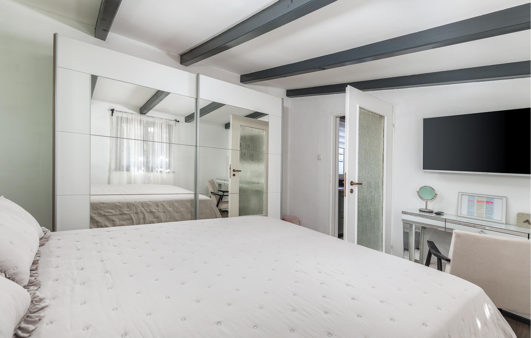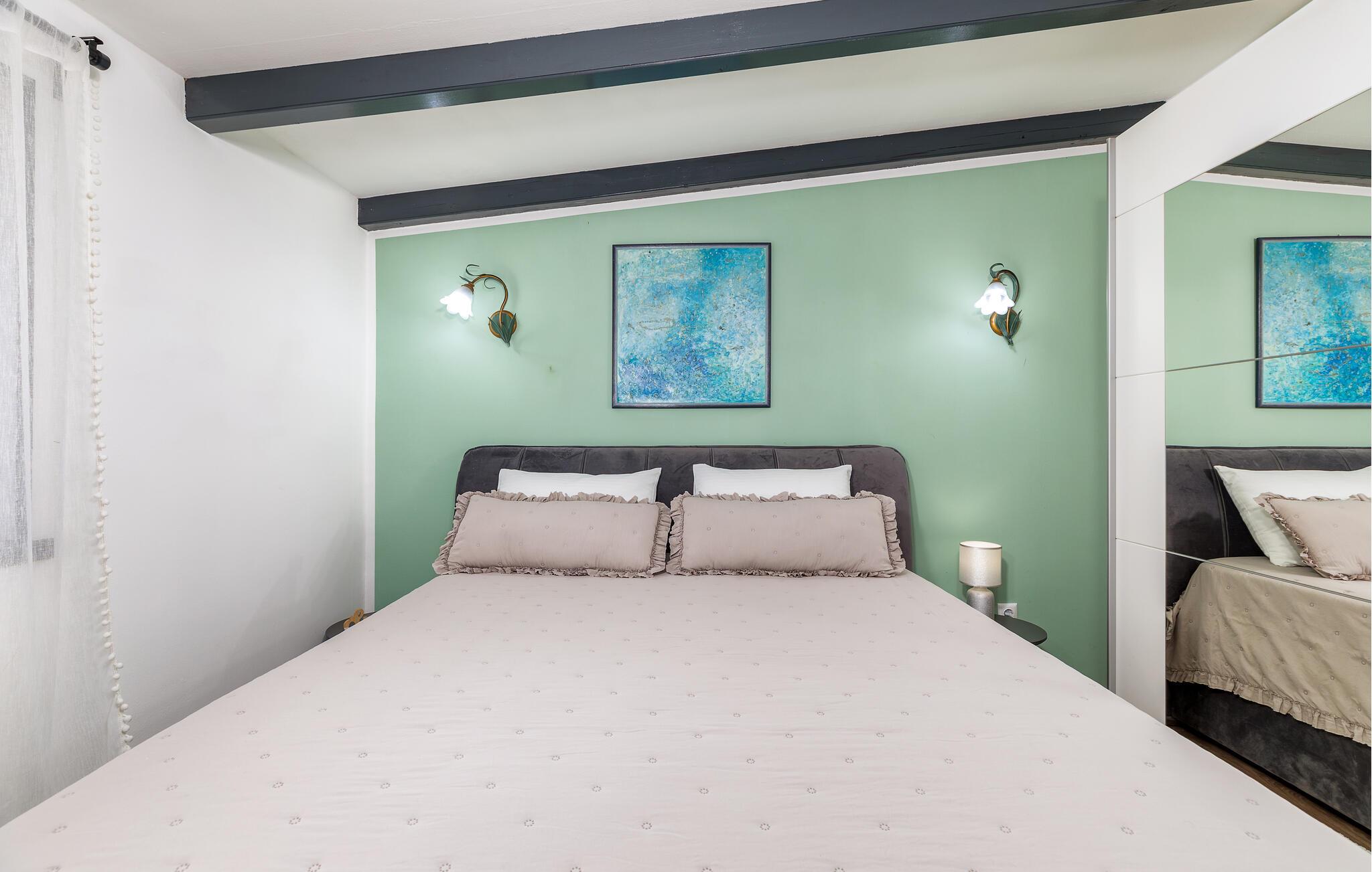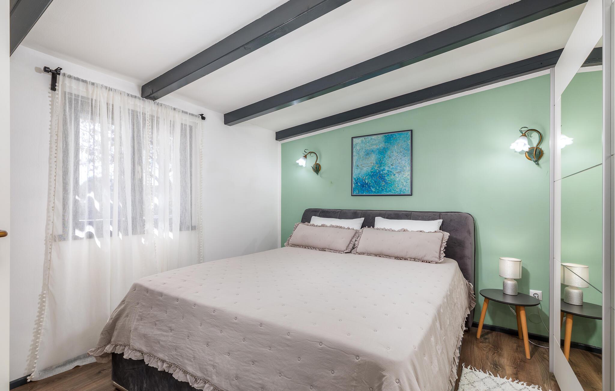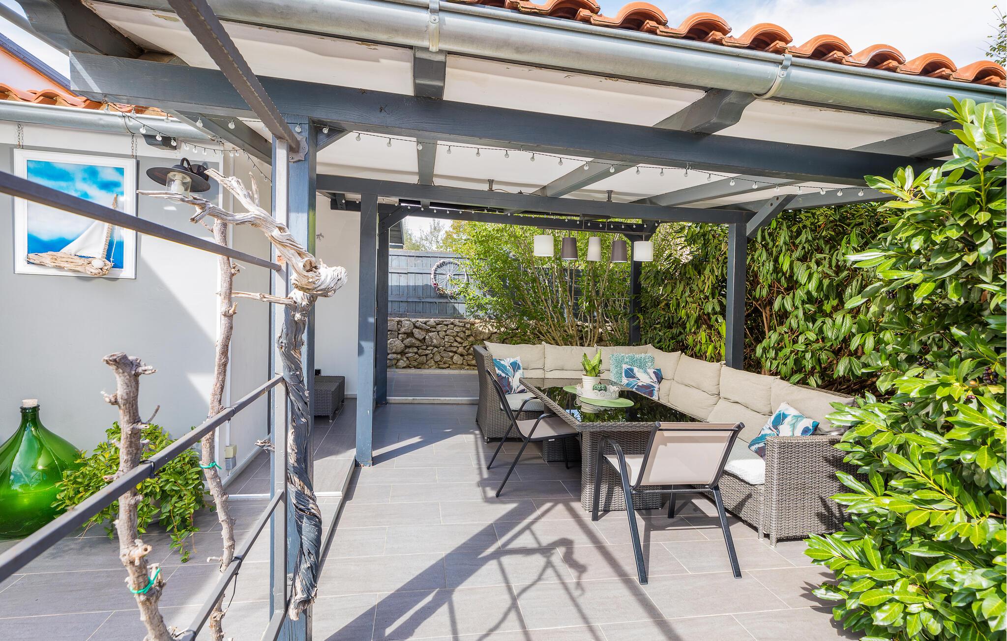 Det har mange detaljer som gir det en spesiell sjarm, og du vil føle deg som hjemme. Det har ett soverom og er utstyrt med alle nødvendige apparater. Foran huset er det en stor overbygd terrasse for sosialt samvær og hygge, mens det er en annen terrasse med spisebord og grill.