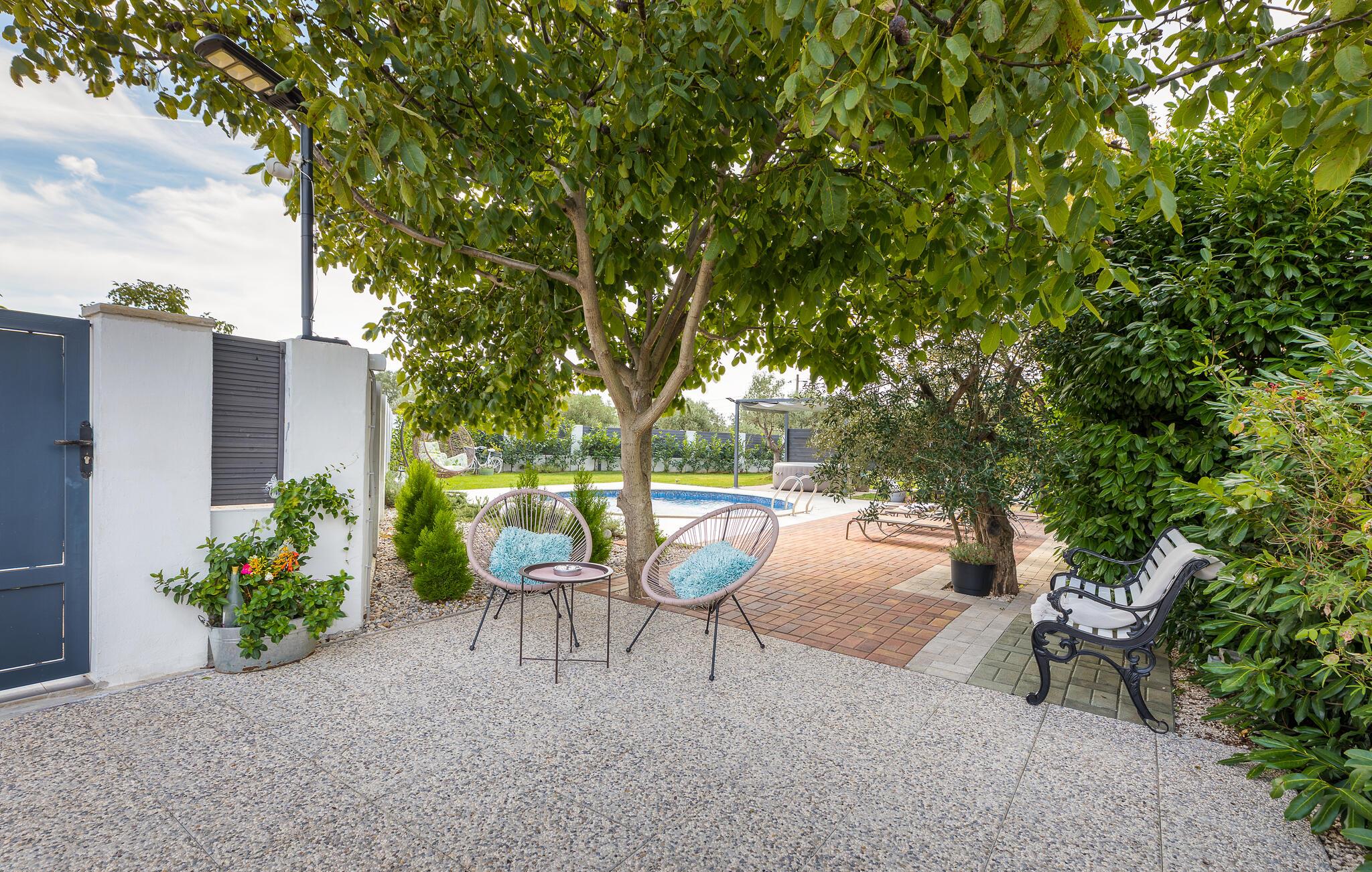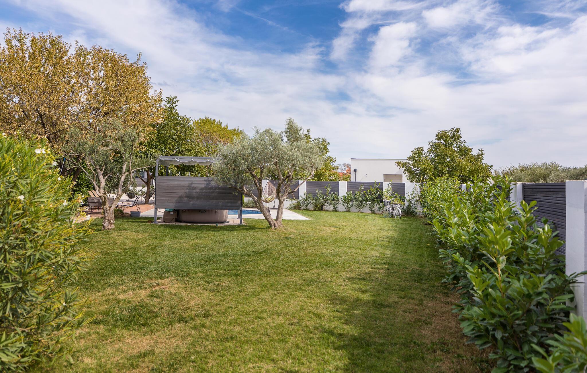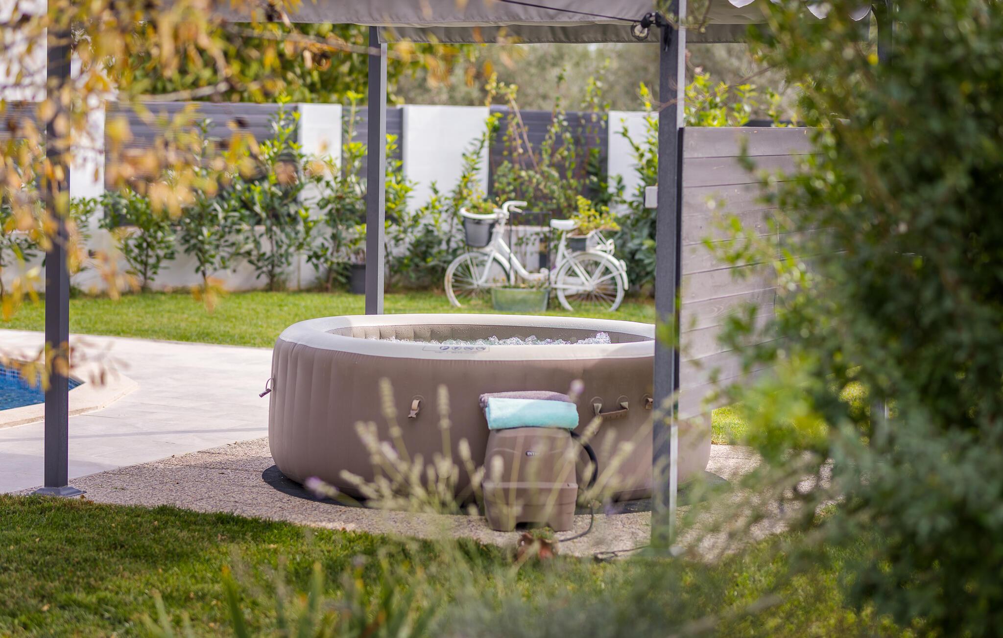 På den store tomten er det et svømmebasseng med solterrasse og et overbygd boblebad. Et badmintonnett og racketer er tilgjengelig for noen aktiviteter, mens det også er en trampoline for de minste.