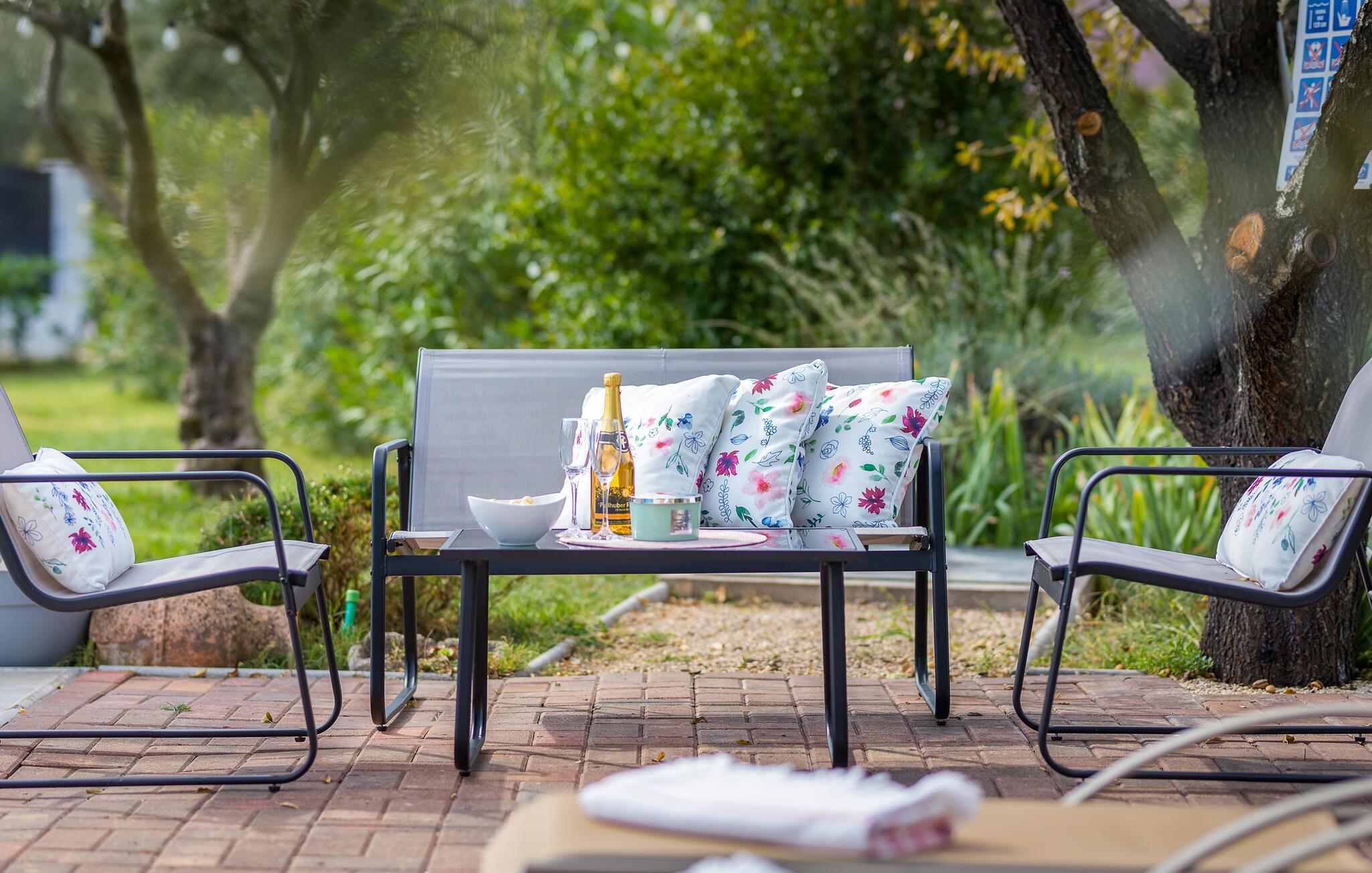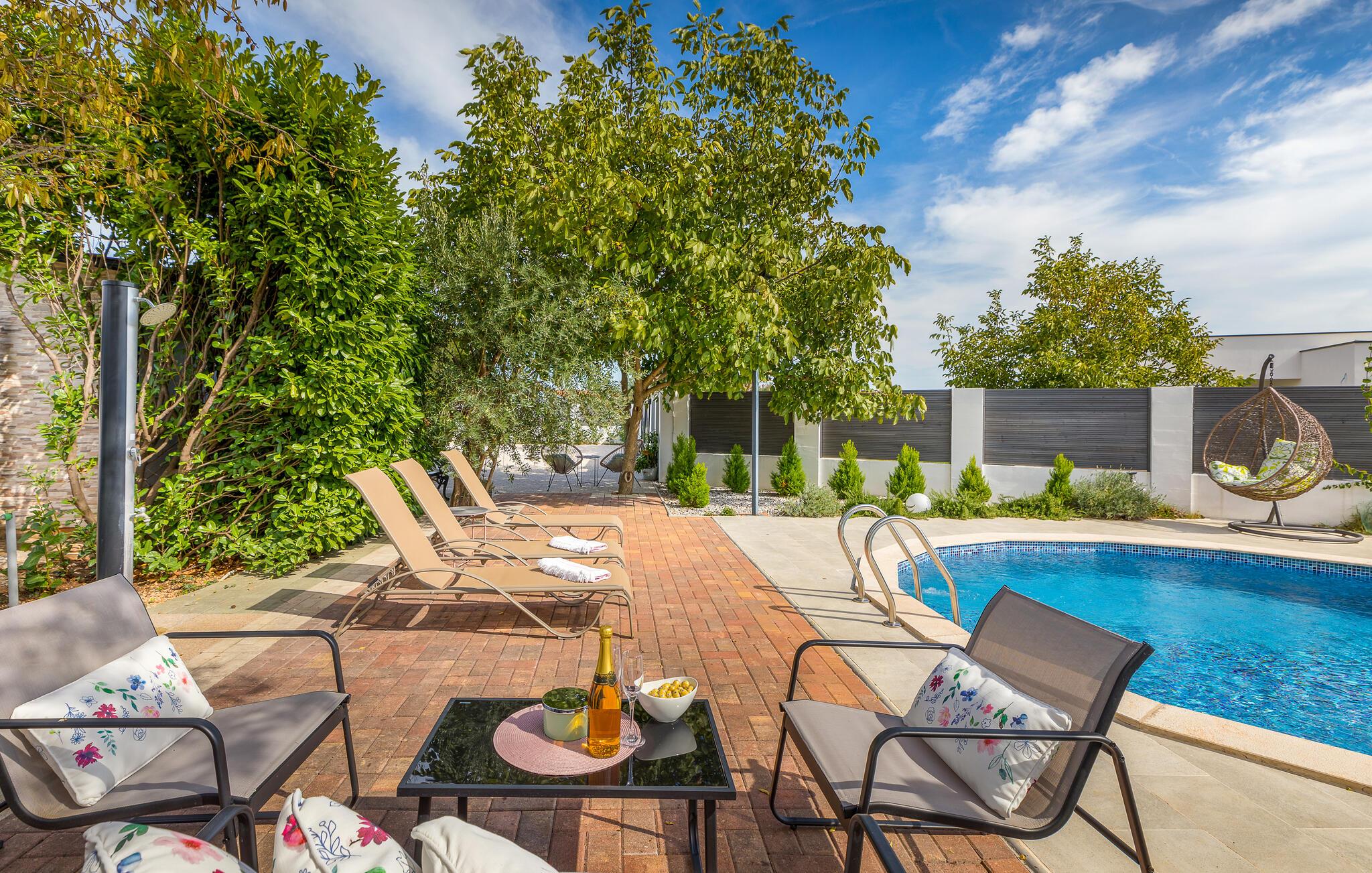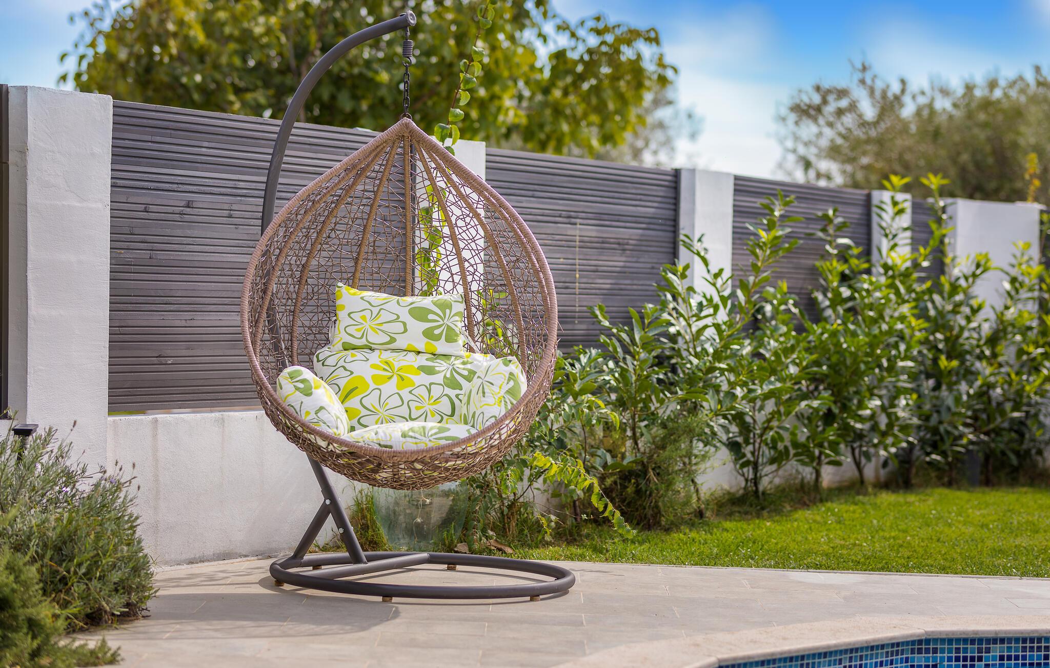 På den store tomten er det et svømmebasseng med solterrasse og et overbygd boblebad. Et badmintonnett og racketer er tilgjengelig for noen aktiviteter, mens det også er en trampoline for de minste.