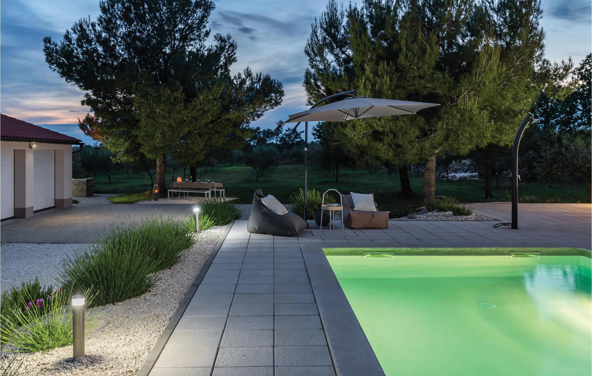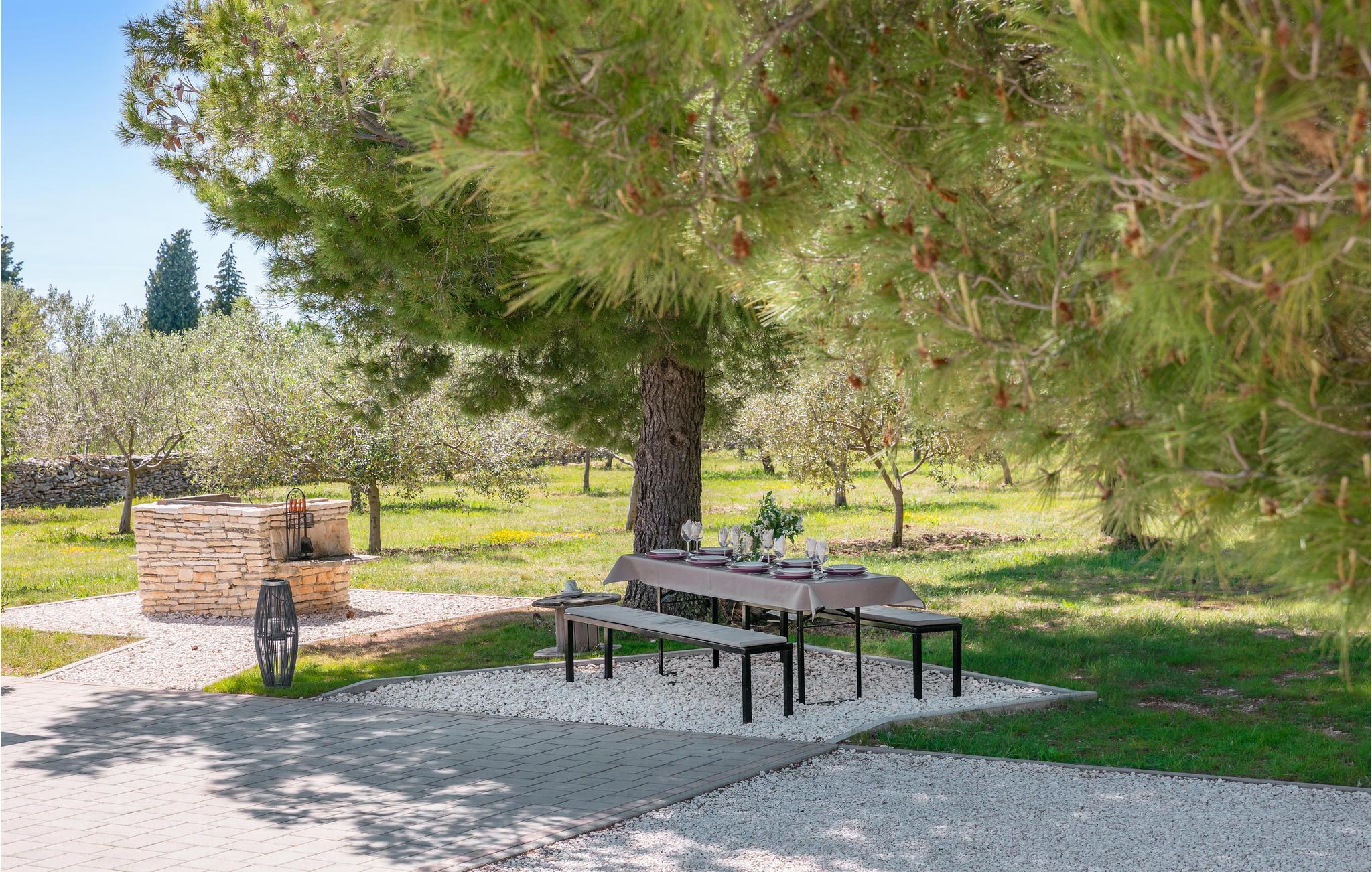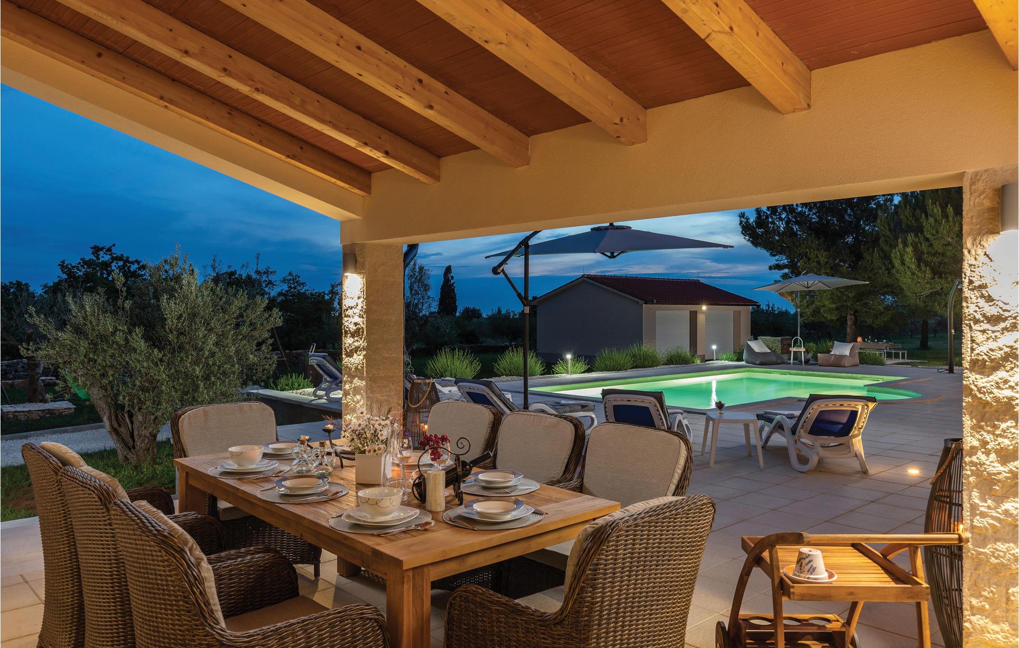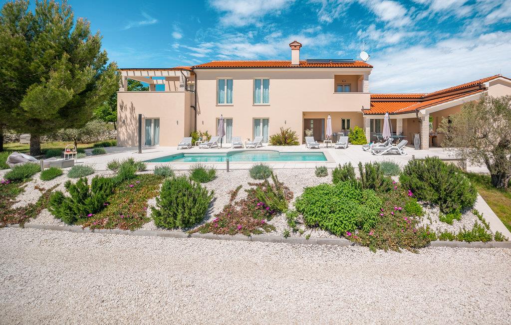Dette luksuriøse feriehuset med basseng ligger i en liten istrisk landsby ved siden av Vodnjan, ikke langt fra Pula, den største byen i Istria. Huset ligger på en inngjerdet tomt med en vakker olivenlund, og tilbyr mange fritidsaktiviteter. Hver eneste detalj i huset er nøye planlagt for å maksimere komforten og sikre et hyggelig opphold. Det er fire soverom, hvorav tre har eget bad. For din fysiske velvære finnes det et treningsrom, badstue og massasjestol. Du kan tilbringe hyggelige timer i den istriske konobaen. Nyt de mange overbygde terrassene og solterrassen ved bassenget samt middelhavshagen med aromatiske urter og planter.