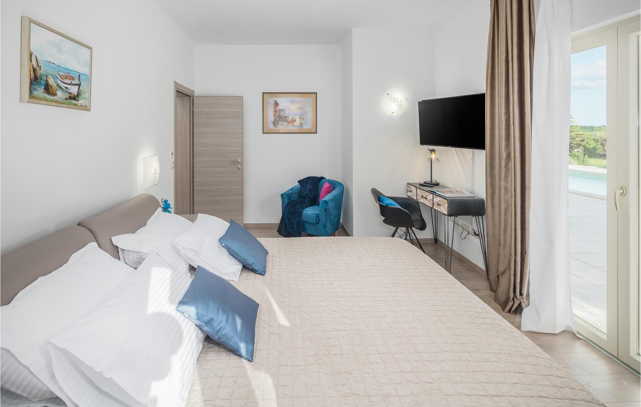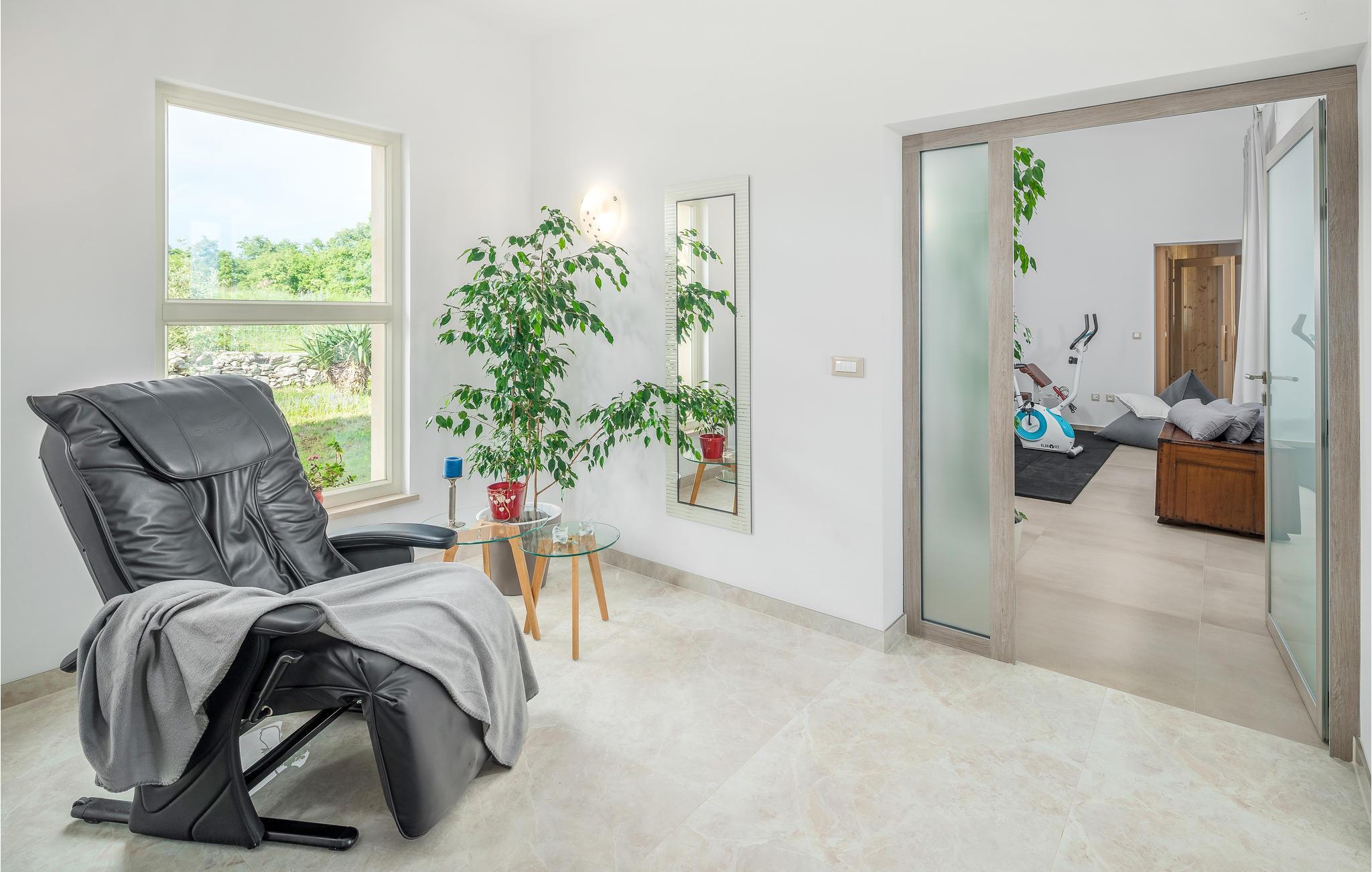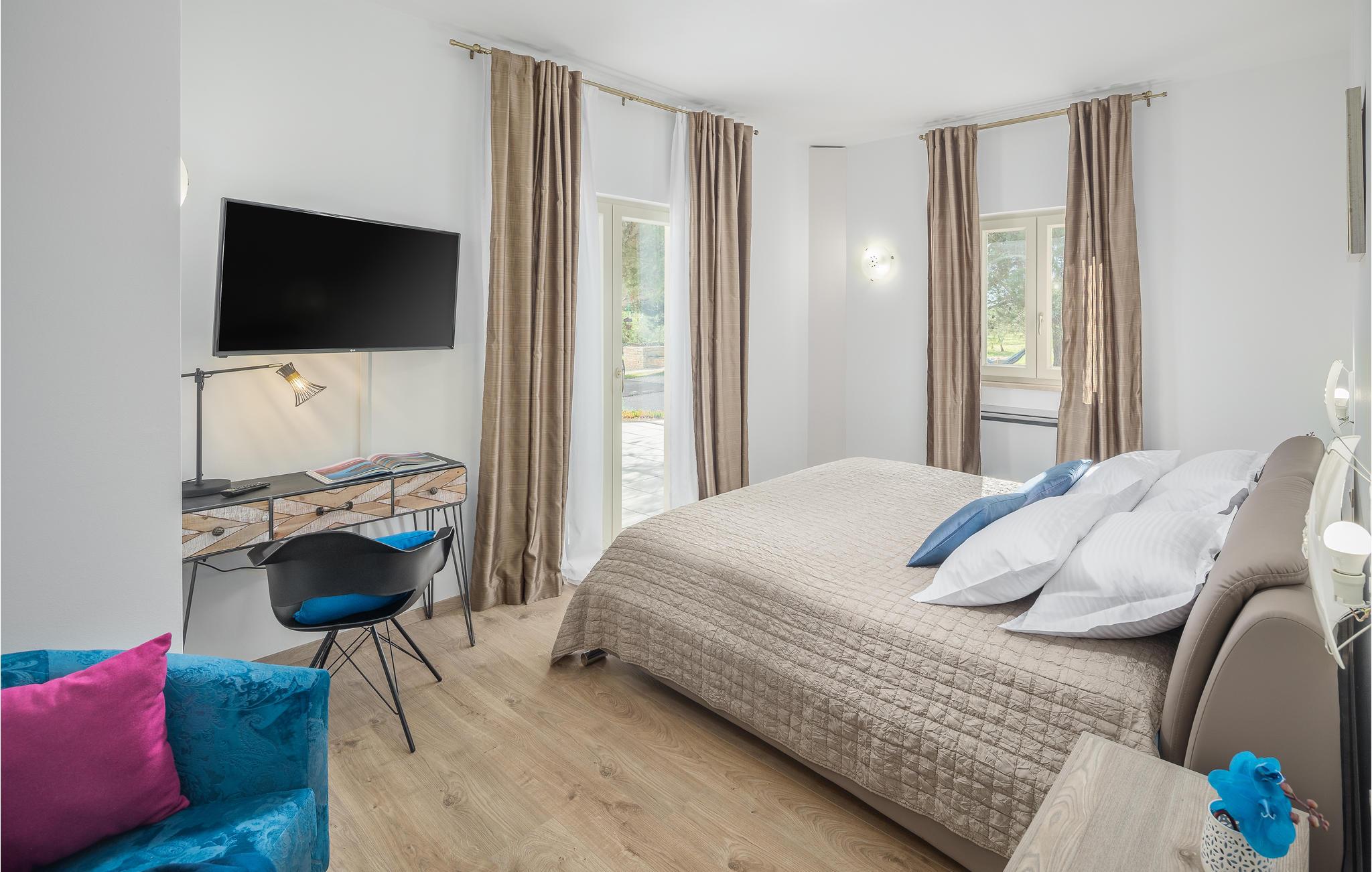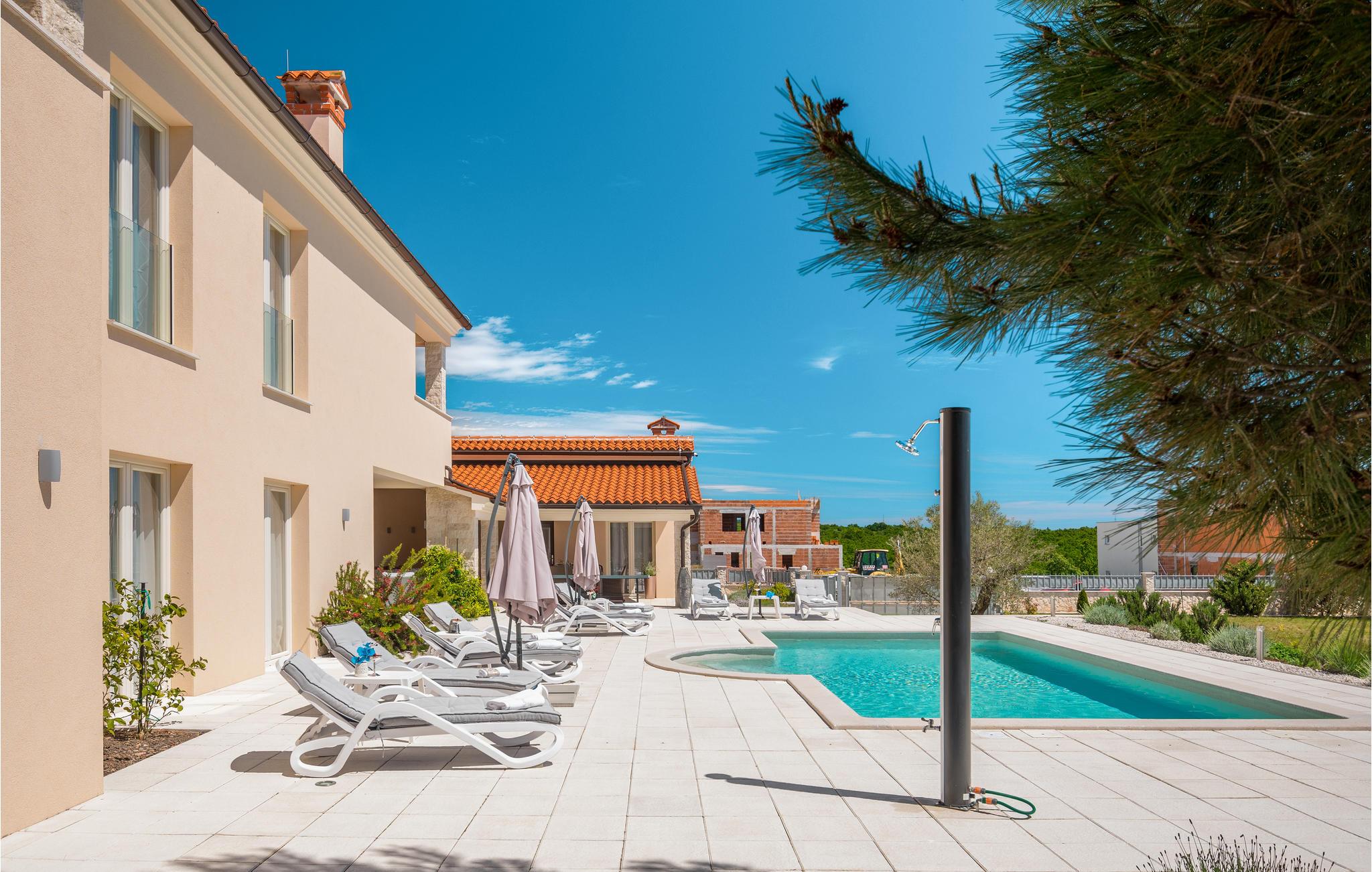 Dette luksuriøse feriehuset med basseng ligger i en liten istrisk landsby ved siden av Vodnjan, ikke langt fra Pula, den største byen i Istria. Huset ligger på en inngjerdet tomt med en vakker olivenlund, og tilbyr mange fritidsaktiviteter. Hver eneste detalj i huset er nøye planlagt for å maksimere komforten og sikre et hyggelig opphold. Det er fire soverom, hvorav tre har eget bad. For din fysiske velvære finnes det et treningsrom, badstue og massasjestol. Du kan tilbringe hyggelige timer i den istriske konobaen. Nyt de mange overbygde terrassene og solterrassen ved bassenget samt middelhavshagen med aromatiske urter og planter.