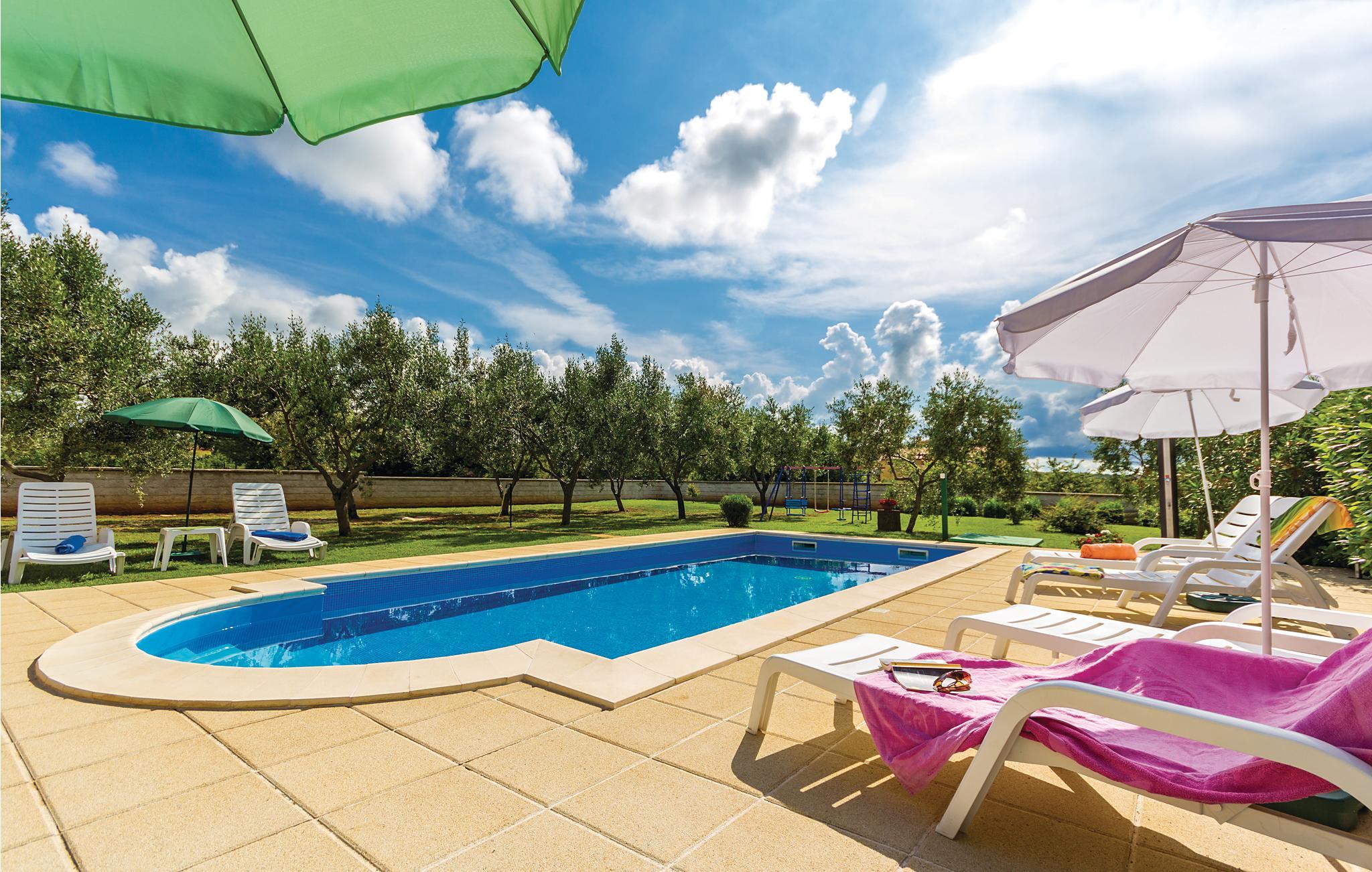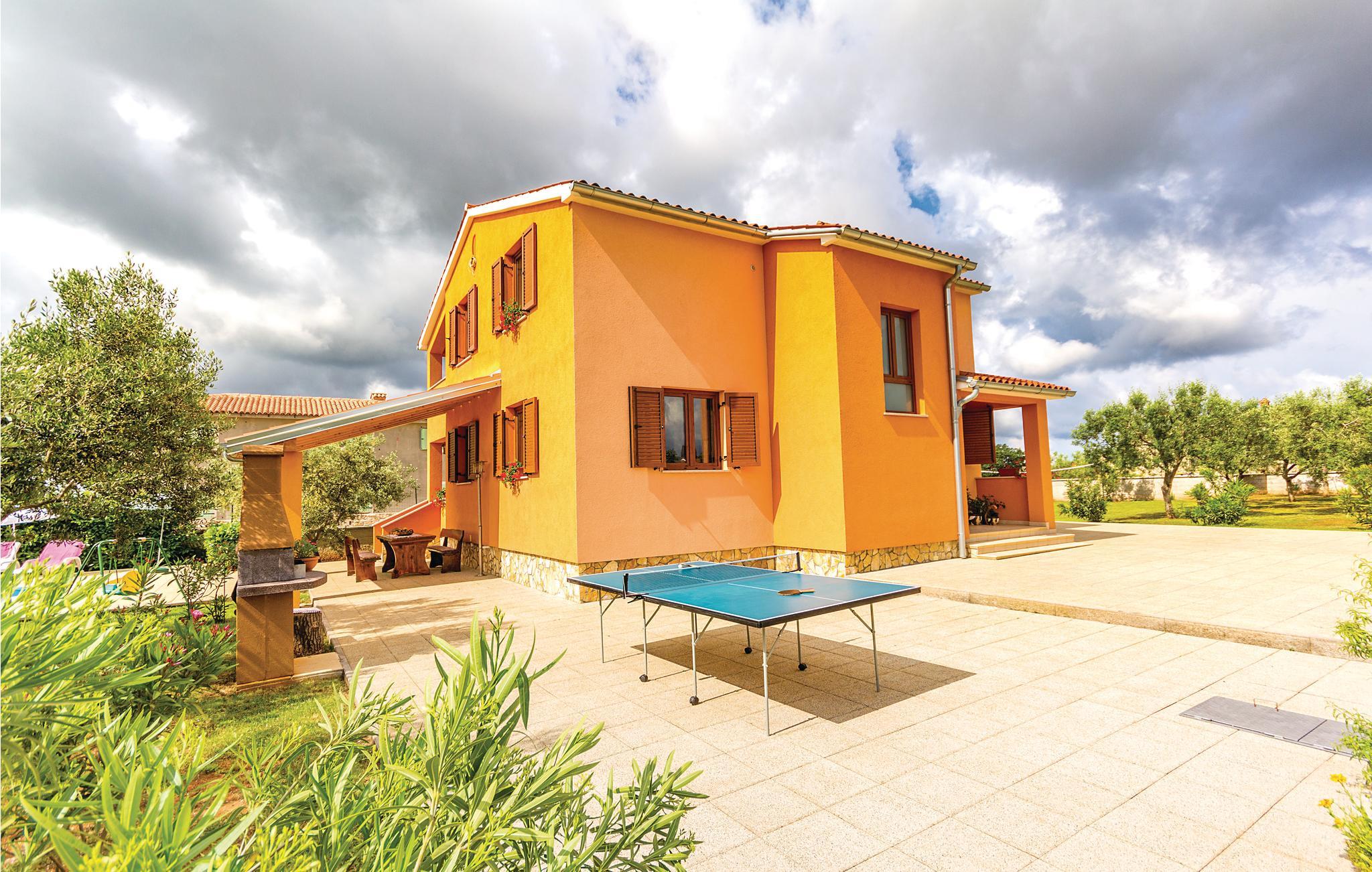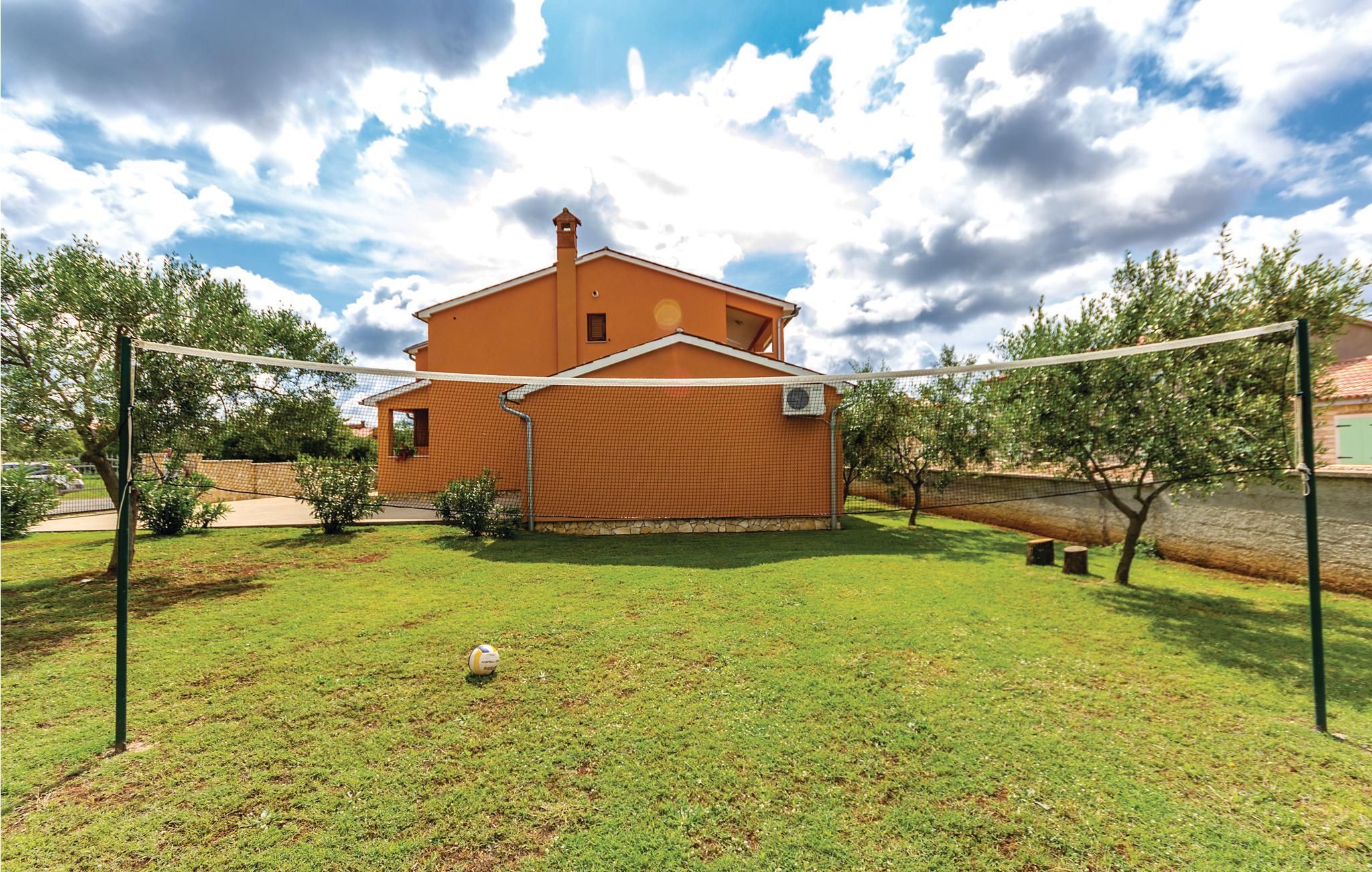 Dette huset er den ideelle innkvarteringen hvis du verdsetter idyll og privatliv, men likevel vil ha tilbudene til et feriested i nærheten. Du har to etasjer til din disposisjon (intern trapp). I første etasje finner du stuen og et bad, i øverste etasje tre soverom og et annet bad. Du har en overbygd terrasse og et uteområde med grill hvor du kan tilbringe koselige sommerkvelder med et glass vin. Du kan forfriske deg i bassenget og barna kan ha det gøy på husken i hagen. Du kan slappe av under massasjedusjen. Oppdag halvøyens skjønnhet og de interessante byene Rovinj, Pula og Vodnjan, som ikke ligger langt unna. Blasius-kirken i Vodnjan er verdt et besøk, og du kan se mumiene der.