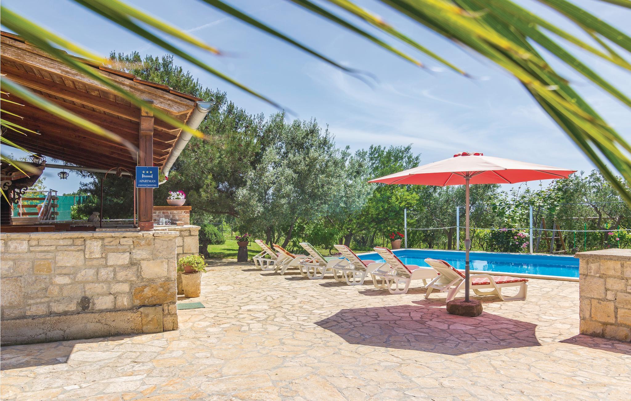 Dette vakre feriehuset er omgitt av vinmarker og olivenlunder. Det er moderne innredet. Huset består av 2 leiligheter med utvendige trapper. Slapp av i skyggen på den overbygde terrassen med en fantastisk panoramautsikt over Brijuni-skjærgården som vil fortrylle deg. I de varme sommermånedene kan du kjøle deg ned i svømmebassenget mens barna har det gøy på huskene eller sklien. I den nærliggende tavernaen, den kroatiske konobaen, eller i restauranten kan du nyte det tradisjonelle gastronomiske tilbudet. Gå på sykkelturer. Det er en sykkelrute ca. 100 meter fra ferieboligen.