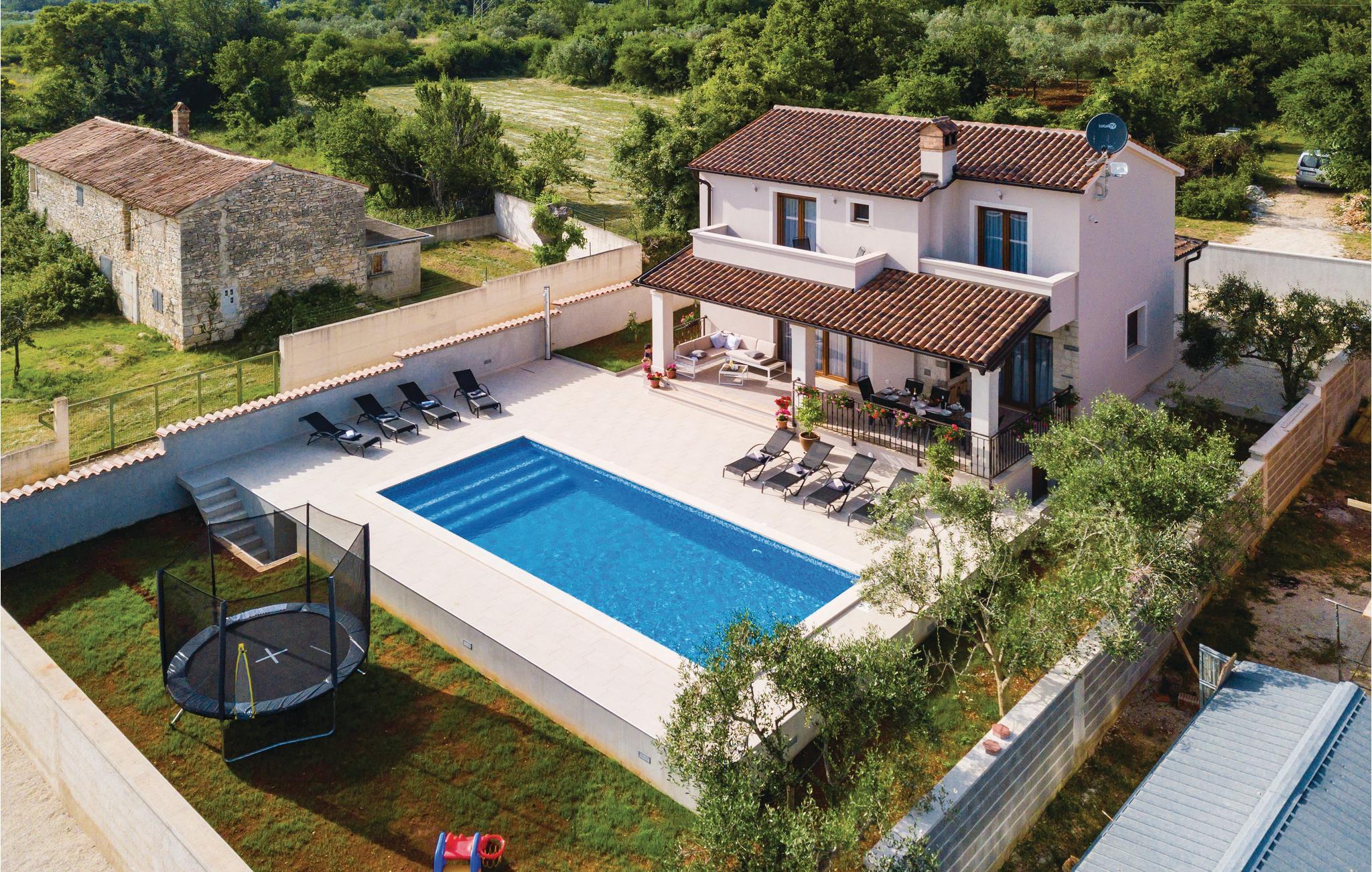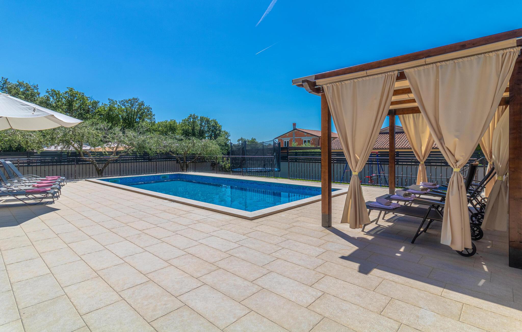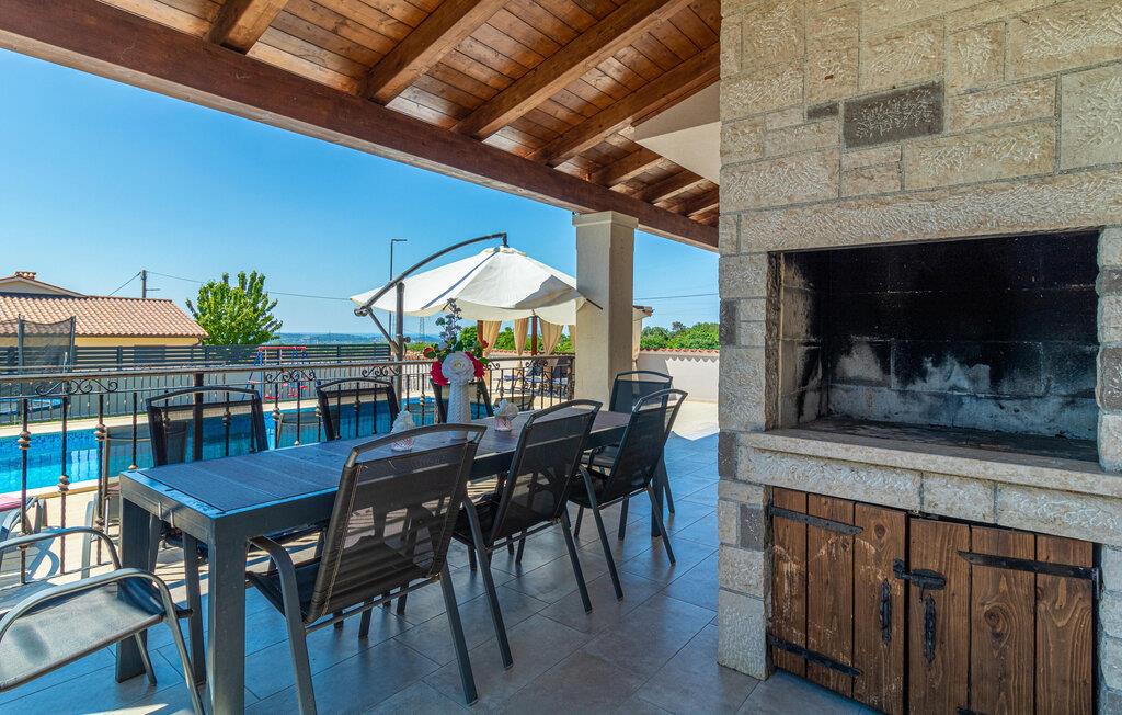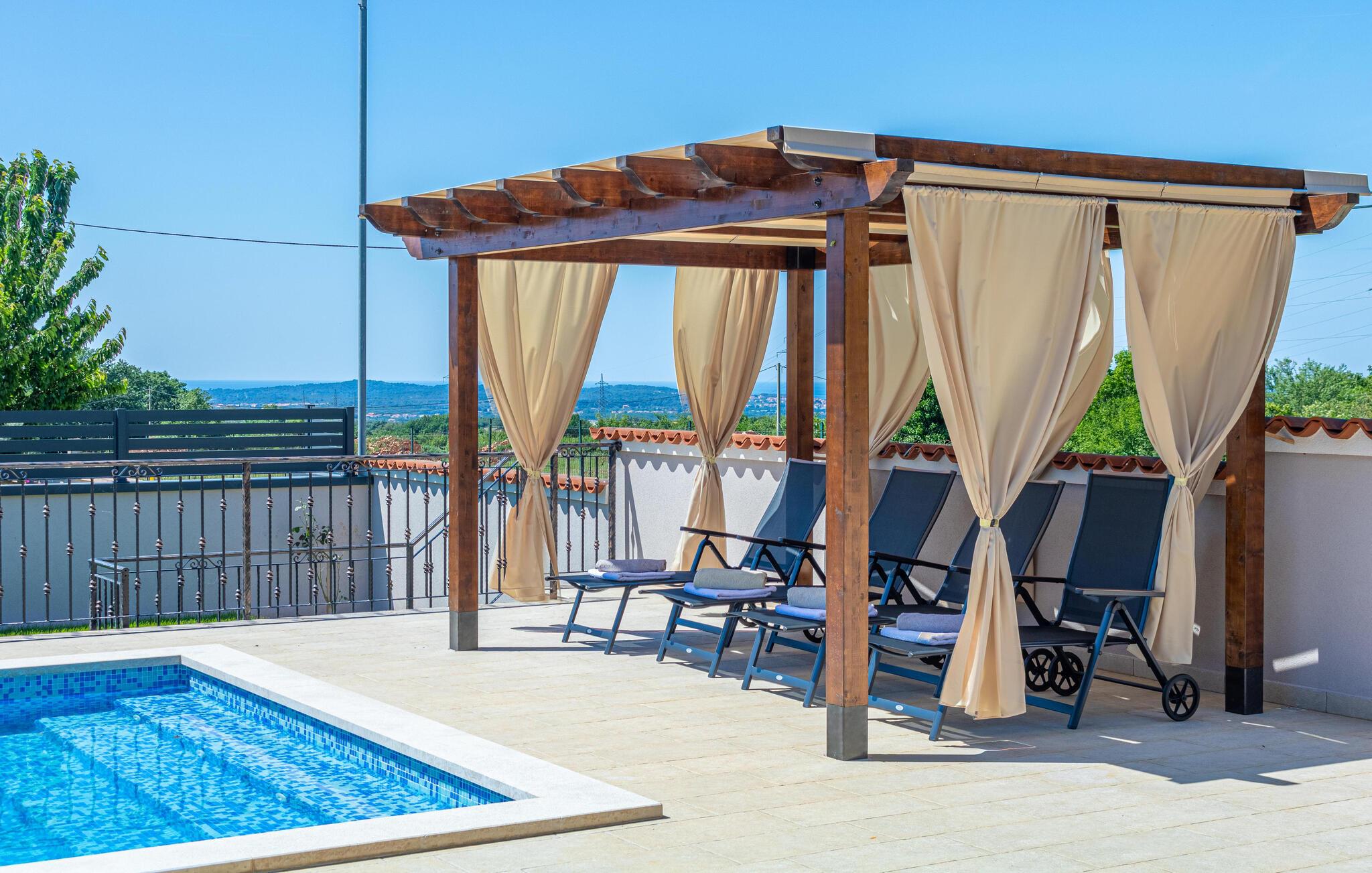 Dette vakre huset med basseng inviterer deg til å slappe av og koble av. Det ligger i en rolig del av Galiana og er vakkert og moderne innredet. Stuen er elegant og gjør oppholdet ditt enda hyggeligere. Den romslige overbygde terrassen gir deg avslappende stunder mens du nyter utsikten over bassenget, landskapet og delvis havet. Utendørsbassenget dominerer hagen og er ideelt for forfriskninger på varme sommerdager, mens de minste vil ha det gøy med å svømme. Besøk byen Vodnjan med mange arrangementer og den pittoreske Fazana med vakre strender.