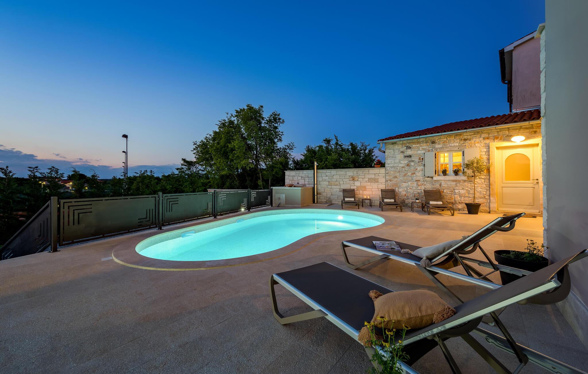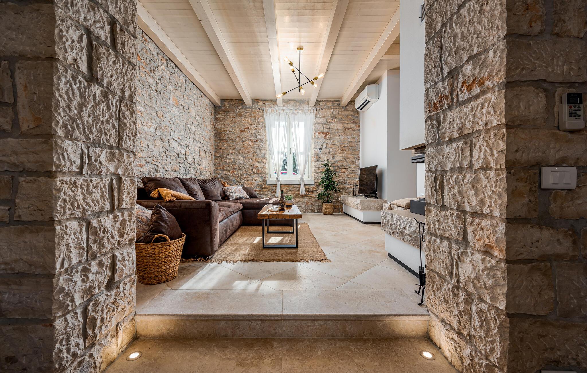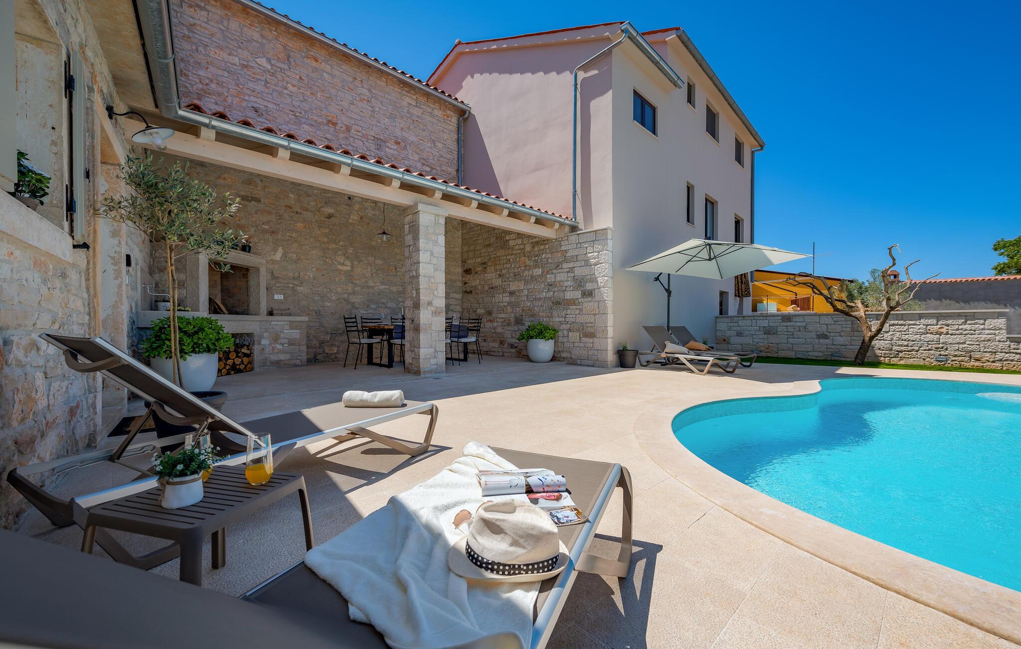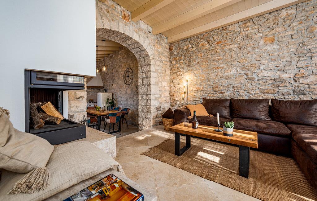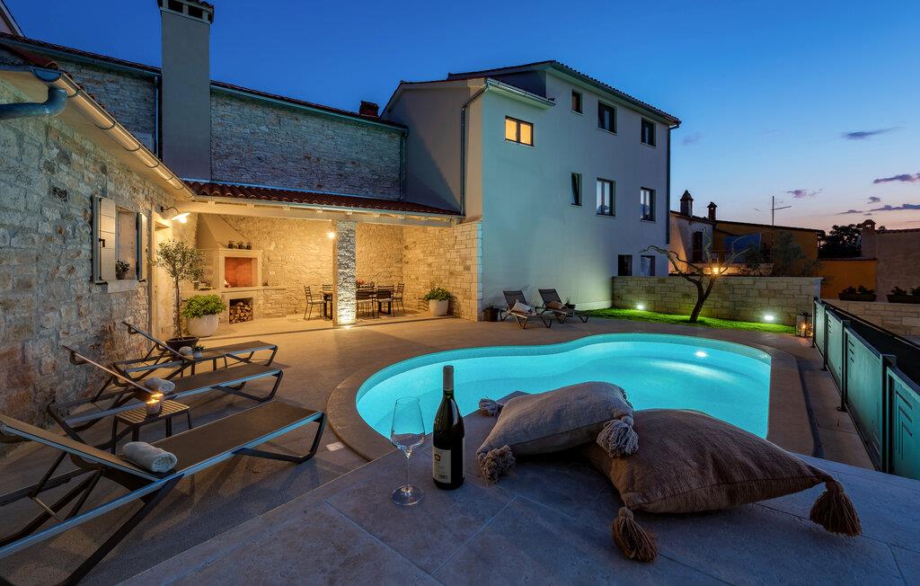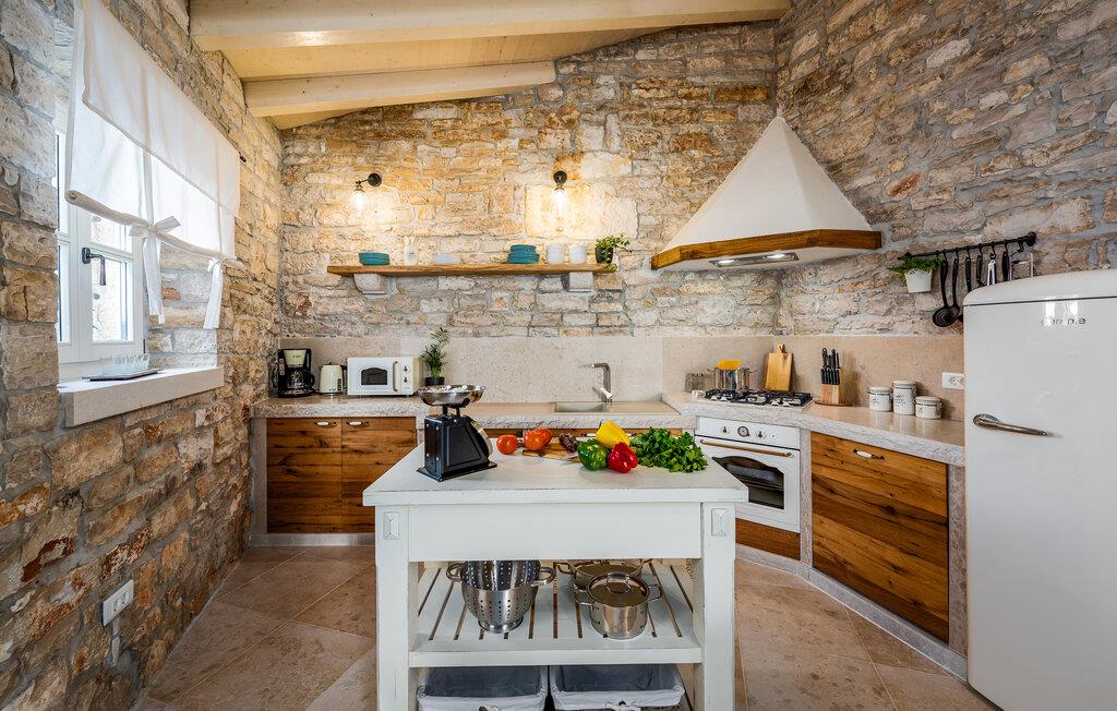 Dette sjarmerende feriehuset ligger like nord for Pula, og ønsker deg velkommen til en fantastisk ferie i Istria. Den harmoniske kombinasjonen av tradisjonell steinkonstruksjon og moderne komfort, som preger hele feriehuset, gir deg en koselig atmosfære langt borte fra hverdagens stress og jag. Det vakre kjøkkenet innbyr til felles matlaging, mens spisestuen med det rustikke trebordet er det ideelle stedet for hyggelige måltider. Slapp av i den innbydende stuen med den komfortable sofaen, der dere kan samles til morsomme spillkvelder eller bare slappe av med en god bok. Det er også mange muligheter til å slappe av og nyte naturen. Ta en forfriskende dukkert i bassenget og slapp deretter av på en av de komfortable solsengene. Den nærliggende tennisbanen er ideell for sportsentusiaster, mens den overbygde grillterrassen byr på kulinariske høydepunkter når du griller om kvelden.