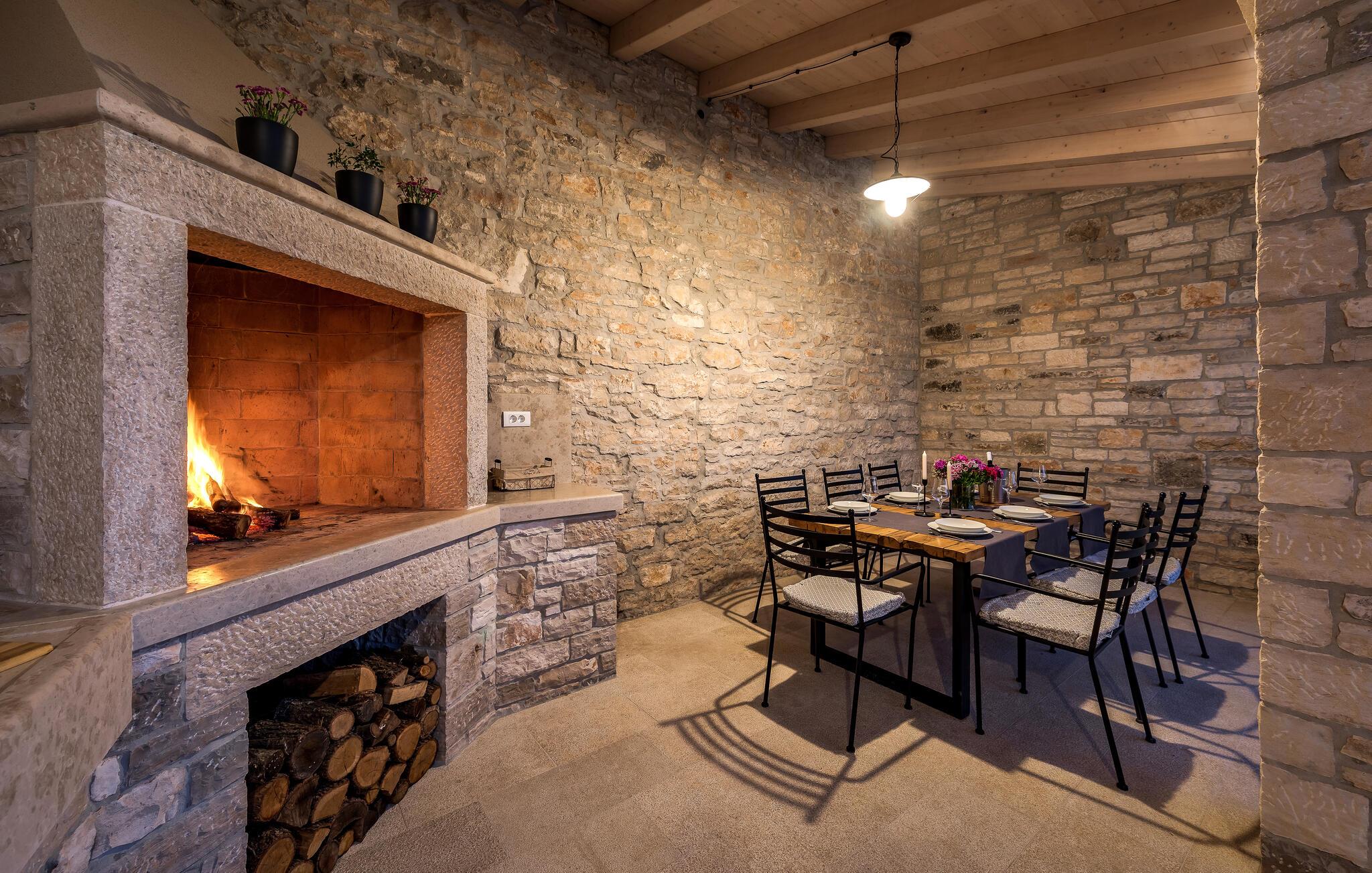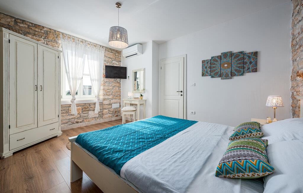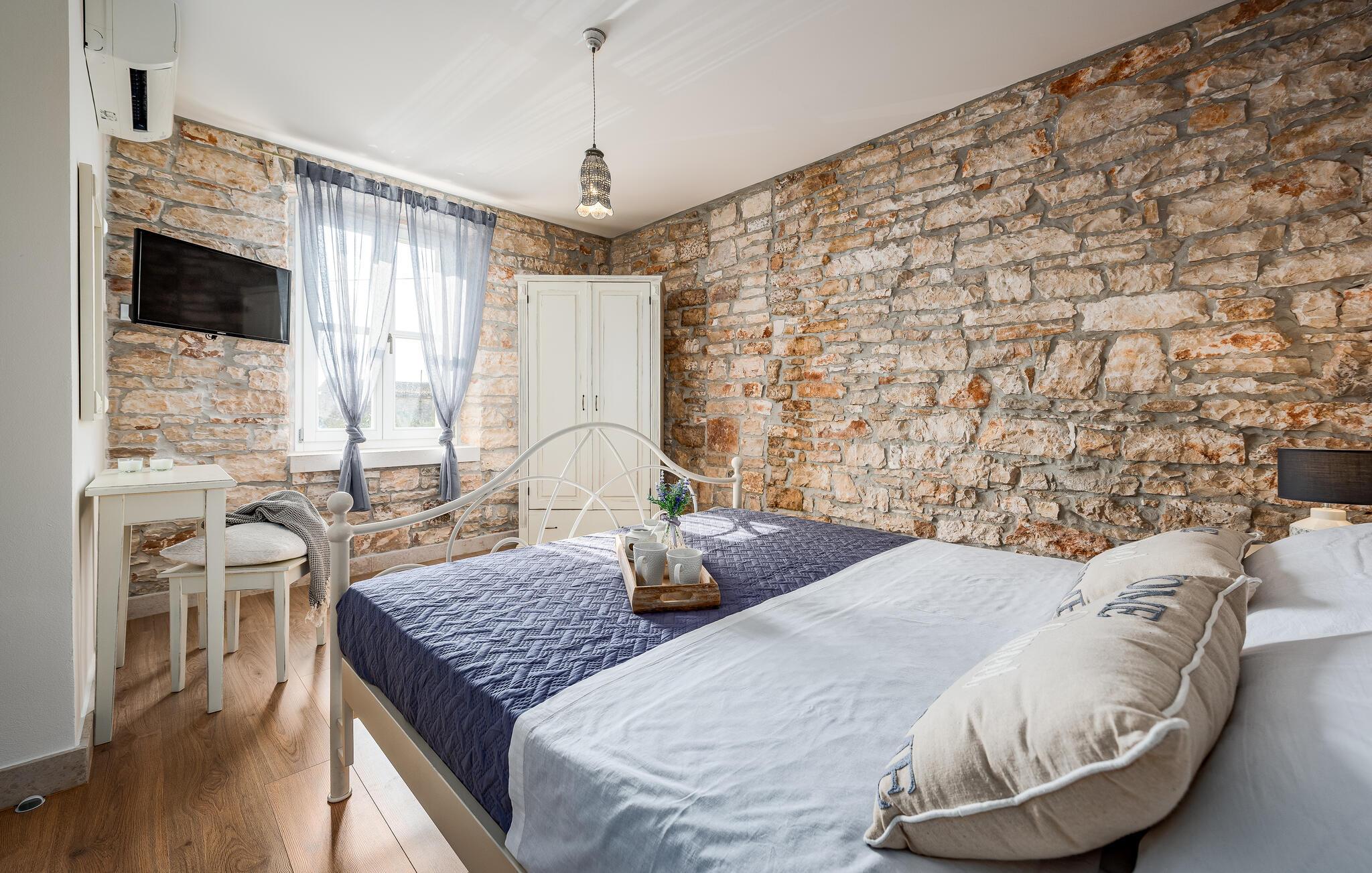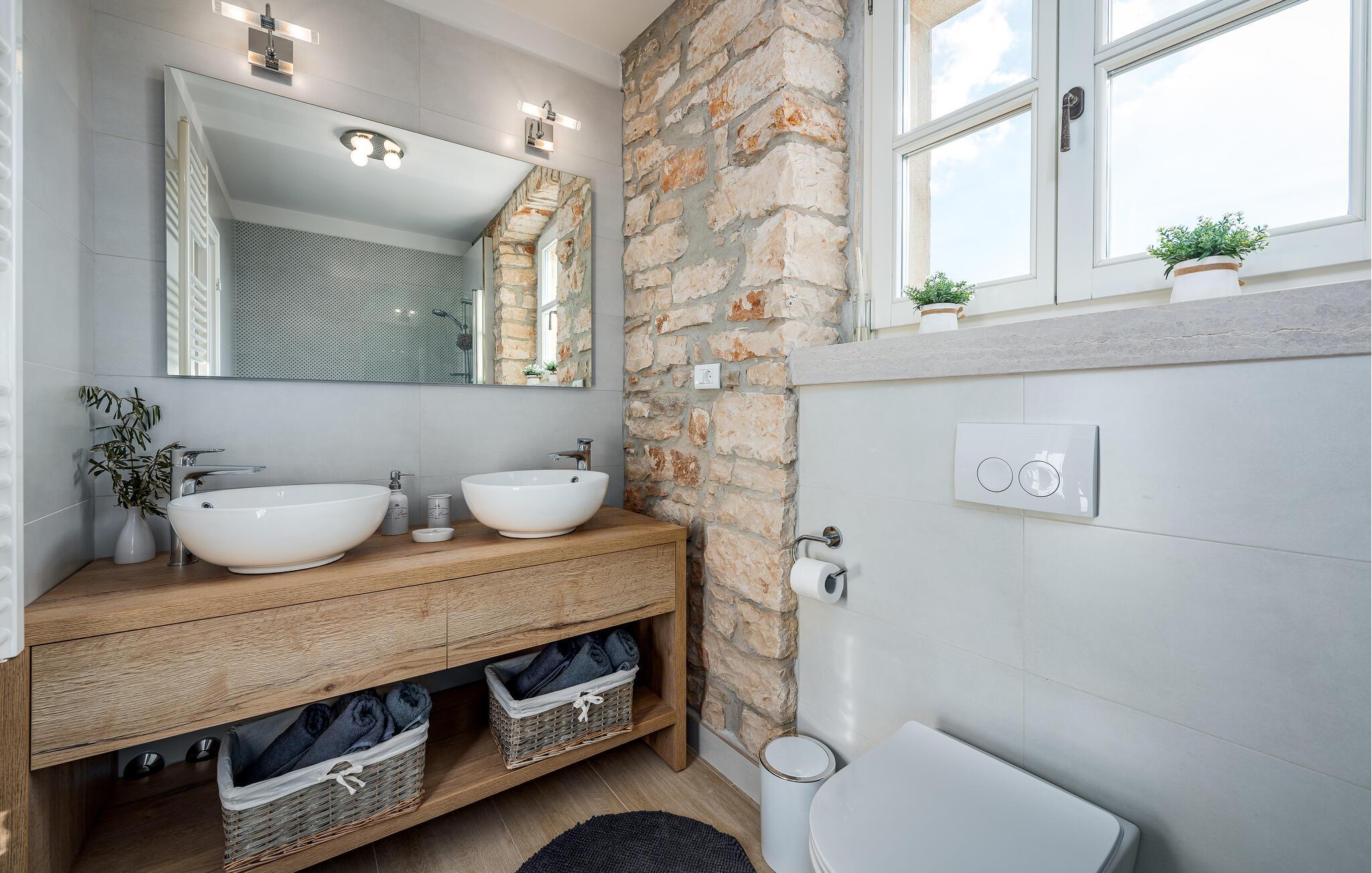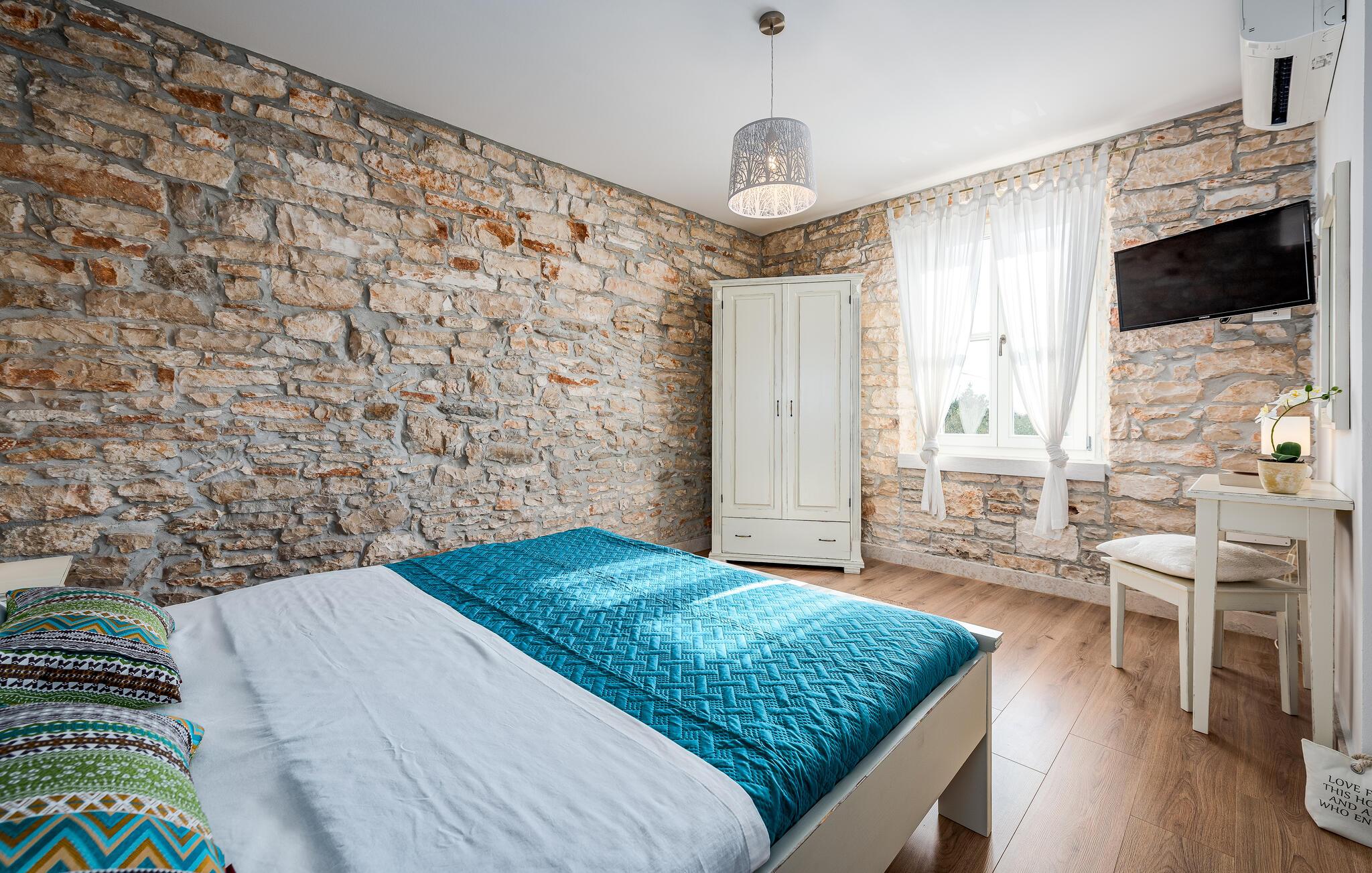 Dette sjarmerende feriehuset ligger like nord for Pula, og ønsker deg velkommen til en fantastisk ferie i Istria. Den harmoniske kombinasjonen av tradisjonell steinkonstruksjon og moderne komfort, som preger hele feriehuset, gir deg en koselig atmosfære langt borte fra hverdagens stress og jag. Det vakre kjøkkenet innbyr til felles matlaging, mens spisestuen med det rustikke trebordet er det ideelle stedet for hyggelige måltider. Slapp av i den innbydende stuen med den komfortable sofaen, der dere kan samles til morsomme spillkvelder eller bare slappe av med en god bok. Det er også mange muligheter til å slappe av og nyte naturen. Ta en forfriskende dukkert i bassenget og slapp deretter av på en av de komfortable solsengene. Den nærliggende tennisbanen er ideell for sportsentusiaster, mens den overbygde grillterrassen byr på kulinariske høydepunkter når du griller om kvelden.