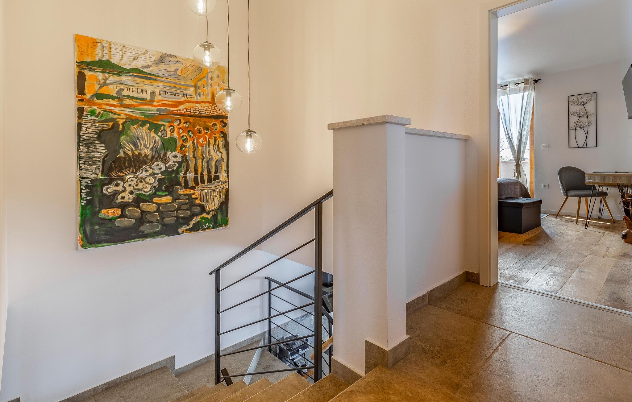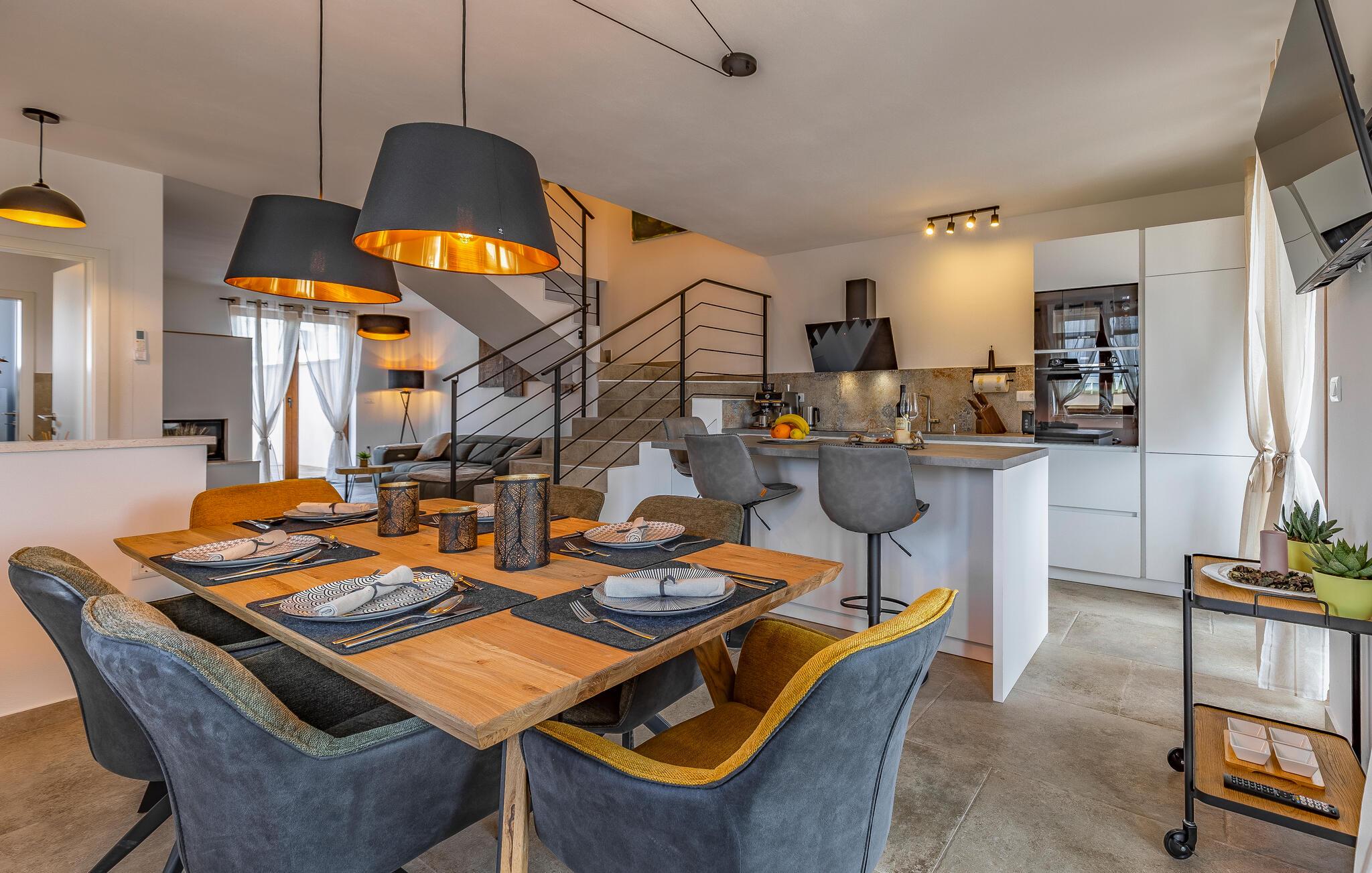 Velkommen til dette komfortable og stilfulle feriehuset. Husets koselige atmosfære understrekes av smakfull design og møbler av høy kvalitet, og tilbyr deg, storfamilien eller et vennepar de perfekte omgivelsene for å slappe av. Nyt de kjærlig innredede rommene i to etasjer, og dra nytte av det flotte velvære- og underholdningsprogrammet. Spill videospill eller slapp av i badstuen eller boblebadet i hagen. Her kan du også ta en svømmetur i bassenget og slappe av i solen eller med grillmat. Du kan også trekke deg tilbake til balkongen i første etasje og nyte utsikten helt til havet.