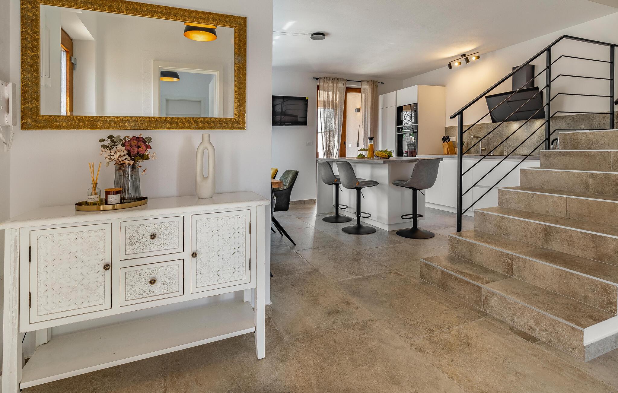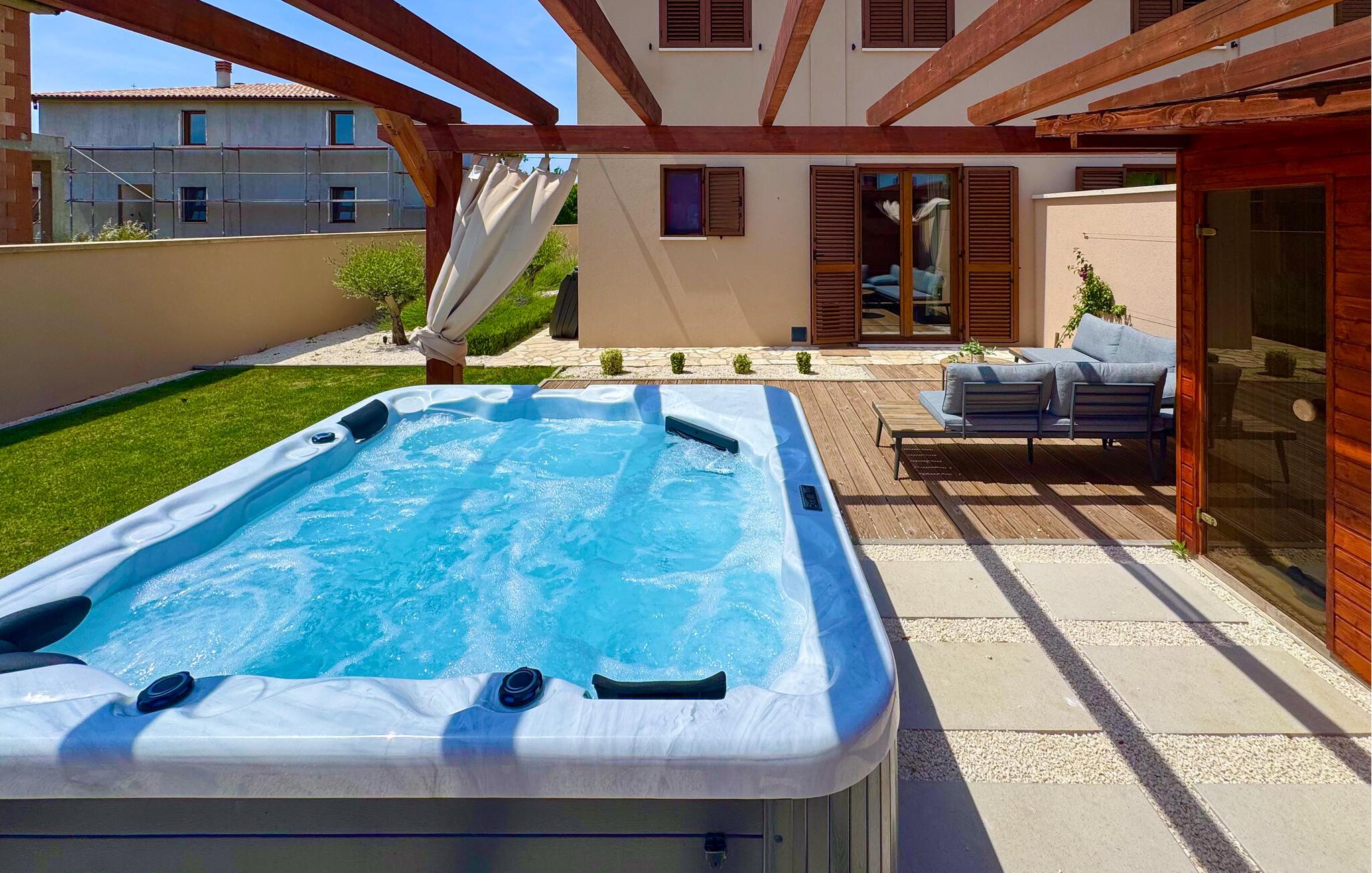 Velkommen til dette komfortable og stilfulle feriehuset. Husets koselige atmosfære understrekes av smakfull design og møbler av høy kvalitet, og tilbyr deg, storfamilien eller et par venner det perfekte miljøet for å slappe av. Nyt de kjærlig innredede rommene i to etasjer, og dra nytte av det flotte velvære- og underholdningsprogrammet. Spill videospill eller slapp av i boblebadet i hagen. Her kan dere også ta en svømmetur i bassenget og bare slappe av i solen eller mens dere griller. Du kan også trekke deg tilbake til balkongen i første etasje og nyte utsikten helt til havet.