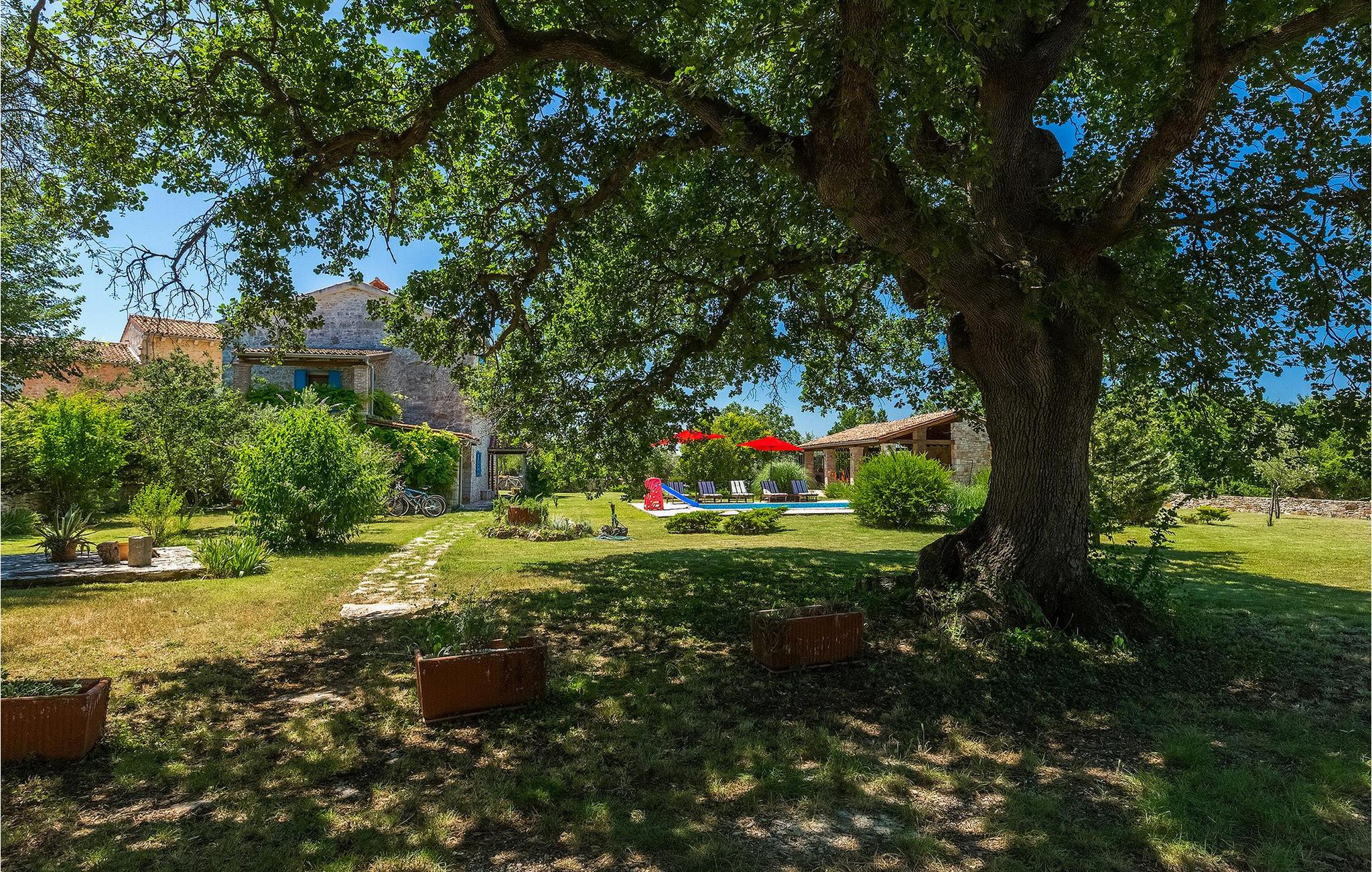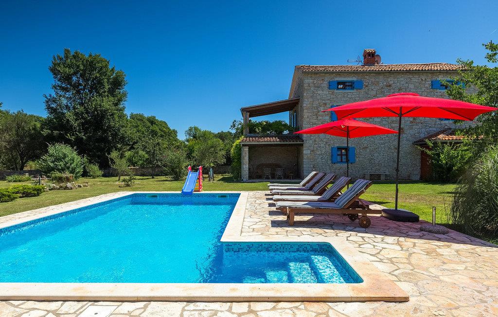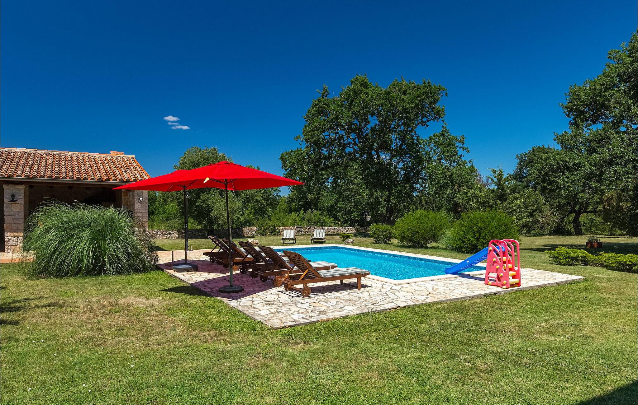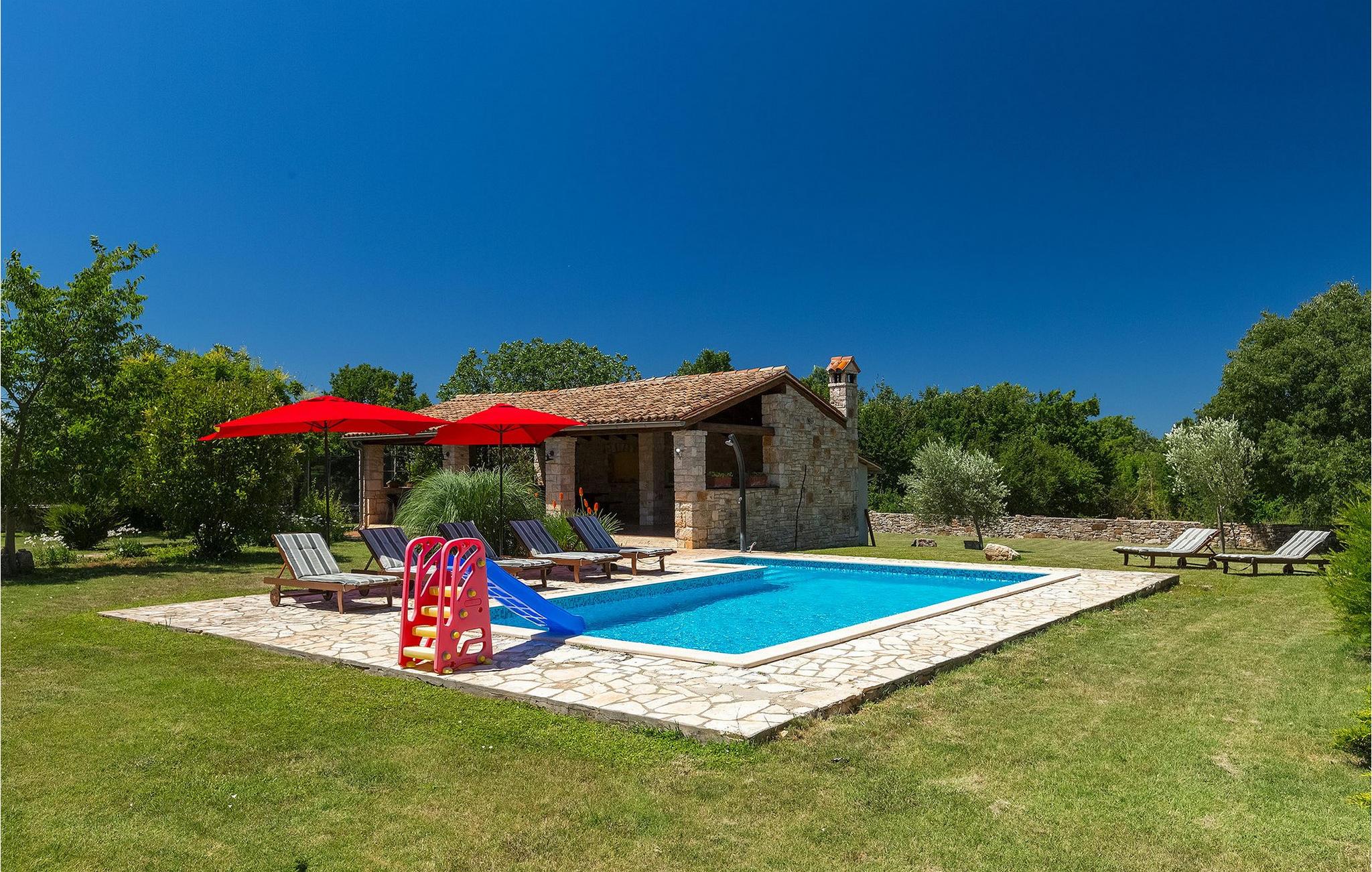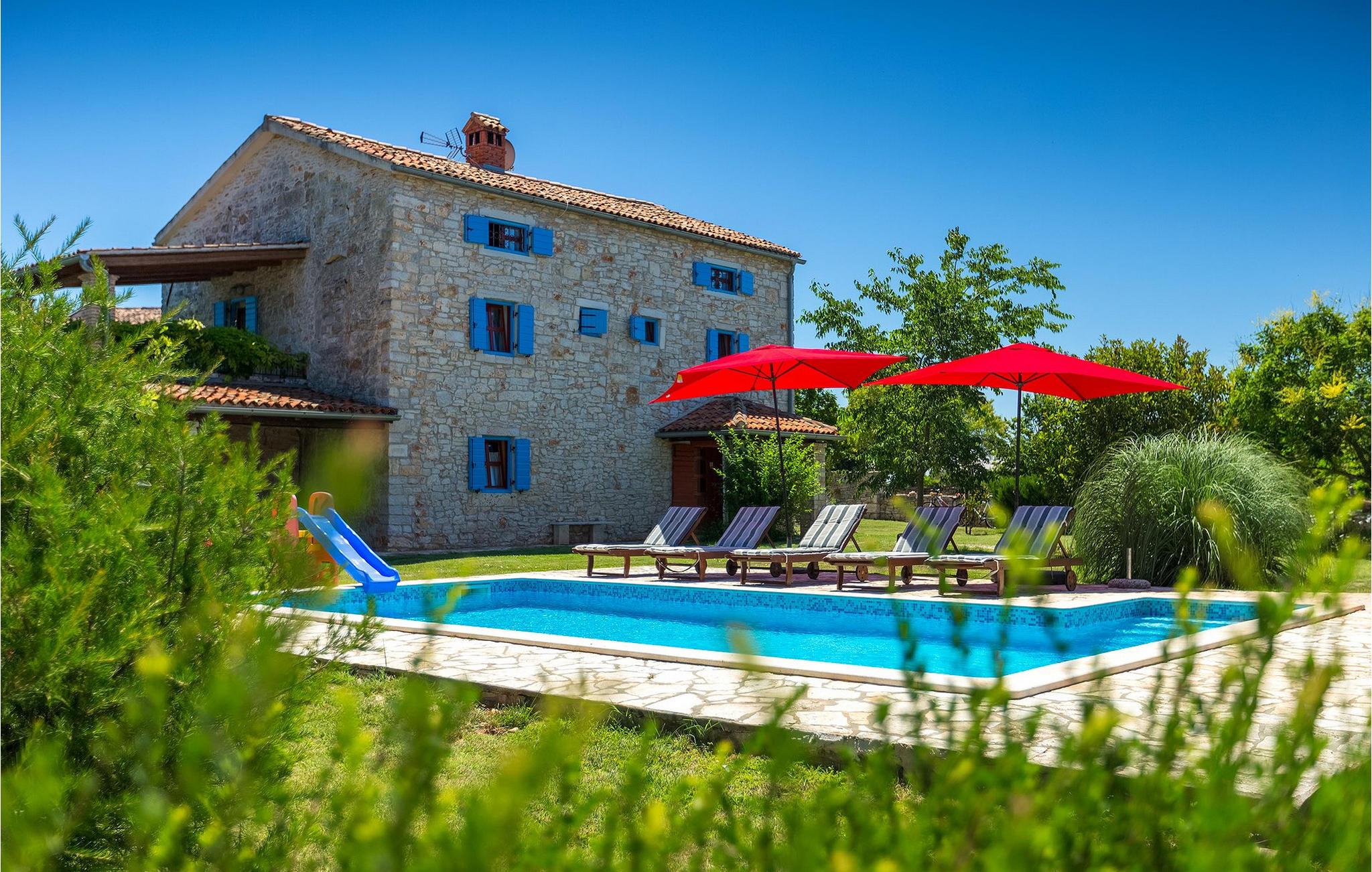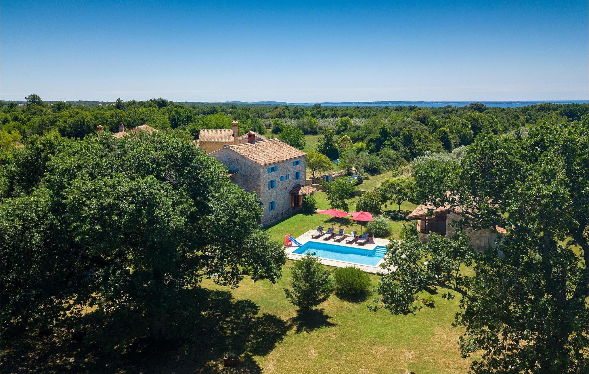 Denne gamle, renoverte villaen med stort basseng på en stor, anlagt gårdsplass er det perfekte stedet for en ferie full av fred og avslapning. Villa Negrin har fire soverom og plass til opptil ti personer. I første etasje i den åpne planløsningen er det en stor stue med peis, et fullt utstyrt kjøkken og en spiseplass for ti personer, ideelt for familiemåltider. Det er også en vinkjeller i første etasje. I andre etasje er det tre soverom, alle tre med klimaanlegg og eget bad, samt en liten, komfortabel terrasse hvor det alltid er en behagelig bris på varme sommerdager. Det gamle loftet er omgjort til et stort hovedsoverom, med synlige murstein og takbjelker for visuell effekt. Dette soverommet har også aircondition og eget bad. På gårdsplassen er det et stort basseng hvor du kan bade og slappe av når dagene blir for varme, eller du kan sole deg på solstolene rundt bassenget med en kald drink i hånden. Bassenget har også en liten sklie for de minste. Hvis du reiser med barn, er denne villaen det perfekte valget, da den har en 2000 m² stor hage med frodig grøntområde der barna kan leke uten bekymringer. Her er det også badminton- og volleyballnett, trampoline, basketballkurv, husker og dartpiler, slik at de lett kan forbrenne overskuddsenergi mens de slapper av. Det er også en stor, overbygd uteservering med grill for 12 personer, der du kan nyte familiemåltidene mens brisen bærer med seg den fine sommerduften fra det nærliggende havet. Føler du deg ikke avslappet nå? Bestill Villa Negrin nå og unn deg selv den ferien du fortjener.Gajana er en liten landsby i Vodnjan kommune i nærheten av Pula og Rovinj. Gajana er en typisk istrisk landsby med 20 hus omgitt av jorder og skog. Omtrent 6 km utenfor Gajana ligger middelalderbyen Vodnjan, der du fremdeles kan beundre barokk-, renessanse- og gotisk arkitektur i sentrum. Overalt finner du detaljer fra ulike tidsepoker, som tredører, steinfasader og smijernsdekorasjoner på fontener. Typiske gamle og smale istriske gater belagt med stein fører til kirken, som har det høyeste kirketårnet i hele Istria. Ettersom transportforbindelsene i Istria er gode, kan du når som helst sette deg i bilen og dra på utflukt. Etter en kort kjøretur på 20 til 40 minutter gjennom det vakre landskapet kommer du til de store kystbyene Pula, Rovinj og Porec. Alle tre byene er gamle byer fra romertiden, og her kan du utforske mange historiske monumenter, som amfiteateret i Pula, Eufrasius-basilikaen i Porec eller Eufemia-kirken i Rovinj. Hvis du vil kjøle deg ned i det krystallblå havet, kan du besøke de mange strendene i området.