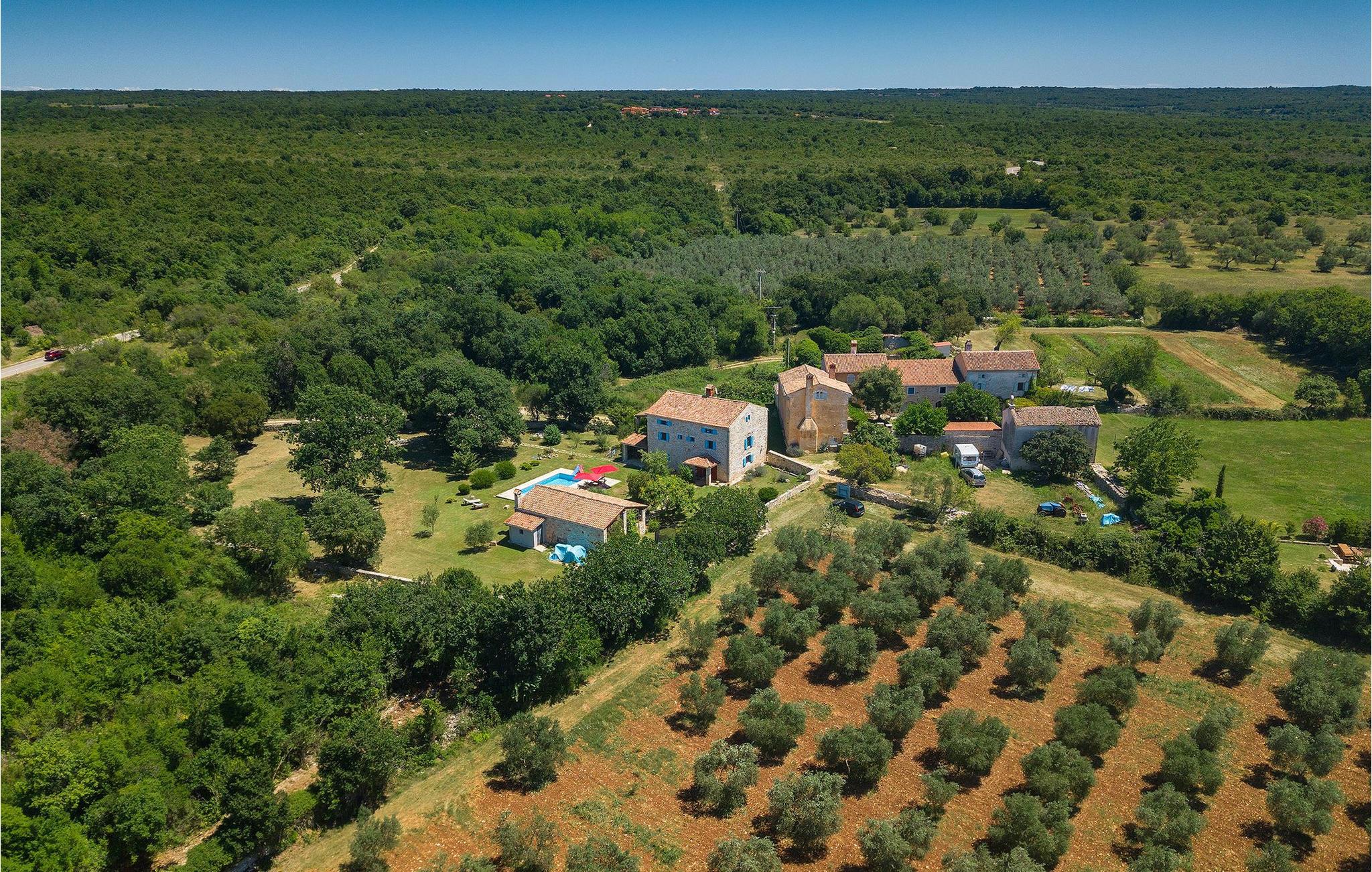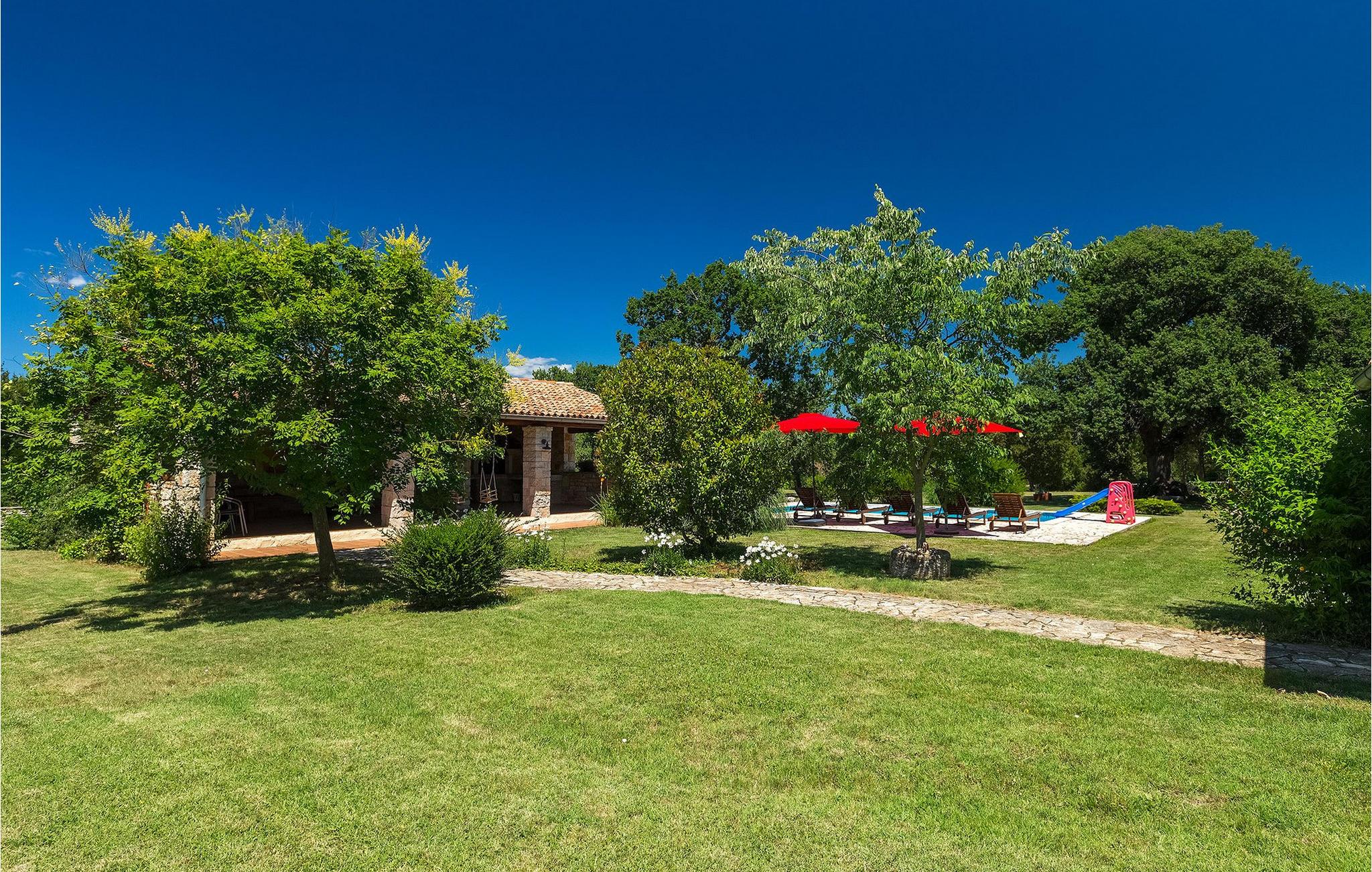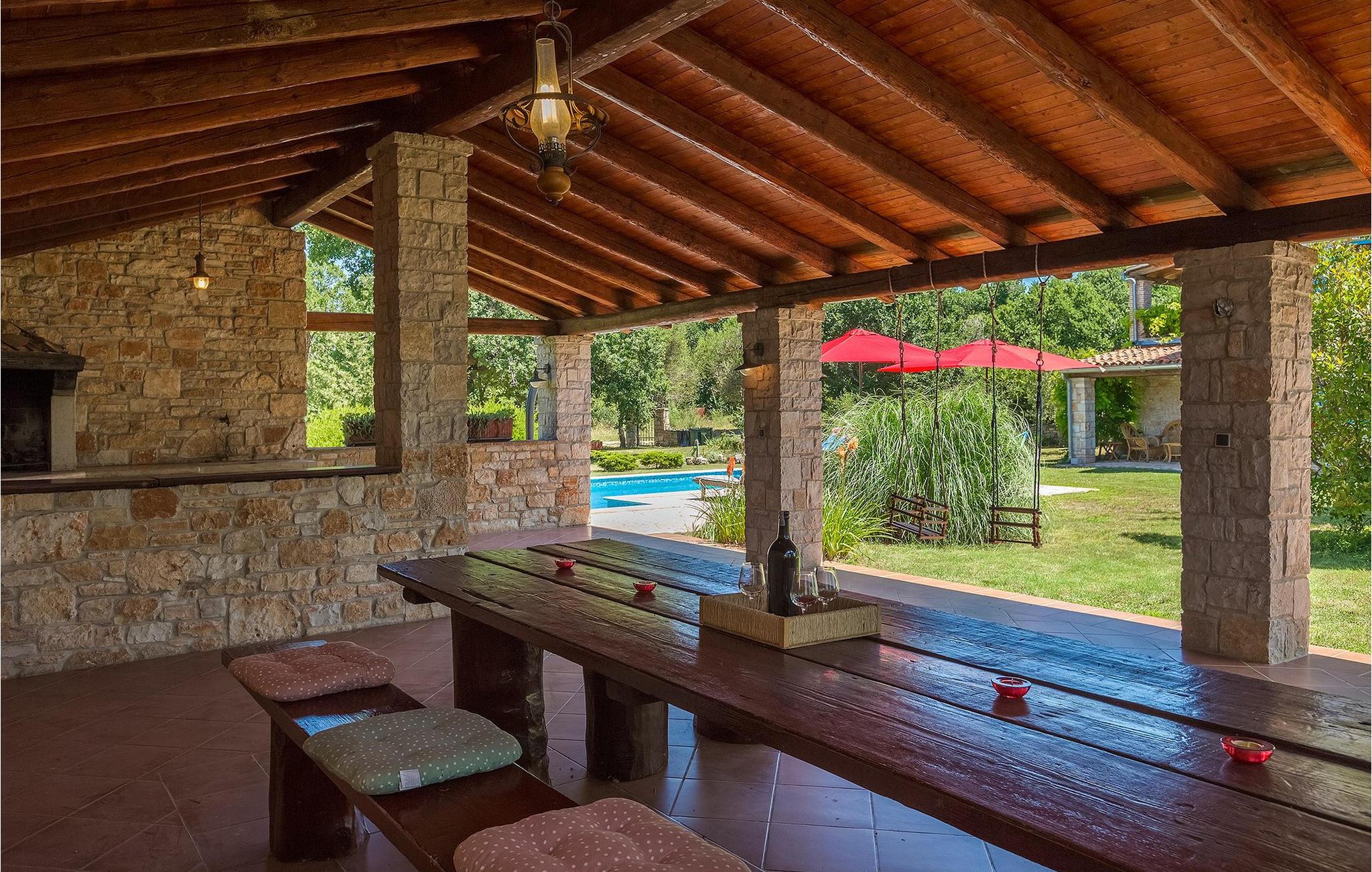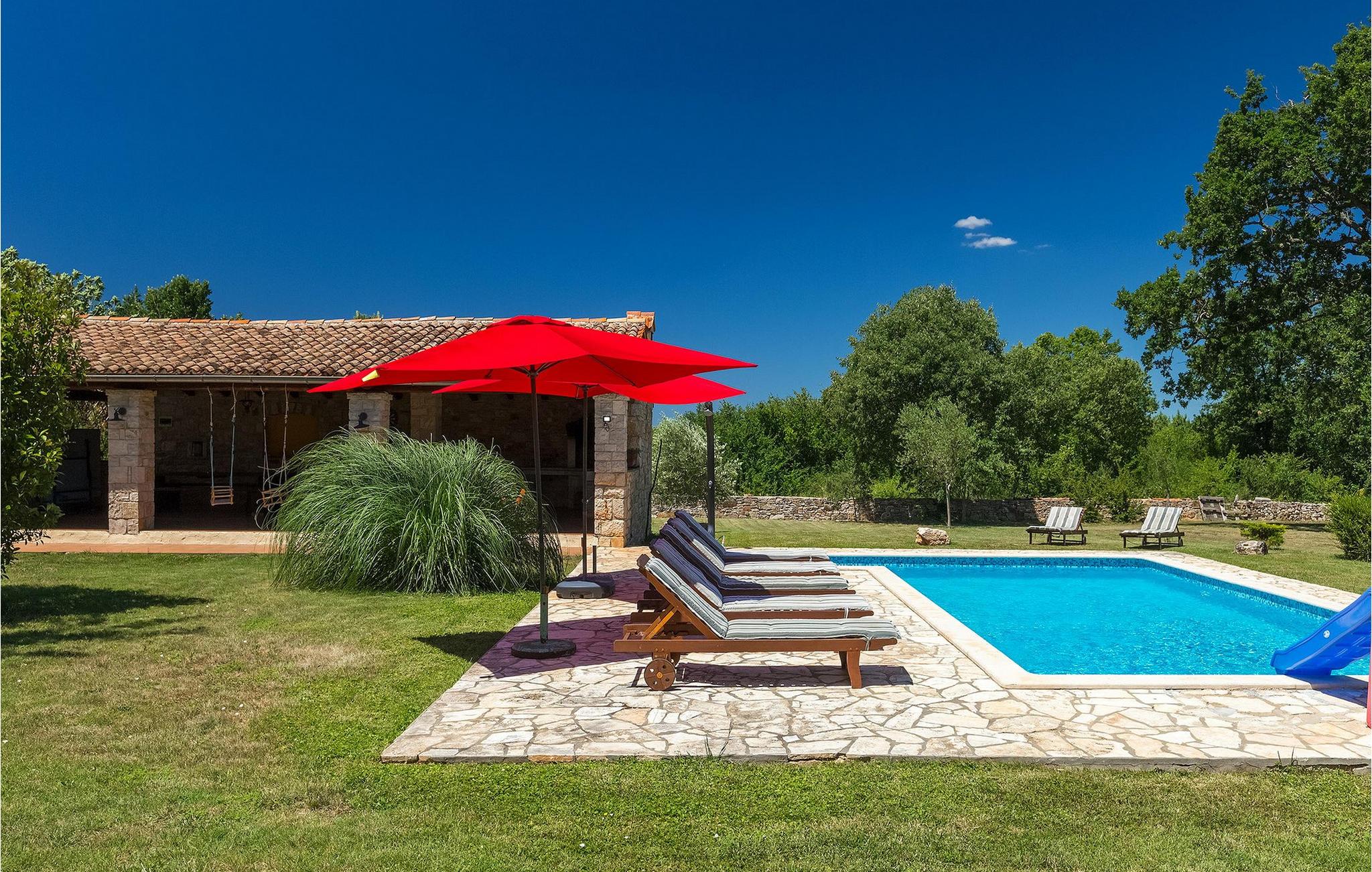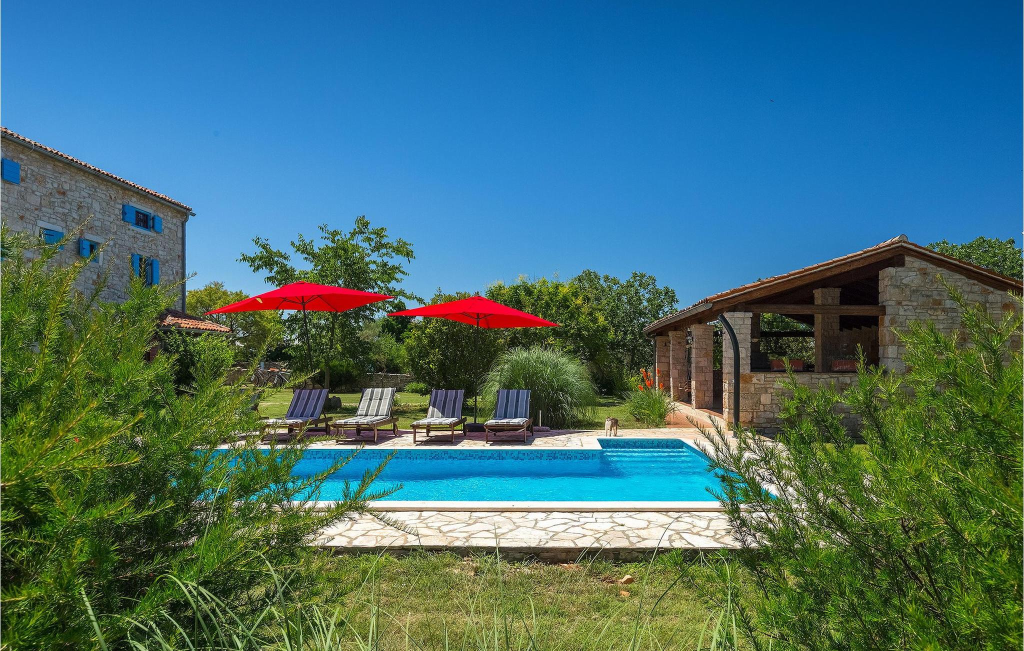 Denne gamle, renoverte villaen med stort basseng på en stor, anlagt gårdsplass er det perfekte stedet for en ferie full av fred og avslapning. Villa Negrin har fire soverom og plass til opptil ti personer. I første etasje i den åpne planløsningen er det en stor stue med peis, et fullt utstyrt kjøkken og en spiseplass for ti personer, ideelt for familiemåltider. Det er også en vinkjeller i første etasje. I andre etasje er det tre soverom, alle tre med klimaanlegg og eget bad, samt en liten, komfortabel terrasse hvor det alltid er en behagelig bris på varme sommerdager. Det gamle loftet er omgjort til et stort hovedsoverom, med synlige murstein og takbjelker for visuell effekt. Dette soverommet har også aircondition og eget bad. På gårdsplassen er det et stort basseng hvor du kan bade og slappe av når dagene blir for varme, eller du kan sole deg på solstolene rundt bassenget med en kald drink i hånden. Bassenget har også en liten sklie for de minste. Hvis du reiser med barn, er denne villaen det perfekte valget, da den har en 2000 m² stor hage med frodig grøntområde der barna kan leke uten bekymringer. Her er det også badminton- og volleyballnett, trampoline, basketballkurv, husker og dartpiler, slik at de lett kan forbrenne overskuddsenergi mens de slapper av. Det er også en stor, overbygd uteservering med grill for 12 personer, der du kan nyte familiemåltidene mens brisen bærer med seg den fine sommerduften fra det nærliggende havet. Føler du deg ikke avslappet nå? Bestill Villa Negrin nå og unn deg selv den ferien du fortjener.Gajana er en liten landsby i Vodnjan kommune i nærheten av Pula og Rovinj. Gajana er en typisk istrisk landsby med 20 hus omgitt av jorder og skog. Omtrent 6 km utenfor Gajana ligger middelalderbyen Vodnjan, der du fremdeles kan beundre barokk-, renessanse- og gotisk arkitektur i sentrum. Overalt finner du detaljer fra ulike tidsepoker, som tredører, steinfasader og smijernsdekorasjoner på fontener. Typiske gamle og smale istriske gater belagt med stein fører til kirken, som har det høyeste kirketårnet i hele Istria. Ettersom transportforbindelsene i Istria er gode, kan du når som helst sette deg i bilen og dra på utflukt. Etter en kort kjøretur på 20 til 40 minutter gjennom det vakre landskapet kommer du til de store kystbyene Pula, Rovinj og Porec. Alle tre byene er gamle byer fra romertiden, og her kan du utforske mange historiske monumenter, som amfiteateret i Pula, Eufrasius-basilikaen i Porec eller Eufemia-kirken i Rovinj. Hvis du vil kjøle deg ned i det krystallblå havet, kan du besøke de mange strendene i området.