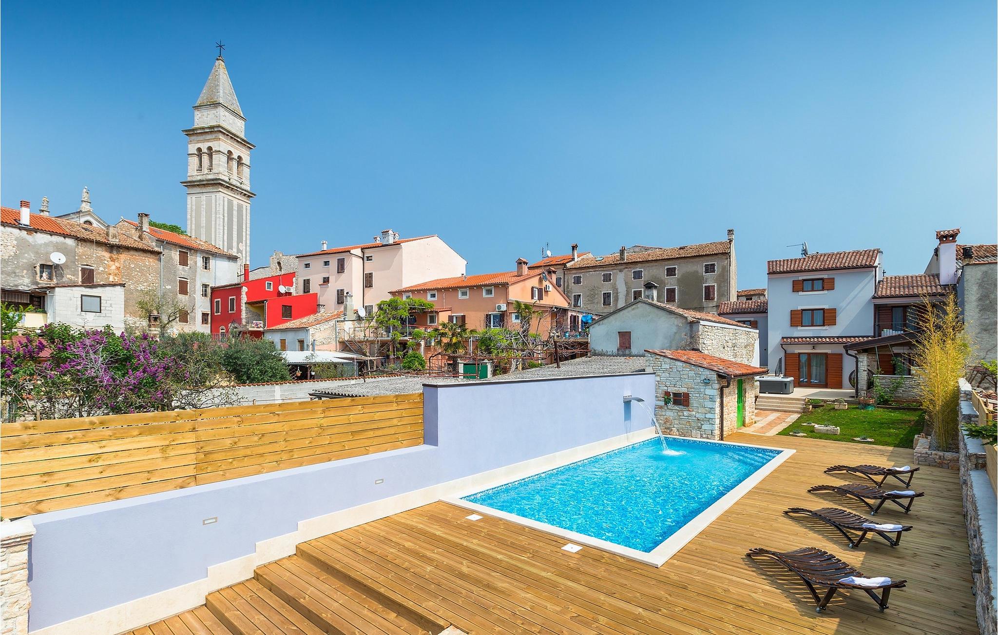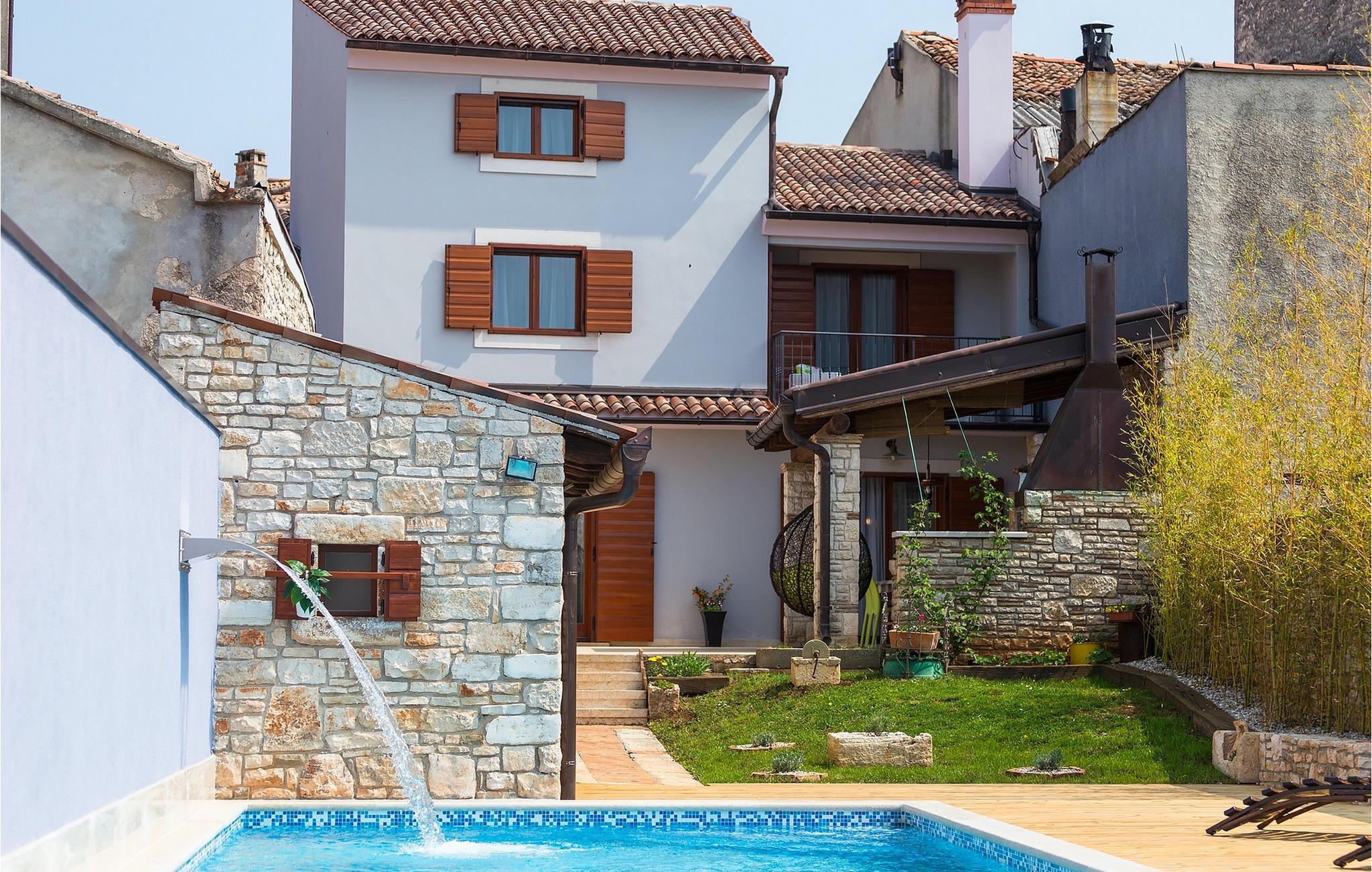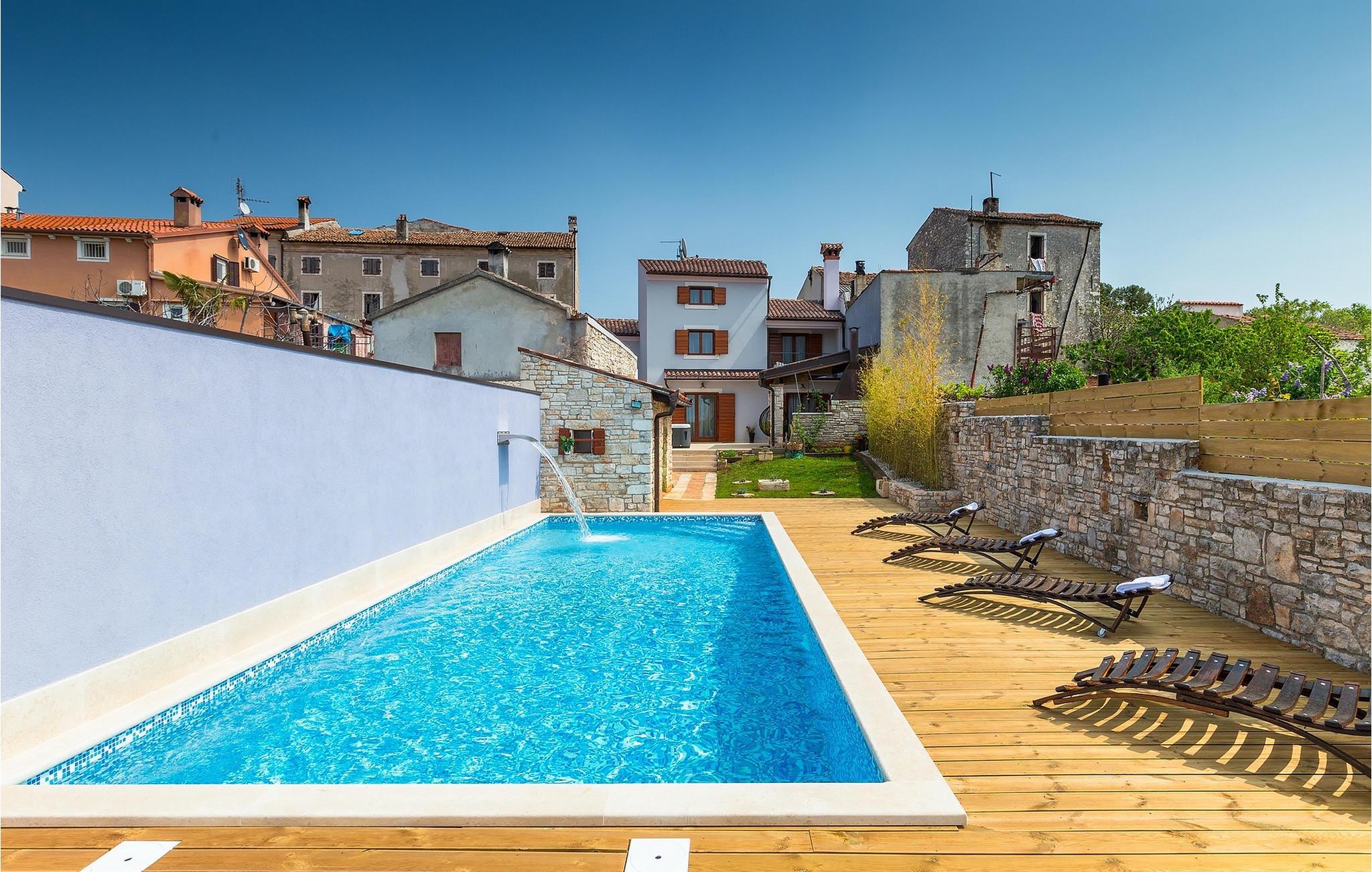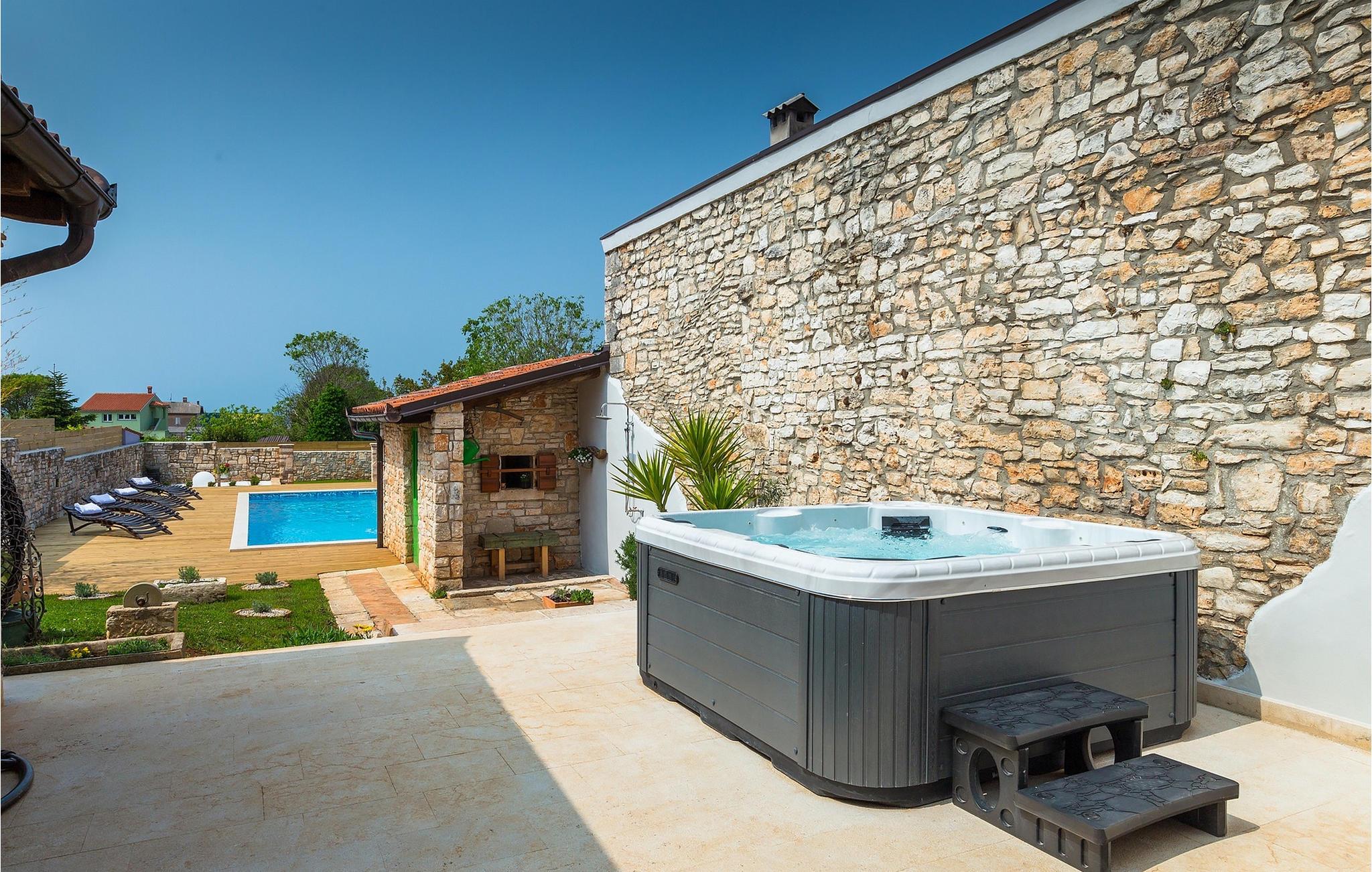 Den sjarmerende Villa San Rocco ligger i sentrum av den lille historiske byen Vodnjan, bare noen få minutter fra Istrias største by, Pula. Villaen er en perfekt blanding av rustikke og moderne elementer som får deg til å føle deg som hjemme. Med et samlet boareal på 270 kvadratmeter er det plass til opptil 8+2 personer, og villaen er nydelig innredet. Villa San Rocco er et restaurert, tradisjonelt istrisk hus fordelt på tre etasjer. Første etasje består av et sjarmerende, velutstyrt kjøkken, en stor spiseplass med kullgrill, en koselig stue og et bad. I første etasje finner du et spillrom med pokerbord og bordfotball. Fire sjarmerende innredede soverom har dobbeltseng. 3 av soverommene ligger i første etasje, mens det siste ligger i andre etasje. Villaens uteområde vil overvelde deg. Foran villaen er det en stor terrasse med overbygd spiseplass og kullgrill, et utendørs boblebad og et innbydende privat basseng. Rett rundt hjørnet ligger en stor plen hvor du kan slappe av i hengekøyen mens du leser favorittboken din. Derfra har du også tilgang til villaen, hvor du finner et biljardbord. Villaen er ideell for familier som ønsker en avslappende ferie med mange aktiviteter. Så ikke gå glipp av denne muligheten og bestill Villa San Rocco, som ligger i den lille, sjarmerende byen Vodnjan, bare en kort kjøretur fra fantastiske Pula.