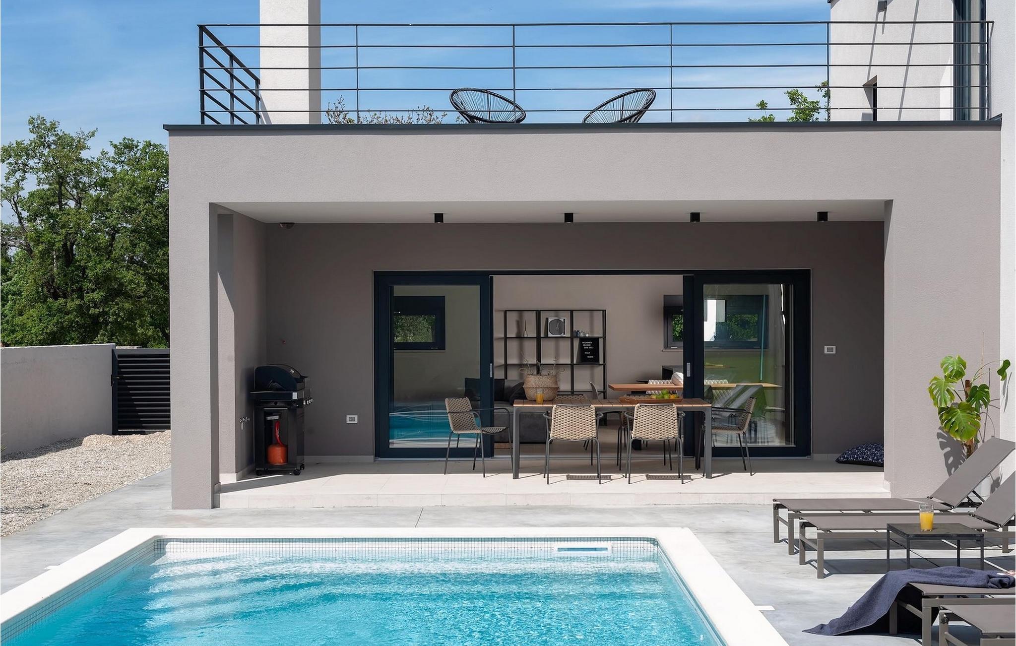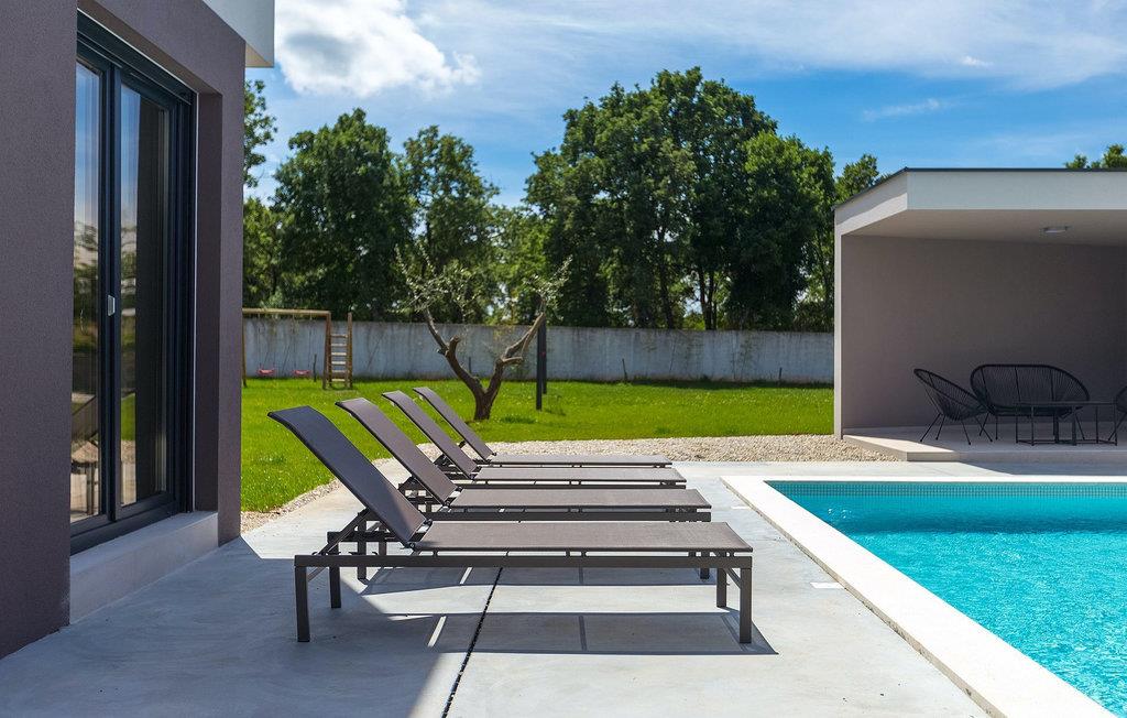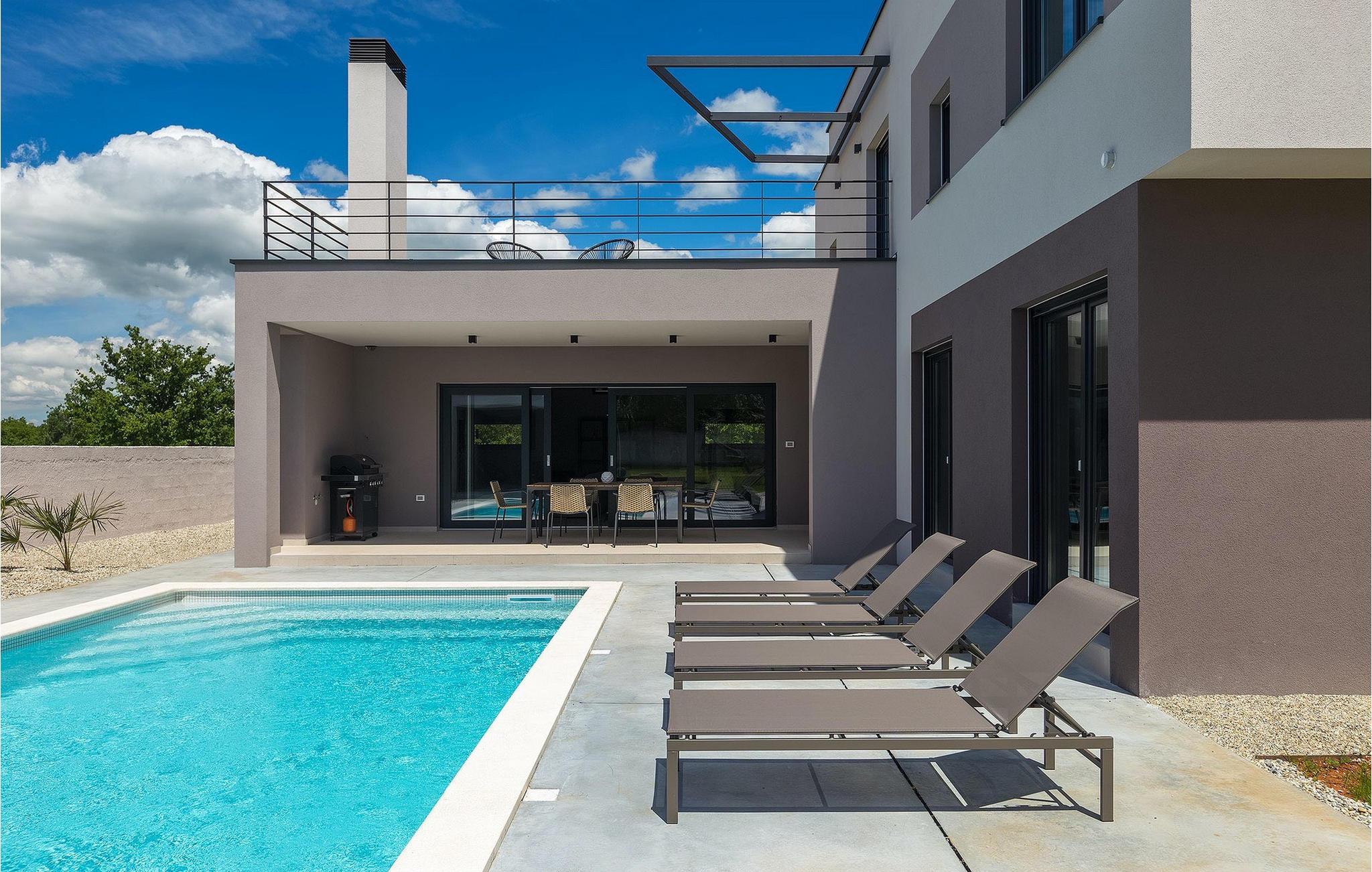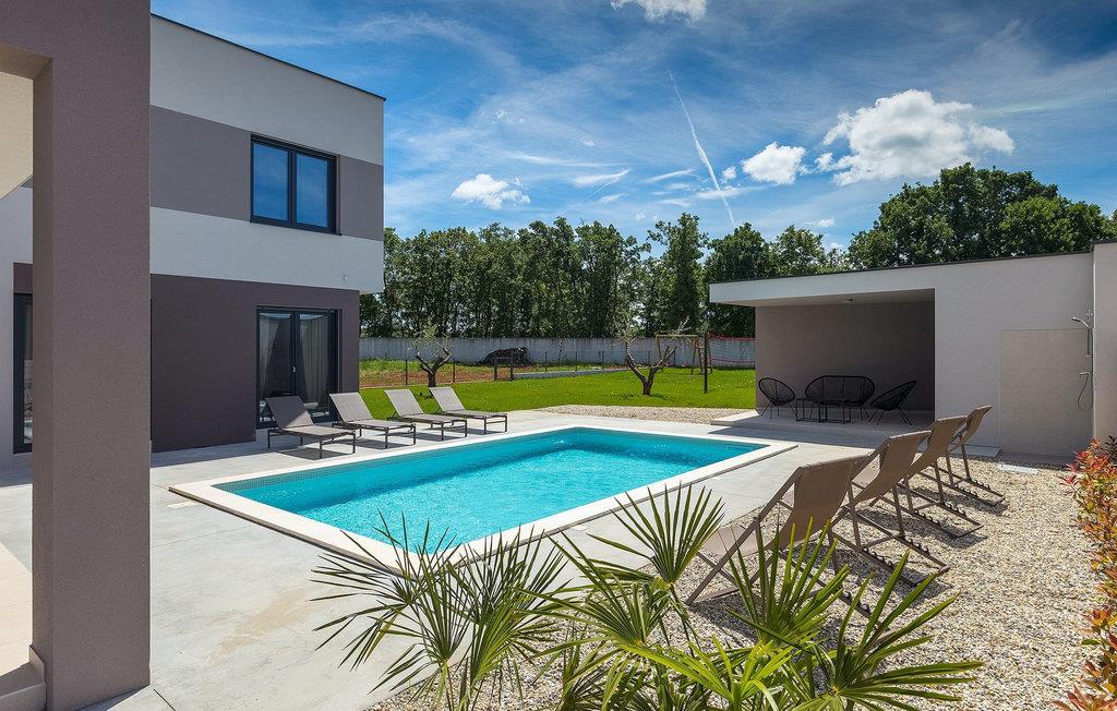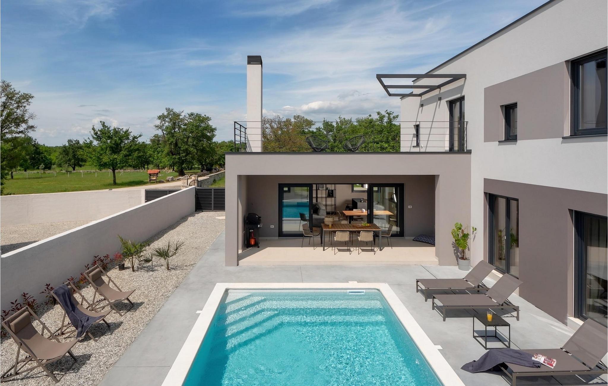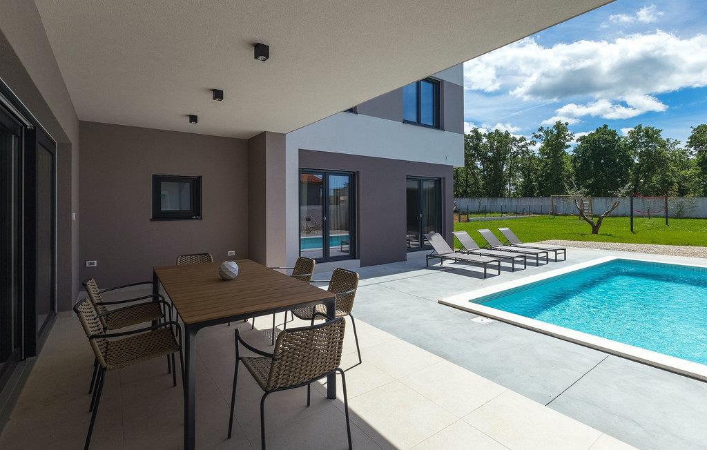 Denne vakre, moderne villaen ligger i rolige Vodnjan nær Pula, omgitt av fredelig middelhavsnatur. Villaen har plass til 8 + 2 personer og har privat basseng, uteservering med grill, WiFi og klimaanlegg. Første etasje består av en stilfullt innredet stue med kjøkken og spiseplass samt 2 soverom, et bad og et gjestetoalett. Soverommene har direkte utgang til den store terrassen og bassenget. De to andre soverommene med eget bad og balkong ligger i første etasje. Fra balkongen med en koselig sittegruppe kan du nyte den vakre utsikten over havet og de grønne omgivelsene.