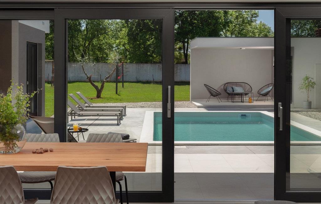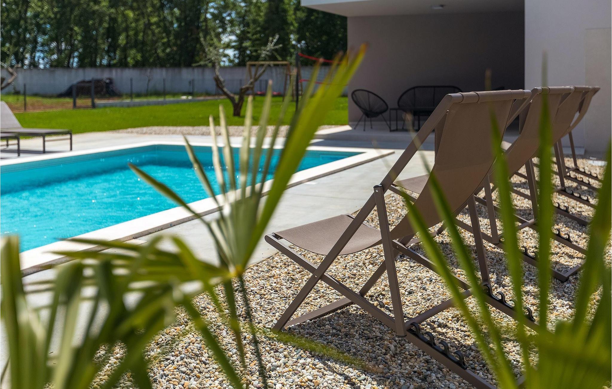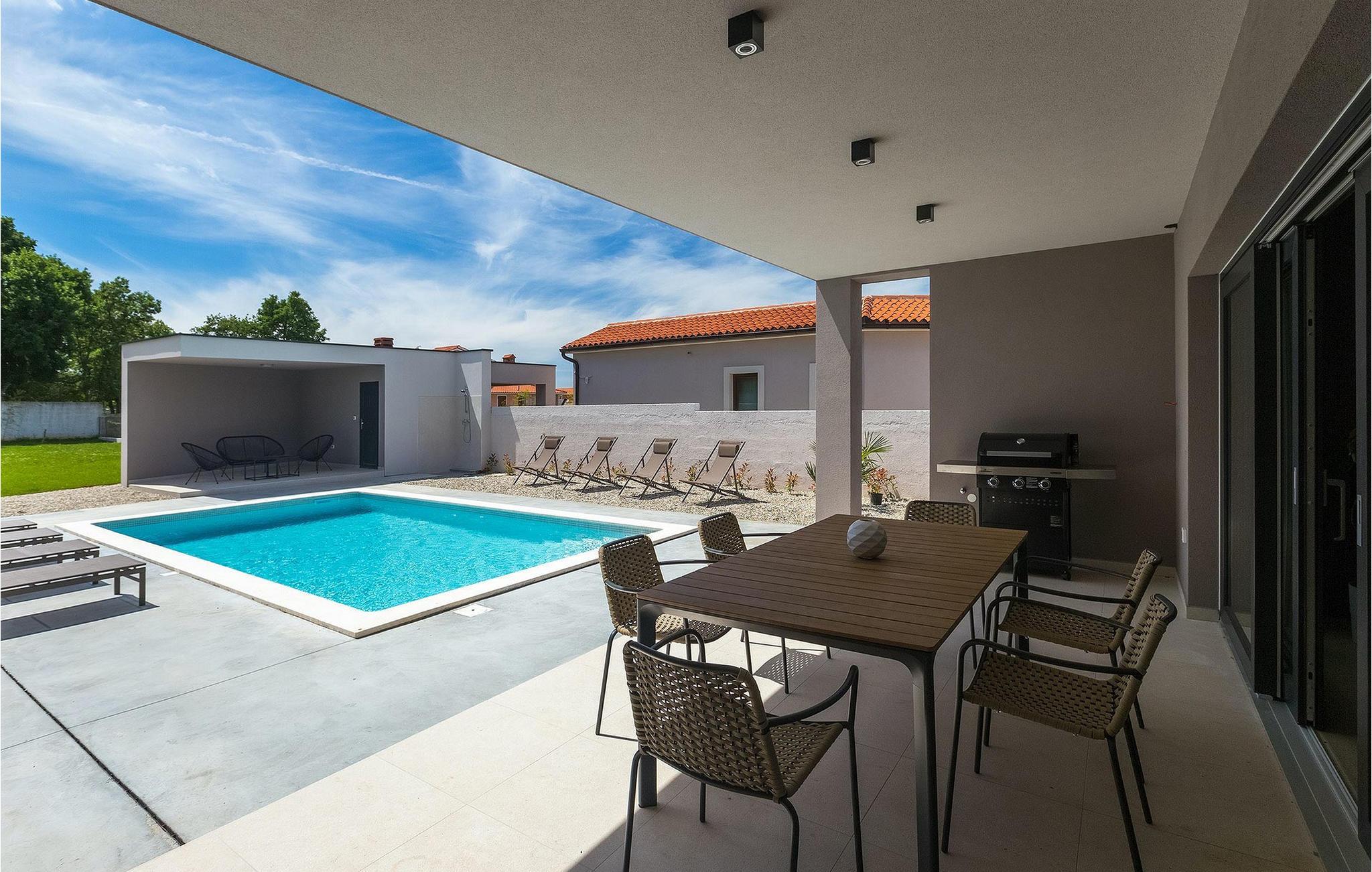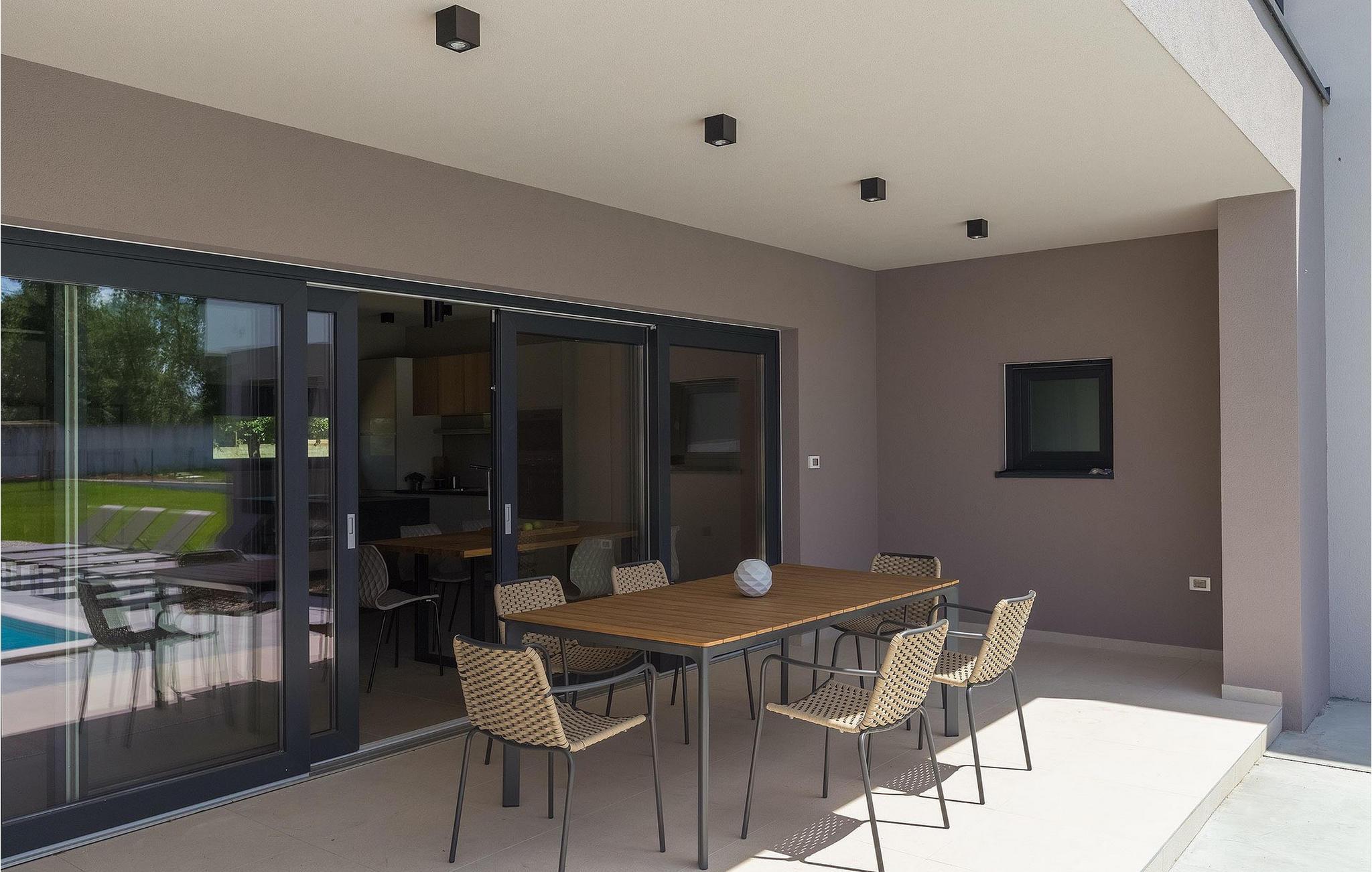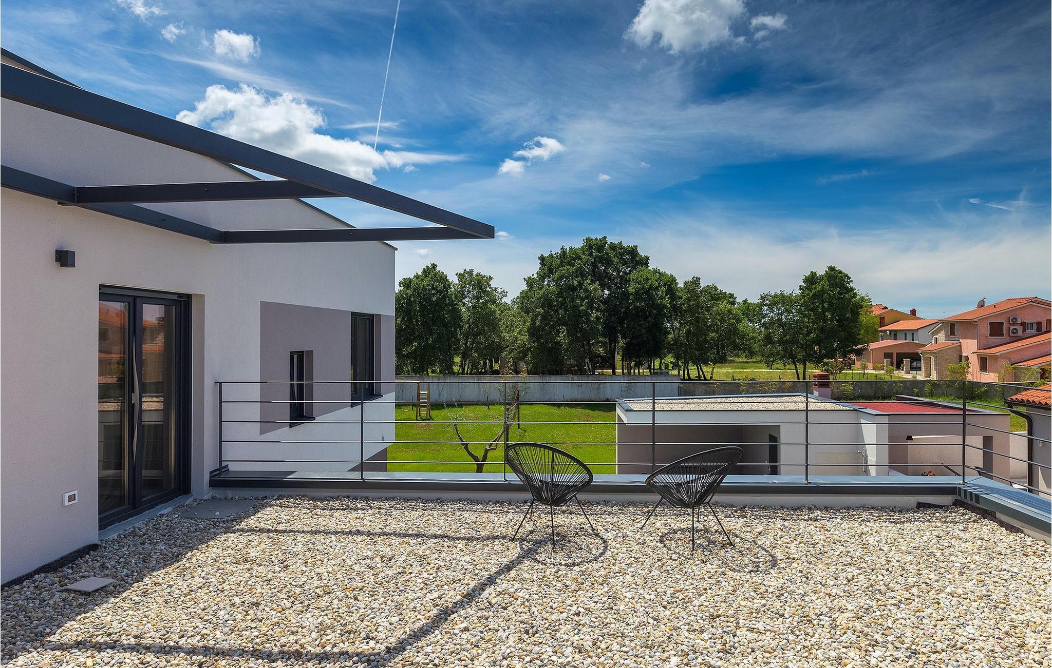 Denne vakre, moderne villaen ligger i rolige Vodnjan nær Pula, omgitt av fredelig middelhavsnatur. Villaen har plass til 8 + 2 personer og har privat basseng, uteservering med grill, WiFi og klimaanlegg. Første etasje består av en stilfullt innredet stue med kjøkken og spiseplass samt 2 soverom, et bad og et gjestetoalett. Soverommene har direkte utgang til den store terrassen og bassenget. De to andre soverommene med eget bad og balkong ligger i første etasje. Fra balkongen med en koselig sittegruppe kan du nyte den vakre utsikten over havet og de grønne omgivelsene.