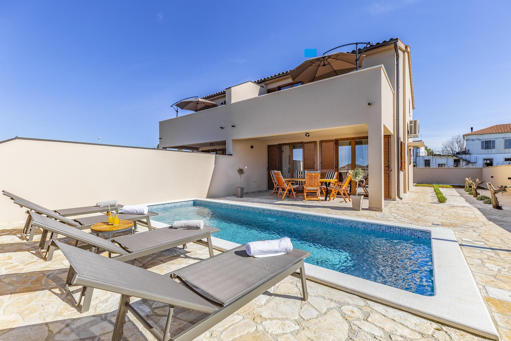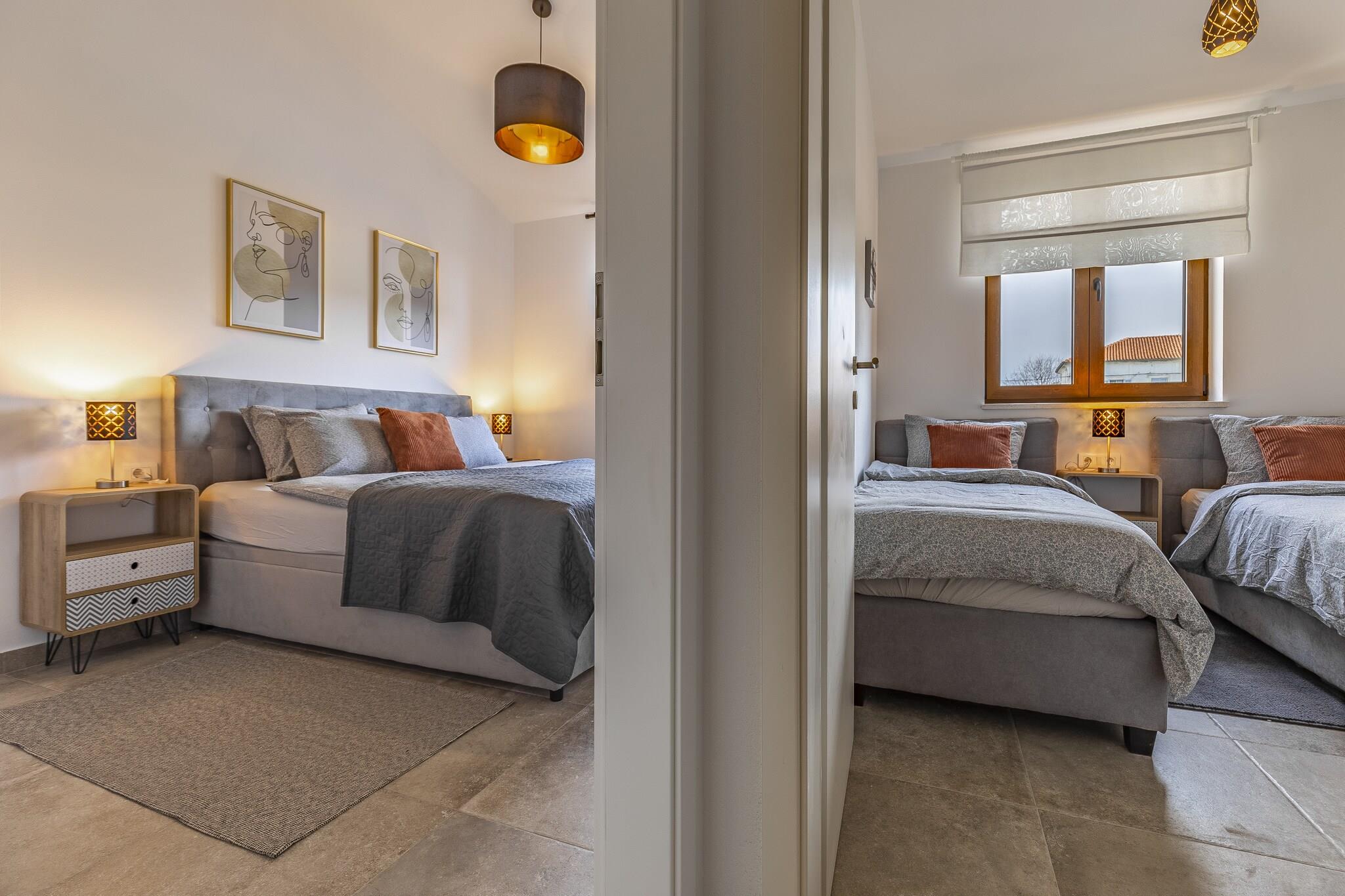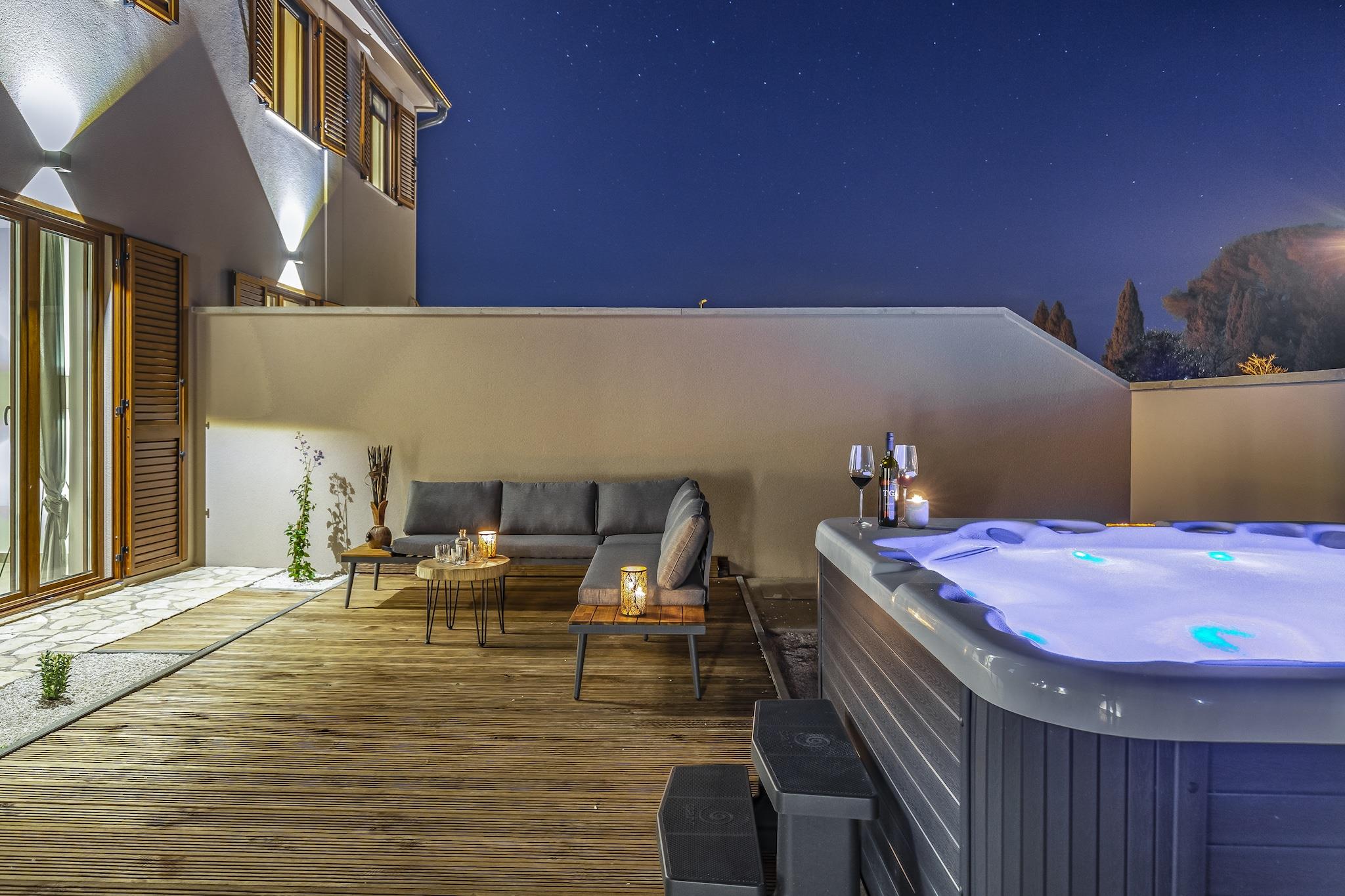 Denne romslige 3-roms villaen ligger kun 1 km fra Vodnjan sentrum, og har plass til opptil 7 gjester og tilbyr en avslappende tilflukt nær Istriakysten. Med havet og stranden kun 5 km unna, og Pula lufthavn kun 9 km unna, er det en praktisk base for å utforske regionens kulturelle og naturlige høydepunkter. Villaen har et fullt utstyrt kjøkken, koselig stue med satellitt-TV og to bad, inkludert ett eget bad med balkong. Soverommene har klimaanlegg, og tilleggsfasiliteter inkluderer et vaskerom, barneseng og barnestol. Utenfor kan du nyte en privat terrasse, inngjerdet hage og grillplass, perfekt for utendørs servering. Gjestene kan slappe av i det private boblebadet, badstuen eller ta en dukkert i utendørsbassenget. Barn vil elske lekeutstyr, bordtennis og bordfotball, mens voksne kan slappe av på solsengene eller samles rundt utendørssalongen. Gratis parkering og Wi-Fi er inkludert.