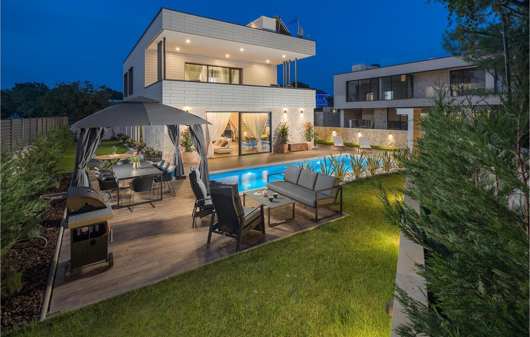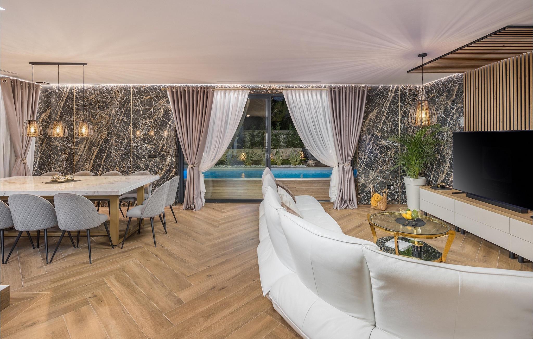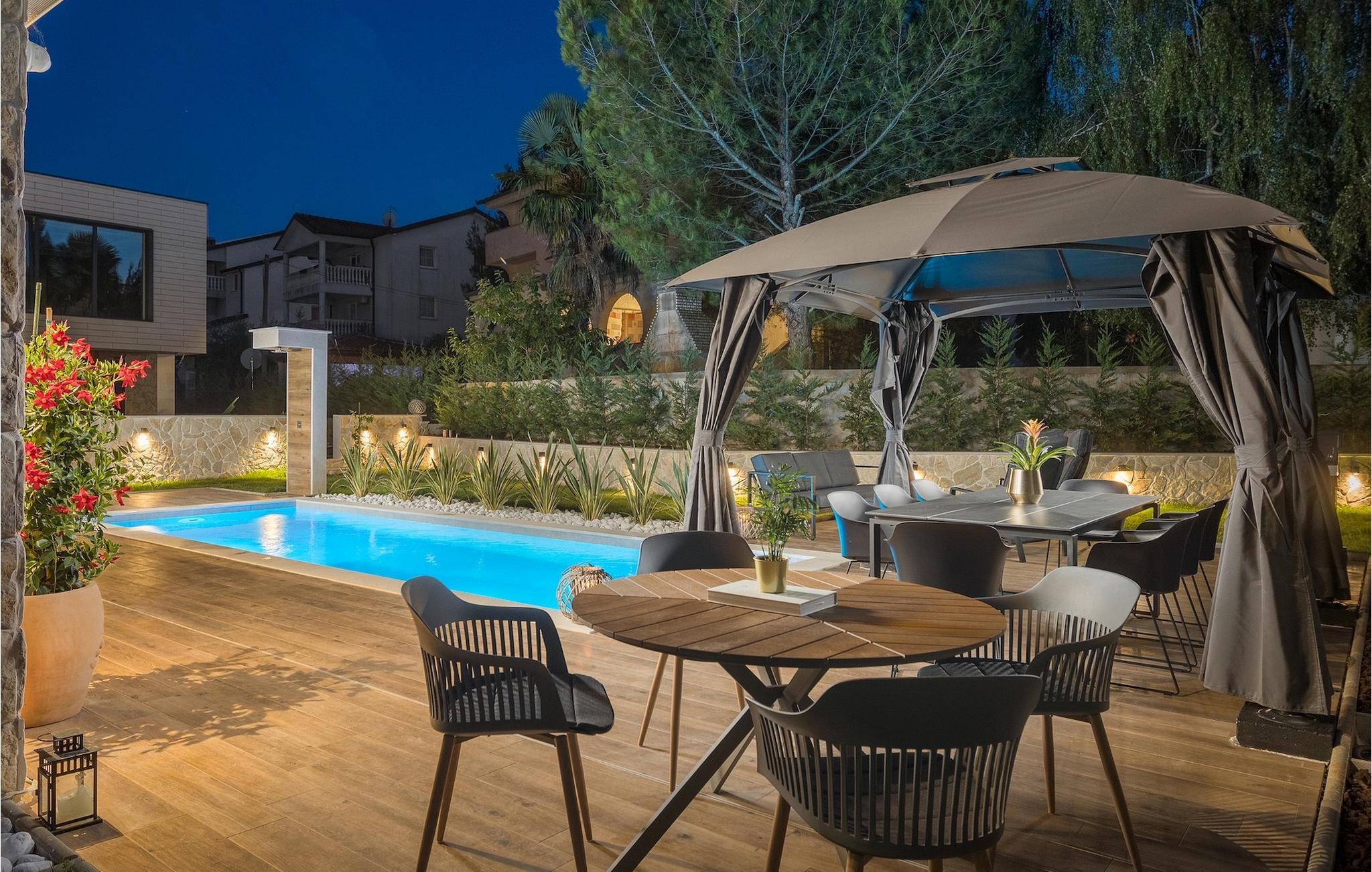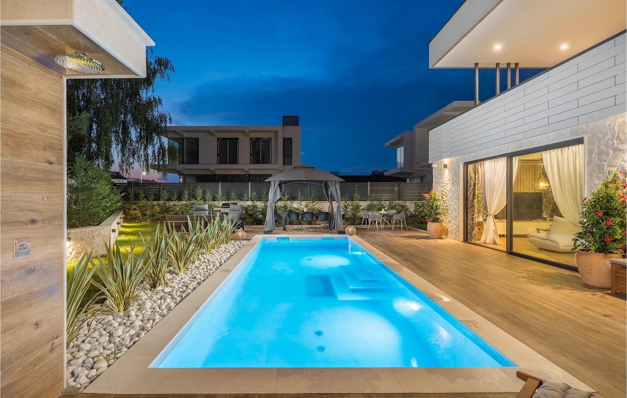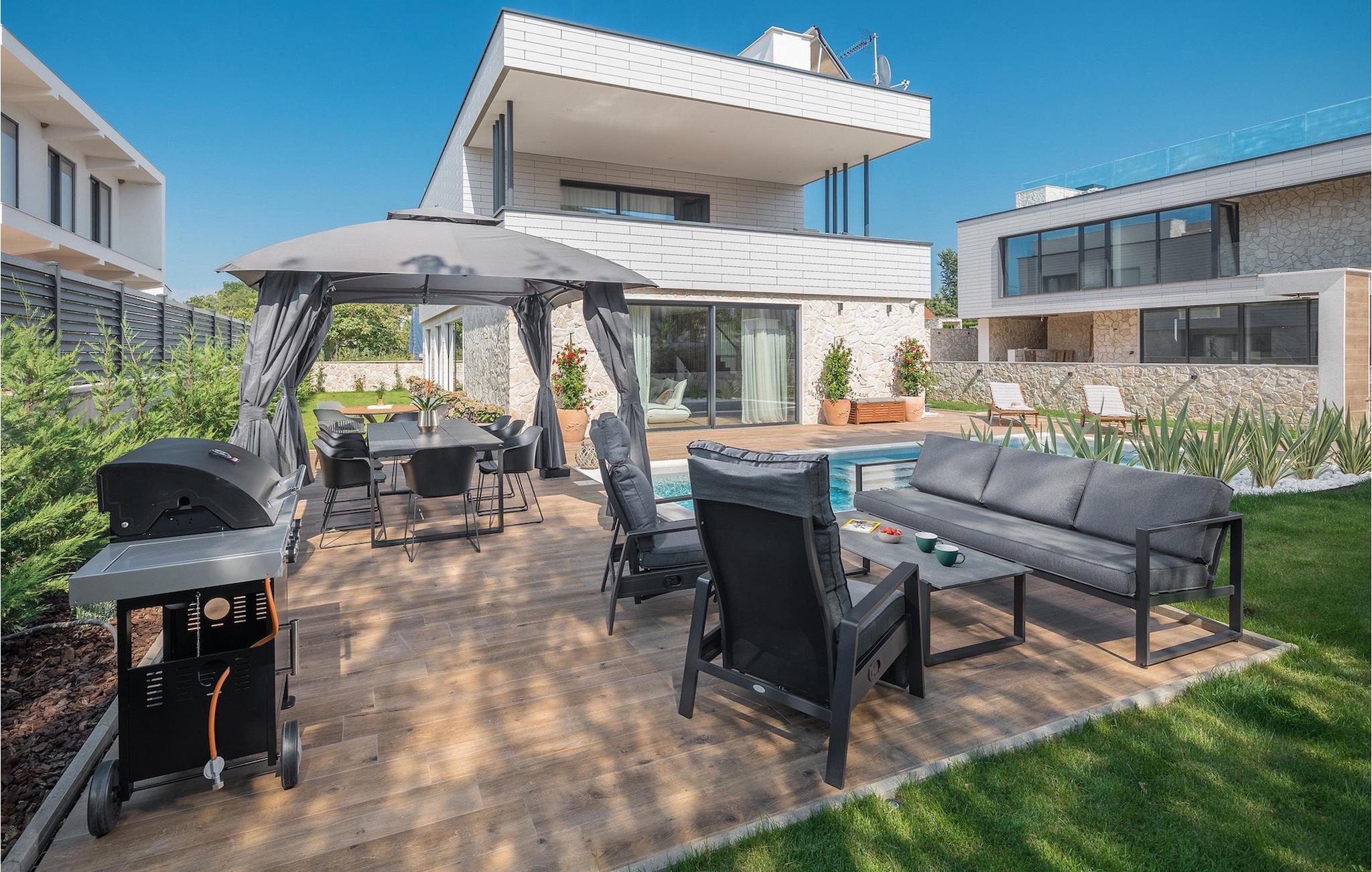Unn deg en pause fra hverdagens kjas og mas i den vakre Villa Golden Shine for 8+2 gjester. Nyt ferien med familie og venner i denne villaen med privat basseng, omgitt av en velstelt hage med mange planter, og utendørsterrassen ved bassenget tilbyr alt du trenger for et utendørs opphold. Tilbered dine daglige måltider på grillen og nyt dem ved det overbygde spisebordet på terrassen. Et loungeområde ved bassenget er også tilgjengelig for korte kaffe- eller cocktailpauser. Den store glassdøren gir direkte adgang fra utendørsterrassen til den åpne planløsningen med stue, spisestue og kjøkken i første etasje.