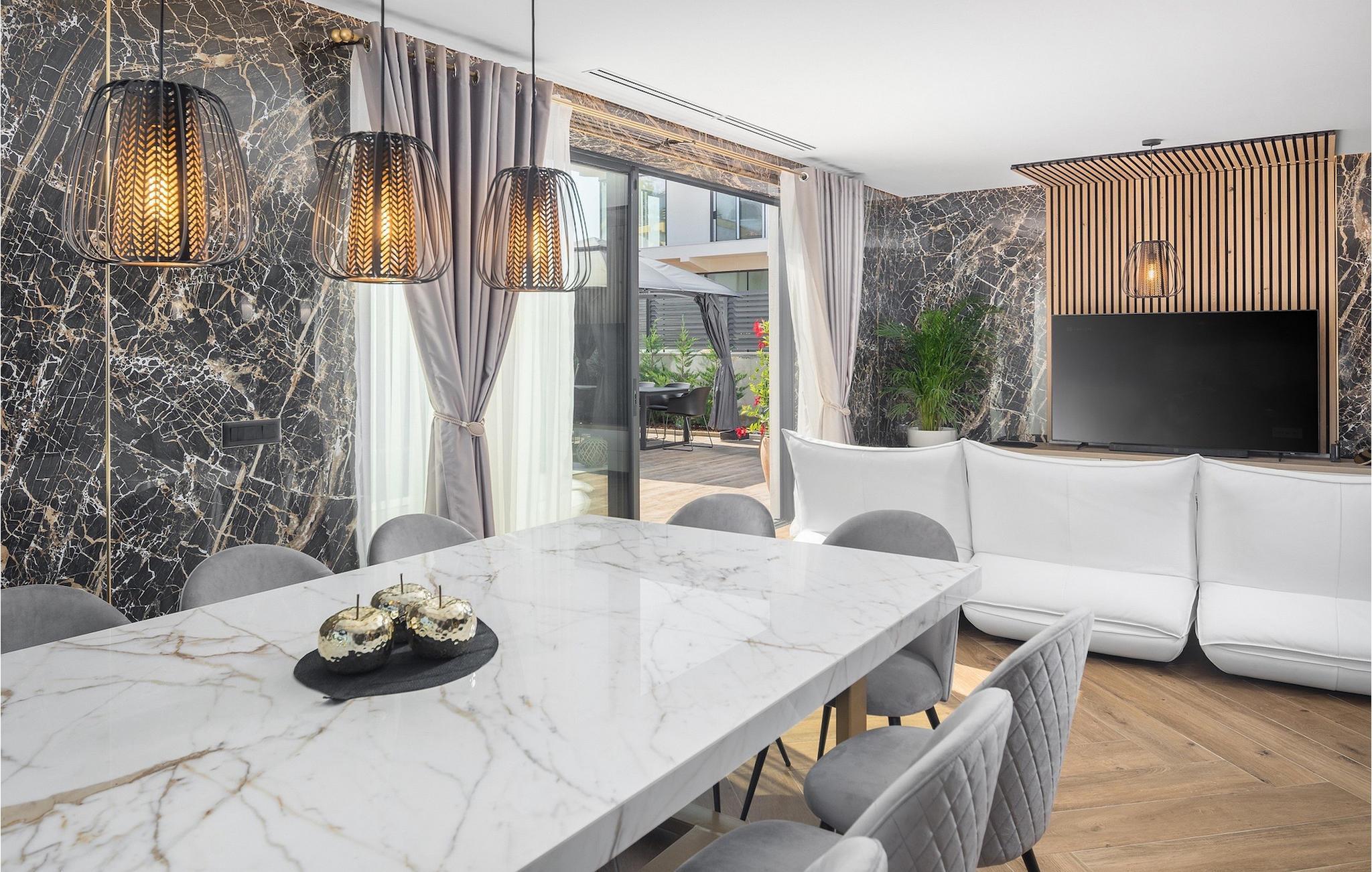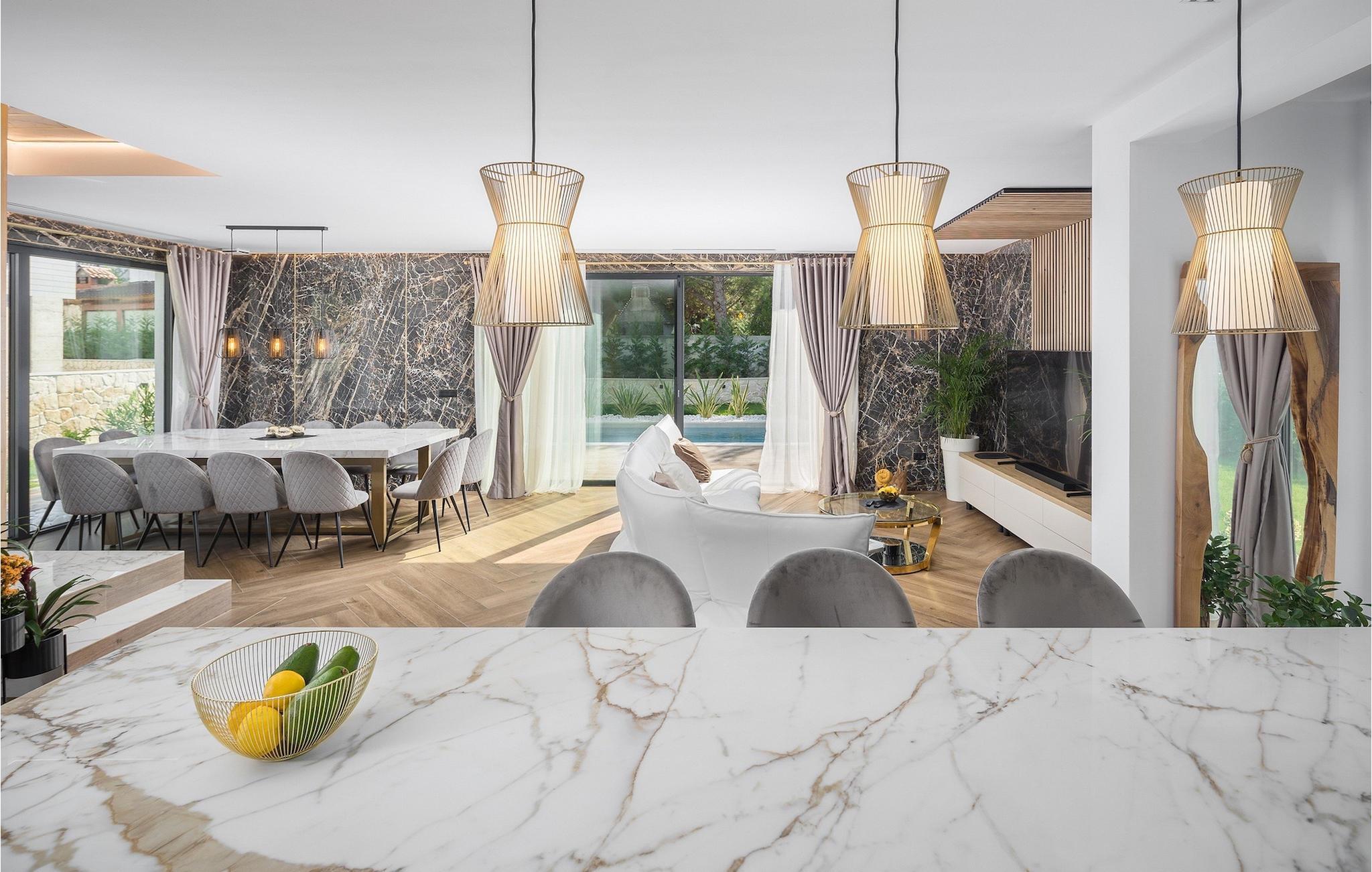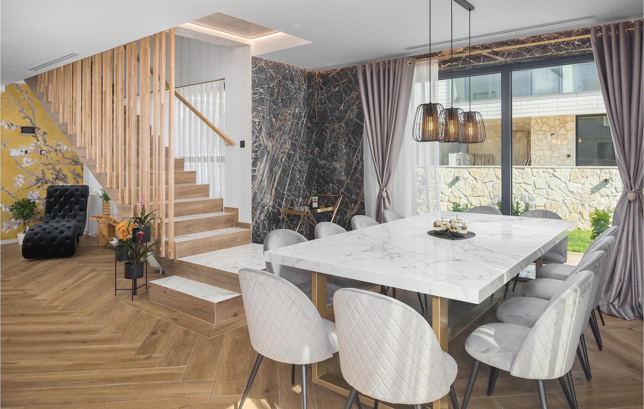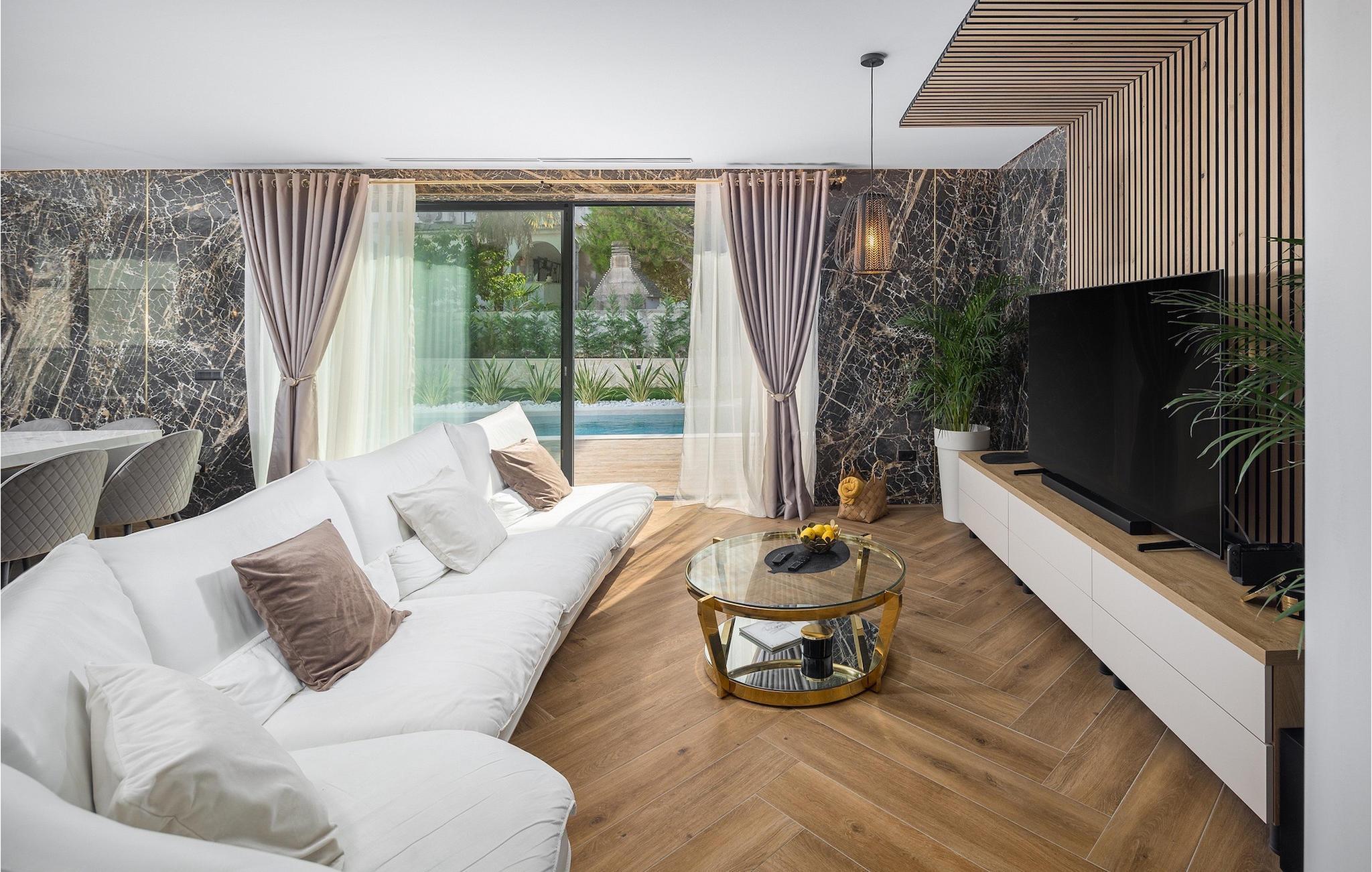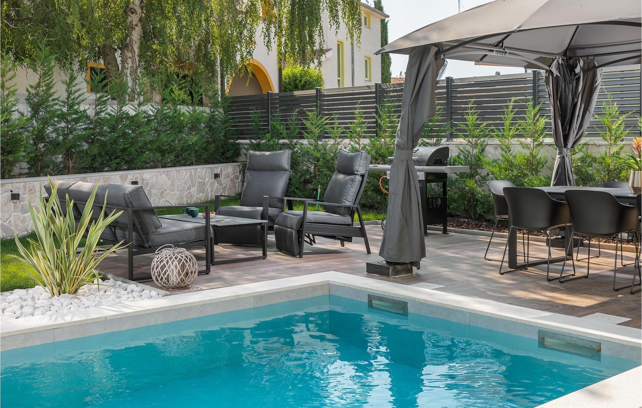 Unn deg en pause fra hverdagens kjas og mas i den vakre Villa Golden Shine for 8+2 gjester. Nyt ferien med familie og venner i denne villaen med privat basseng, omgitt av en velstelt hage med mange planter, og utendørsterrassen ved bassenget tilbyr alt du trenger for et utendørs opphold. Tilbered dine daglige måltider på grillen og nyt dem ved det overbygde spisebordet på terrassen. Et loungeområde ved bassenget er også tilgjengelig for korte kaffe- eller cocktailpauser. Den store glassdøren gir direkte adgang fra utendørsterrassen til den åpne planløsningen med stue, spisestue og kjøkken i første etasje.