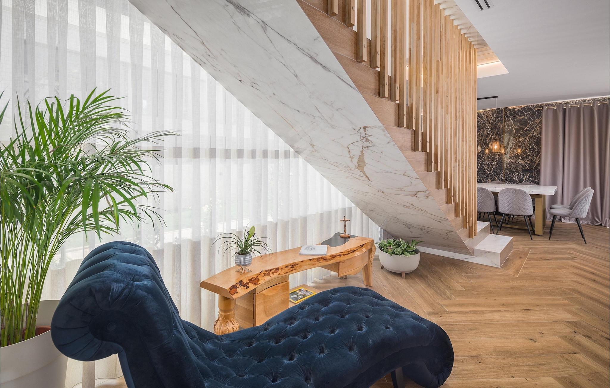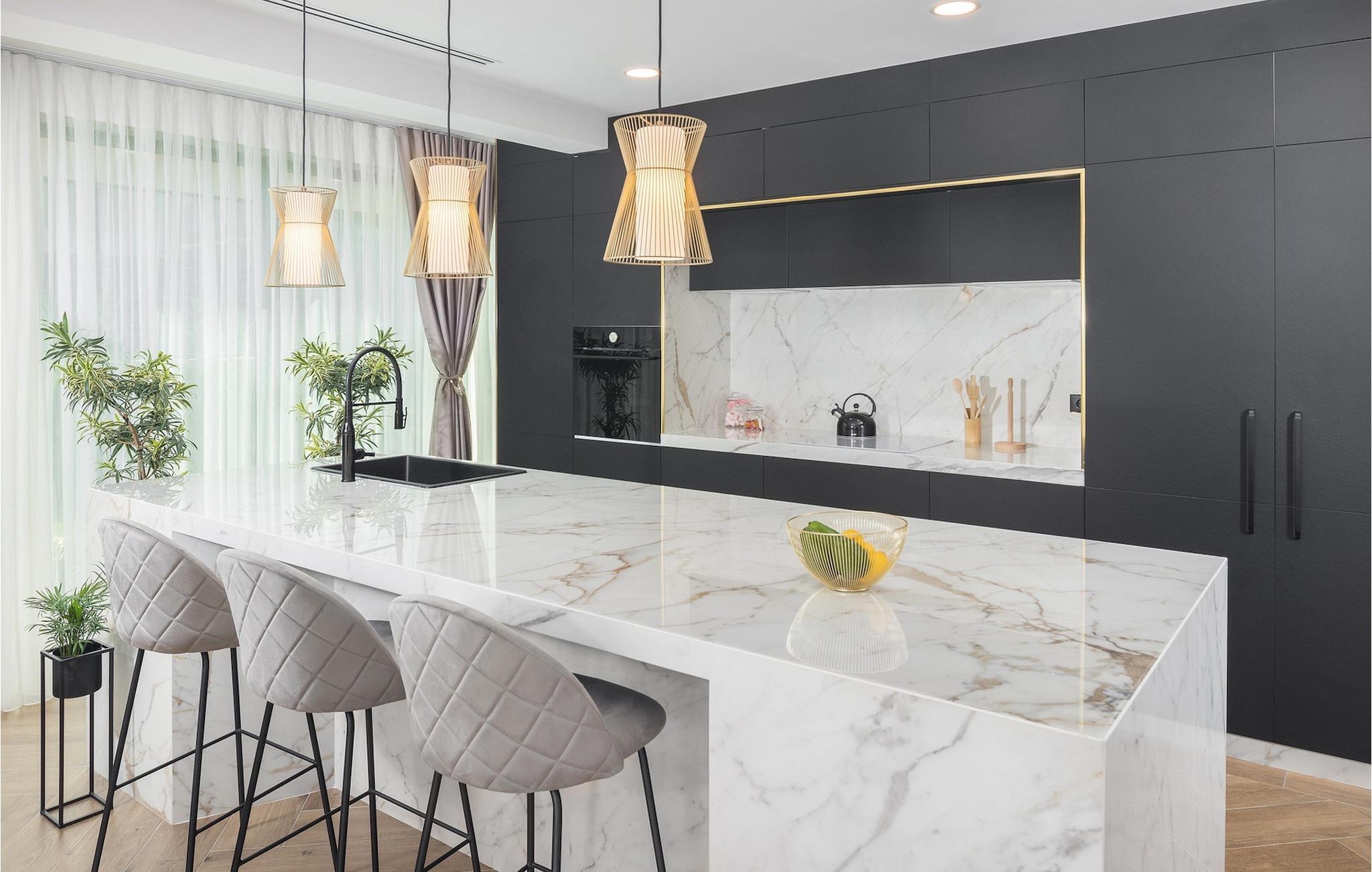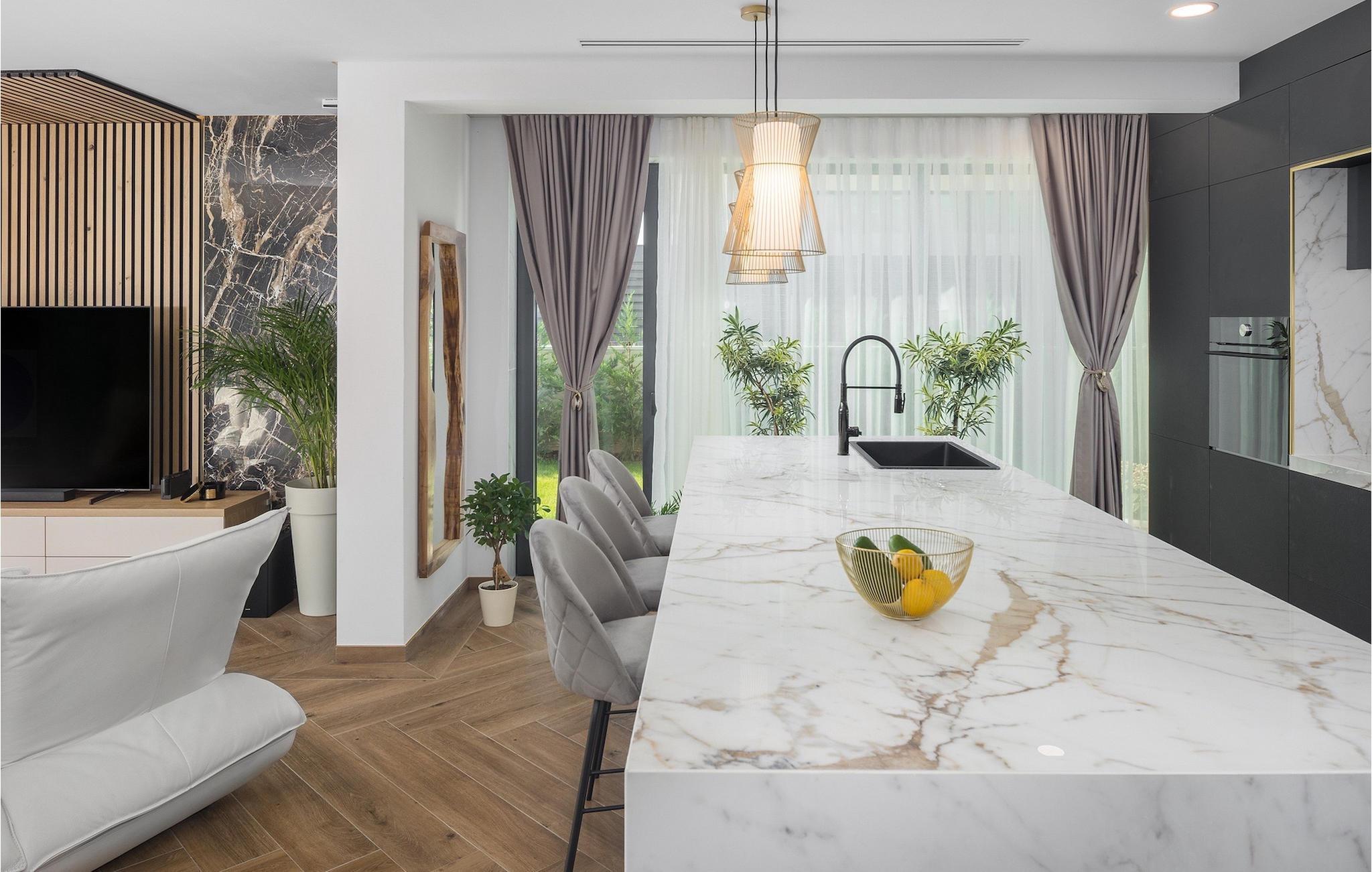 Det første du vil legge merke til når du kommer inn i villaen, er den moderne og unike innredningen som går igjen i hele huset. Kontinuiteten i innredningen med nøytrale toner og mye lys gjør den åpne planløsningen mellom stue, spisestue og kjøkken til et enda mer romslig rom. Kjøkkenøya med barkrakker er det perfekte stedet for morgenkaffen eller frokosten. Og det store spisebordet er det faste stedet for kvelder med mat og brettspill for hele reisefølget. I første etasje finner du to romslige soverom og to bad.