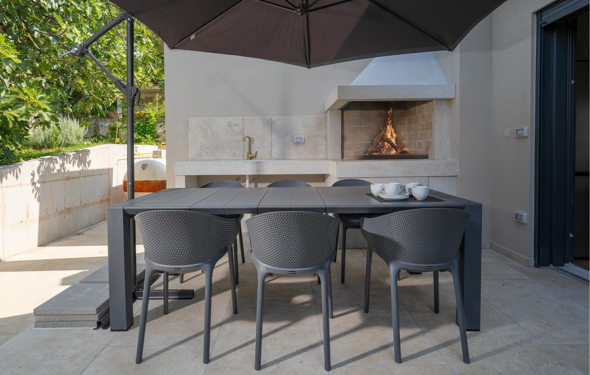 Den store terrassen byr på en nydelig uteservering, og den koselige salongen inviterer deg til å nyte et glass vin med utsikt over oliventrærne. Nyt stemningsfulle grillfester og lange sommerkvelder.