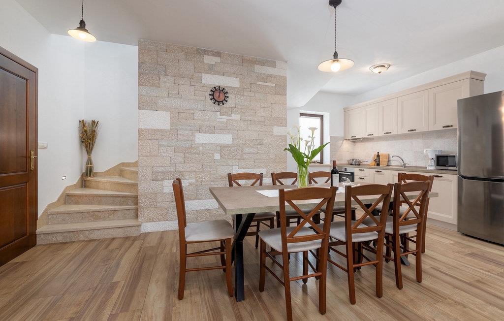 I andre etasje ligger to elegante soverom med dobbeltseng og eget bad. Ett av dem har direkte utgang til den vakre balkongen, hvor du også kan nyte den fantastiske utsikten i fred og ro. Det tredje soverommet med dobbeltseng ligger i første etasje og har et separat bad. Den lyse og luftige stuen og spisestuen med åpen planløsning dominerer her, med store terrassedører som slipper inn rikelig med naturlig lys og gir fantastisk utsikt. De ligger i tilknytning til et moderne, fullt utstyrt kjøkken, slik at du kan våge deg på å tilberede noen av de regionale oppskriftene - kanskje ferske østers og blåskjell fra Lim Bay i nærheten.