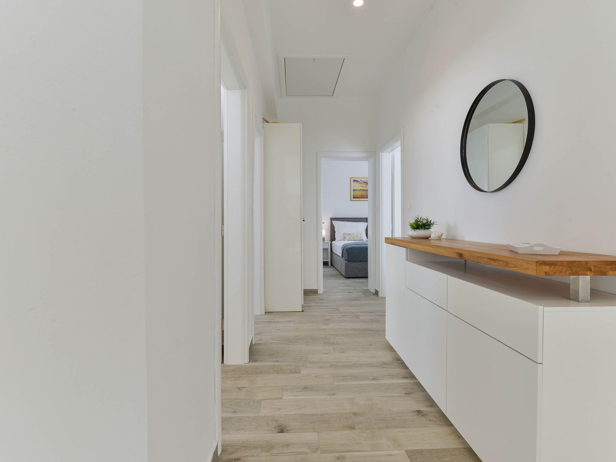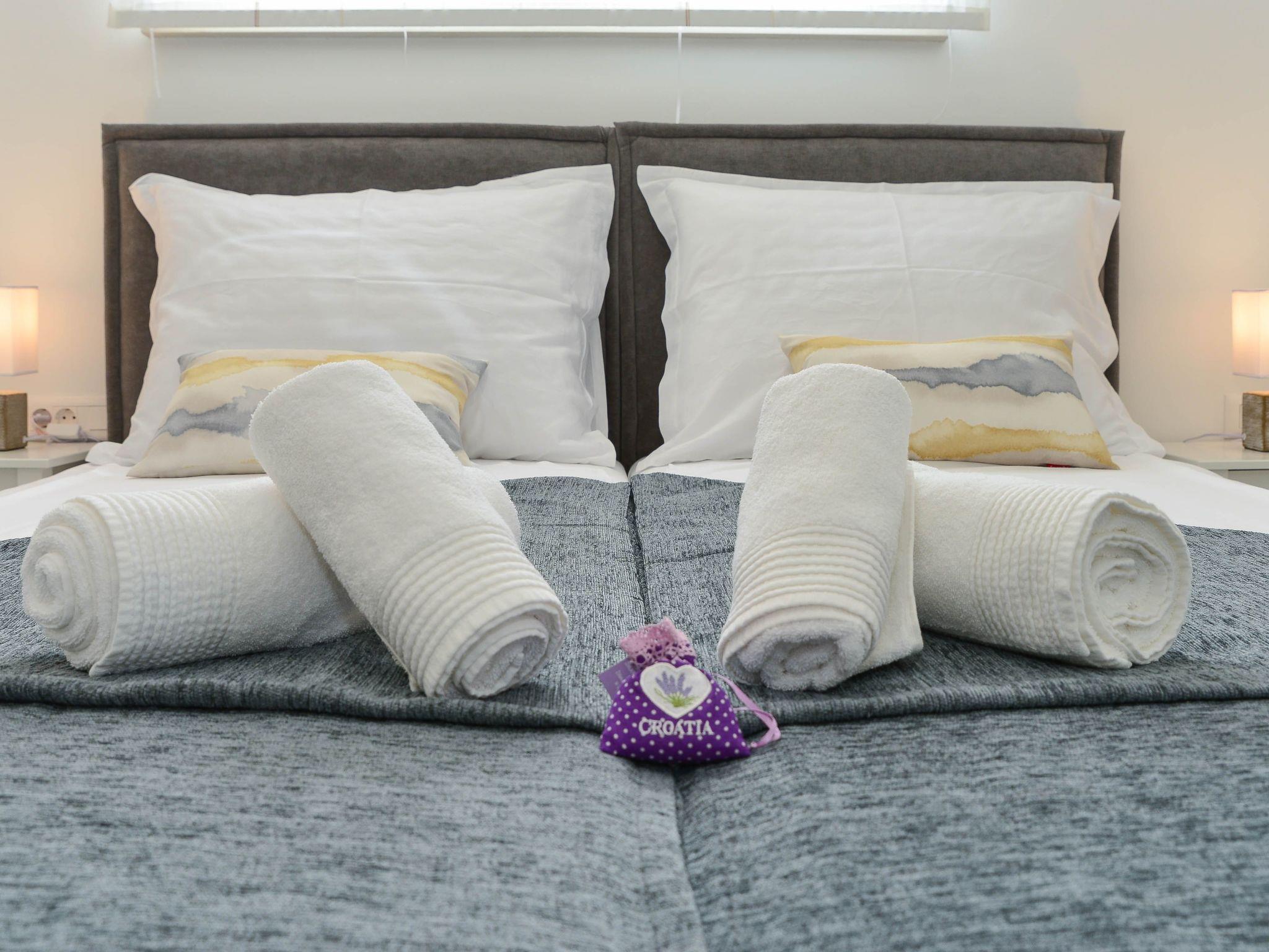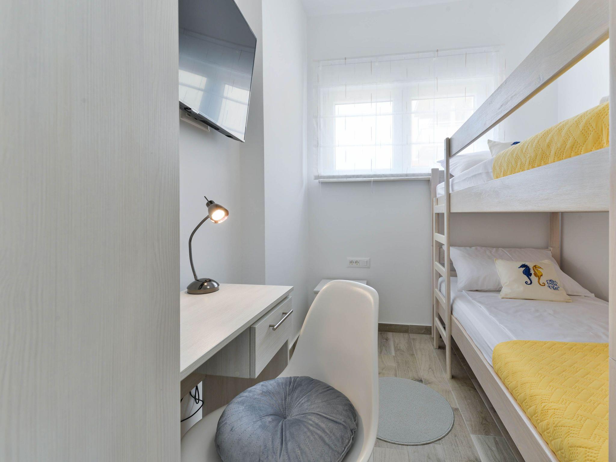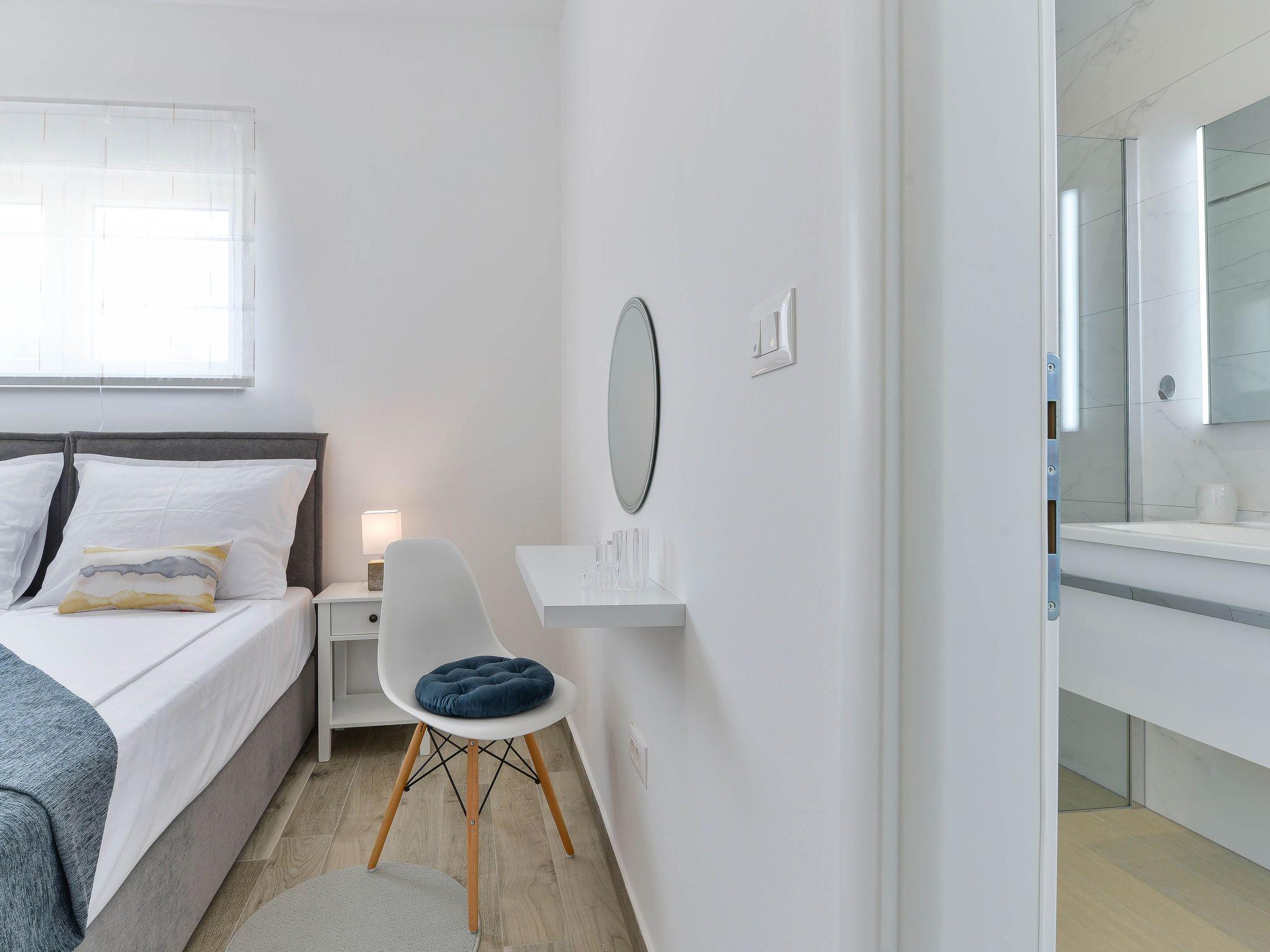 A spacious villa Regina with plenty of natural light can host up to eight people. It contains four comfortable bedrooms, three of which have a fully equipped private bathroom, and the fourth room has a bunk bed. In addition to spacious rooms with TVs, guests will enjoy a living room with large balcony windows, a well-equipped kitchen, and a spacious dining room. The true pearl of this villa is the spacious and fenced garden, which is synonymous with an oasis of peace - guests can relax in the sun on comfortable deckchairs with morning coffee from the machine and enjoy the heated pool from where they can watch their children playing on the trampoline. They also have a large parasol at their disposal so that they can relax in the shade, protecting themselves from the strong sun. In the garden, there is a barbecue where you can grill fish bought in a fish market 200 m from the villa, and for other groceries, there is also a fruit shop, a butcher's shop, and a bakery. They can spend pleasant evenings in restaurants and cafes near the villa, or organize an evening of board games with friends on the terrace where they have complete privacy. The villa with all its functional facilities is ideal for vacations throughout the year and is in a quiet neighborhood. It also offers private parking in front of the entrance for three cars and good wi-fi.
