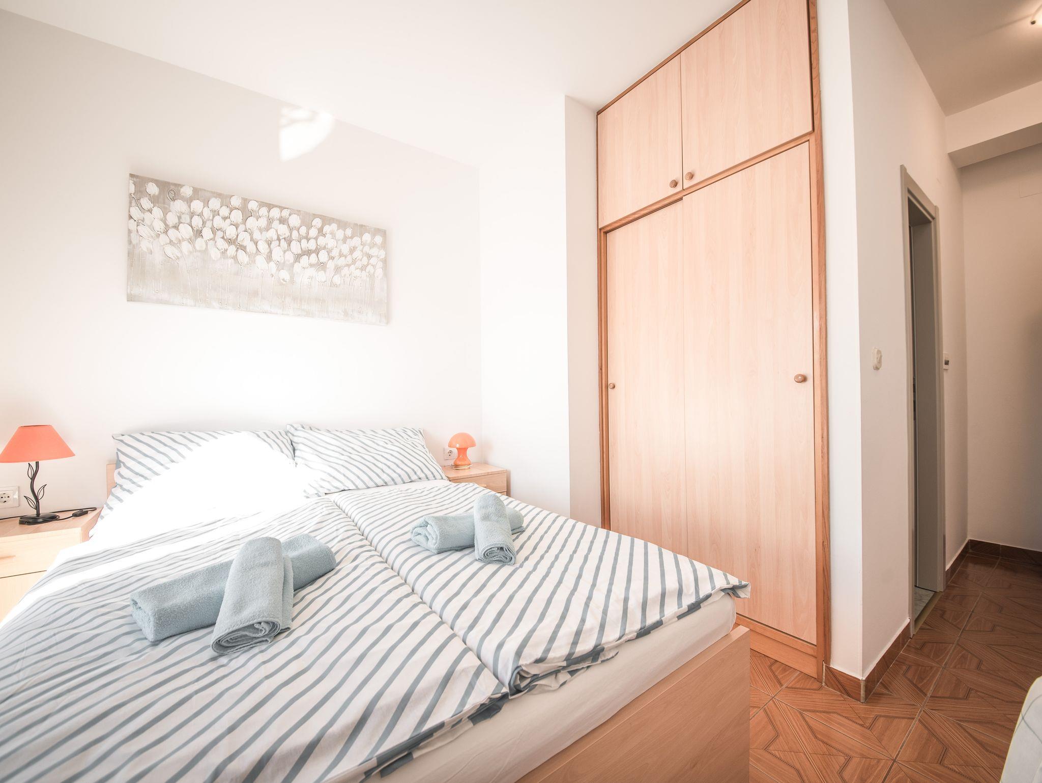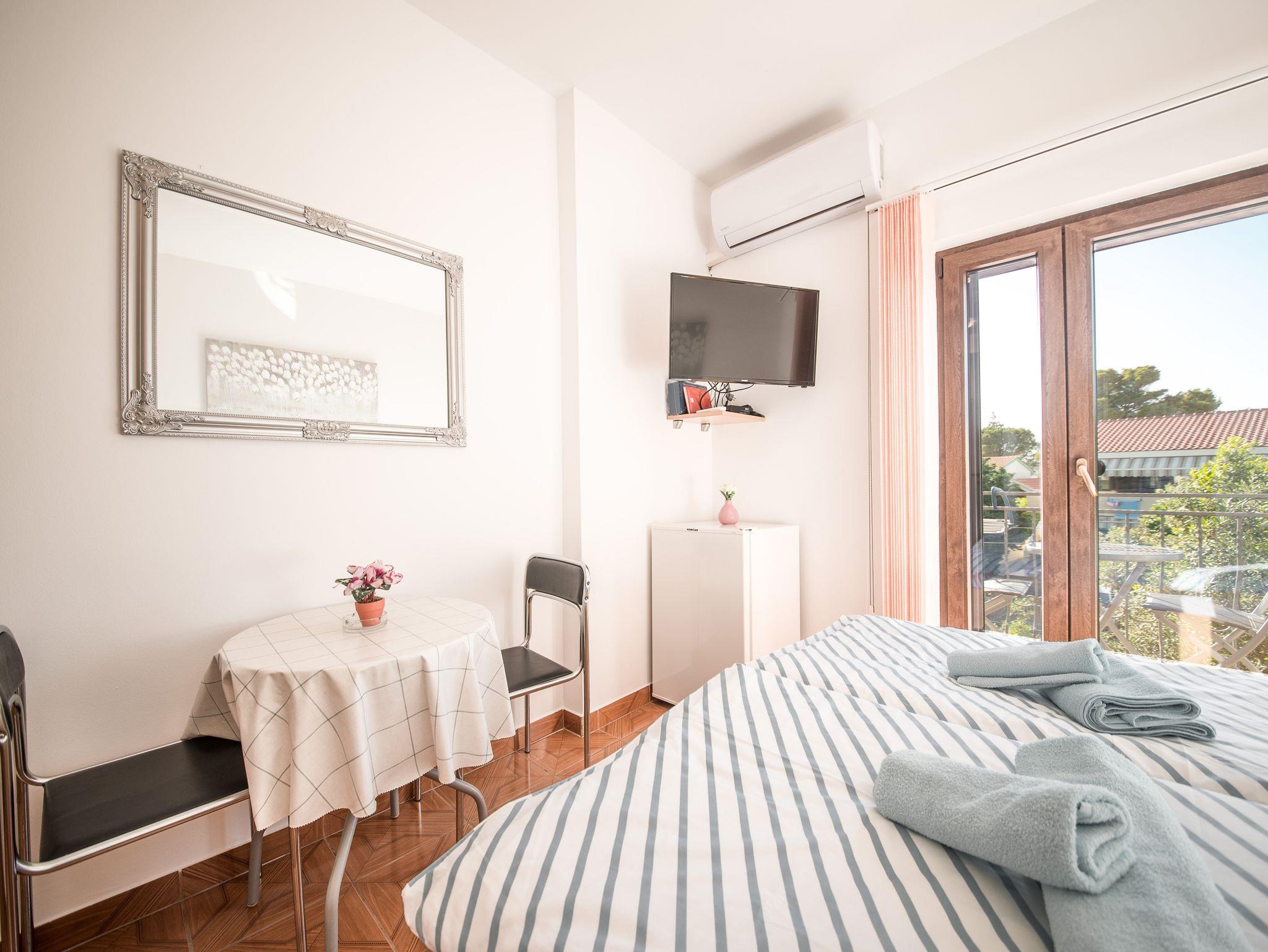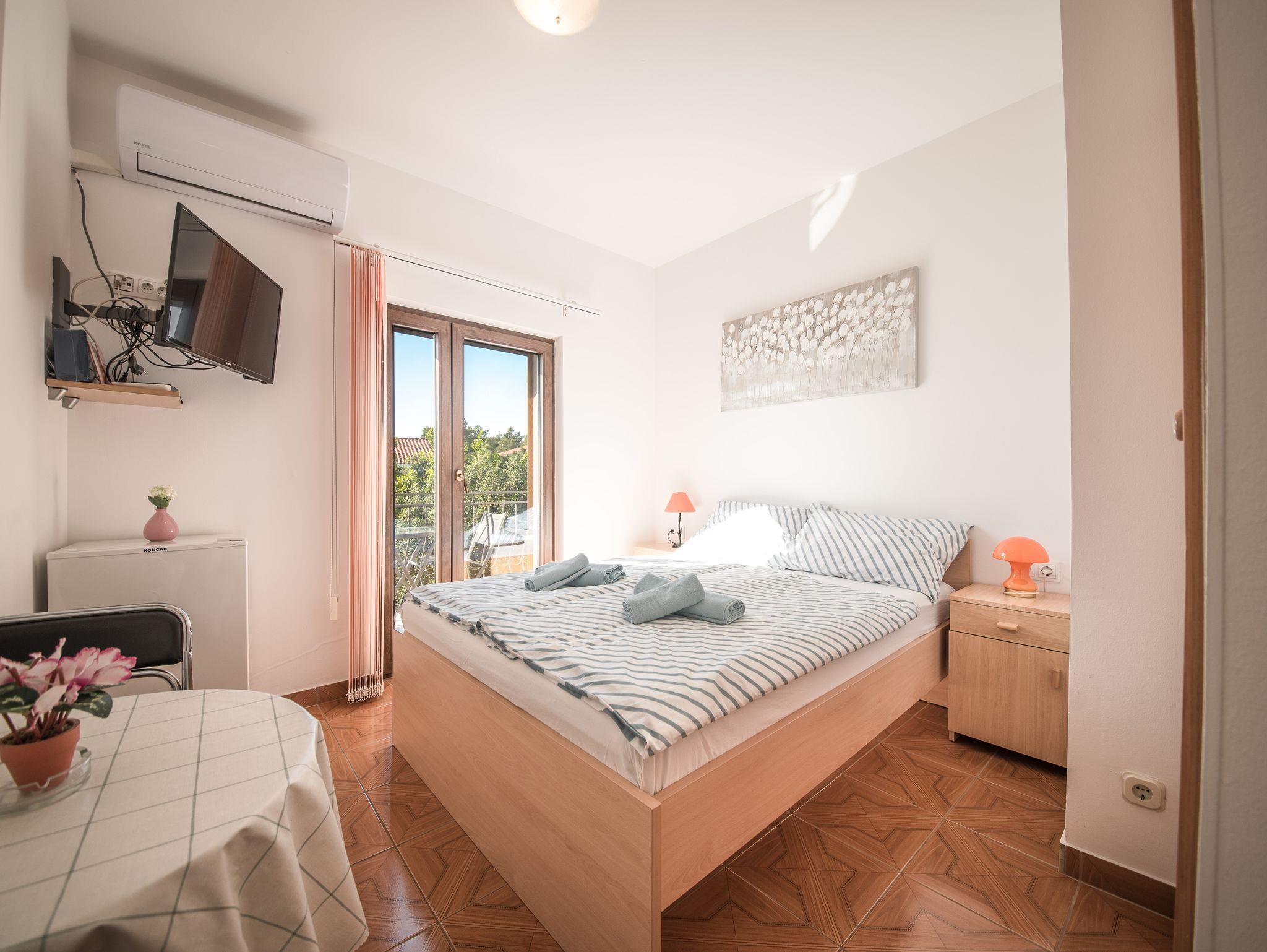 Zimmer bietet Platz für 2 Gäste. Die Betten sind in Schlafzimmern, die es 1 gibt, innerhalb einer Gesamtfläche von 14m2, angeordnet. Die Gäste haben einen eigenen Balkon zur Verfügung, auf der sie in warmen Sommernächten genießen können. Das Zimmer bietet Meerblick. Es ist erlaubt, Speisen auf dem Gemeinschafts-Grill vorzubereiten. Die reservierte Unterkunftseinheit ist ein Zimmer mit eigenem Badezimmer ohne die Möglichkeit der Nutzung einer Küche. IM PREIS INBEGRIFFEN: Kurtaxe, Endreinigung, Klimatisierung, Parkplatz, Internet, Kinderbett, Bügeleisen, Bügelbrett, Föhn. VERBINDLICHE ZUSÄTZLICHE KOSTEN: Aufzahlung für Kurzaufenthalte (prozentualer Zuschlag pro Nächtigungsanzahl: 30% - 1, 20% - 2, 10% - 3). UNVERBINDLICHE ZUSÄTZLICHE KOSTEN: Wäschewaschen (5,00 € Waschen), Bootsanlegeplatz (10,00 € pro Nacht). Die Verfügbarkeit zusätzlicher Dienstleistungen in Ihrem reservierten Termin und die Preise derselben (falls nicht aufgeführt) müssen im Voraus überprüft werden. Zusätzliche Dienstleistungen die in der Zahlungsaufforderung nicht aufgeführt sind werden direkt beim Vermieter bezahlt, angenommen der Gast nutzt auch diese. Ermäßigung auf den Grundpreis: Gratistag 14=13 (bei einem Aufenthalt von 14 Tagen oder mehr erhalten Sie einen Gratistag für den Aufenthalt bis 31.12.26).