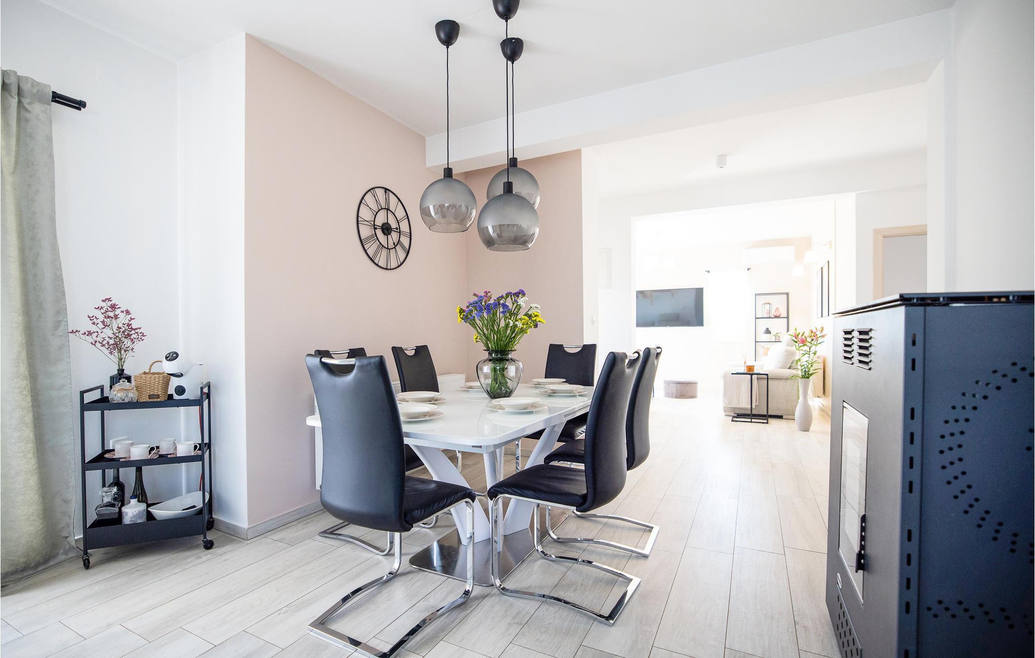 Du og familien kan se frem til en avslappende ferie i dette vakre feriehuset. Boligen består av to etasjer, som er forbundet med hverandre via en utvendig trapp. Begge områdene er utstyrt med kjøkken og stue, slik at for eksempel en familie kan reise sammen med besteforeldrene uten å måtte gi avkall på privatlivet sitt. Nyt de harmoniske og lyse rommene inne og tilbring mye tid i den store hagen. Her kan du oppholde deg hele dagen, ta en dukkert i bassenget og slappe av på solterrassen. Den overbygde terrassen med mursteinsgrill innbyr til hyggelige kvelder, og du kan runde av dagen med en bordfotballturnering på terrassen ved huset. Du kan også glede deg til å smake på frukten og grønnsakene som dyrkes i hagen.