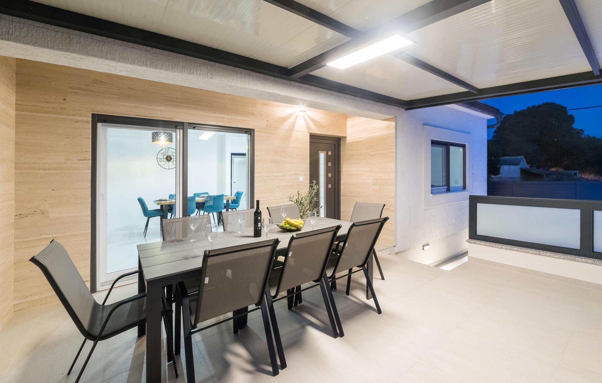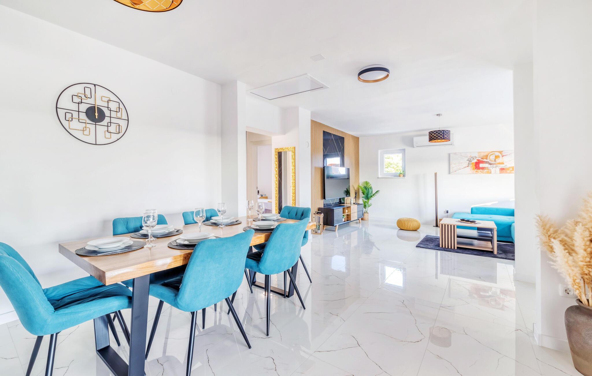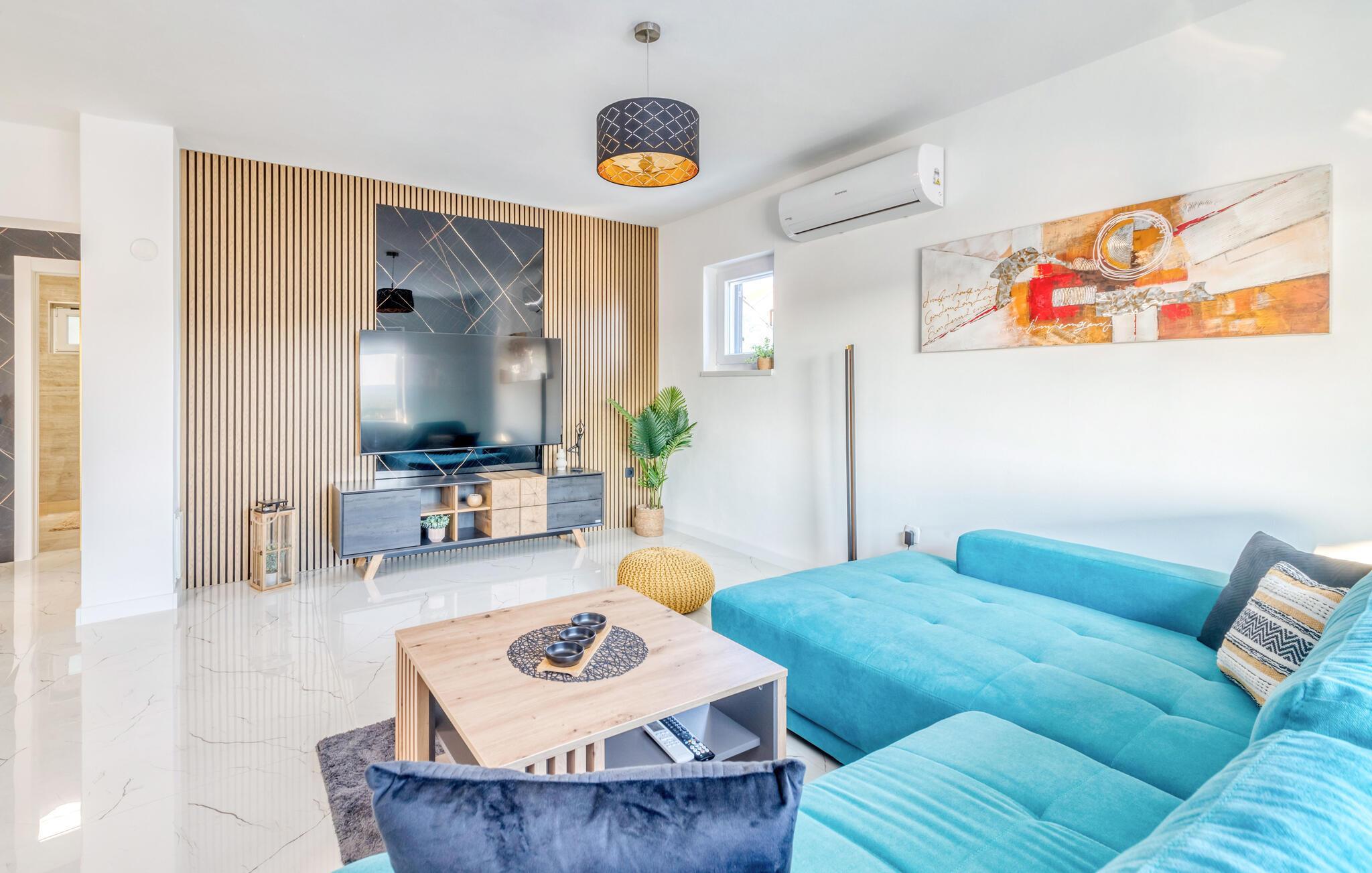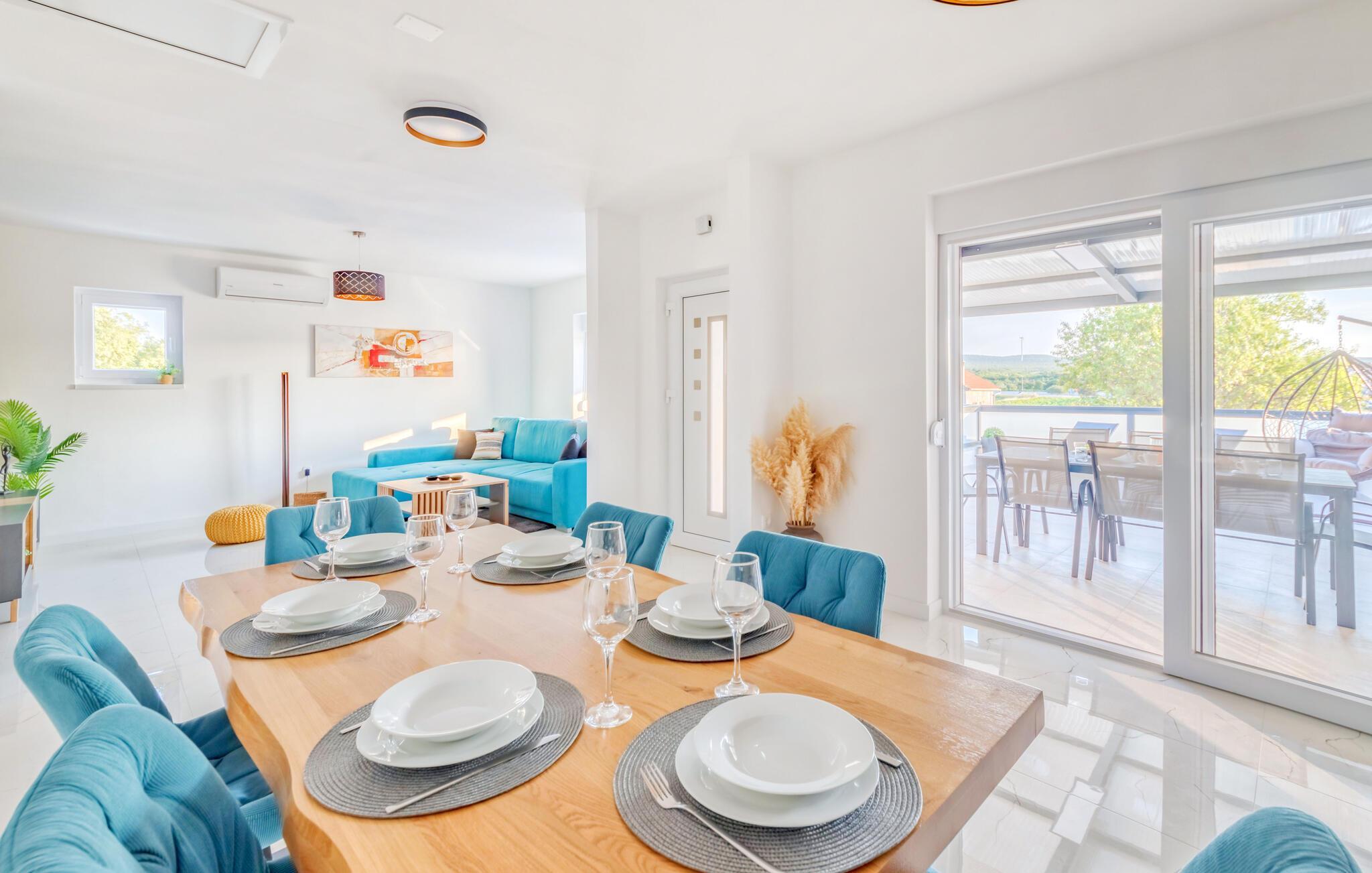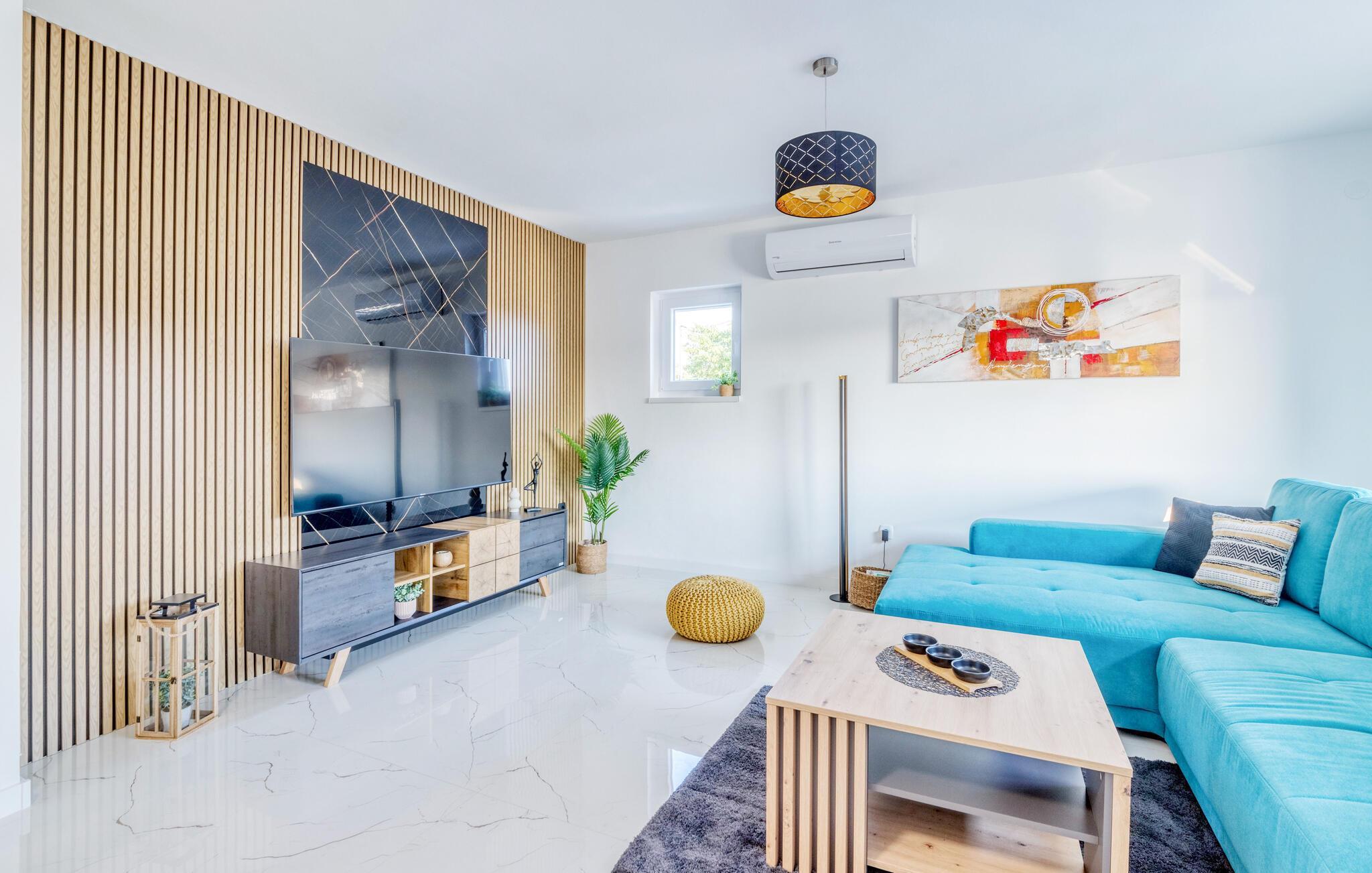 Dette innbydende huset kombinerer stilfull enkelhet med koselig komfort. Store vinduer slipper inn rikelig med lys og skaper en vennlig atmosfære, mens den fargerike sofagruppen innbyr til avslapping og velvære. Lytt til favorittmusikken din, eller slapp av og nyt en serie i strømmemodus. Tilbered deilige måltider på det moderne kjøkkenet, som kan avrundes med et godt glass kroatisk vin.