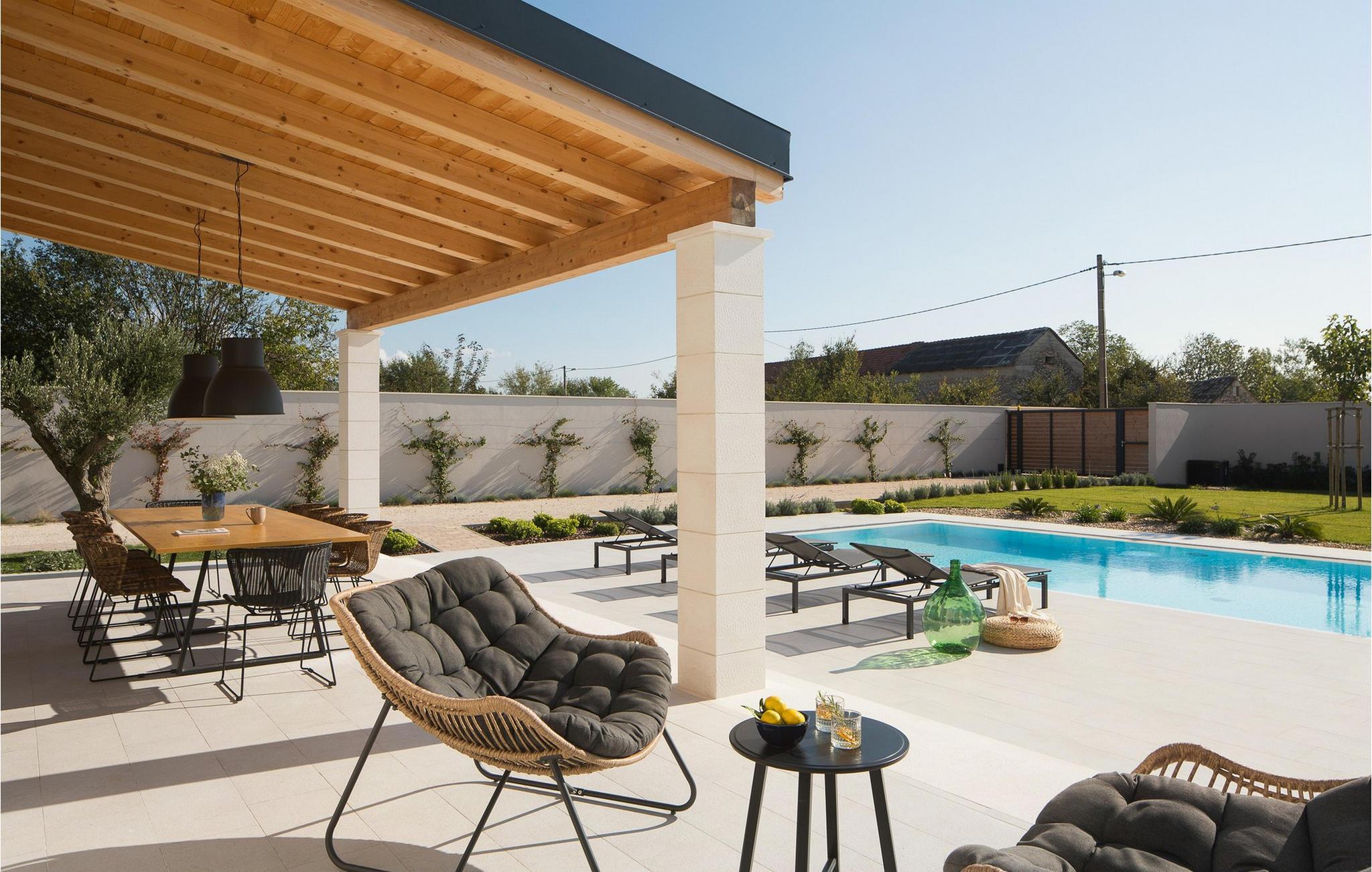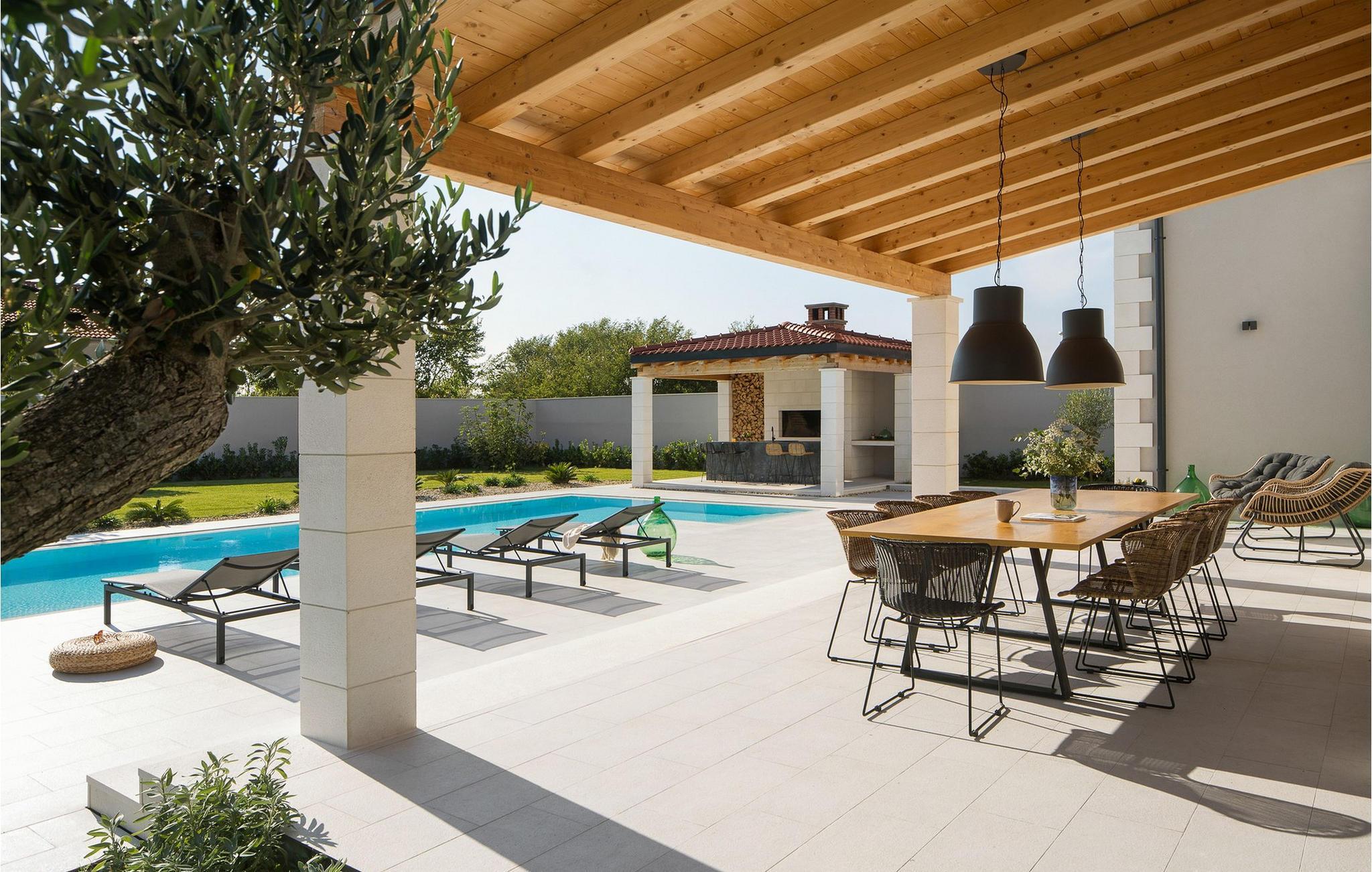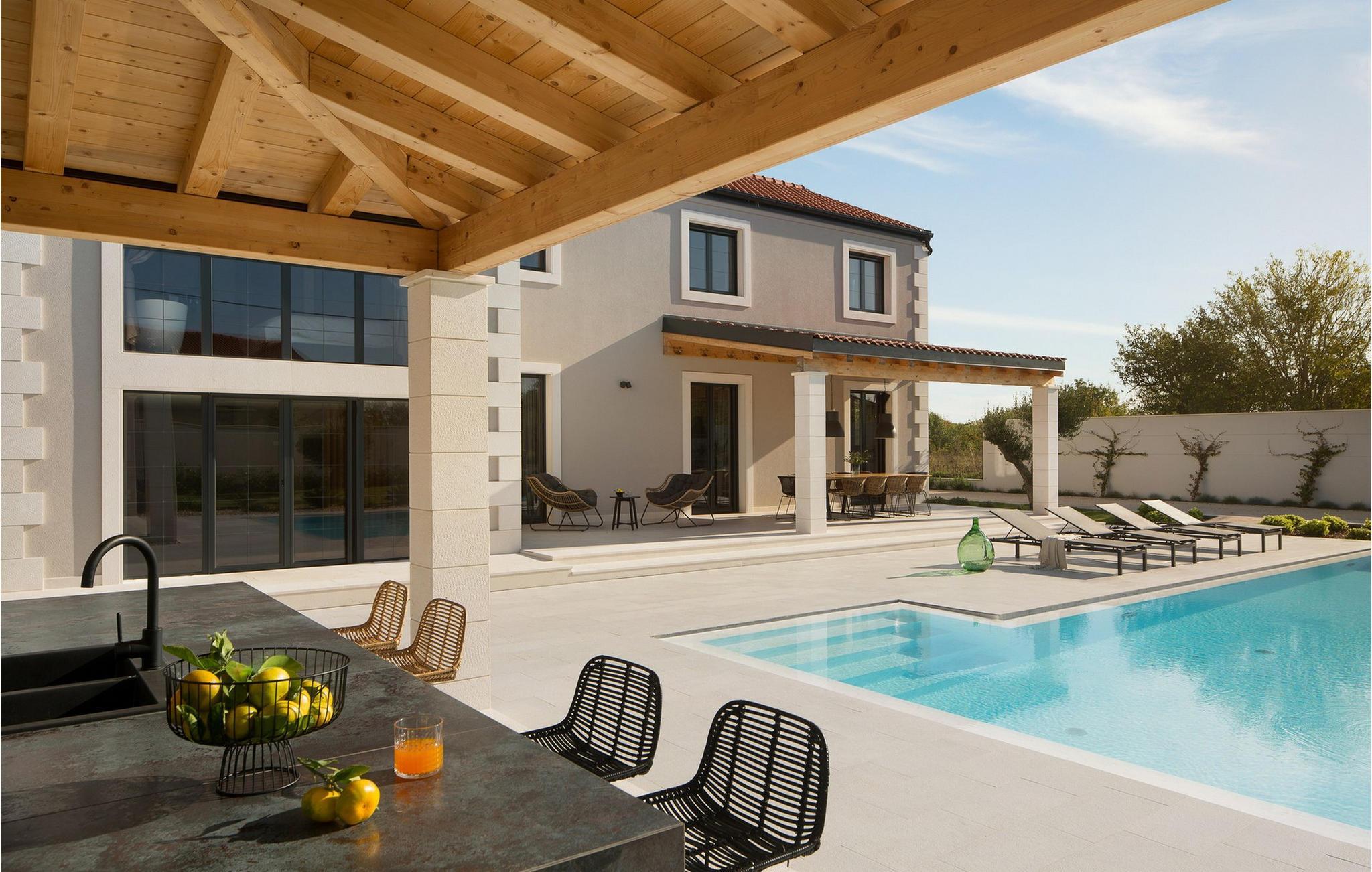 Akkurat som det kjærlig innredede interiøret er også det elegante uteområdet designet for avslapning. Beundre den spektakulære utsikten over de storslåtte Velebit-fjellene fra den store terrassen i øverste etasje. Det store evighetsbassenget, som er oppvarmet om vinteren, er også et høydepunkt året rundt. Nyt den fredelige atmosfæren i middelhavshagen på de komfortable solsengene, og bruk sommerkjøkkenet til koselige grillfester etter en solrik dag ved sjøen.
