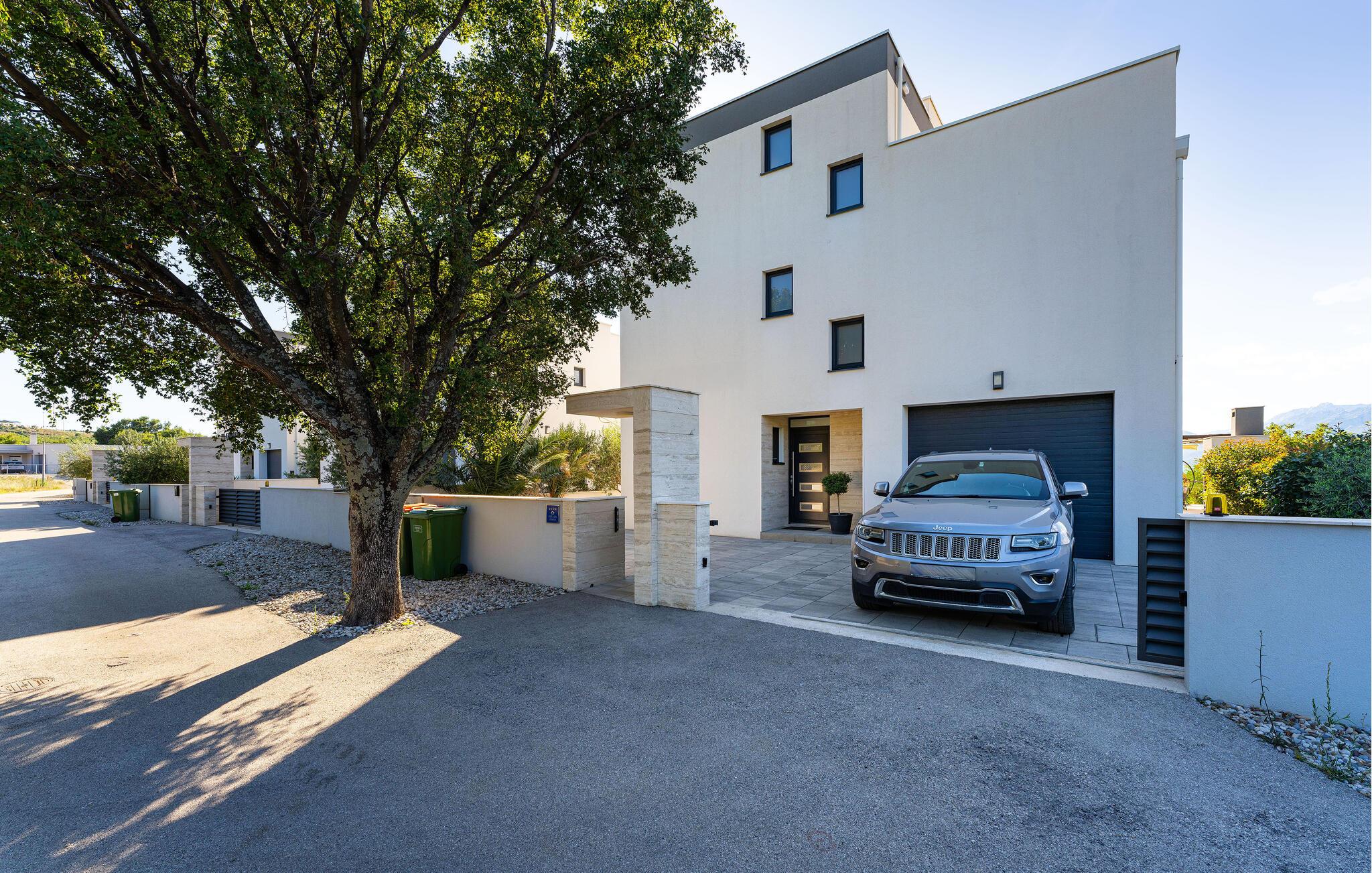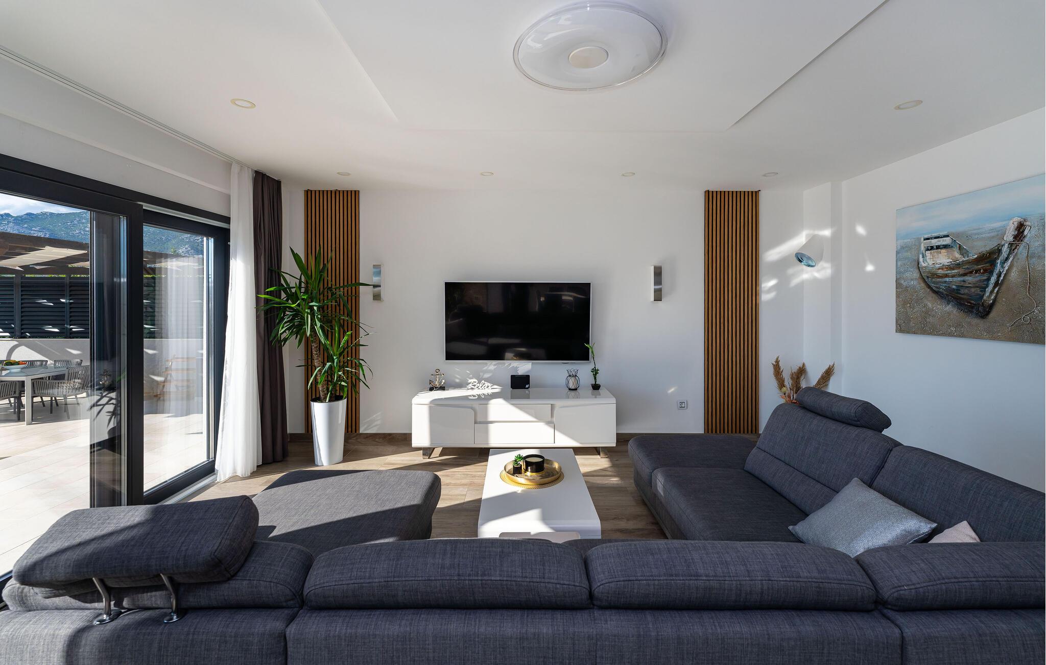 Den luksuriøse Villa Carpe Diem i Rovanjska, som ligger mellom de majestetiske Velebit-fjellene og Adriaterhavet, er det perfekte tilfluktsstedet for en avslappende ferie. Fra den solfylte stuen i første etasje, som harmonerer med det moderne kjøkkenet og spisestuen, kan du nyte en elegant, åpen planløsning. Ovenpå finner du soverom med havutsikt som inviterer deg til å slappe av. Villaen har mange sittegrupper, en takterrasse med salong og en romslig hage med basseng og solsenger. Her kan du slappe av og forfriske deg i vannet. En kullgrill og et utendørs spisebord er tilgjengelig for koselige kvelder. Barna dine vil glede seg over lekeplassen, mens du kan være aktiv med biljard, dart eller på tredemøllen.