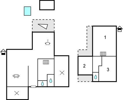 Den består av to etasjer forbundet med innvendige trapper. Første etasje har kjøkken, stue, bad og toalett, og øverste etasje har 3 soverom og et bad.
