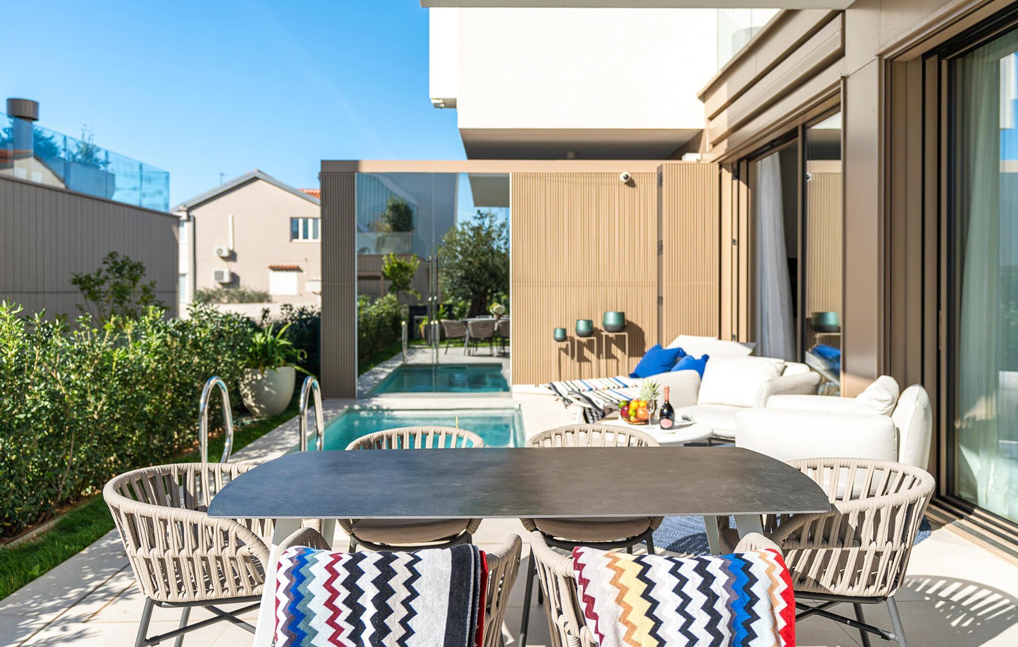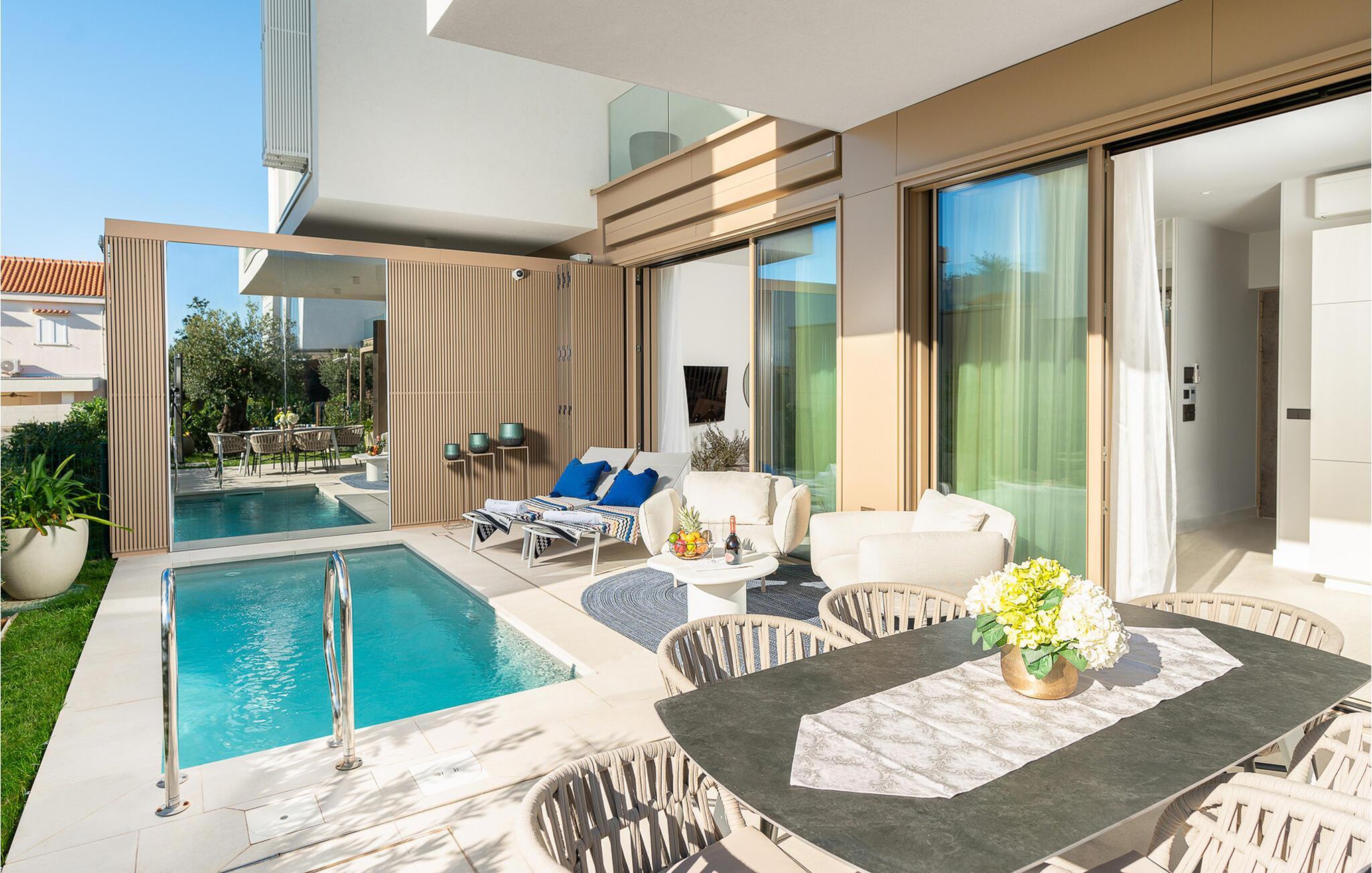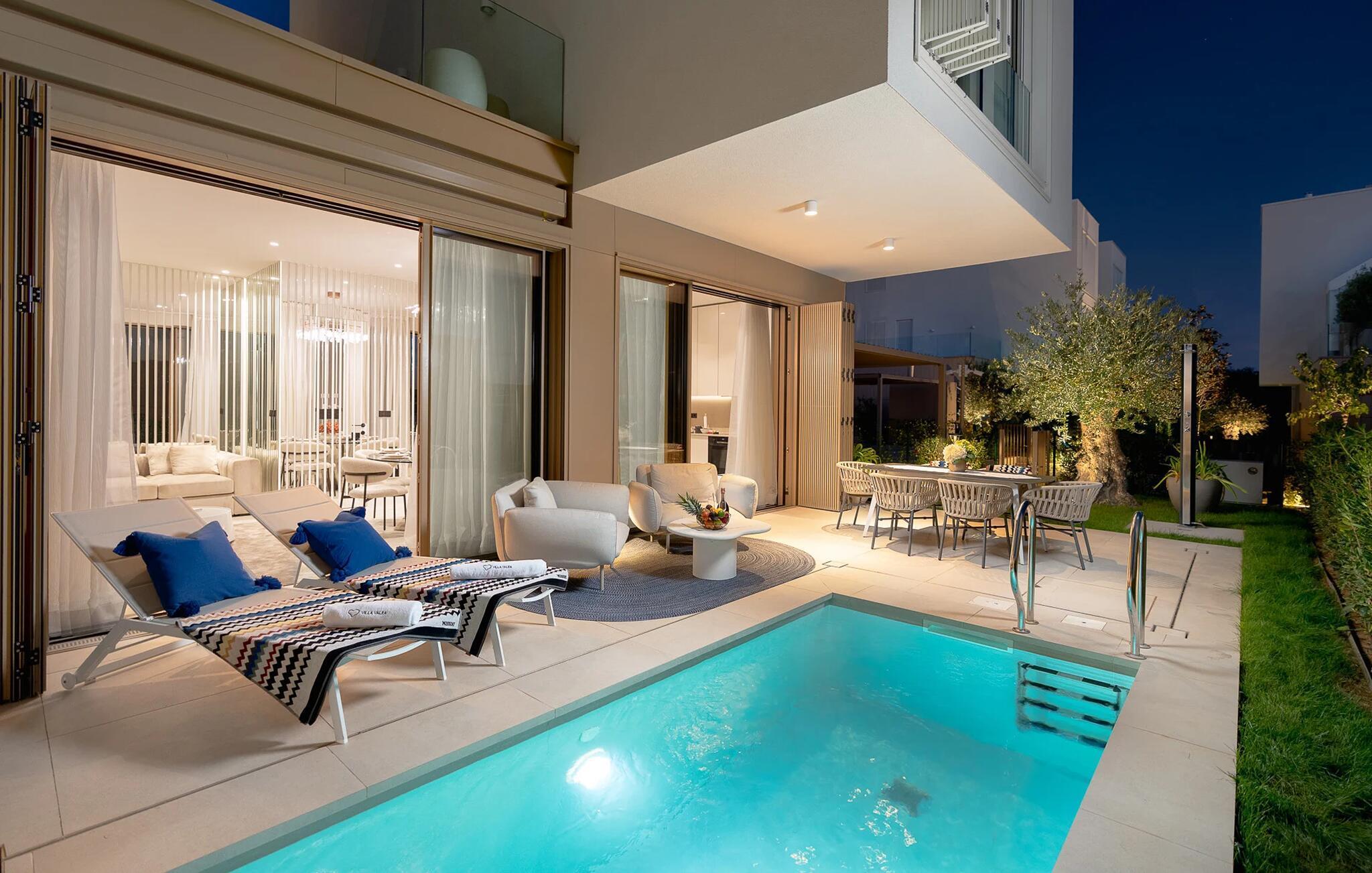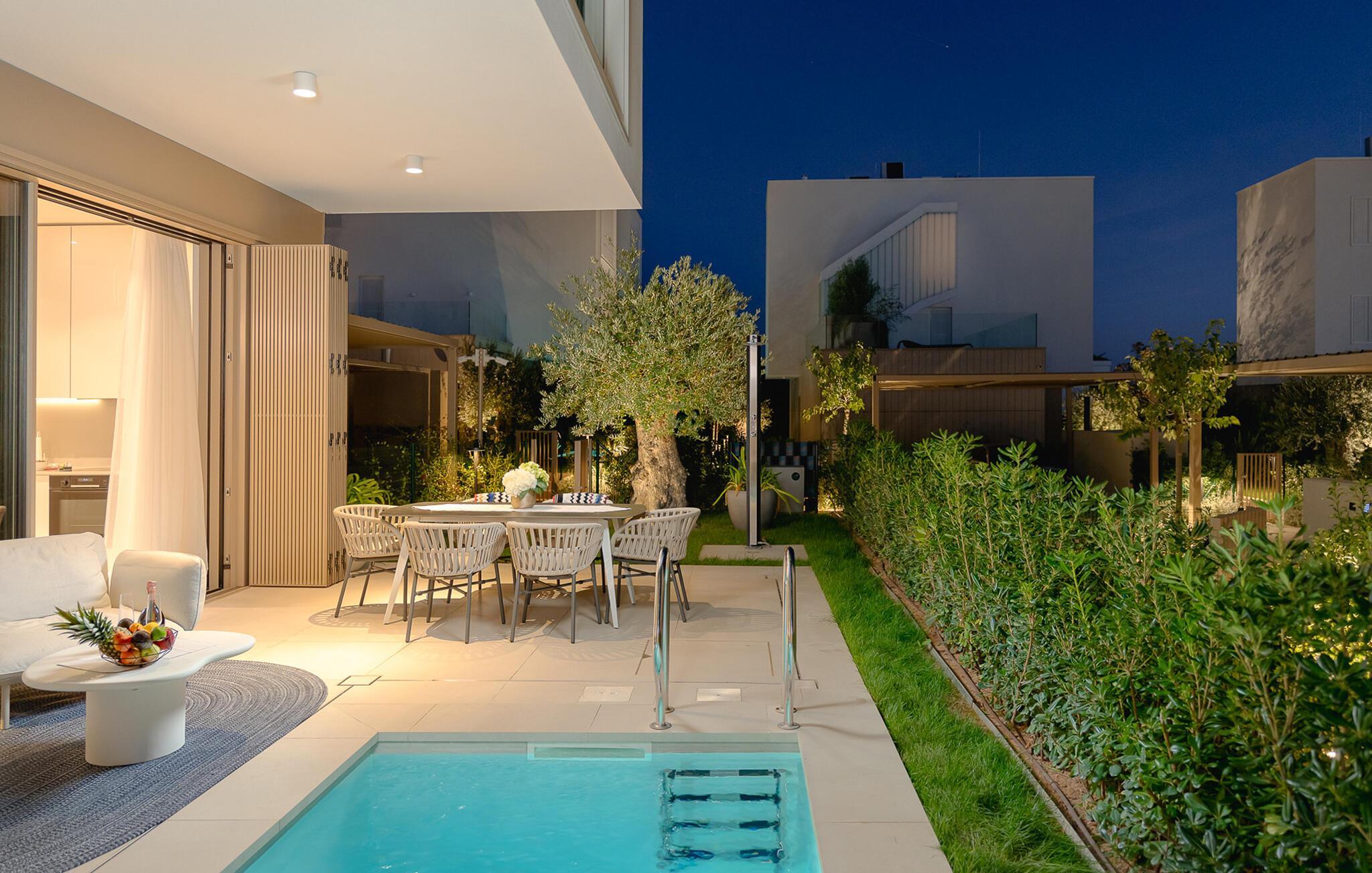 Den solfylte terrassen med komfortable solsenger og innbydende sitteplasser forvandles til en stemningsfull oase om kvelden. Unn deg en avslappende dukkert i saltvannsbassenget på varme sommerkvelder, stream en film på utendørs-TV-en og slå deg ned ved siden av oliventreet for å prate over en grillmat.
