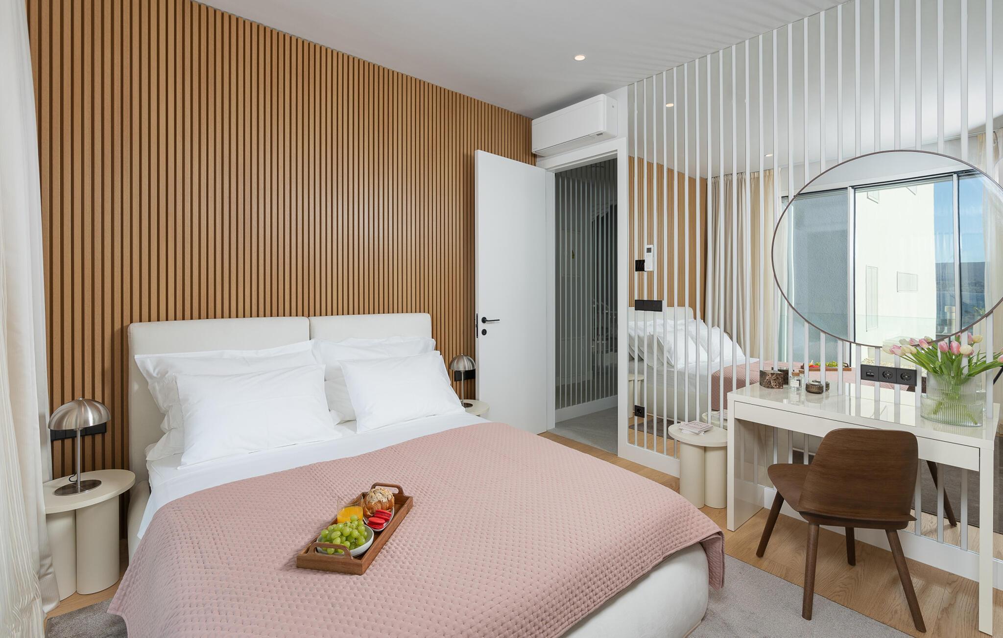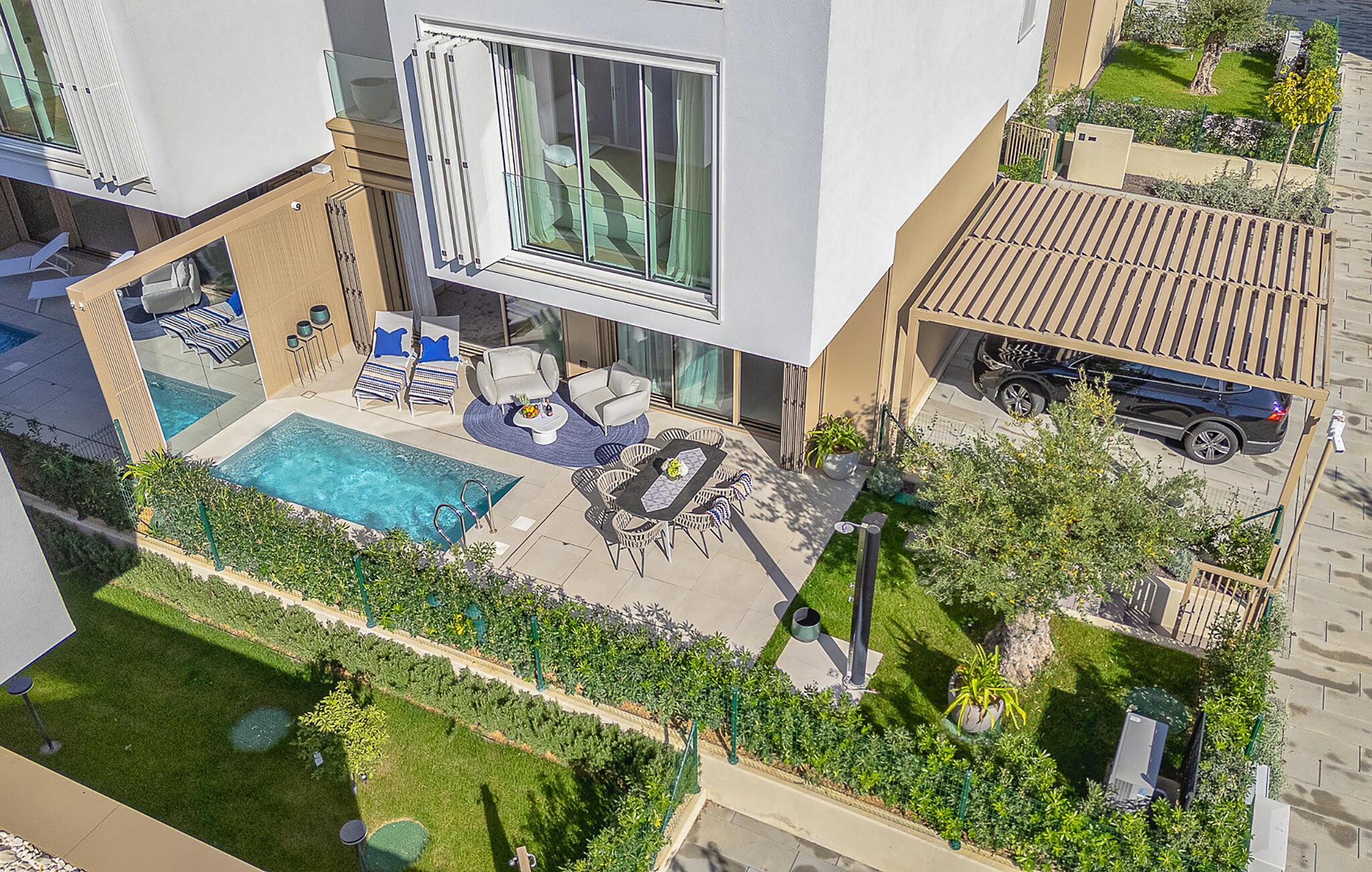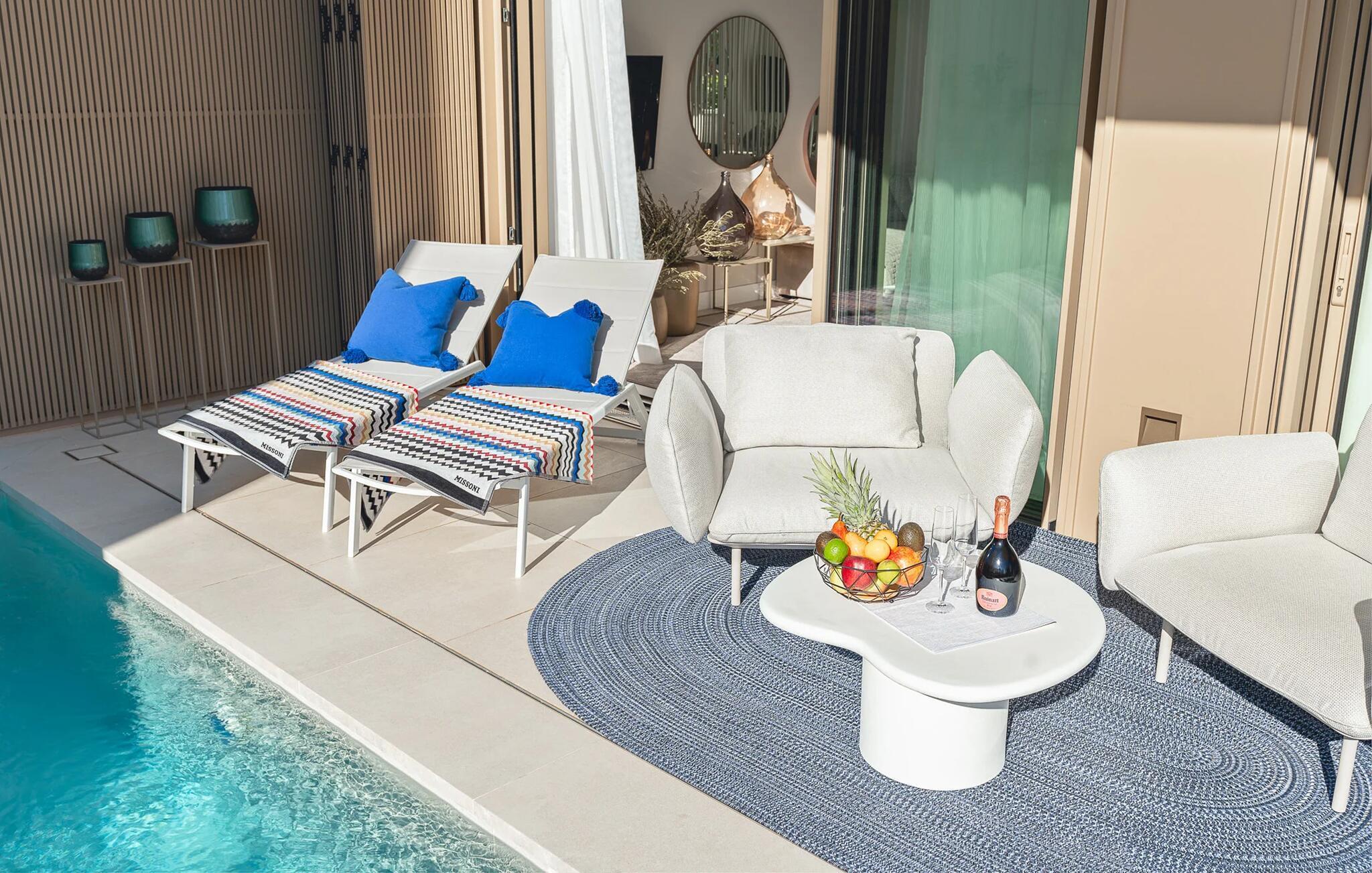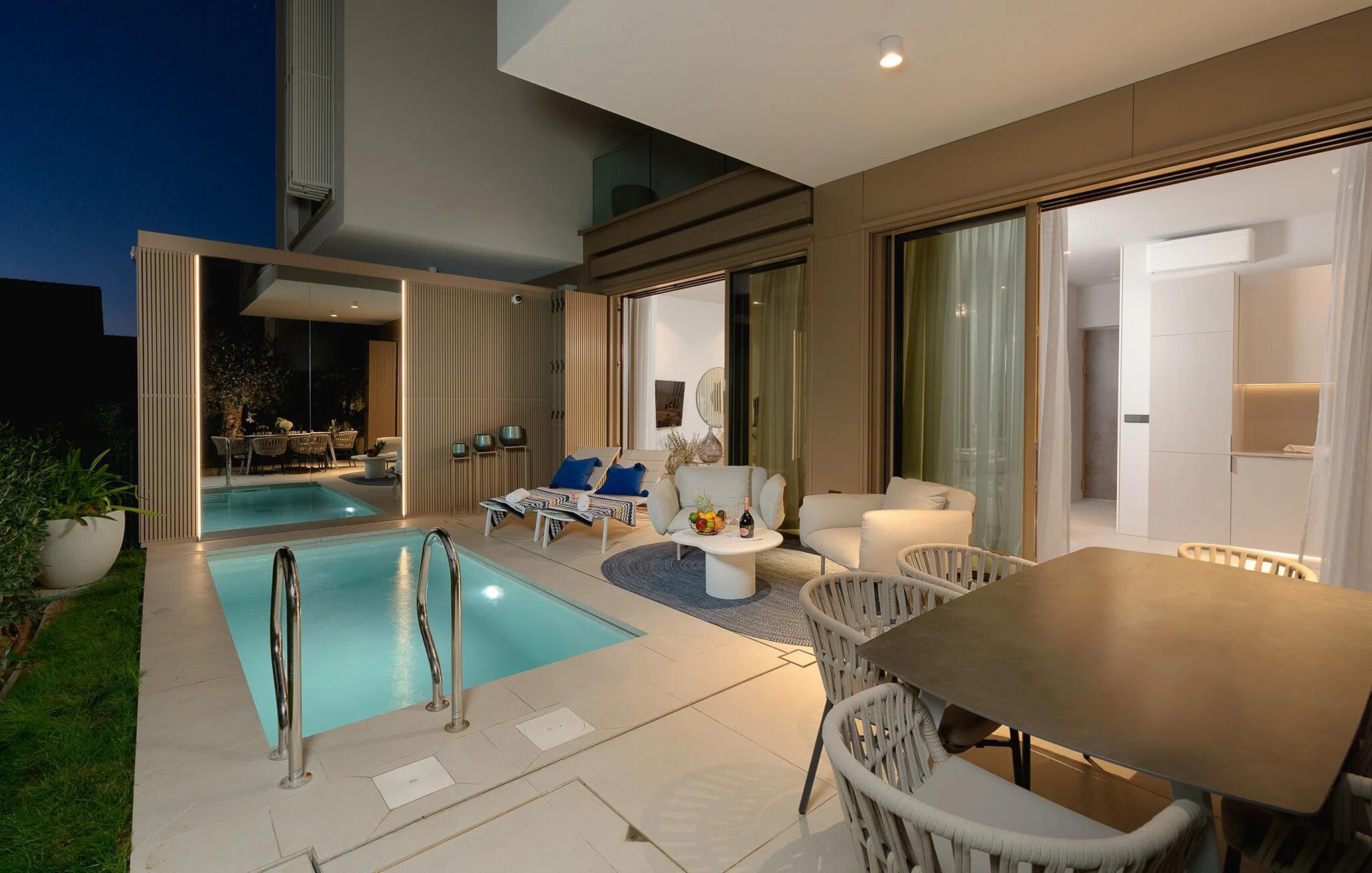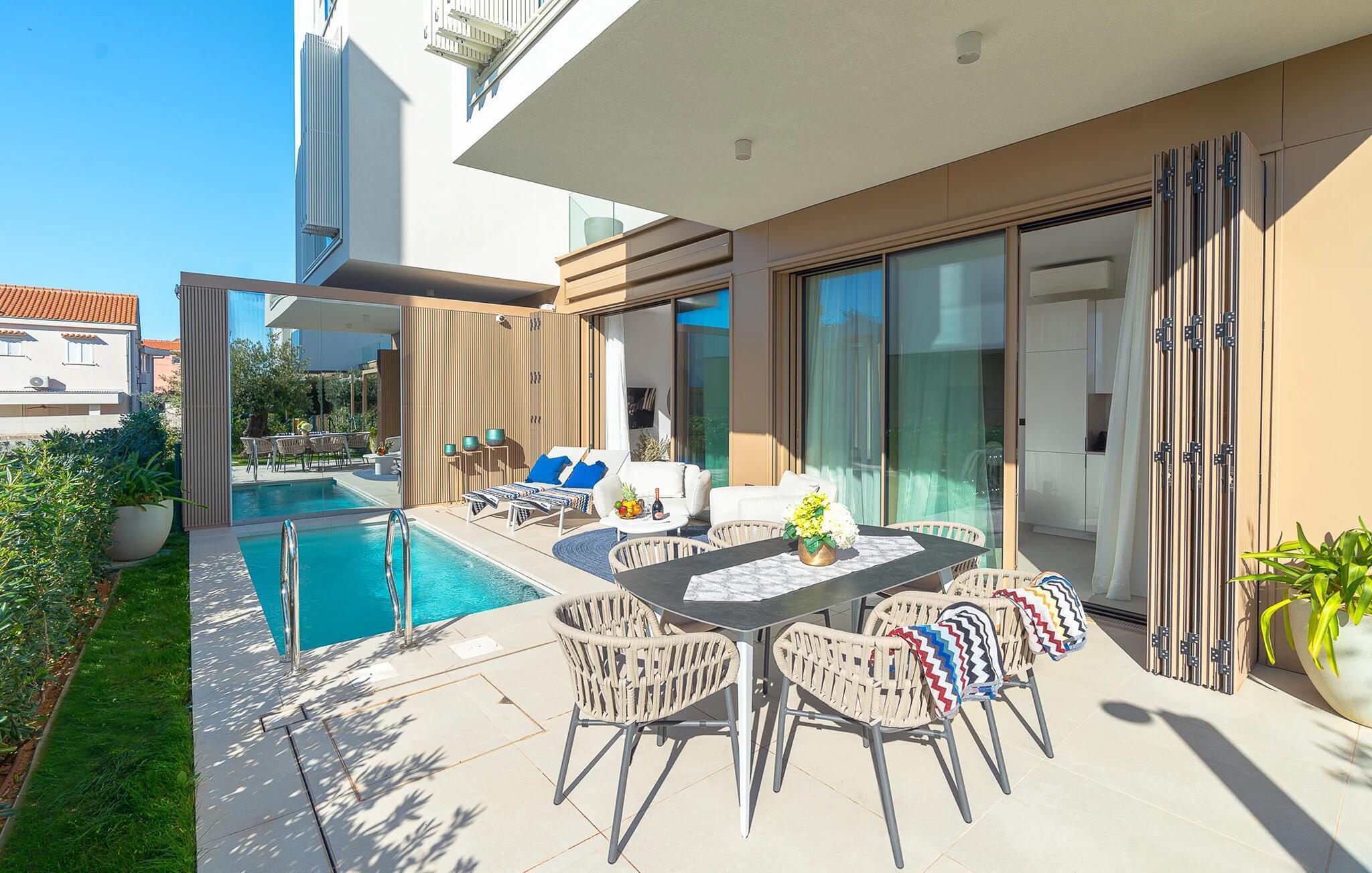 Den solfylte terrassen med komfortable solsenger og innbydende sitteplasser forvandles til en stemningsfull oase om kvelden. Unn deg en avslappende dukkert i saltvannsbassenget på varme sommerkvelder, stream en film på utendørs-TV-en og slå deg ned ved siden av oliventreet for å prate over en grillmat.