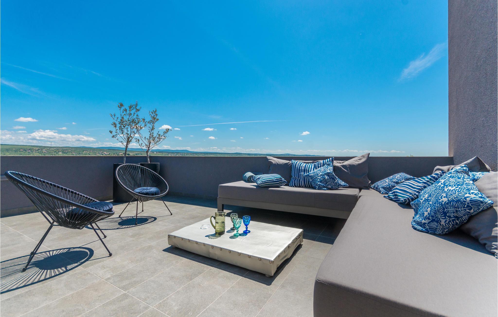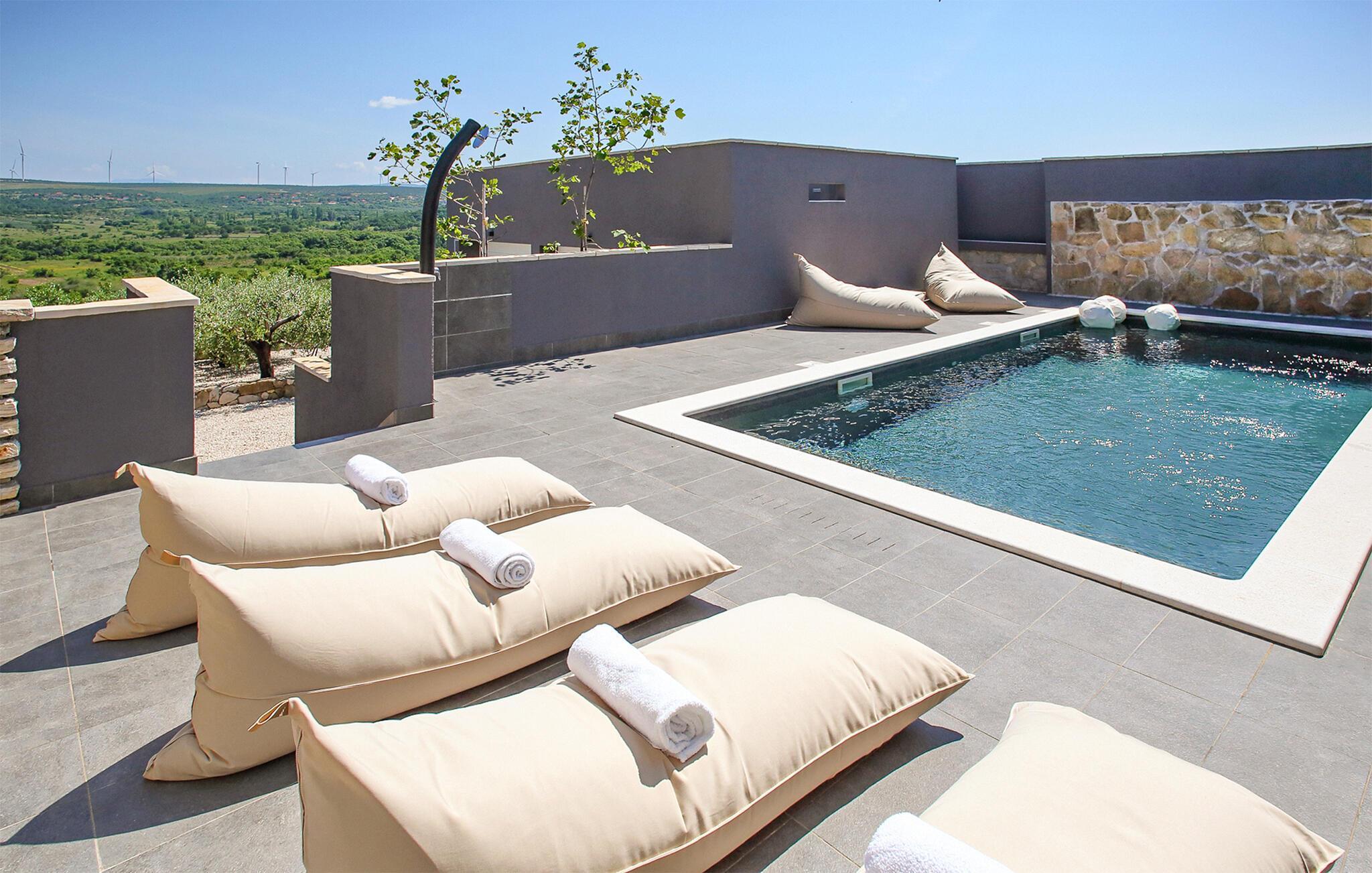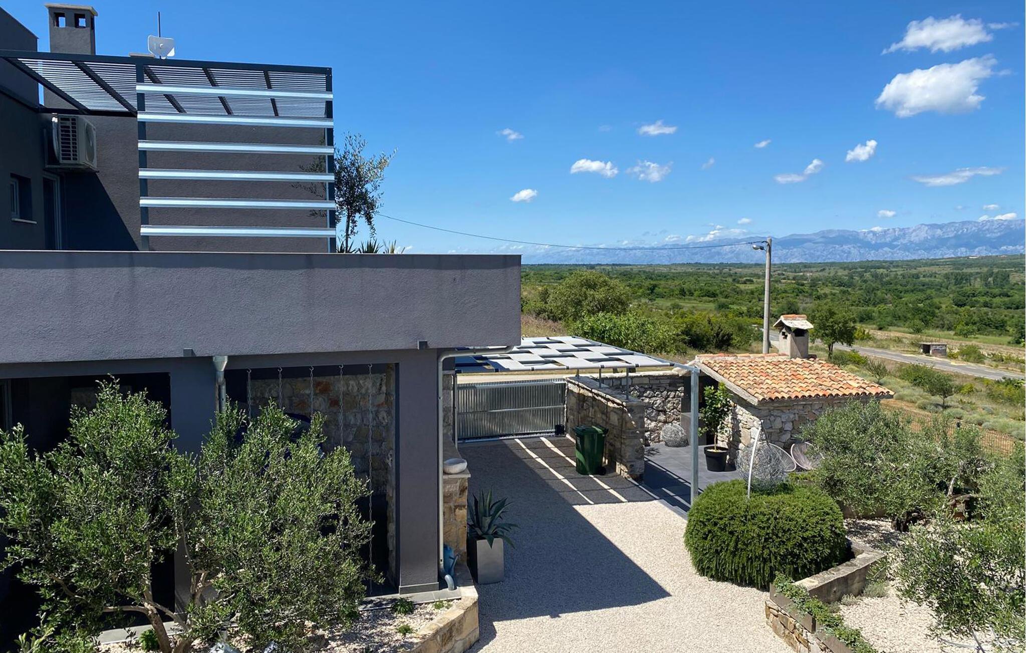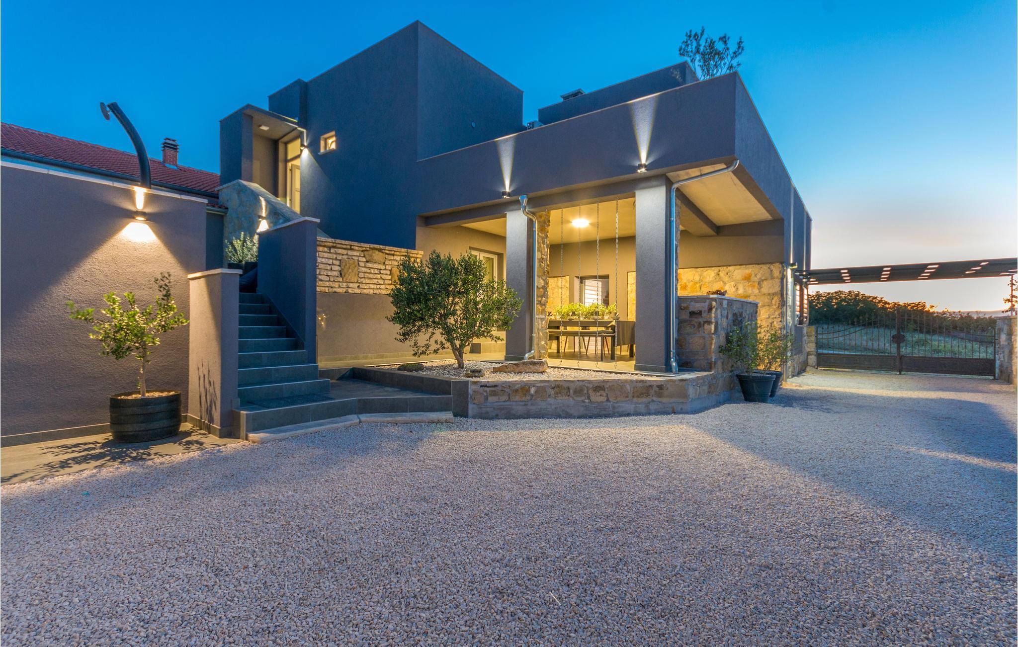 Dette vakre feriehuset ligger i Nadin i nærheten av Zadar. De spesielle detaljene i interiøret er de unike møblene laget av utleier. Bassenget ligger i mellometasjen og er beskyttet mot all utsikt, der kan du slappe av i solen og lese favorittboken din. Den romslige, åpne terrassen har utsikt over det omkringliggende landskapet. Aktive feriegjester vil nyte å utforske omgivelsene med de to syklene som er tilgjengelige. Vi anbefaler deg å smake på de beste vinene i regionen, og ikke gå glipp av å smake på den gullbelønte olivenoljen. Besøk byen Zadar, som er full av historie, men som også begeistrer med sin moderne arkitektur. Opplev en av de vakreste solnedgangene i Europa fra kysten av Zadar.