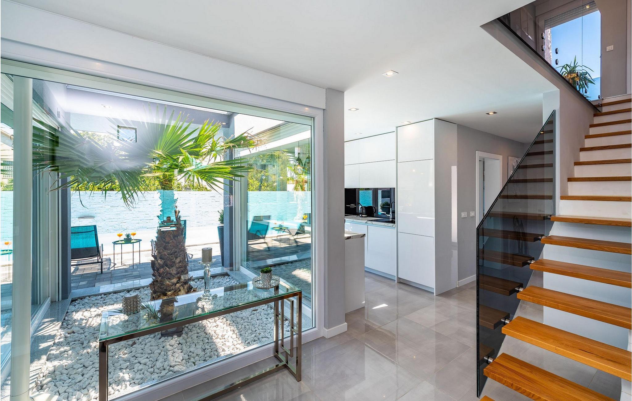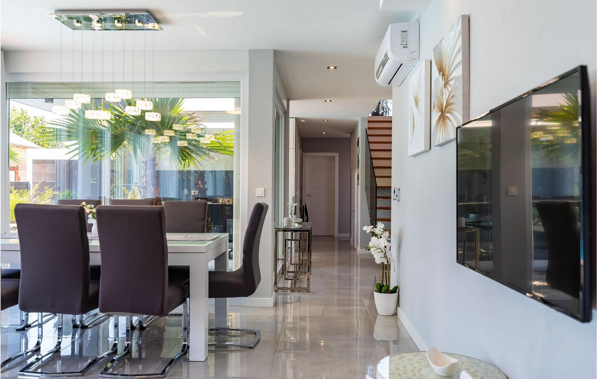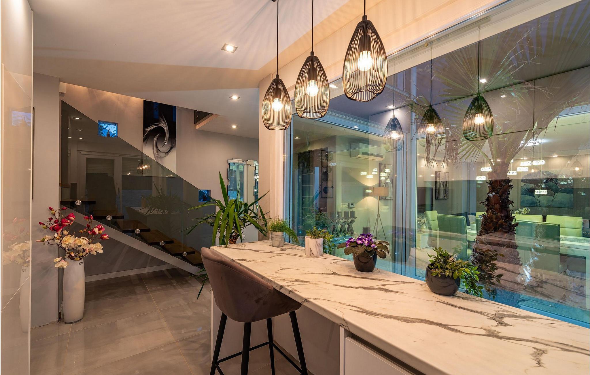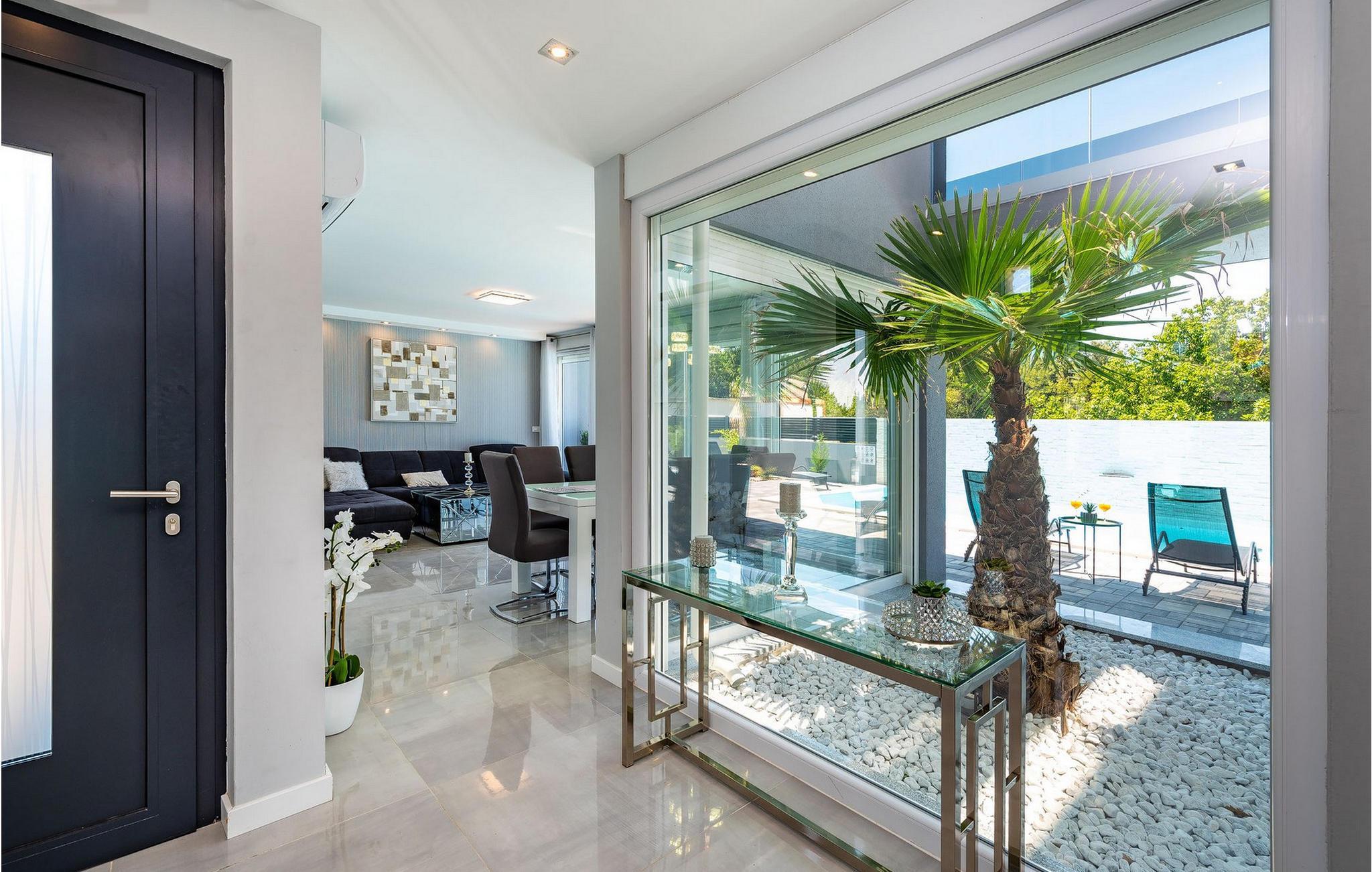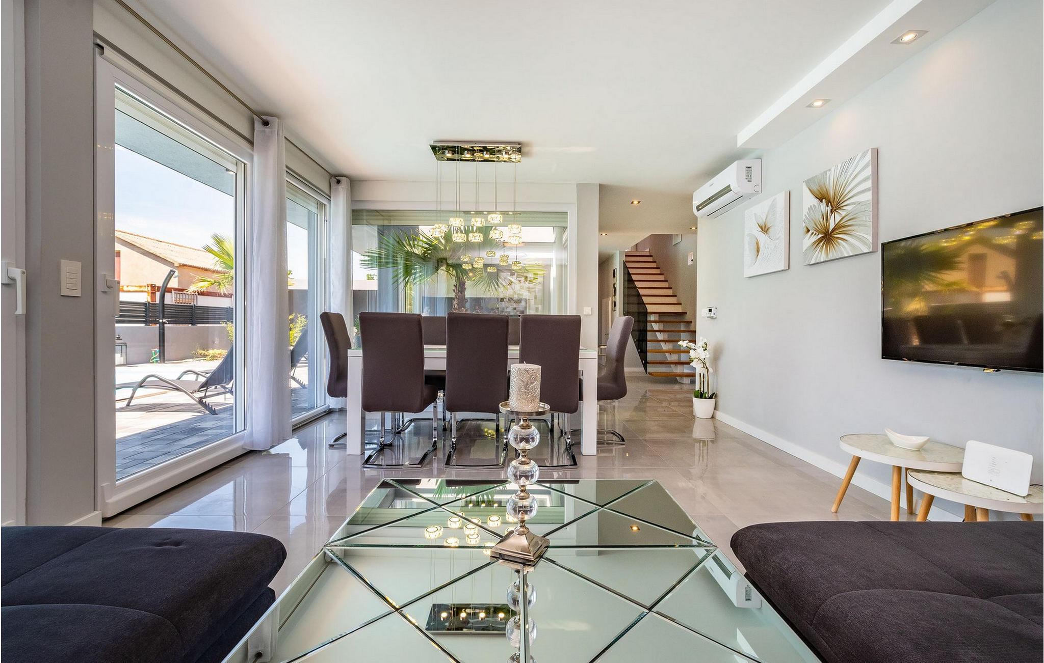 Så snart du kommer inn i Villa Nina Zaton, vil du føle den moderne elegansen og den lyse atmosfæren. Den store, mørke hjørnesofaen innbyr til avslappende filmkvelder, PlayStation og Nintendo Wii, mens salongbordet i glass og stilige veggdekorasjoner gir rommet et sofistikert preg. Spiseplassen med de elegante stolene er det perfekte stedet å sosialisere og nyte utsikten over hagen gjennom de store vinduene. Det åpne, moderne kjøkkenet med sin lyse marmorbenk er det ideelle stedet for å lage mat sammen og tilberede middelhavsspesialiteter.