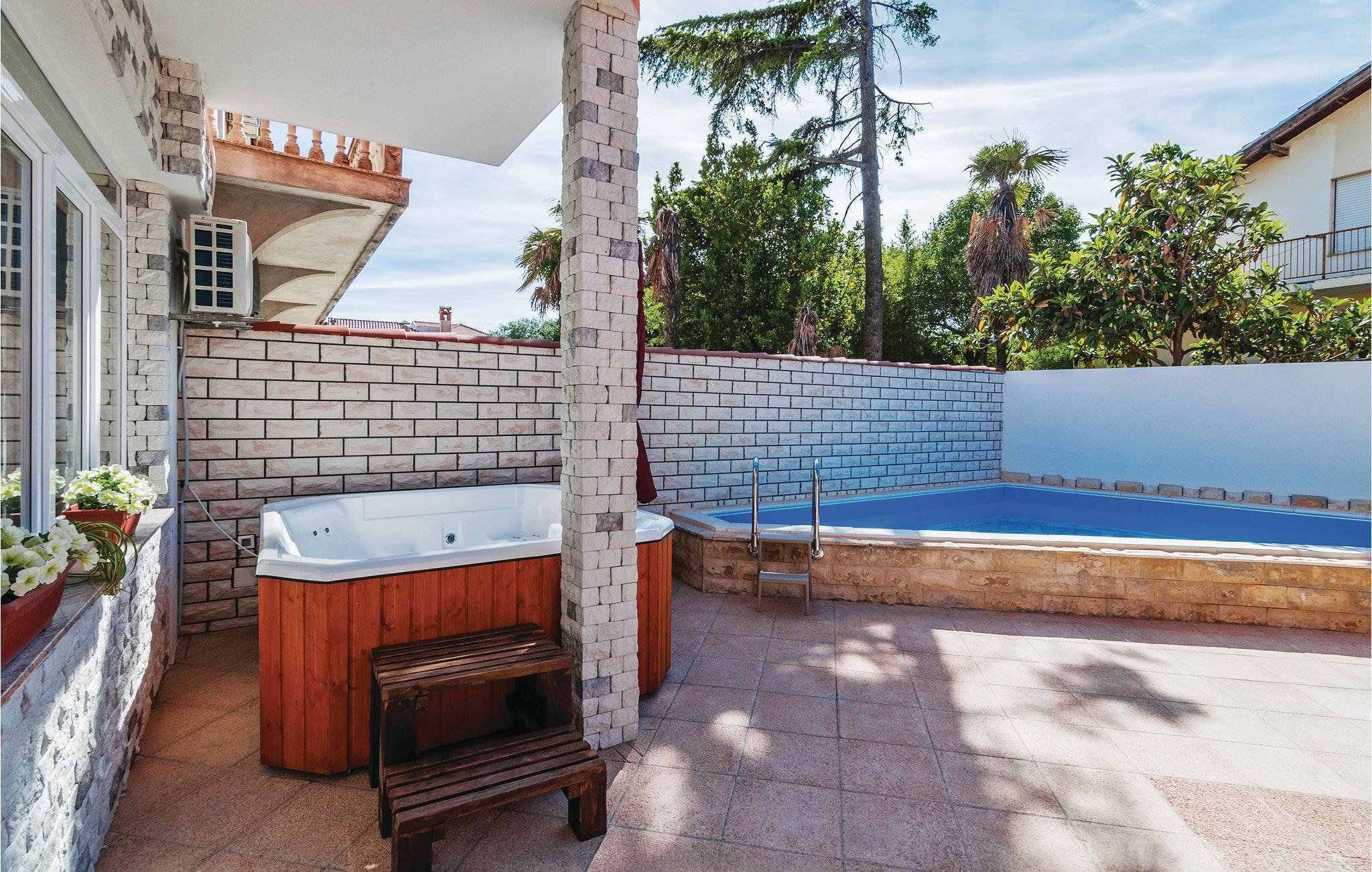 Tilbring en herlig sommerferie i populære Zadar i dette smakfullt innredede feriehuset med basseng. Eiendommen er omgitt av steinmurer og tilbyr sine gjester privatliv. Første etasje består av et komfortabelt kjøkken med spiseplass og bad, mens soverommene ligger i andre etasje. Dart, biljard og Nintendo Wii sørger for at det aldri blir et kjedelig øyeblikk. Velværefasilitetene omfatter et utendørsbasseng, et boblebad for seks personer og en finsk badstue. På grunn av sin nærhet til Zadars sentrum og strender har huset en meget god beliggenhet. I Zadar kan du oppleve kunst og kultur sammen med utmerket mat. Nasjonalparkene Kornati og Paklenca og naturparken Telaica er også vel verdt et besøk.