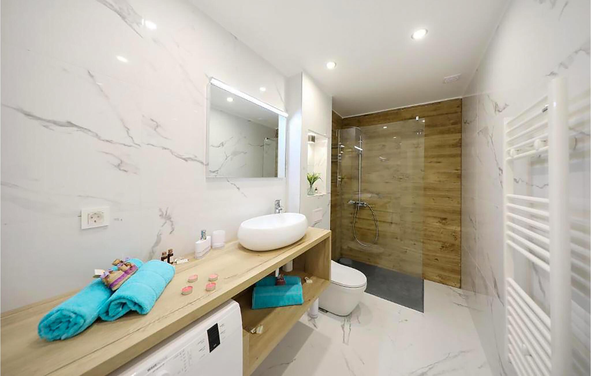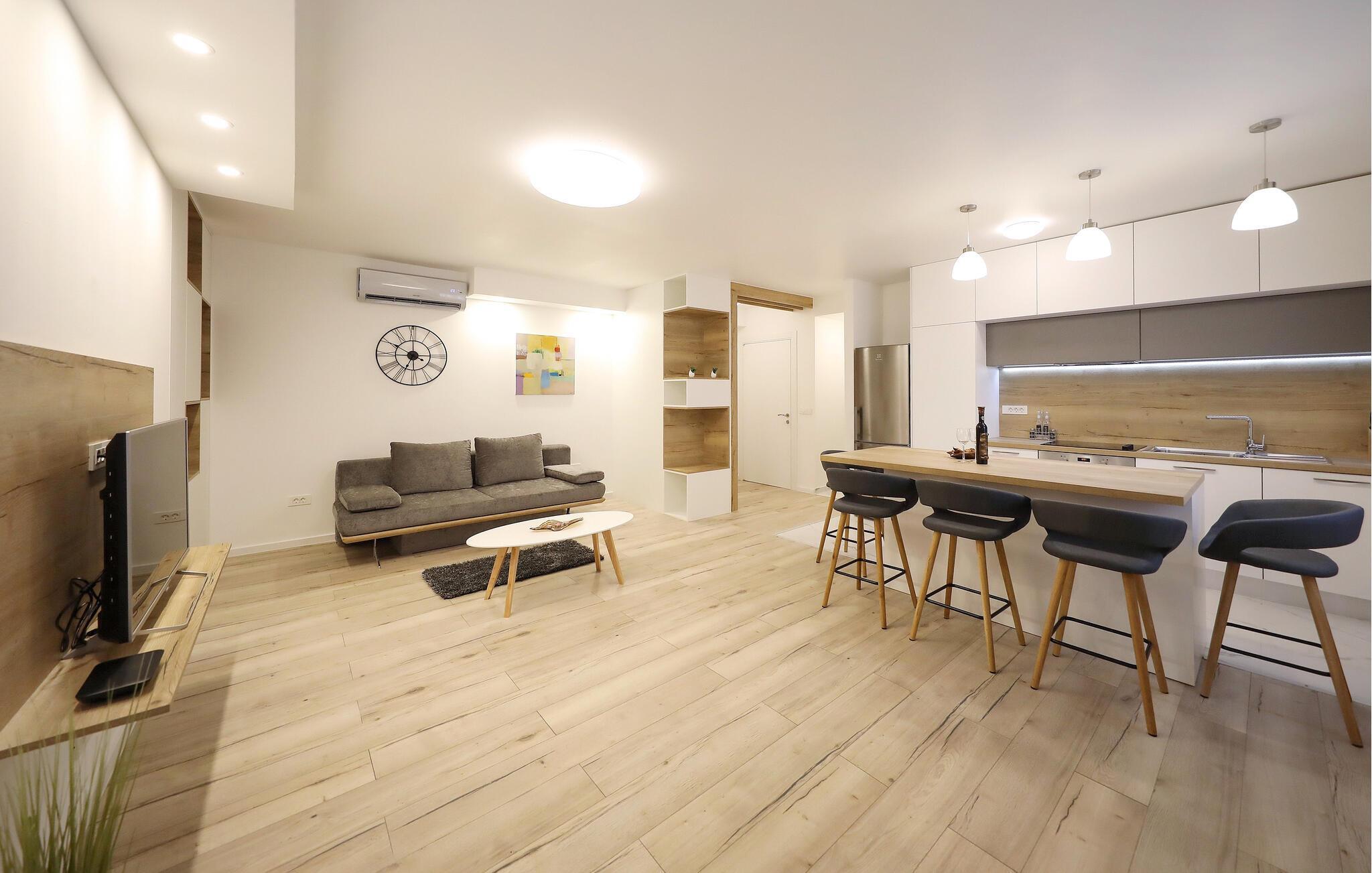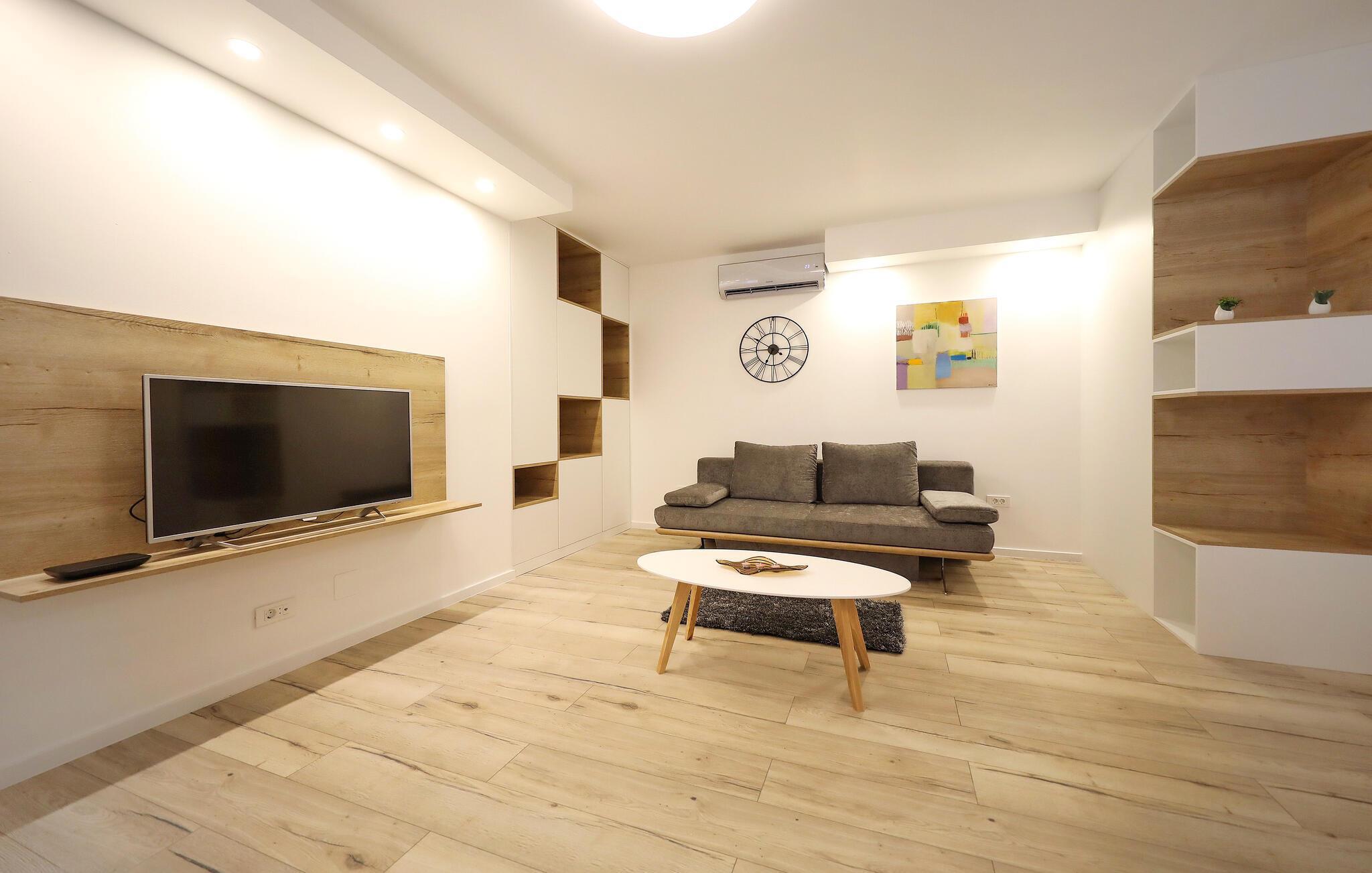 Denne komfortable ferieleiligheten av høy kvalitet ønsker deg velkommen med en hyggelig atmosfære og inviterer deg til å tilbringe harmoniske dager i det smakfullt møblerte interiøret. Her kan du tilberede kulinariske herligheter, planlegge aktivitetene dine i det åpne oppholdsrommet og sette deg godt til rette i sofaen etter en lang dag for å se en spennende film.