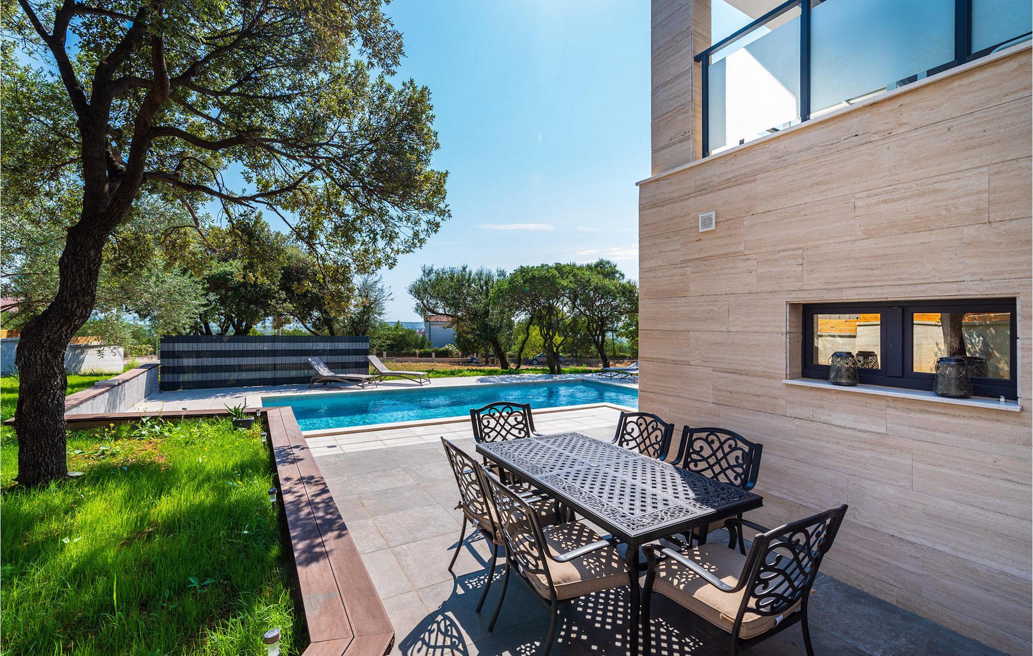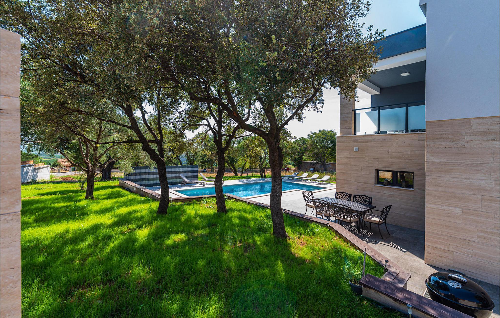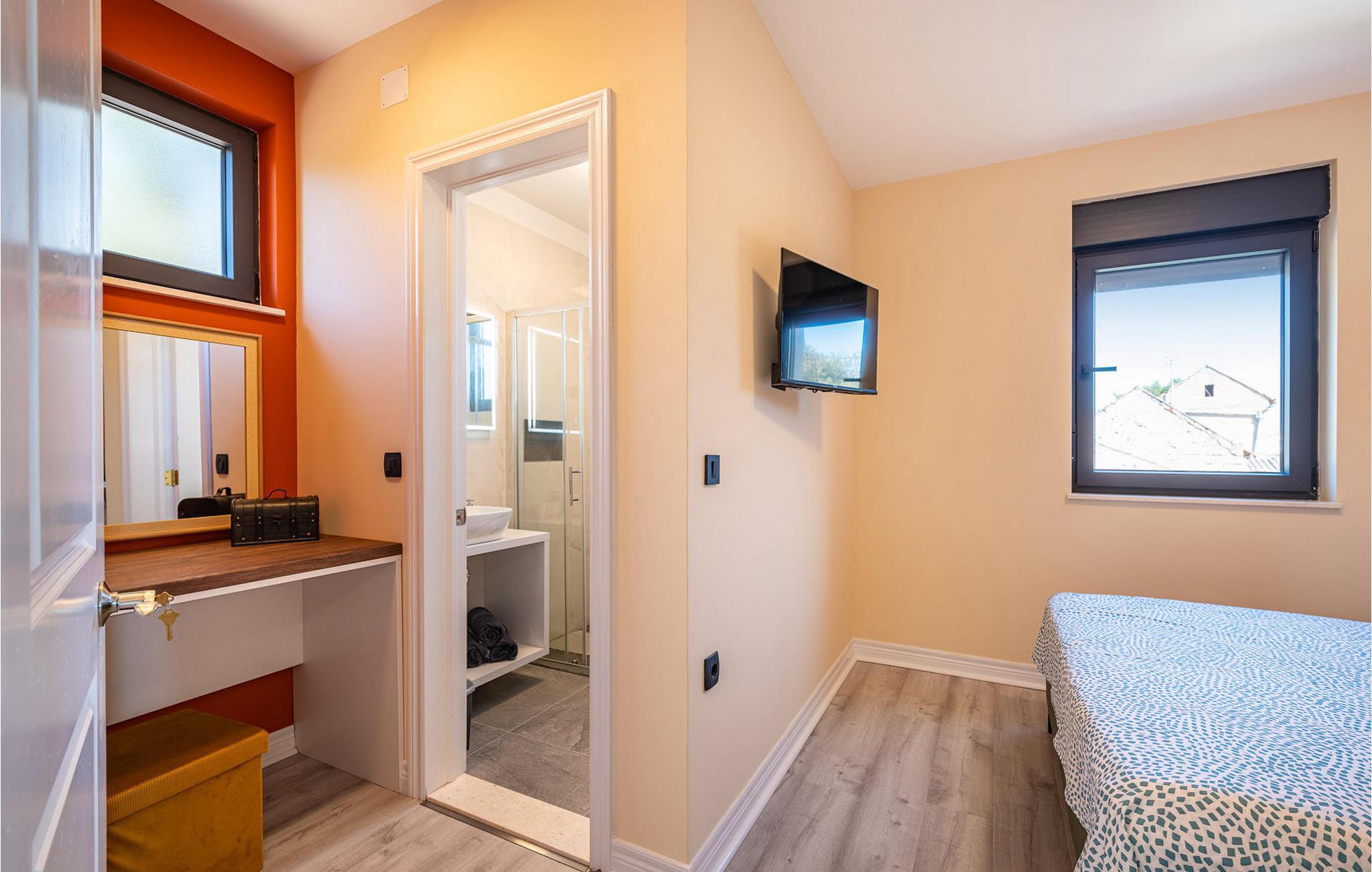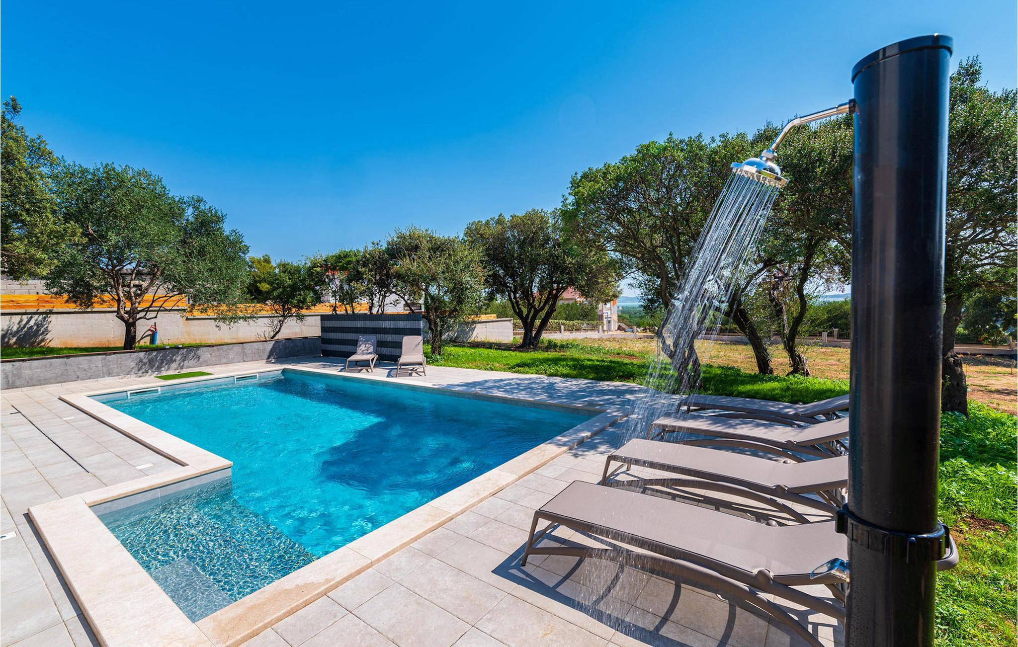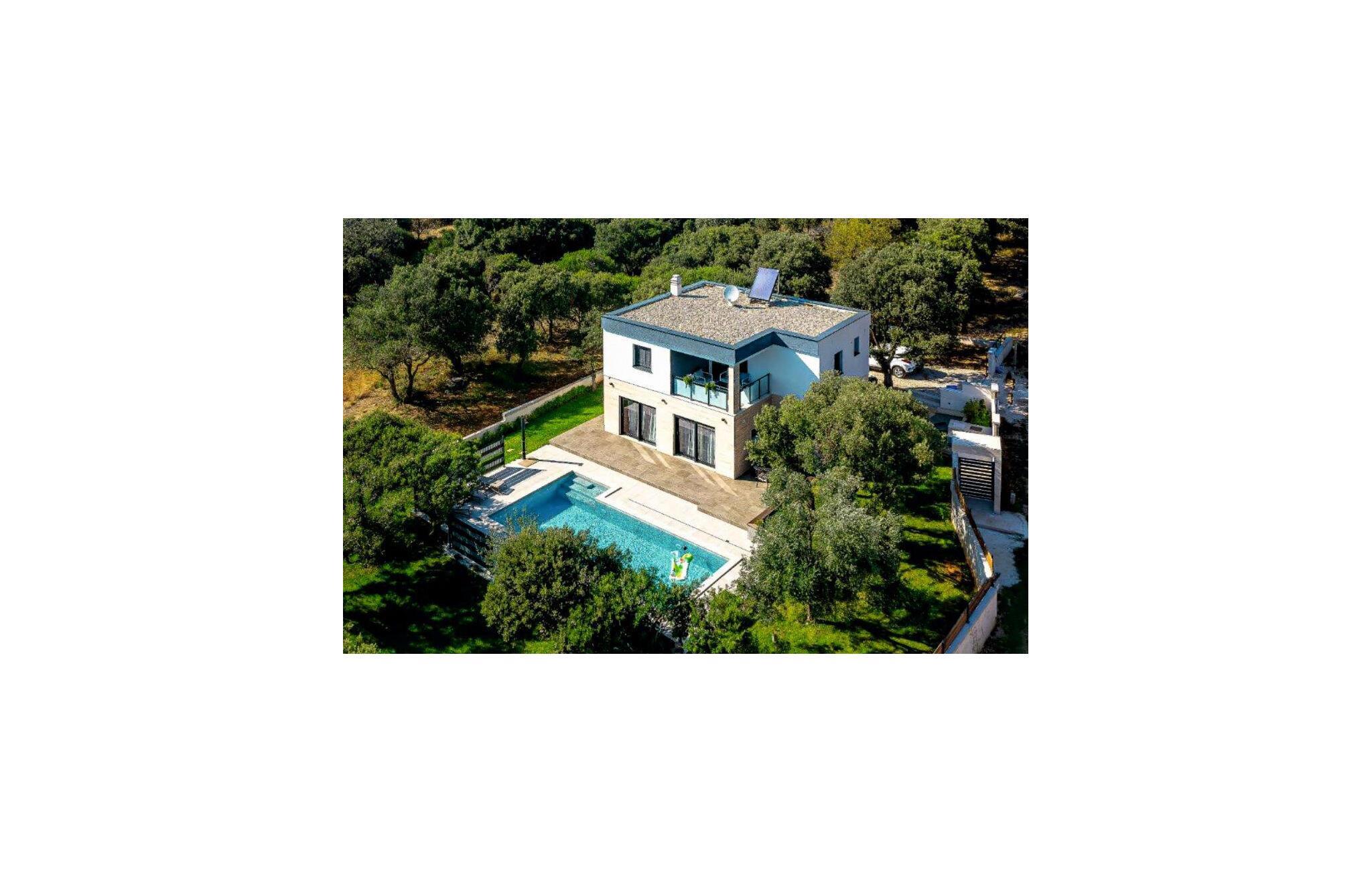 Villa Krstina ønsker deg velkommen til en vakker hage med en grønn plen der barna kan boltre seg før de hopper i det forfriskende private bassenget. Rundt bassenget kan du nyte solen på 6 solsenger. Flere trær sørger for skyggefulle steder på plenen der du kan slappe av. Ved siden av villaen står et spisebord for opptil 6 personer, perfekt for en herlig lunsj i det fri med utsikt over det glitrende bassenget. Inne i villaen flommer stuen med TV over av naturlig lys, og det samme gjør kjøkkenet og spisestuen i samme rom, takket være de store terrassedørene. Spiseplassen for opptil 8 personer ligger rett ved siden av en av de store glassdørene og har utsikt over gårdsplassen. Et av badene ligger også i første etasje. I andre etasje er det tre komfortable soverom med dobbeltseng og ytterligere to bad. Balkongen med egen sittegruppe er perfekt for å nyte morgenkaffen eller se på solnedgangen sammen. Villa Krstina er et godt valg for en morsom familieferie i Dalmatia. Villa Krstina ligger i Vrana, 7 km fra stranden og bare 1 km fra nærmeste butikk, restaurant og kafé. I naturparken Vrana Lake Nature Park kan du gå turer i den vakre naturen. Det finnes 95 lovbeskyttede arter i parkområdet. Det gamle sentrum av Vrana ble bygget i middelalderen i umiddelbar nærhet av innsjøen. Bare 8 kilometer fra villaen kan du besøke et morsomt badeland for deg og barna dine. Byen Zadar, ca. 45 minutter unna, er et fantastisk reisemål for en dagstur med familien. Byen er kjent for sine romerske og venetianske ruiner. Det finnes flere venetianske porter i bymuren. Du kan besøke en rekke kirker fra ulike århundrer og beundre kunsten og arkitekturen. En unik attraksjon som du ikke må gå glipp av, og som Zadar er kjent for, er Havorgelet. Denne strukturen består av trappetrinn langs kysten som spiller en melodi avhengig av hvordan bølgene treffer dem. En av de nyeste attraksjonene i byen er glassmuseet. Det inneholder en av de beste samlingene av romersk glass utenfor Italia, med blant annet beger, kanner og kolber fra arkeologiske funnsteder i Dalmatia.