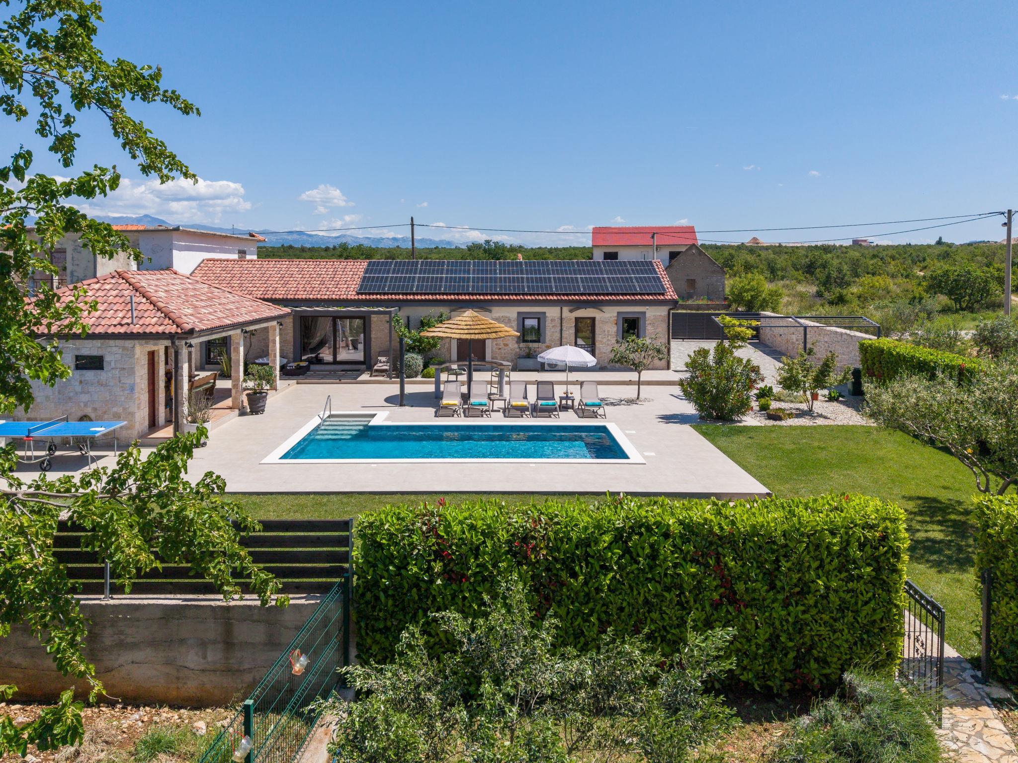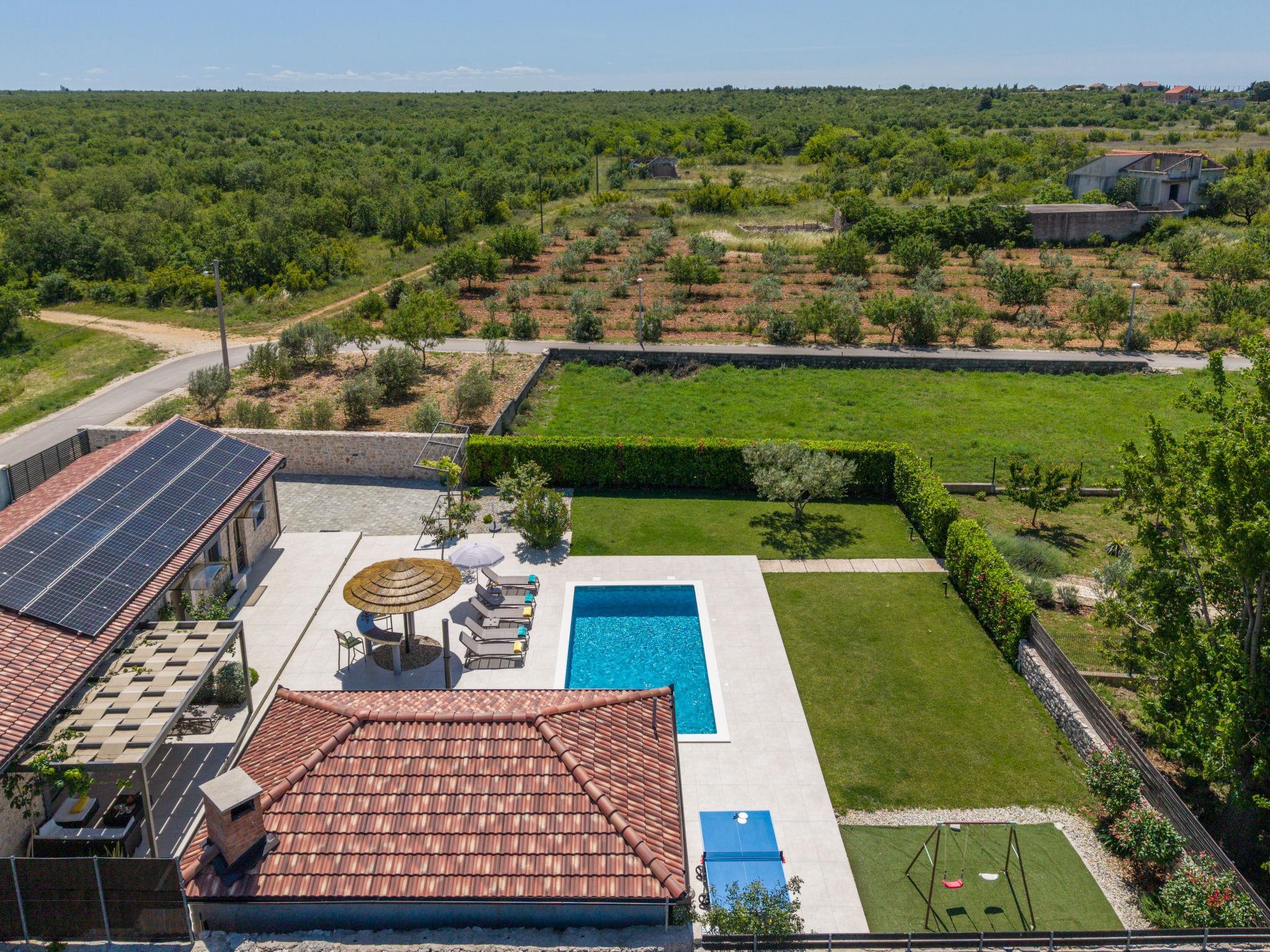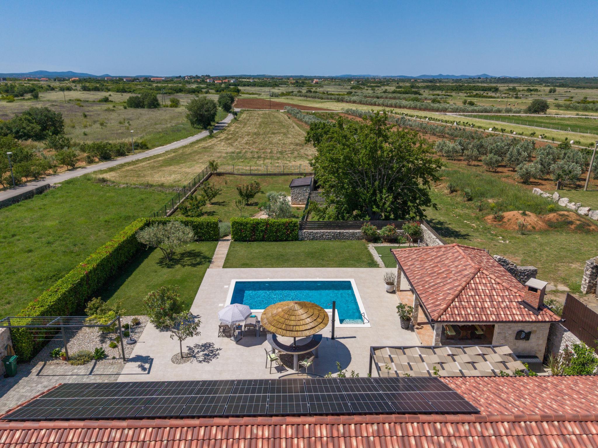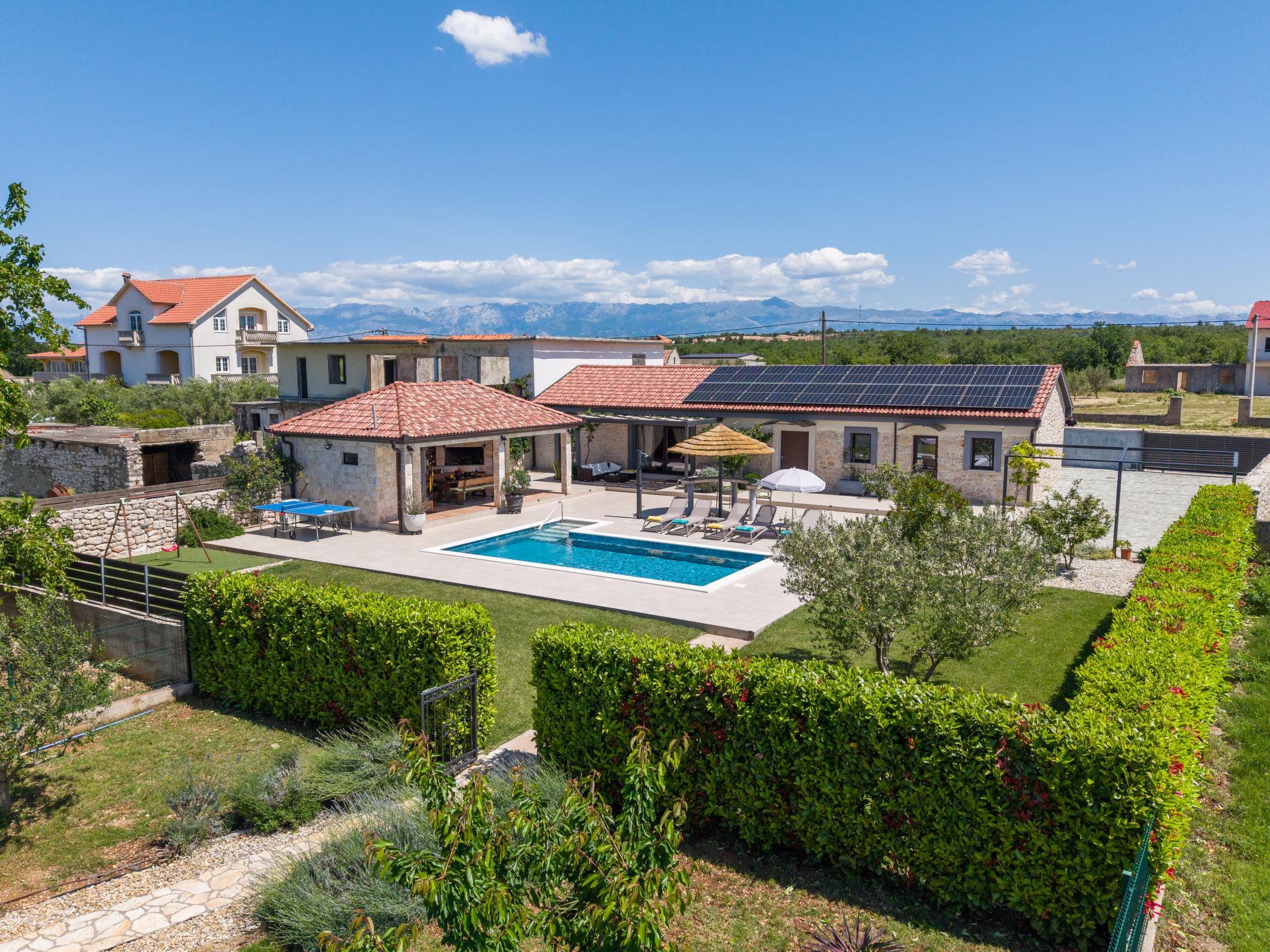 Zemunik Donji 22 km from Zadar: Beautiful single-family house "Villa Tanja". 17 km from the centre of Sukošan, in a sunny position, 17 km from the sea. Private: property 1'500 m2 (fenced), swimming pool (8 x 4 m, depth 140 cm, seasonal availability: 01.May. - 01.Oct.) with internal staircase. Outdoor shower. In the house: internet access, washing machine. Parking (for 2 cars) at the house on the premises. E-charging station. Shop 1 km, restaurant 17 km, bus stop 7.1 km, pebble beach 17 km. Nearby attractions: NP Krka 67 km, NP Paklenica 39 km, Fun park Biograd 32 km. Well-known lakes can easily be reached: Vrana See 33 km. Groups of teenagers on request only. Please note: airfield 12 km from the property.