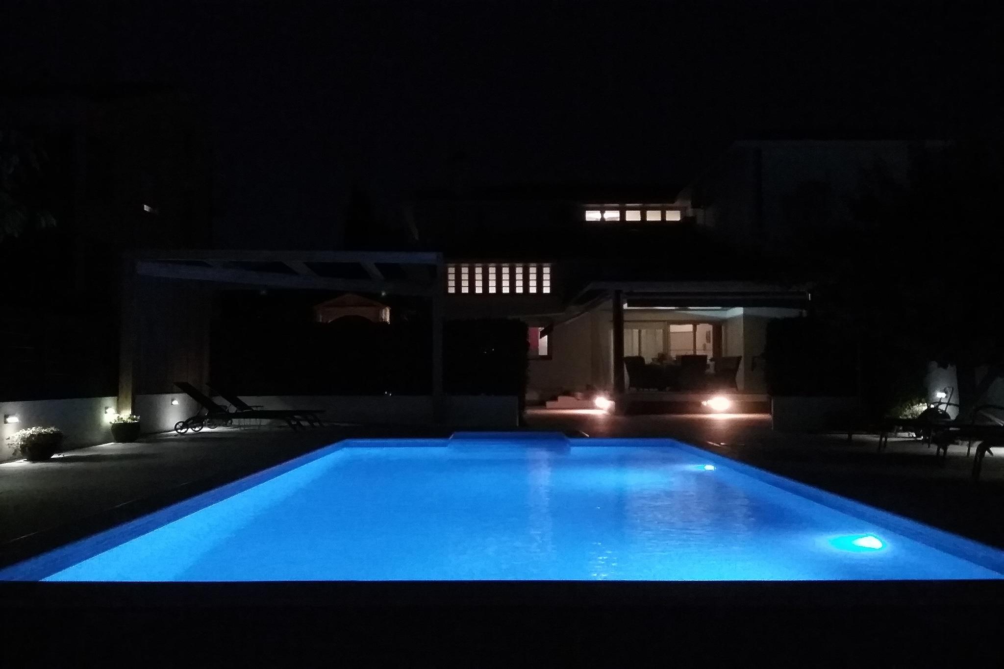 Første etasje: (Kjøkken(spisebord(4 personer), vannkoker, brødrister, komfyr(komfyr med 4 kokeplater, gass), kaffetrakter, stekovn, mikrobølgeovn, oppvaskmaskin, kjøleskap, fryser), Stue/spisestue(TV(flatskjerm, Internasjonale TV-kanaler), spisebord(6 personer), sittehjørne, klimaanlegg), soveværelse(dobbeltseng(200 x 180 cm)), bad(dusj, håndvask, toalett, bidet, Hårtørker), vaskerom(håndvask, toalett, vaskemaskin, strykebrett, strykejern)) i 2. etasje: (soveværelse(dobbeltseng(200 x 160 cm)), soveværelse(dobbeltseng(200 x 160 cm), klimaanlegg), Sovrum med badrum(dobbeltseng(200 x 180 cm), dusj, håndvask, toalett, bidet, klimaanlegg), bad(dusj, håndvask, toalett, bidet, Hårtørker)) Kjelleren: (oppholdsrom(TV, sittehjørne)) spisebord, peisen, dusj med infrarøde stråler, terrasse(privat, overdekket, 45 m2), hage(privat, inngjerdet, opplyst, 500 m2), hagemøbler, solsenge, grill, parkering, svømmebasseng(privat, 8 x 4 m.), terrassemøbler