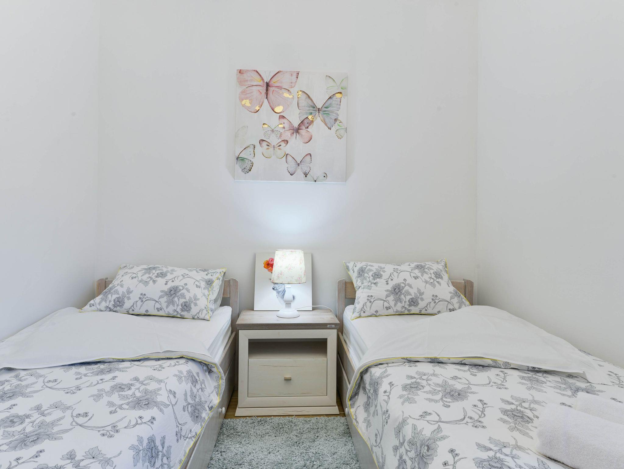 Ferienwohnung bietet Platz für 4 Gäste. Die Betten sind in Schlafzimmern, die es 2 gibt, innerhalb einer Gesamtfläche von 59m2, angeordnet. Die Gäste haben eine eigene Terrasse zur Verfügung, auf der sie in warmen Sommernächten genießen können. Es ist erlaubt, Speisen auf dem Gemeinschafts-Grill vorzubereiten. Während ihres Aufenthalts können Gäste das gemeinsam zur Nutzung stehende Schwimmbad benutzen. IM PREIS INBEGRIFFEN: Kurtaxe, Endreinigung, Klimatisierung, Pool, Parkplatz, Internet, Bügeleisen, Föhn. Die Verfügbarkeit zusätzlicher Dienstleistungen in Ihrem reservierten Termin und die Preise derselben (falls nicht aufgeführt) müssen im Voraus überprüft werden. Zusätzliche Dienstleistungen die in der Zahlungsaufforderung nicht aufgeführt sind werden direkt beim Vermieter bezahlt, angenommen der Gast nutzt auch diese. Ermäßigung auf den Grundpreis: Gratistag 14=13 (bei einem Aufenthalt von 14 Tagen oder mehr erhalten Sie einen Gratistag für den Aufenthalt bis 31.12.26).